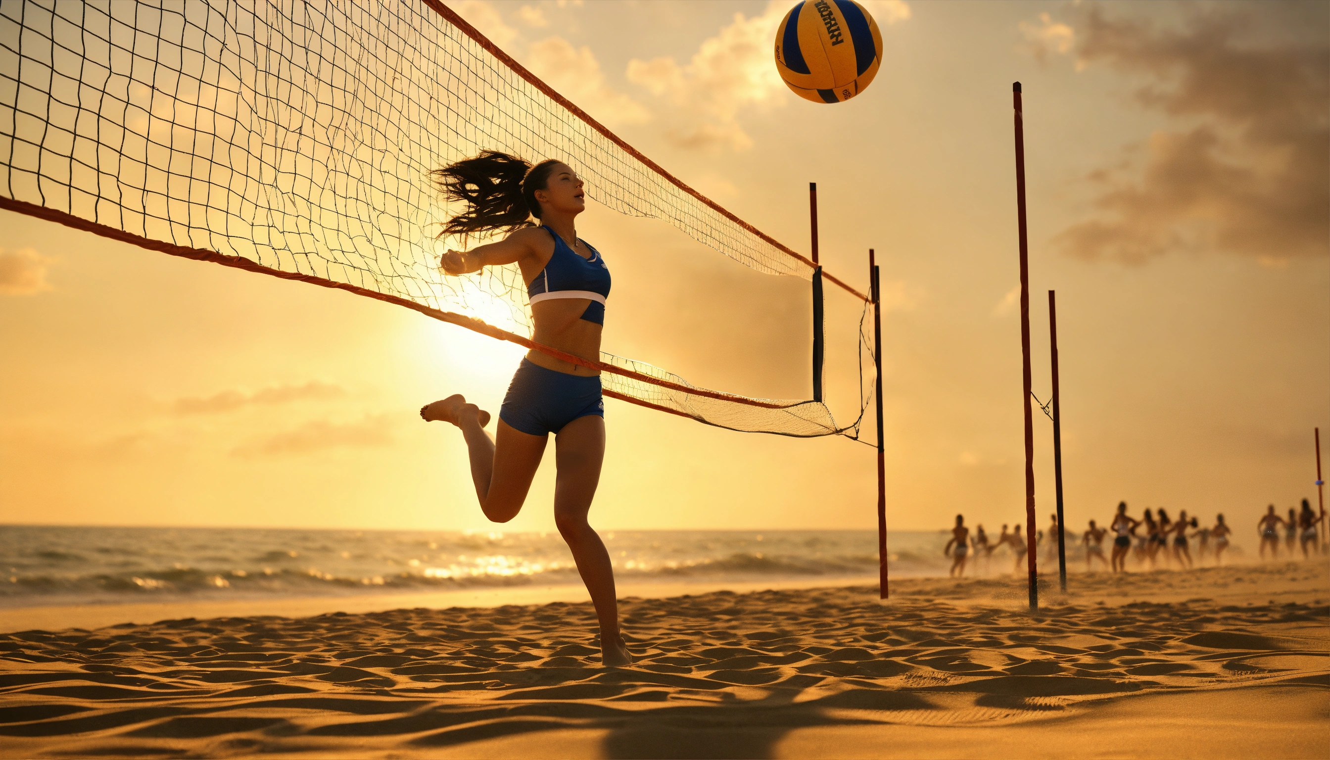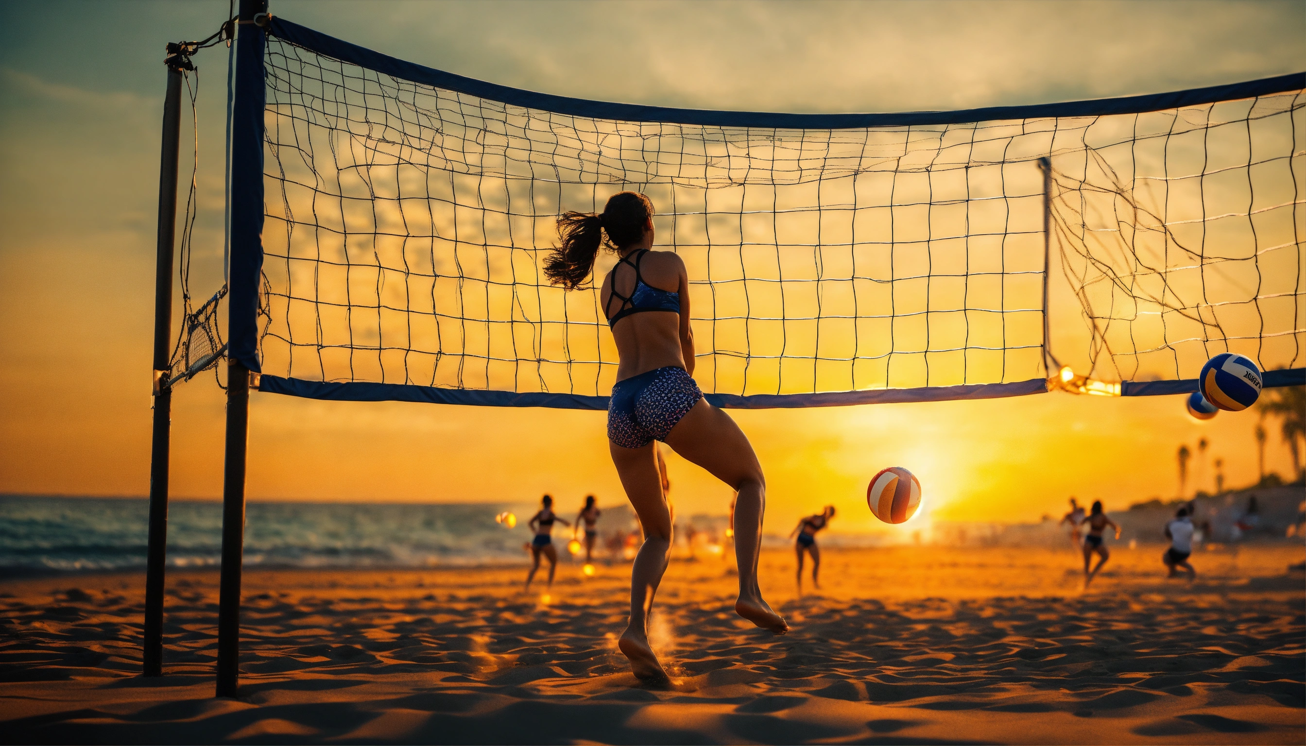 Women's beach volleyball on the sand. girl jumps and hits the ball over a volleyball net. female back bodies, girls game with a grid. team, group sport game. summertime. octane render, trending on artstation, highly detailed, lighting, professional, realistic, sharp focus, 4k, 8k, high resolution, candid, personal, –testp, bright lighting, ultra-detailed, bright lighting, photo, high quality photo, cinematic shot, volumetric light, imax