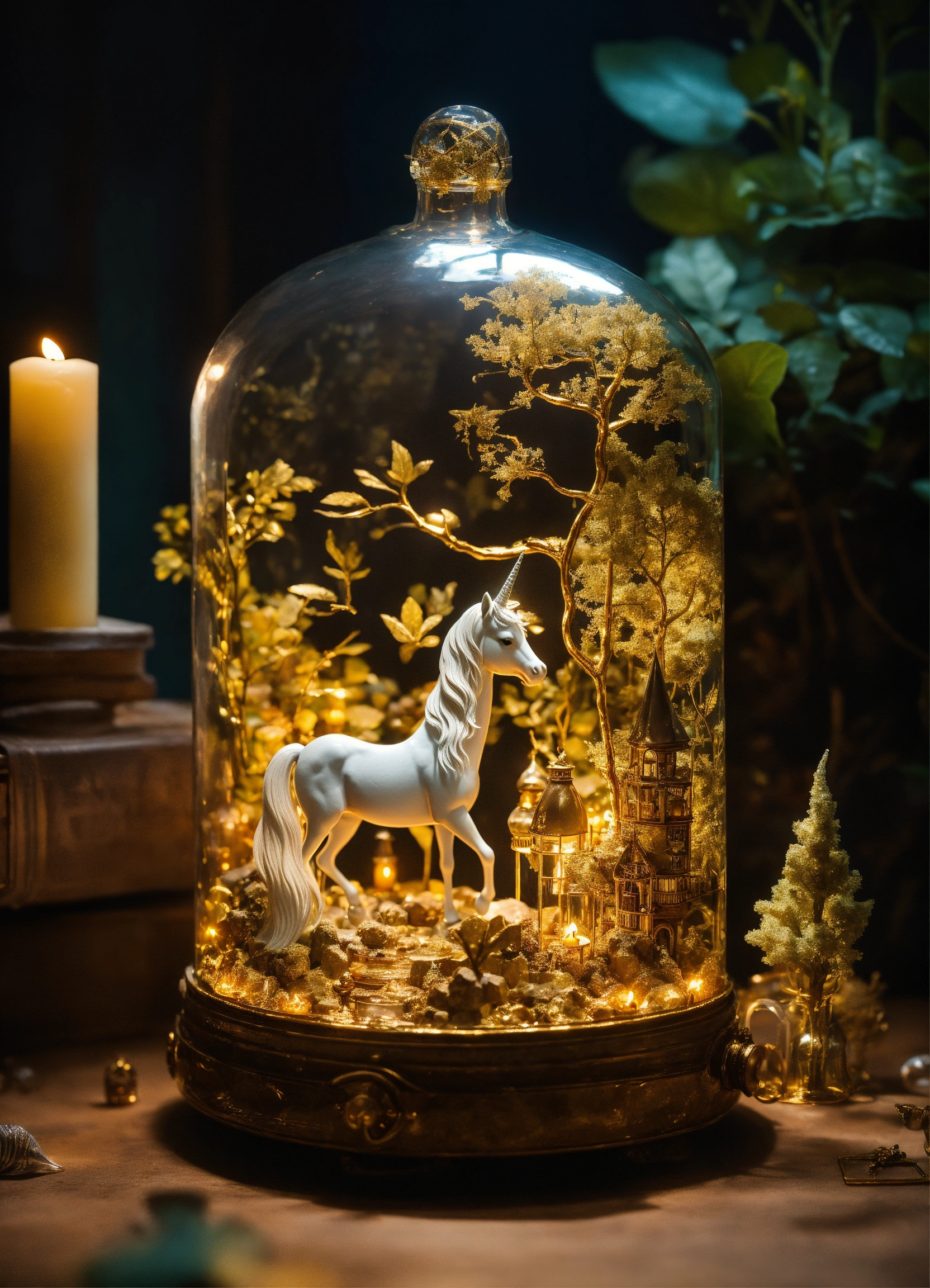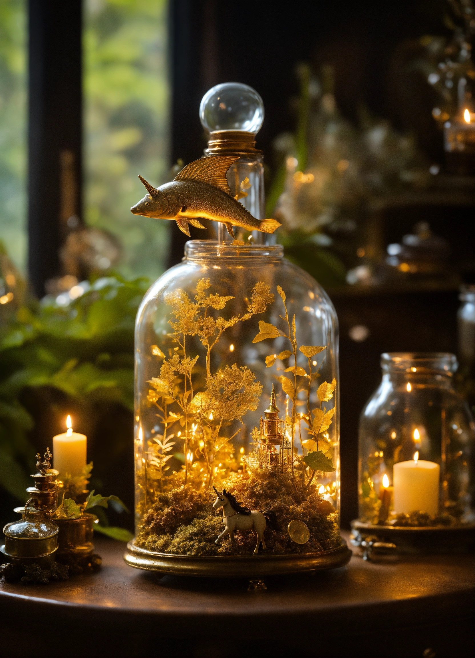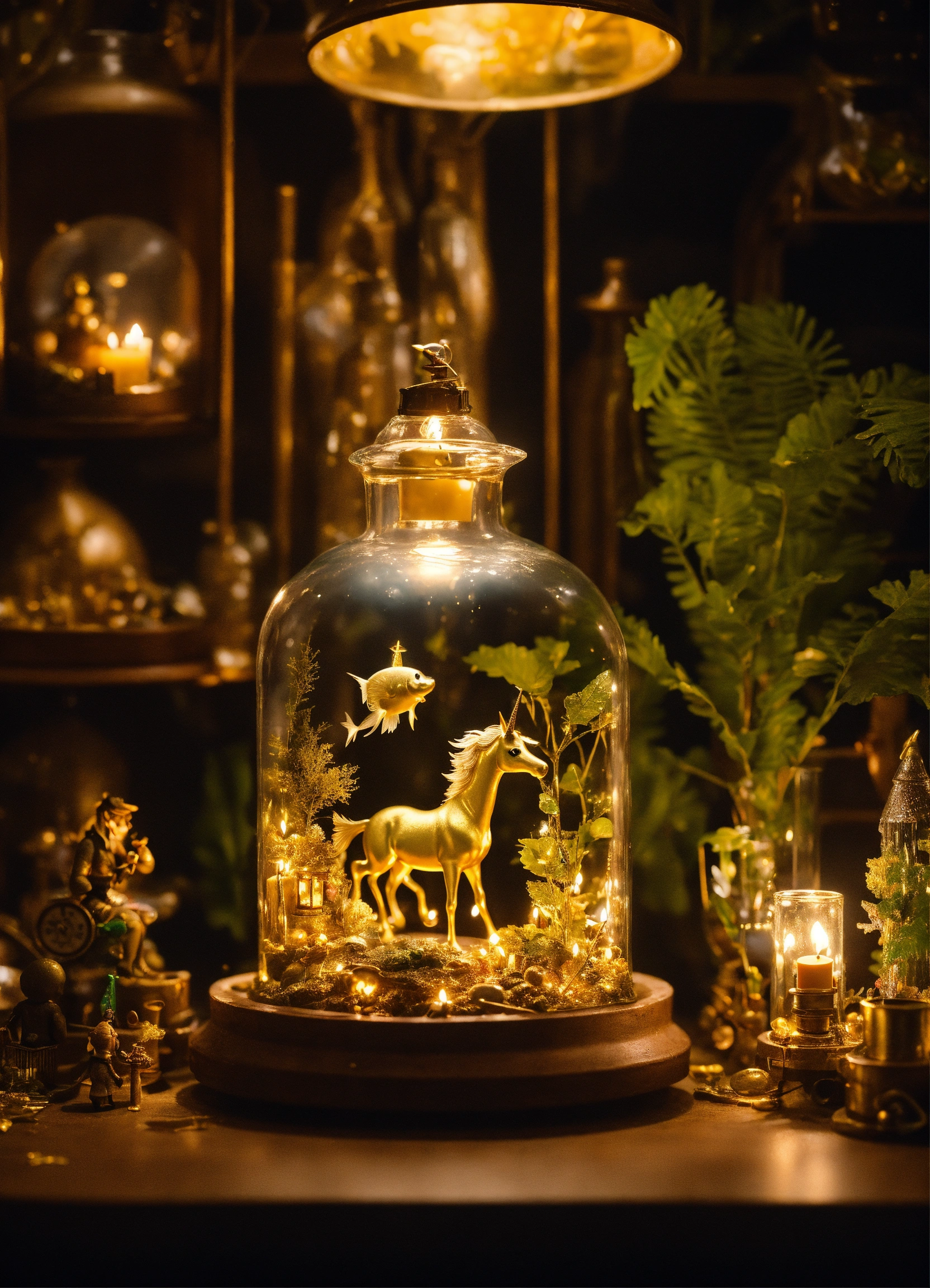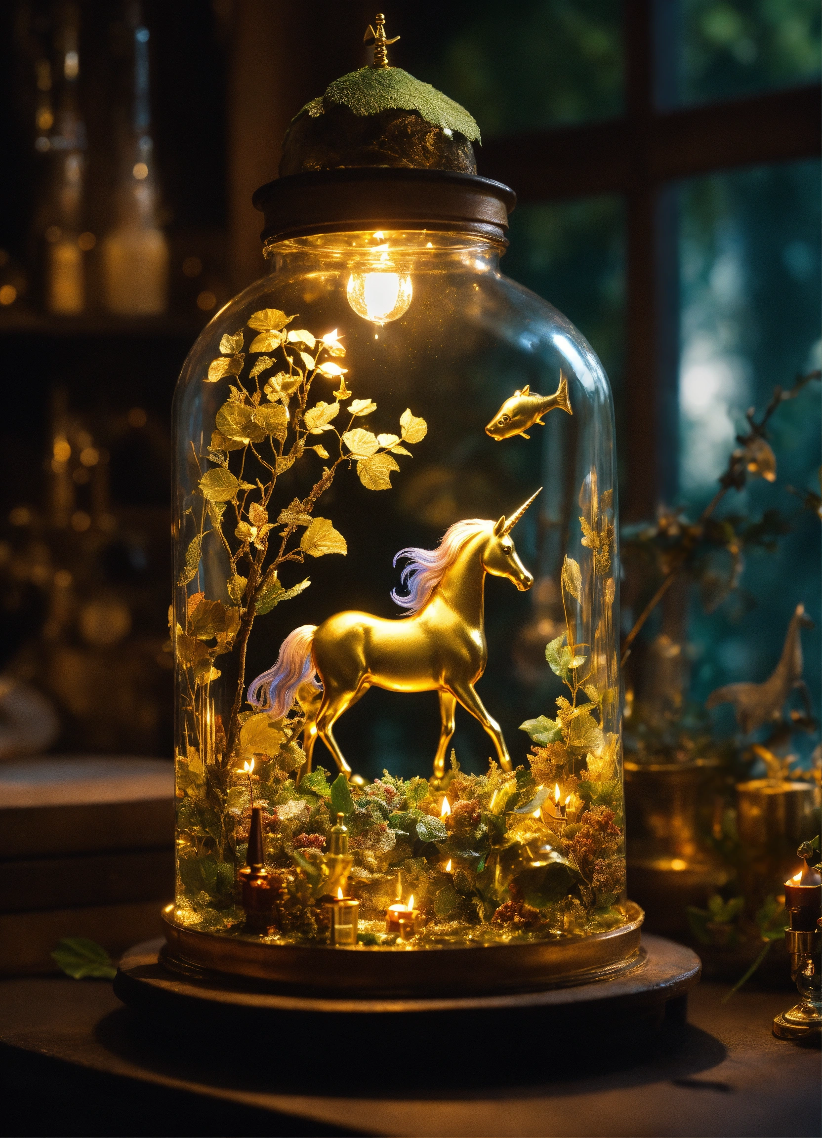 An enchanted forest made of liquid gold, set in a glass bottle, a unicorn sailing on a leaf, a talking fish, claymation figures, steampunk inspired, rich and detailed, soft candlelight.