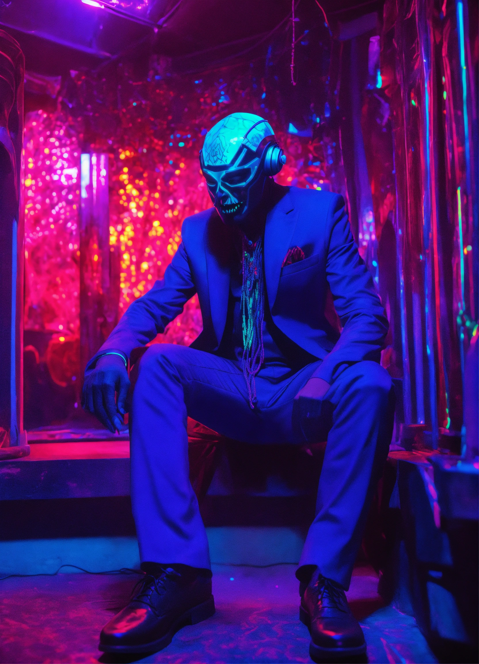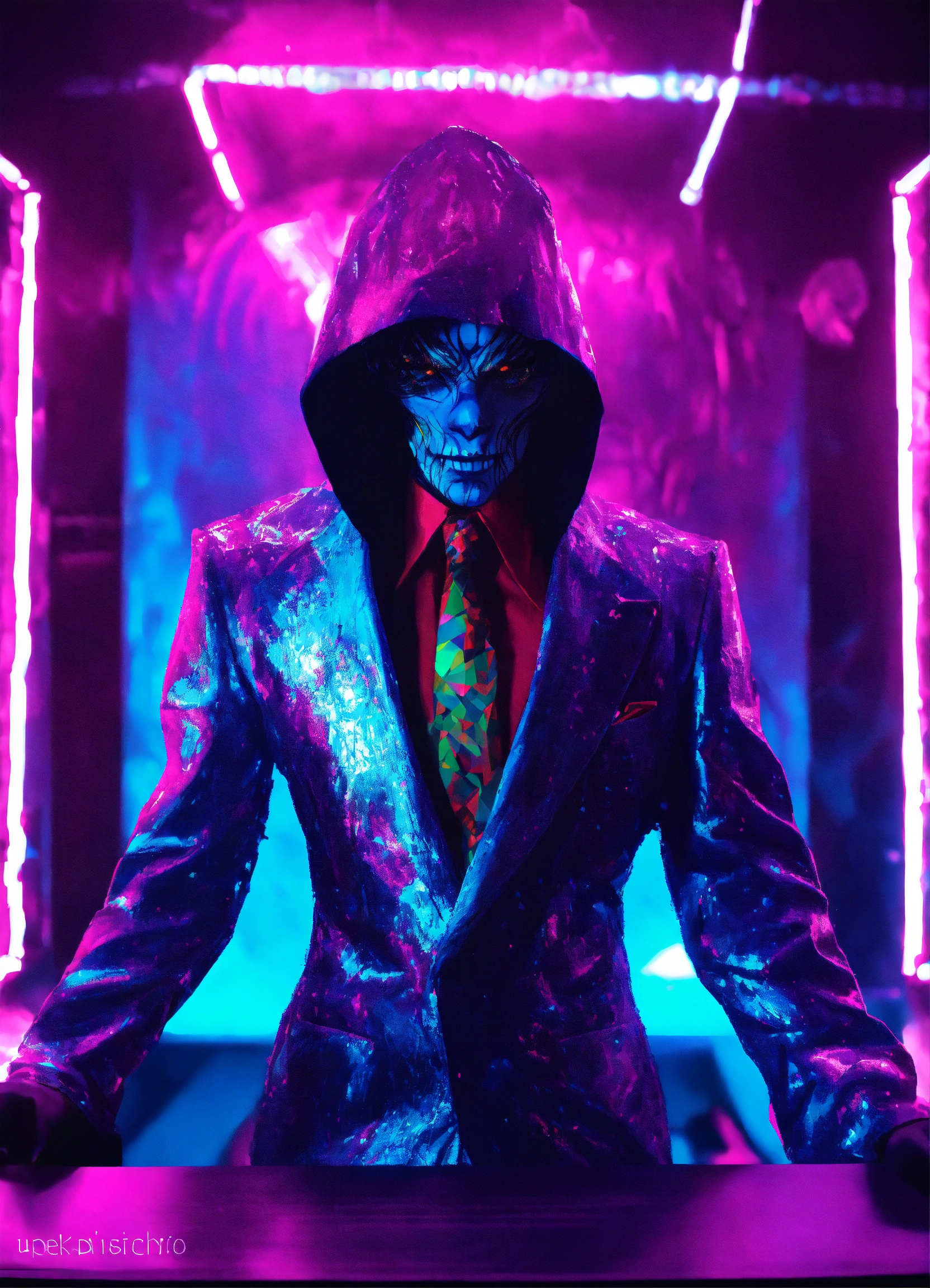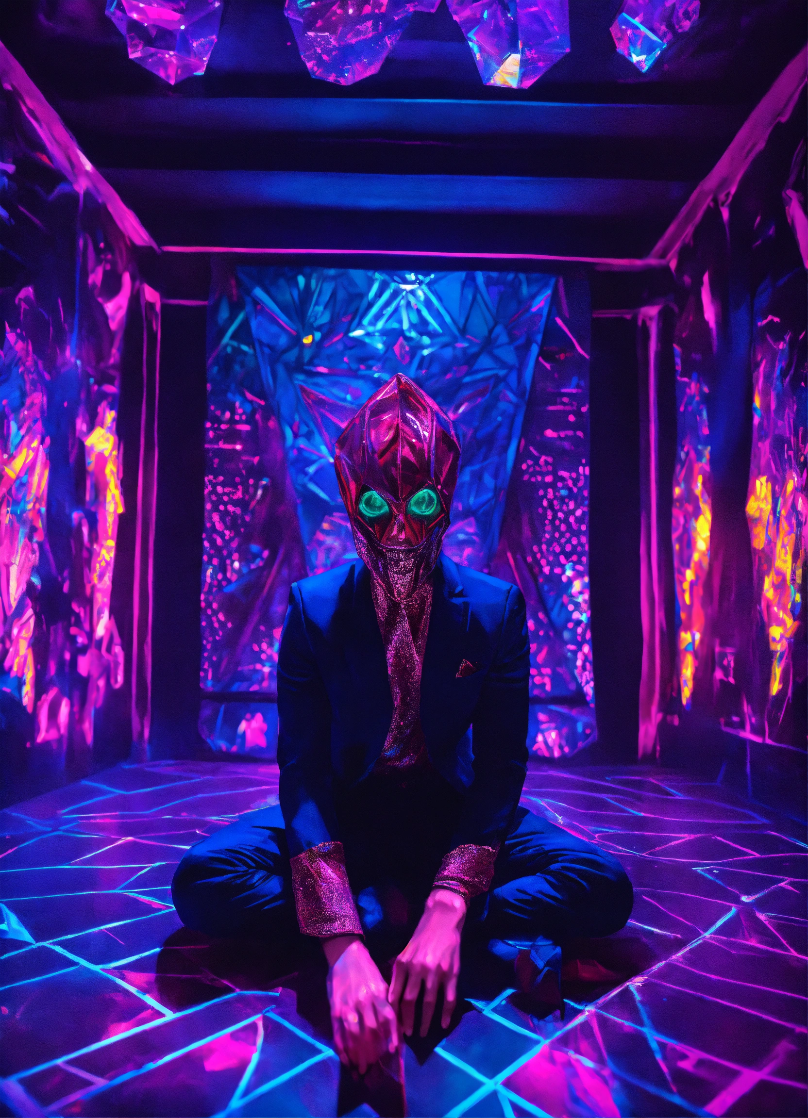 Photorealistic the grudge in a diamond suit in a blacklight dmt demon techno club
