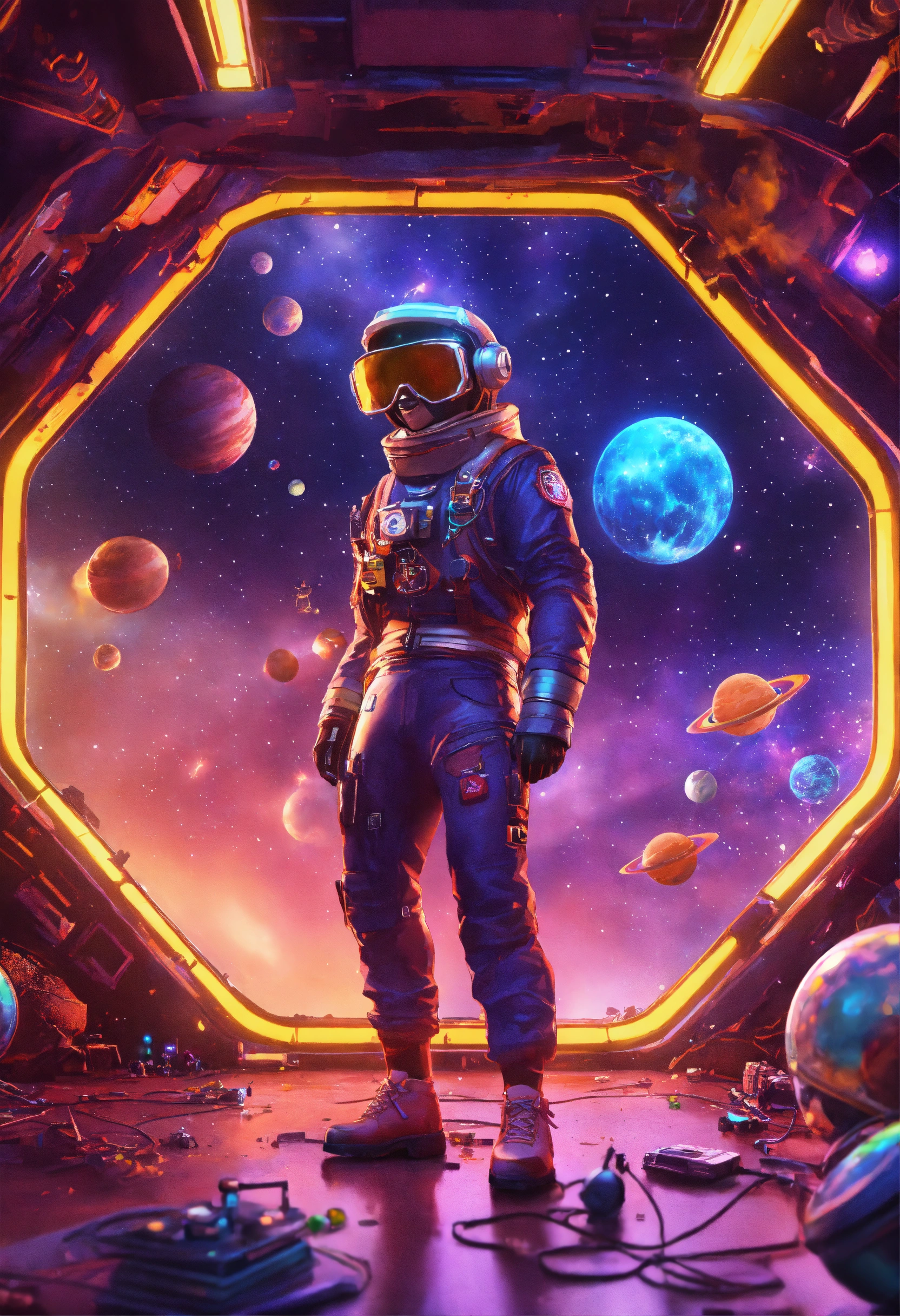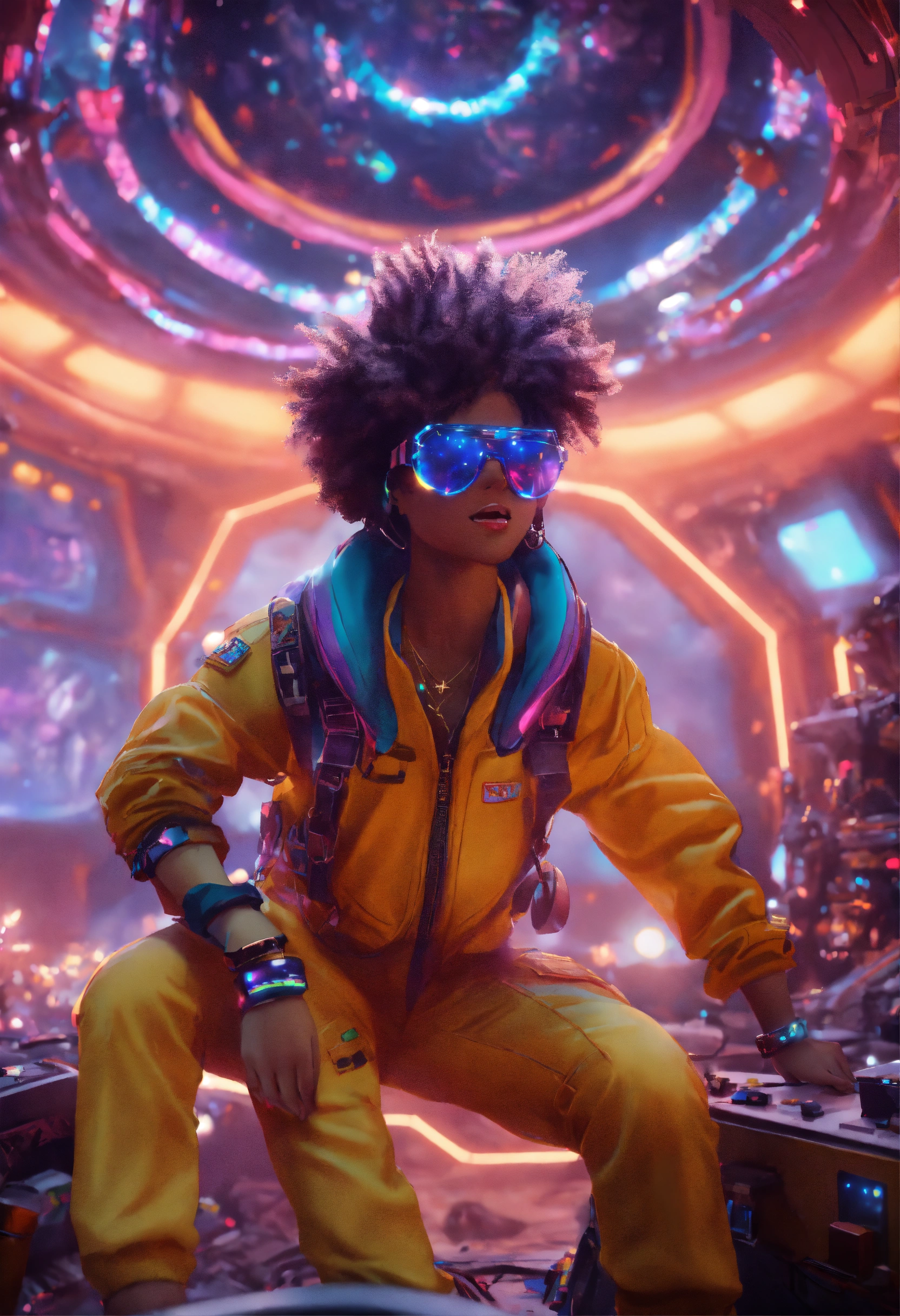 Zoom out on tall funky cartoon rockstar wearing cool space clothes and jewelry with oversize nebula glasses, dancing in a wrecked spacecraft, people from different galaxies dancing and enjoying the music, pixar, unreal engine, 8k.