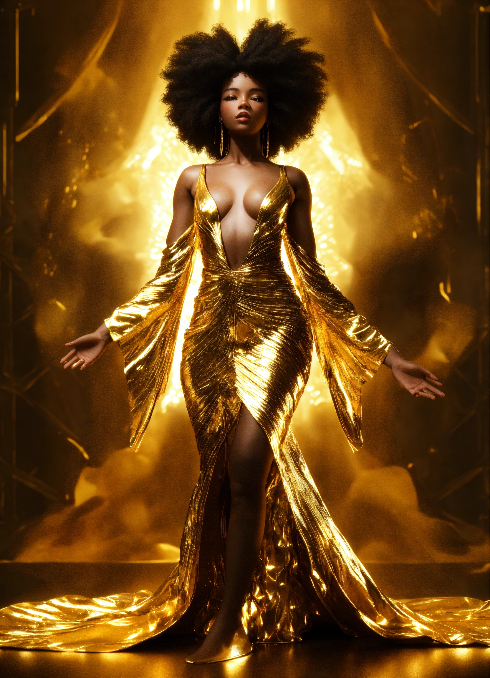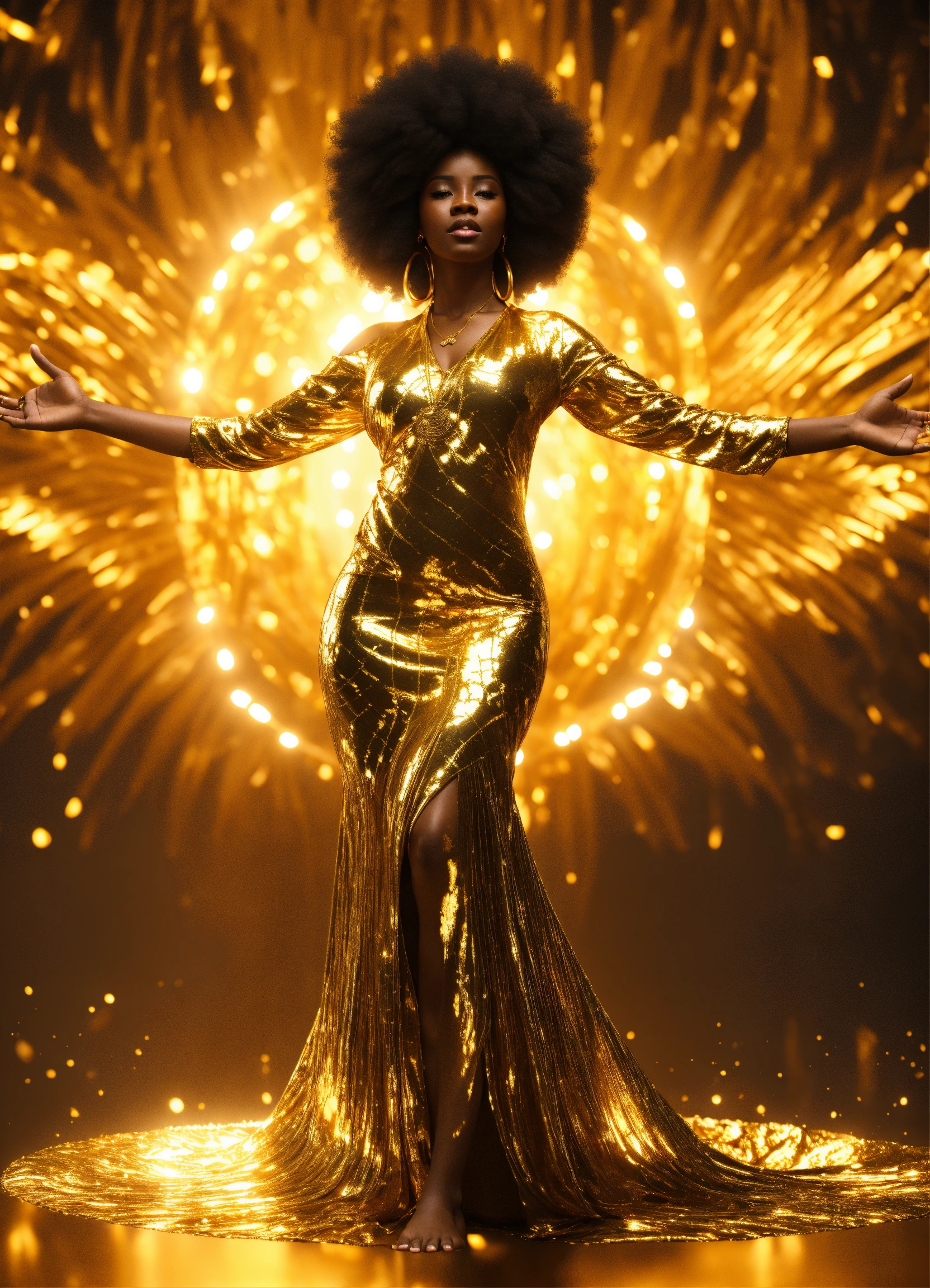 3d render of black woman with afro, full body shot, standing, arms outstretched to sides palms up, eyes open looking directly into camera, liquid gold flows through her entire face and body, illuminating her form from within, wearing long, flowing gold african style clothing