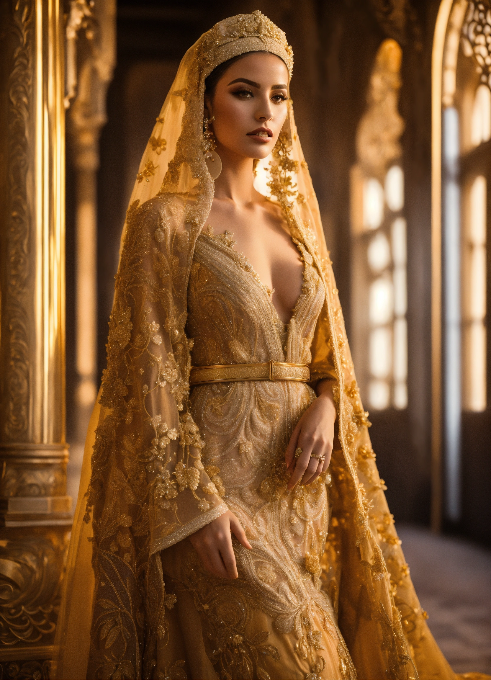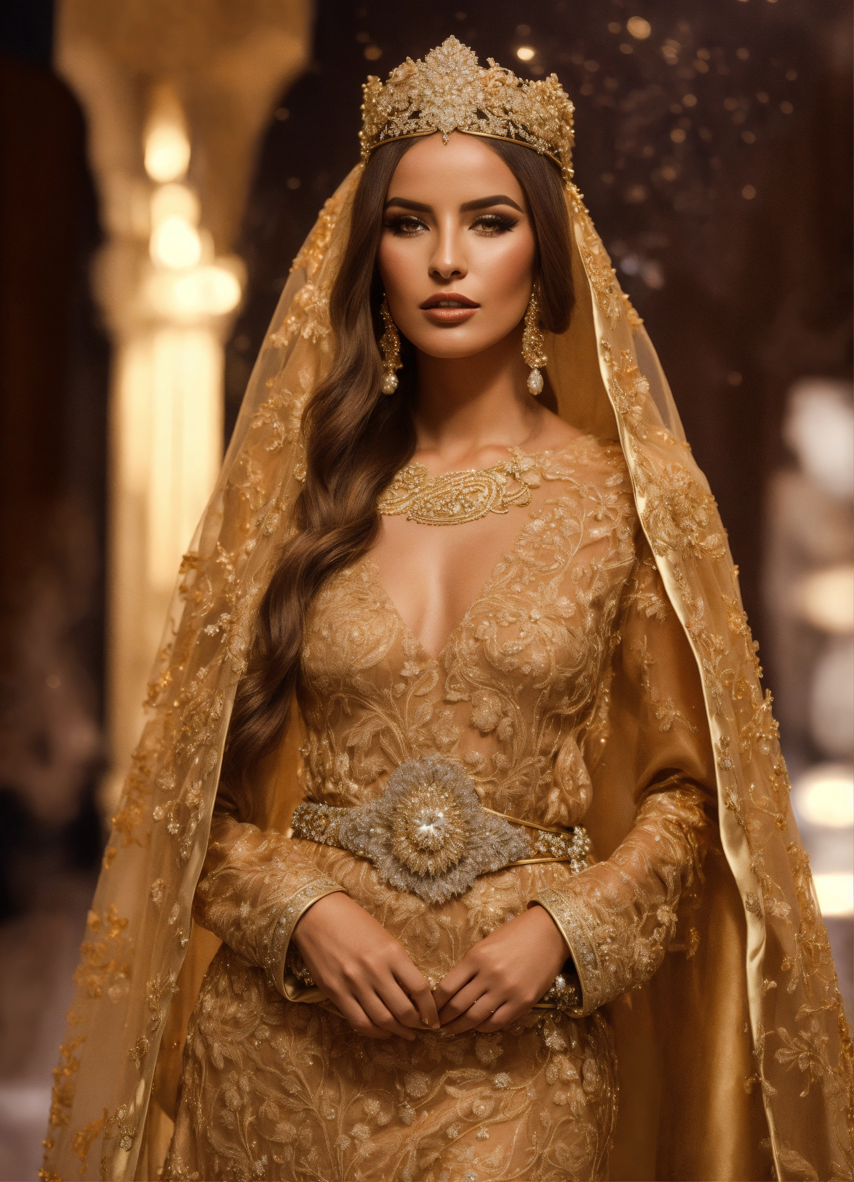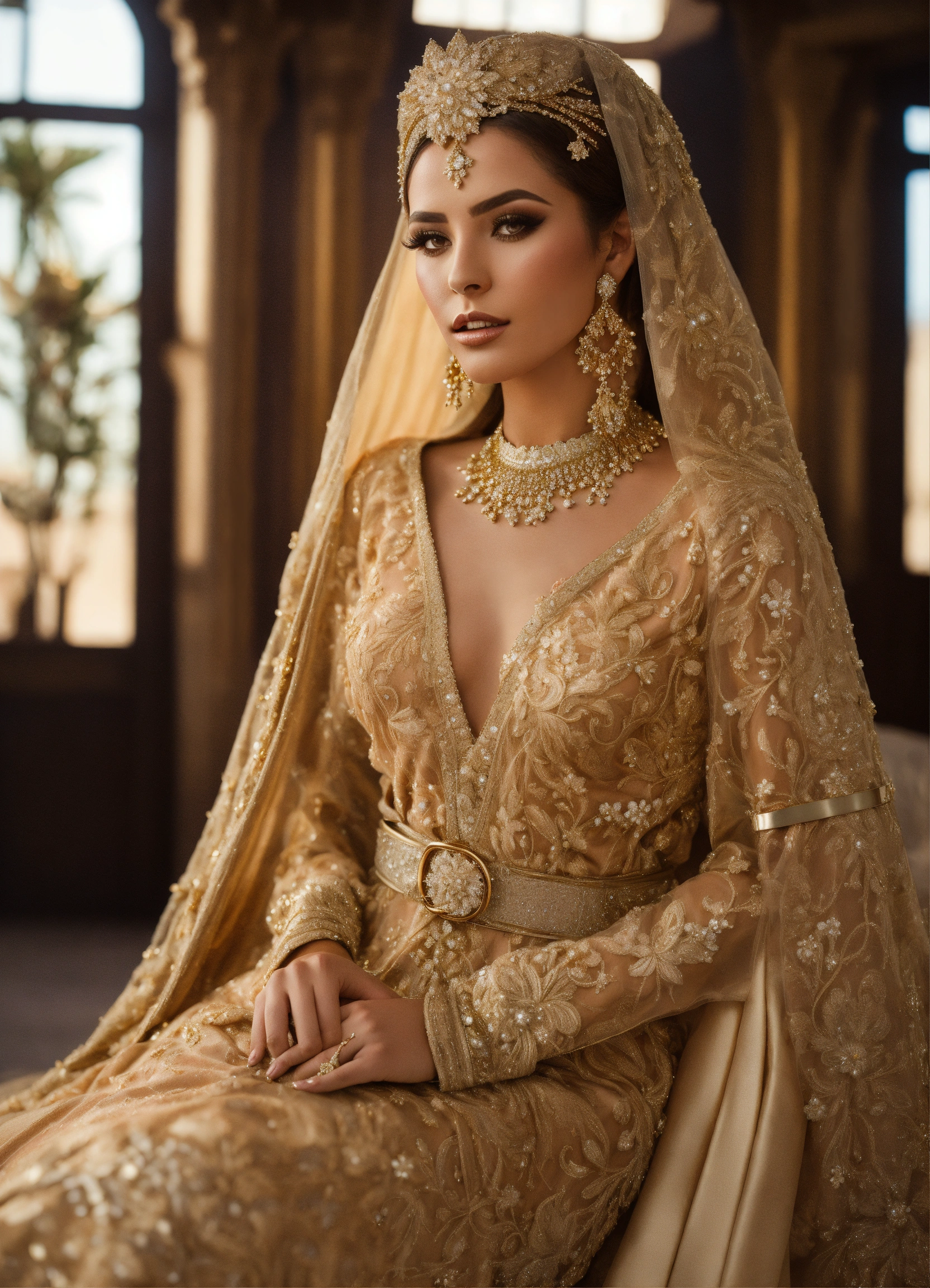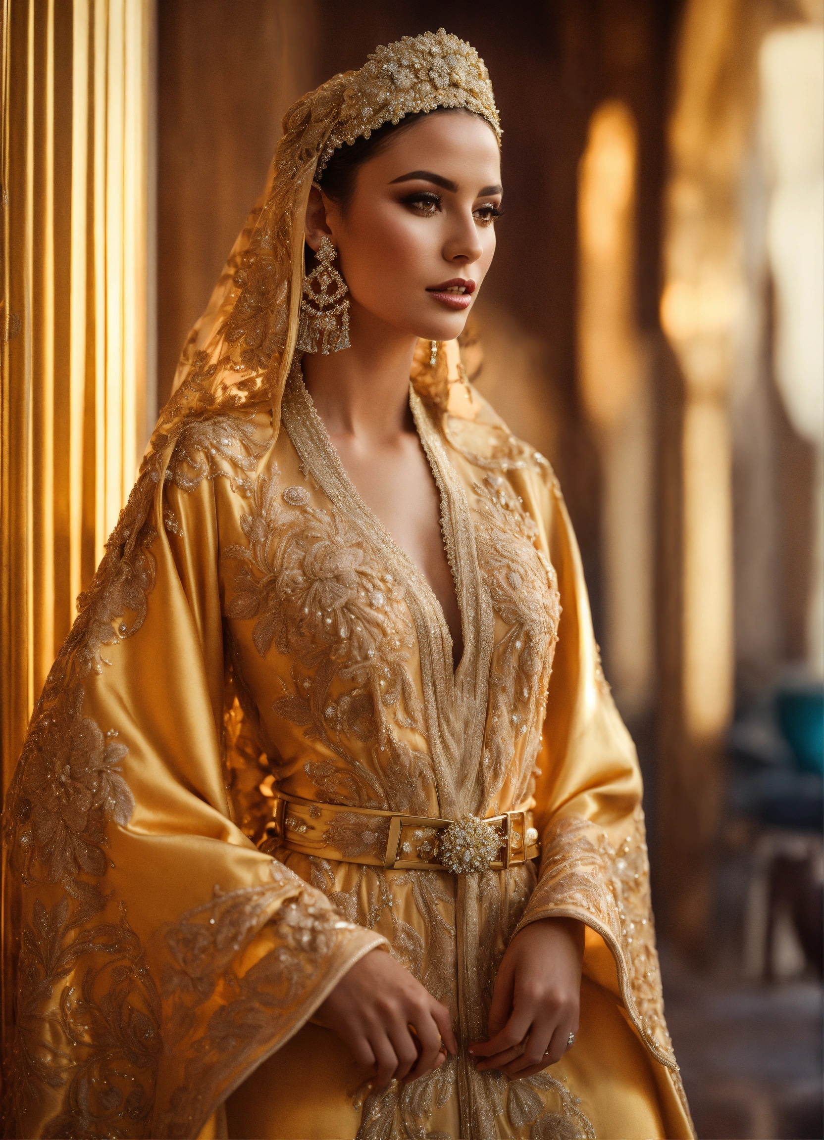 Morrocan caftan bride gold, with bridal veil, with belt, hyperrealistic, haute couture, luxury, beautiful