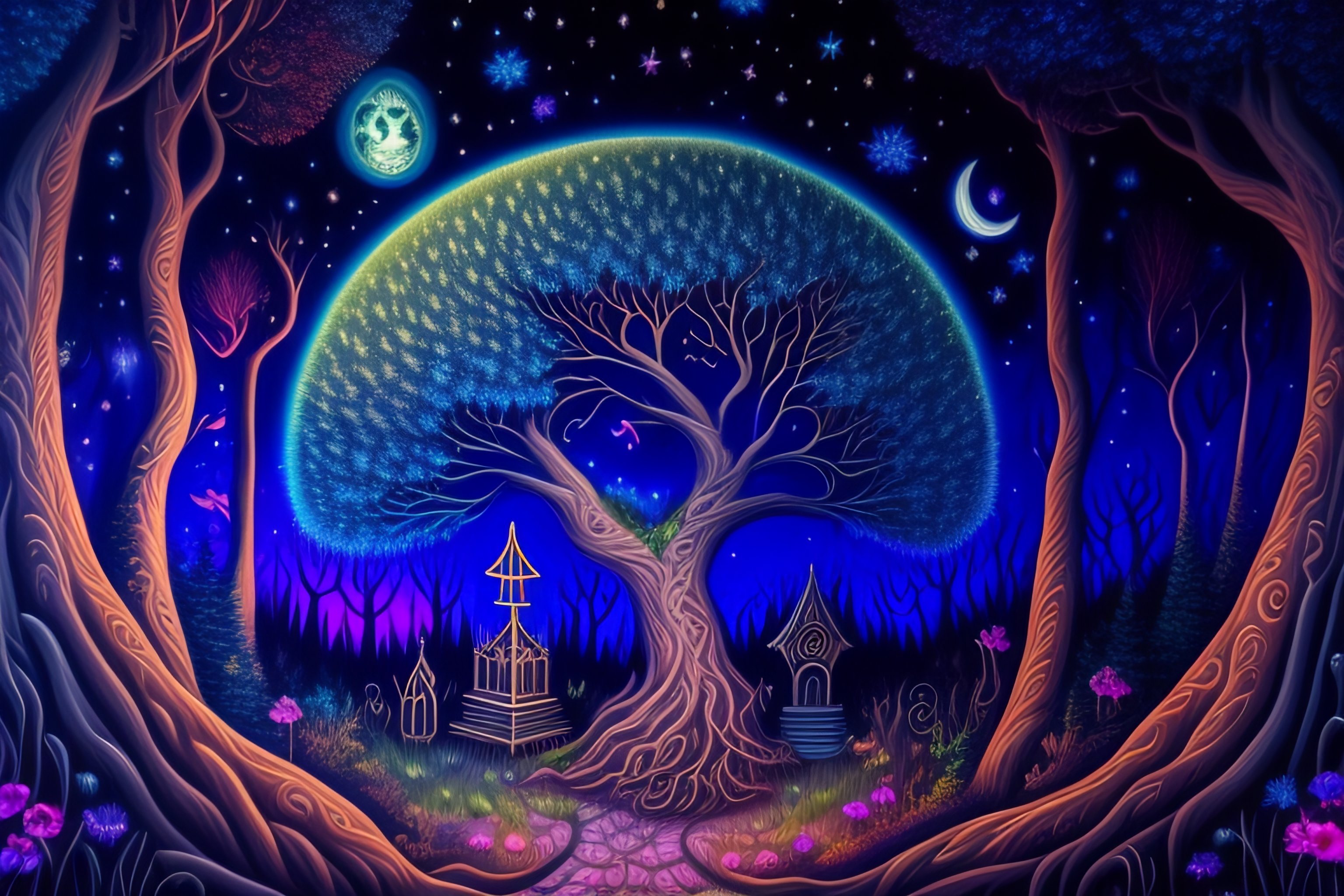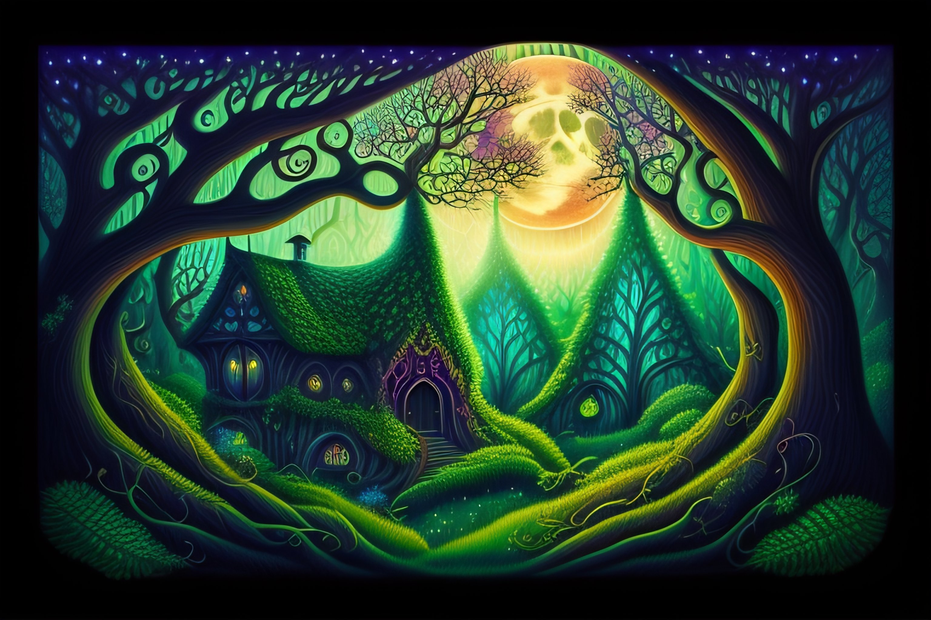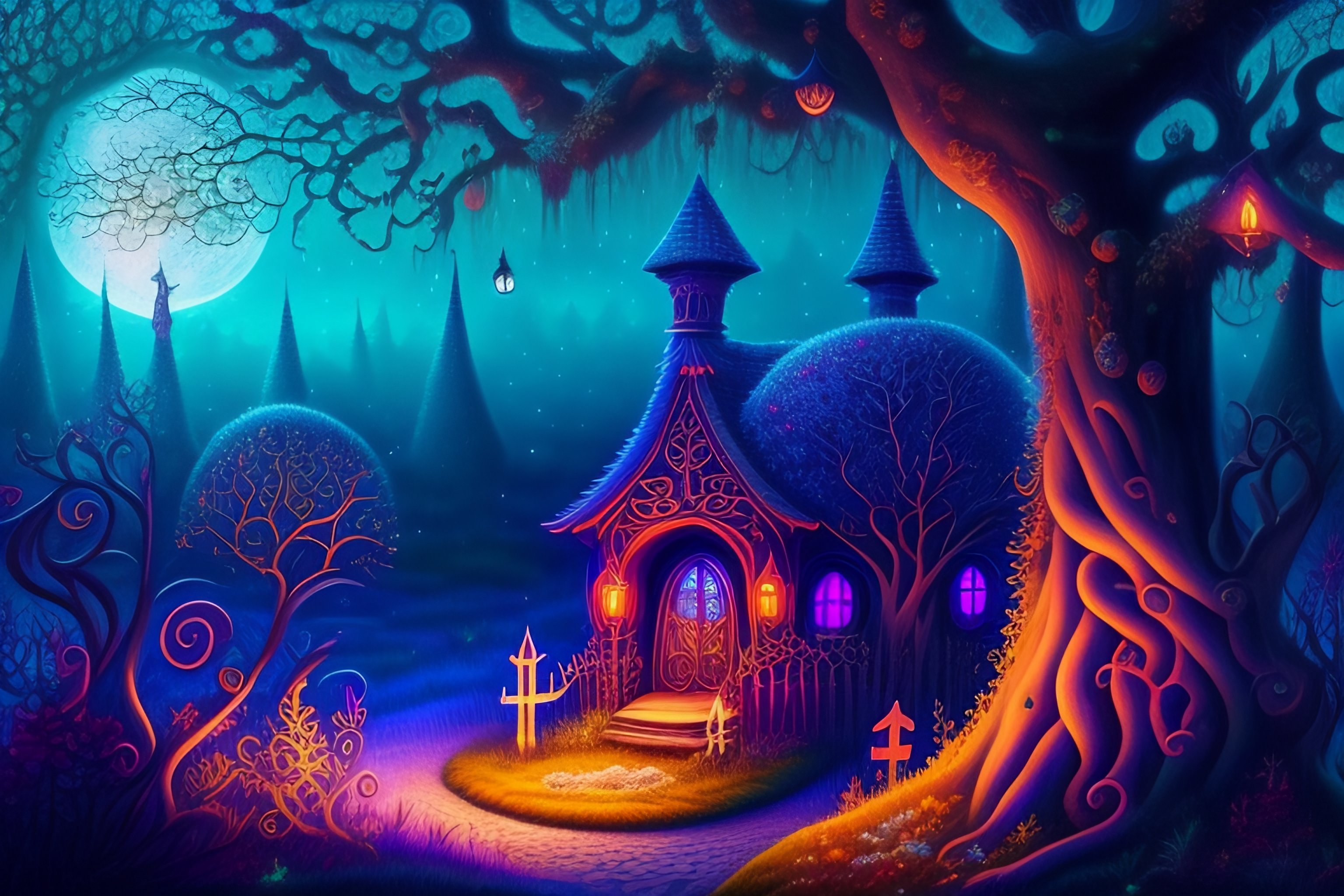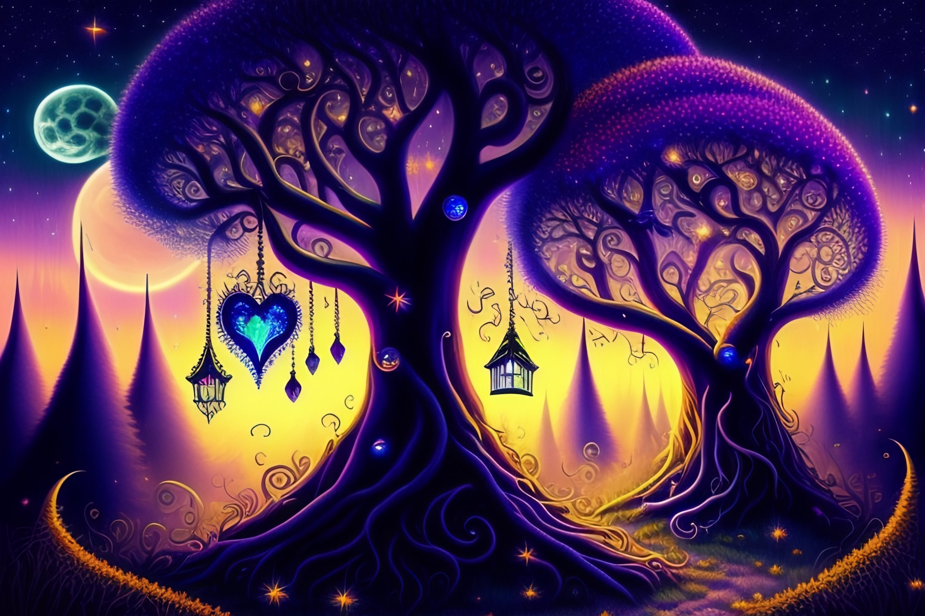 Whimsical super-detailed surreal gothic witchy still my bleeding heart with intricate mystical magical forest graveyard scene with large twisted haunted trees background with full moon above and a starry sky muted colors. intricate extremely detailed hyperdetailed tim burton fantasy, kawaii chibi