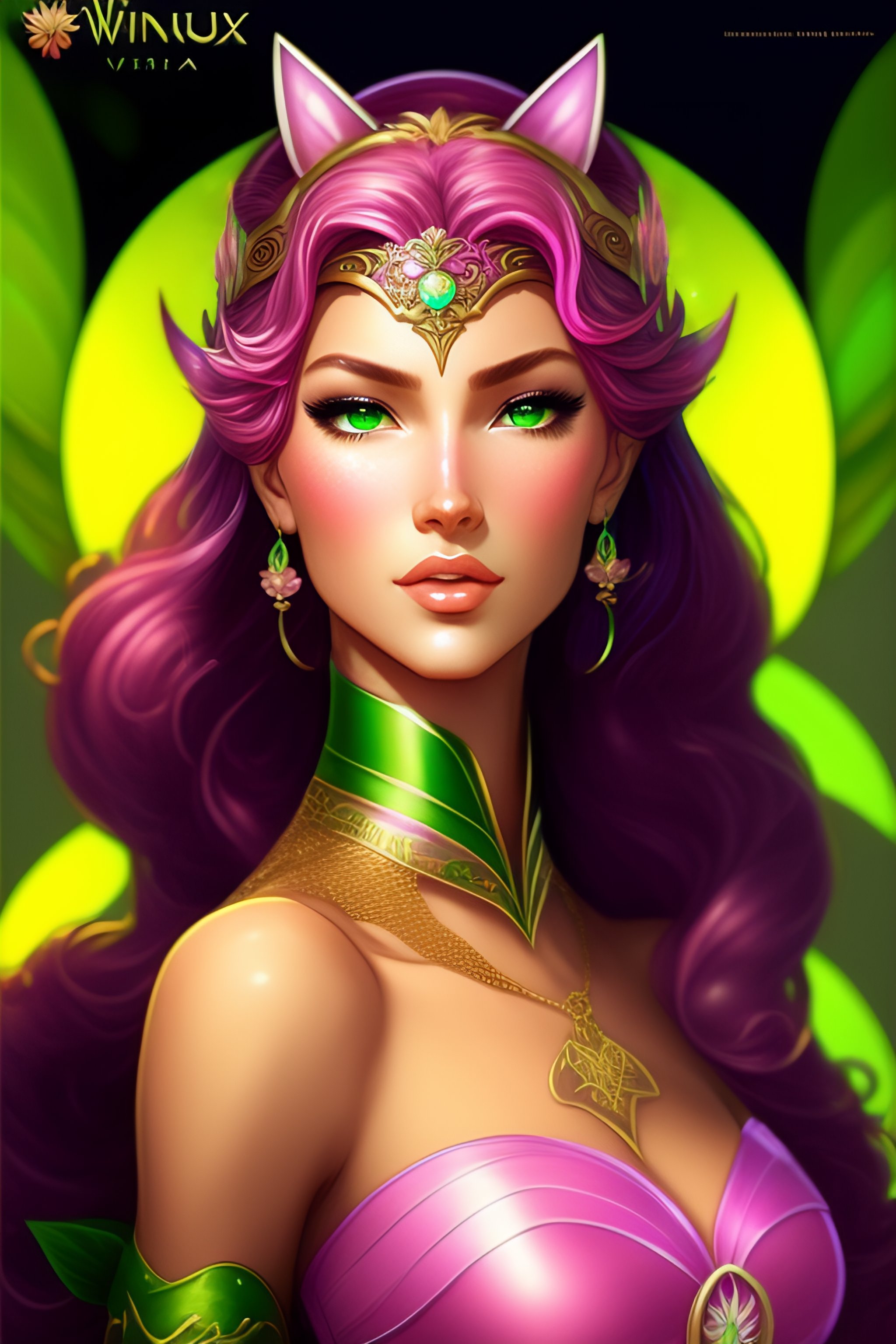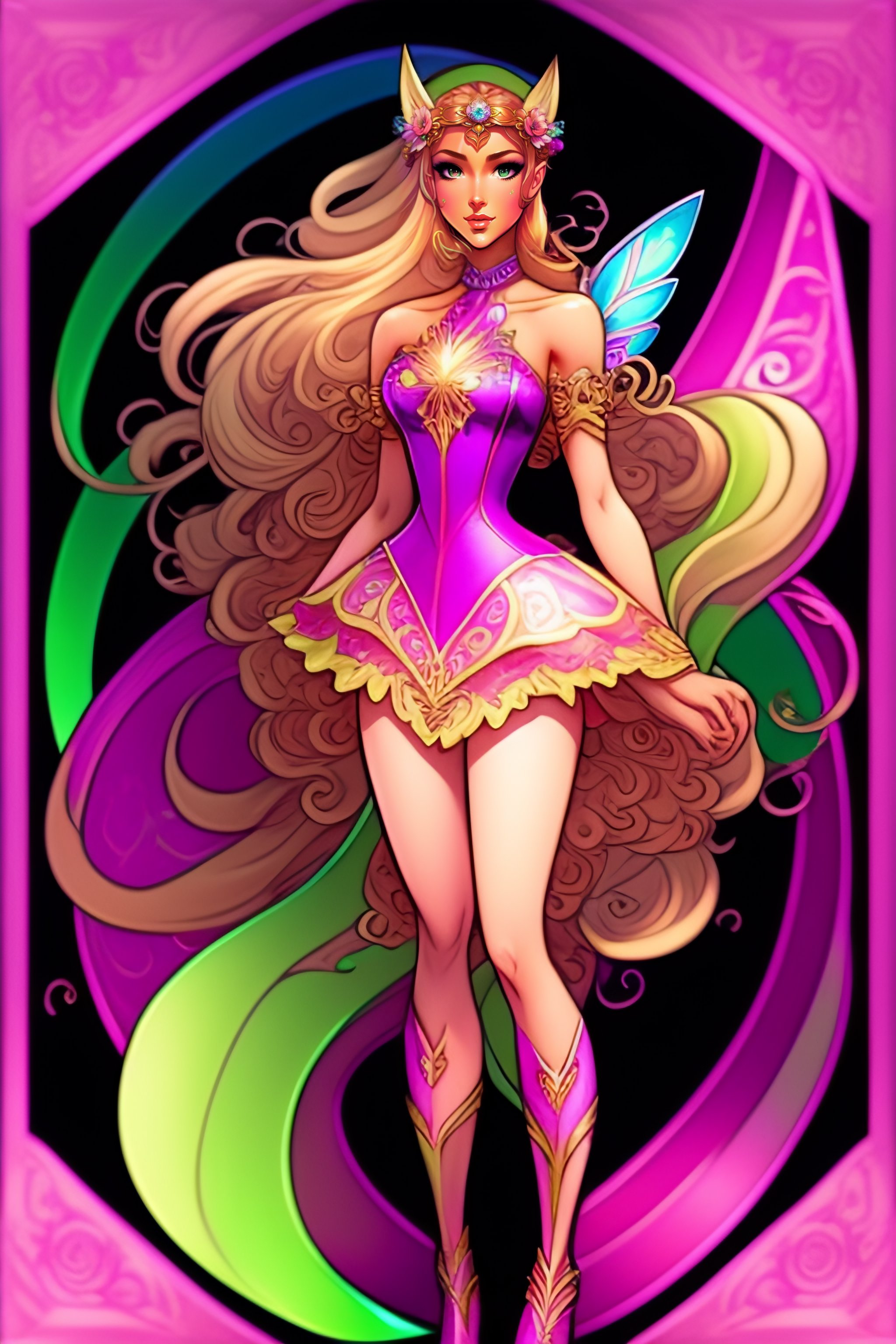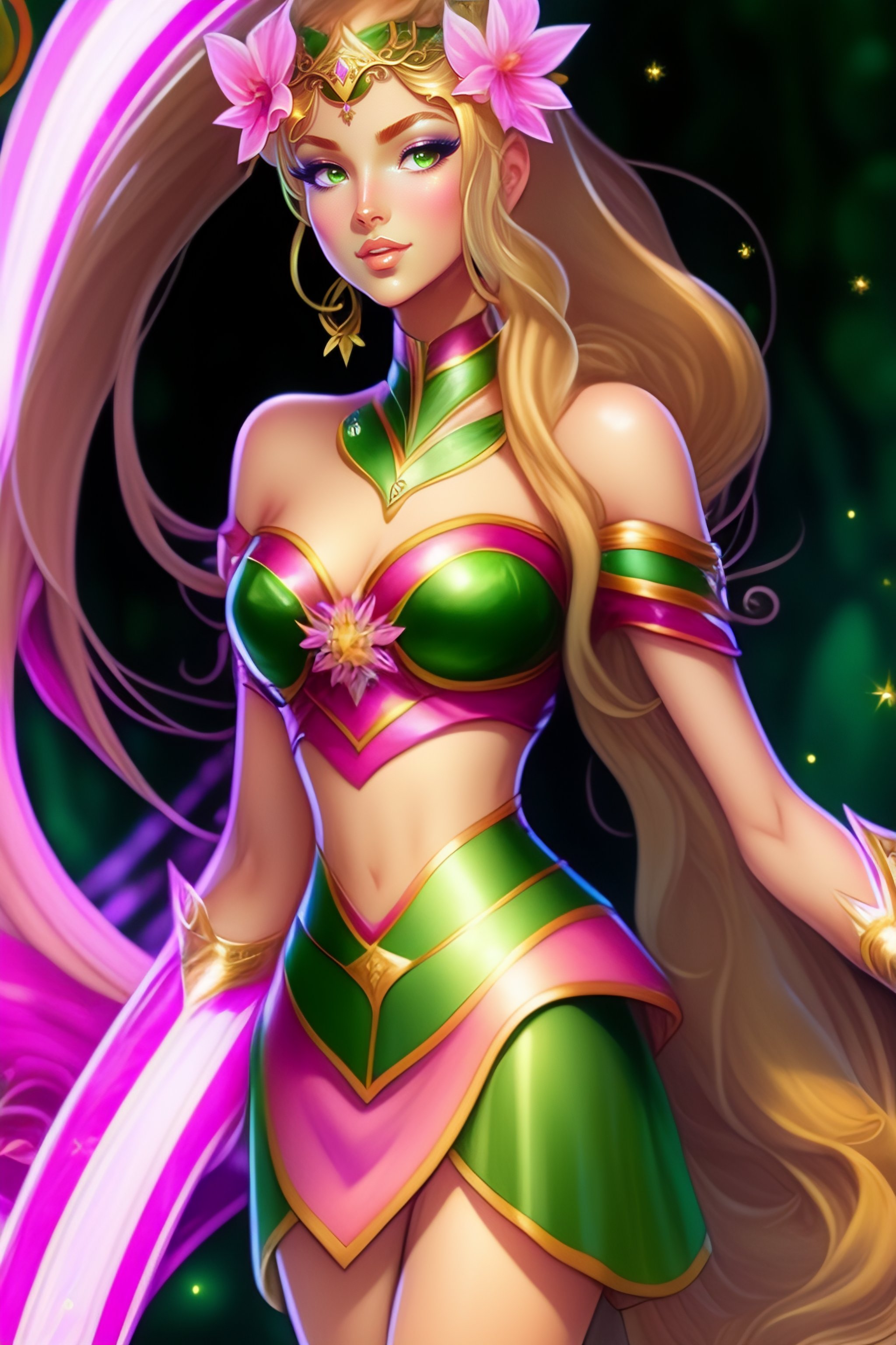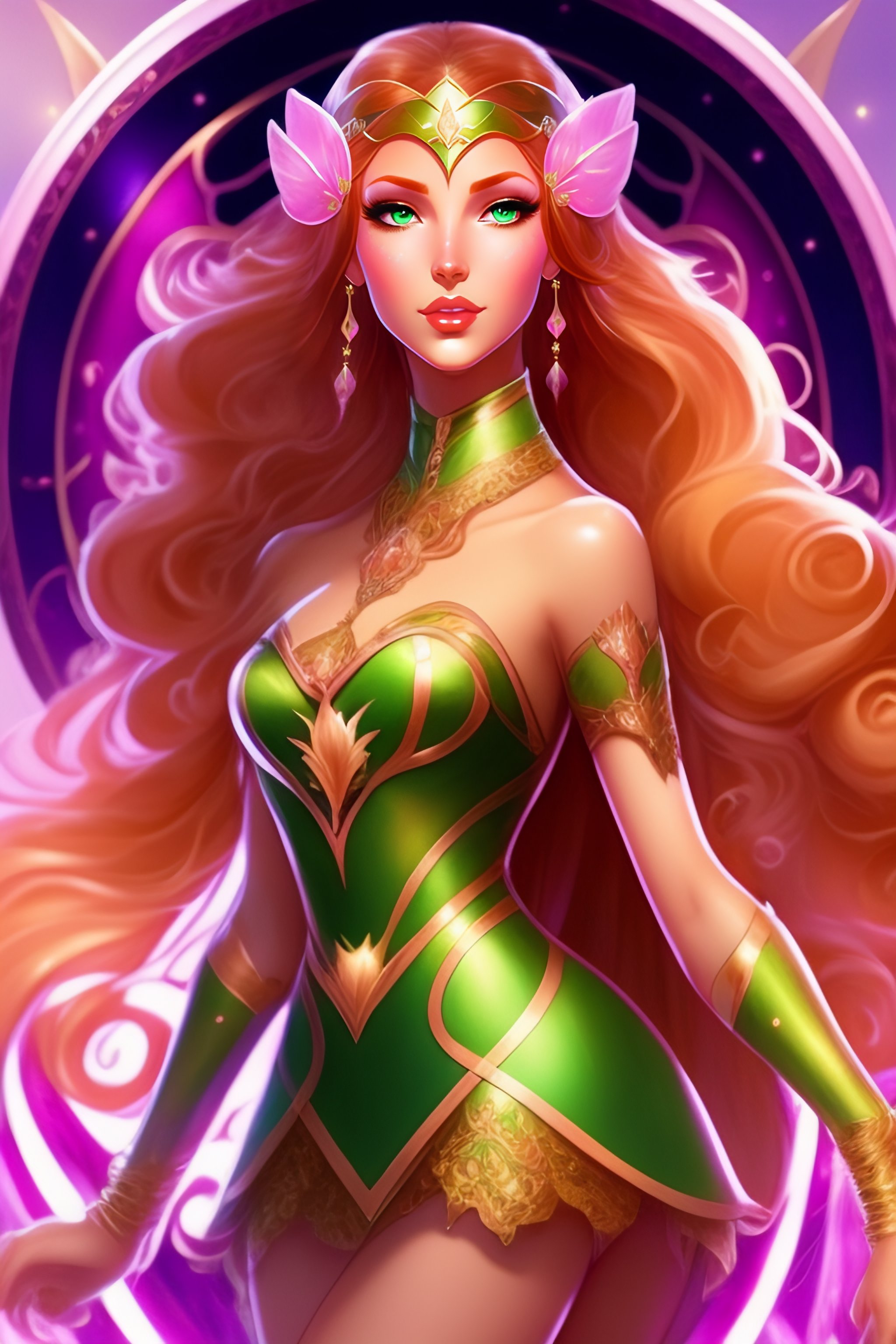 Winx club's flora as a superhero, fairy, brown with blonde dyed front strands, pink and green costume, concept art by alphonse mucha
