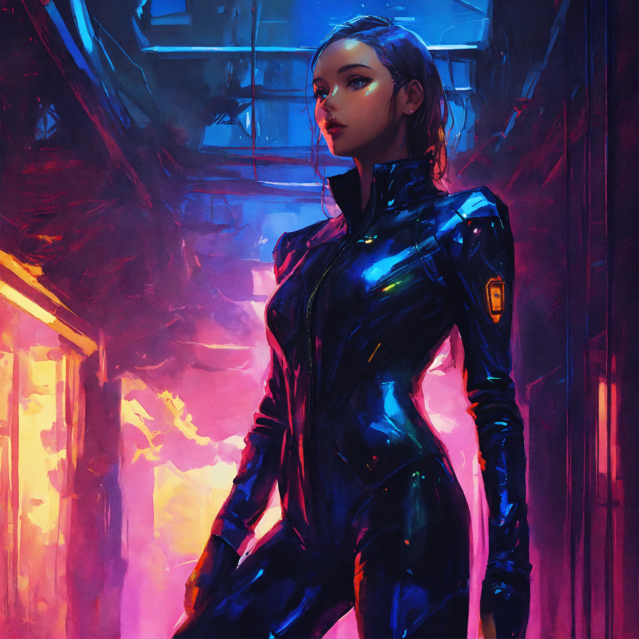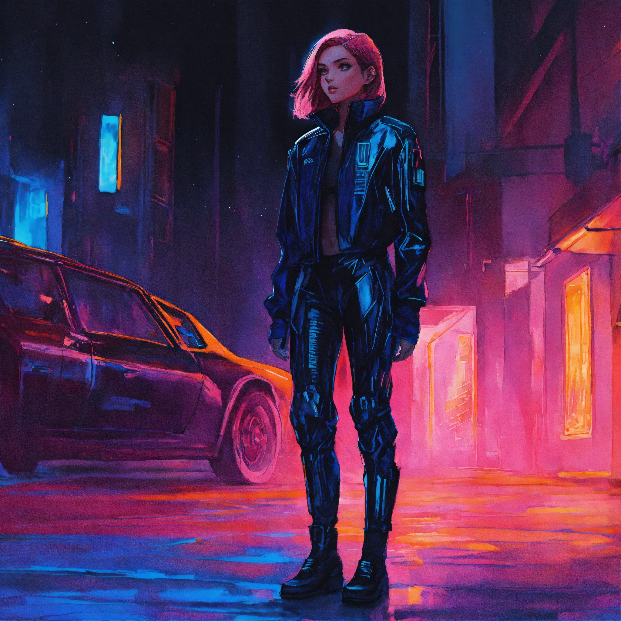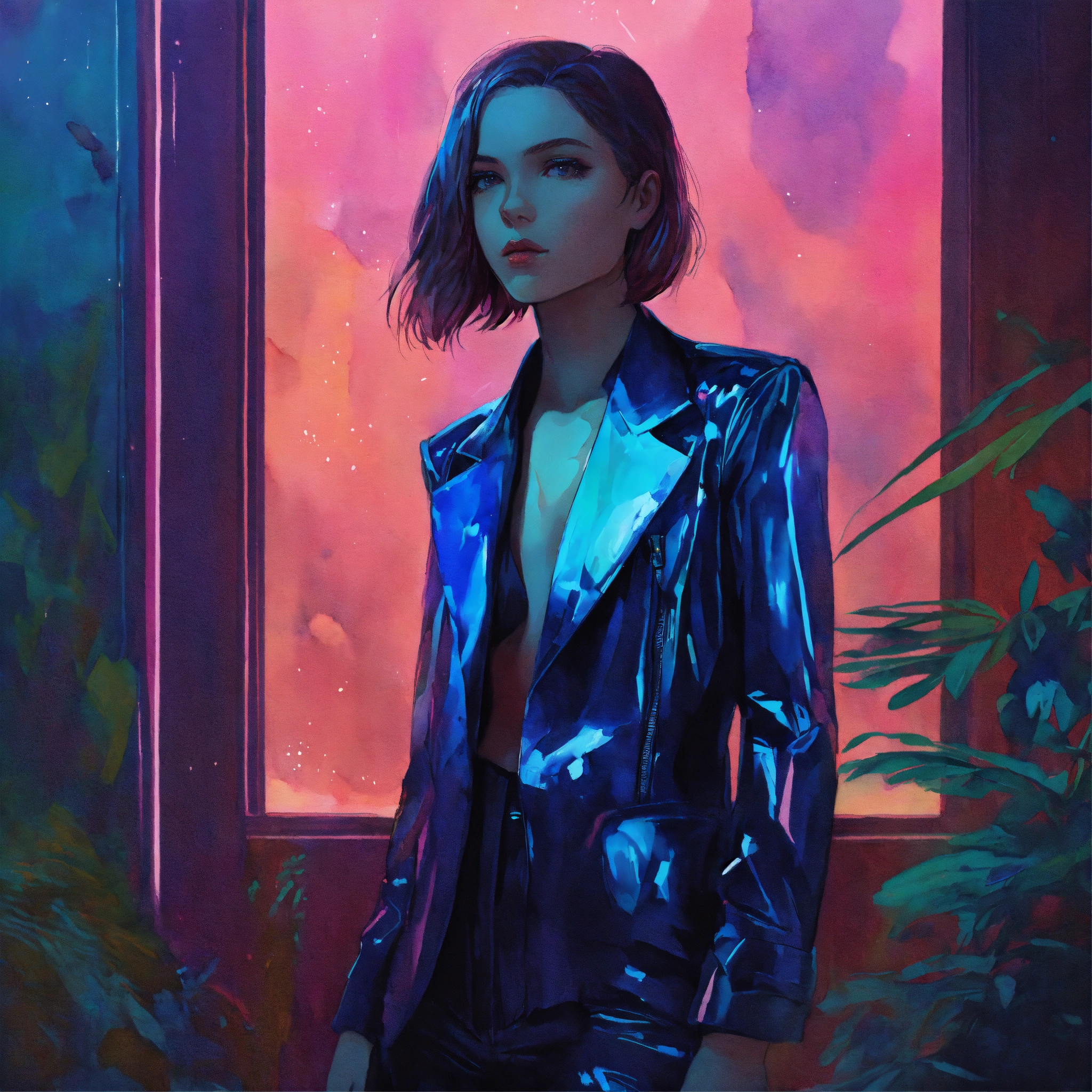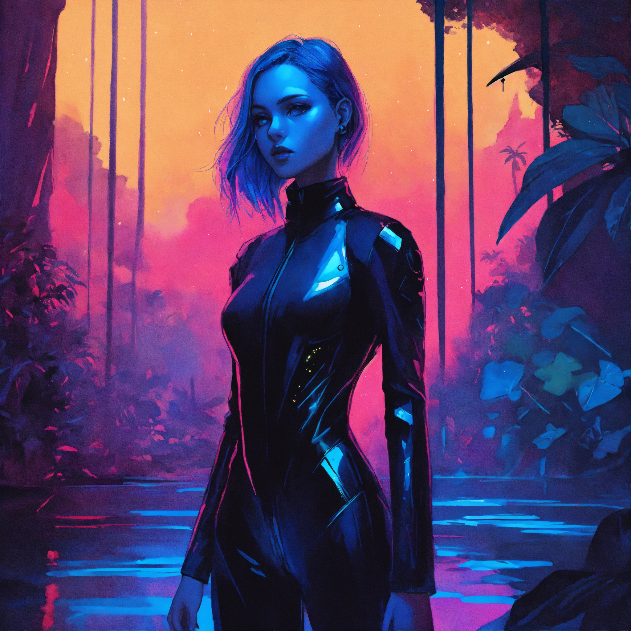 Full body illustration of a woman, young, 18 years old, beautiful, wearing a futuristic metallic black suit, alien jungle, dark neon blue light, watercolors, gloomy and depressing ambient, artwork by tom björklund