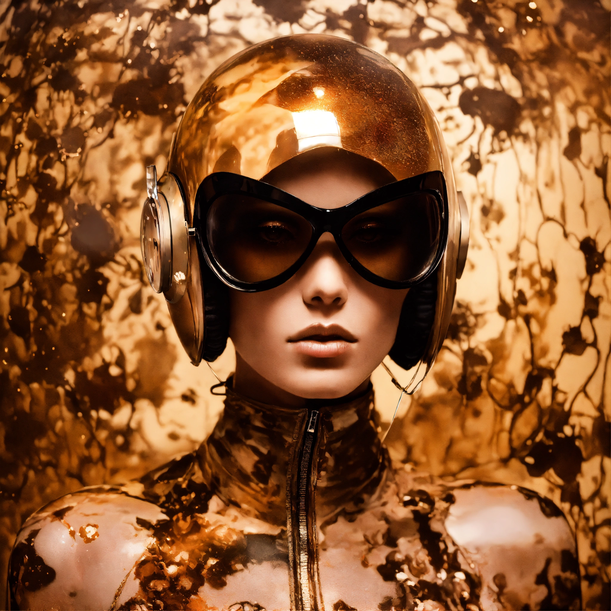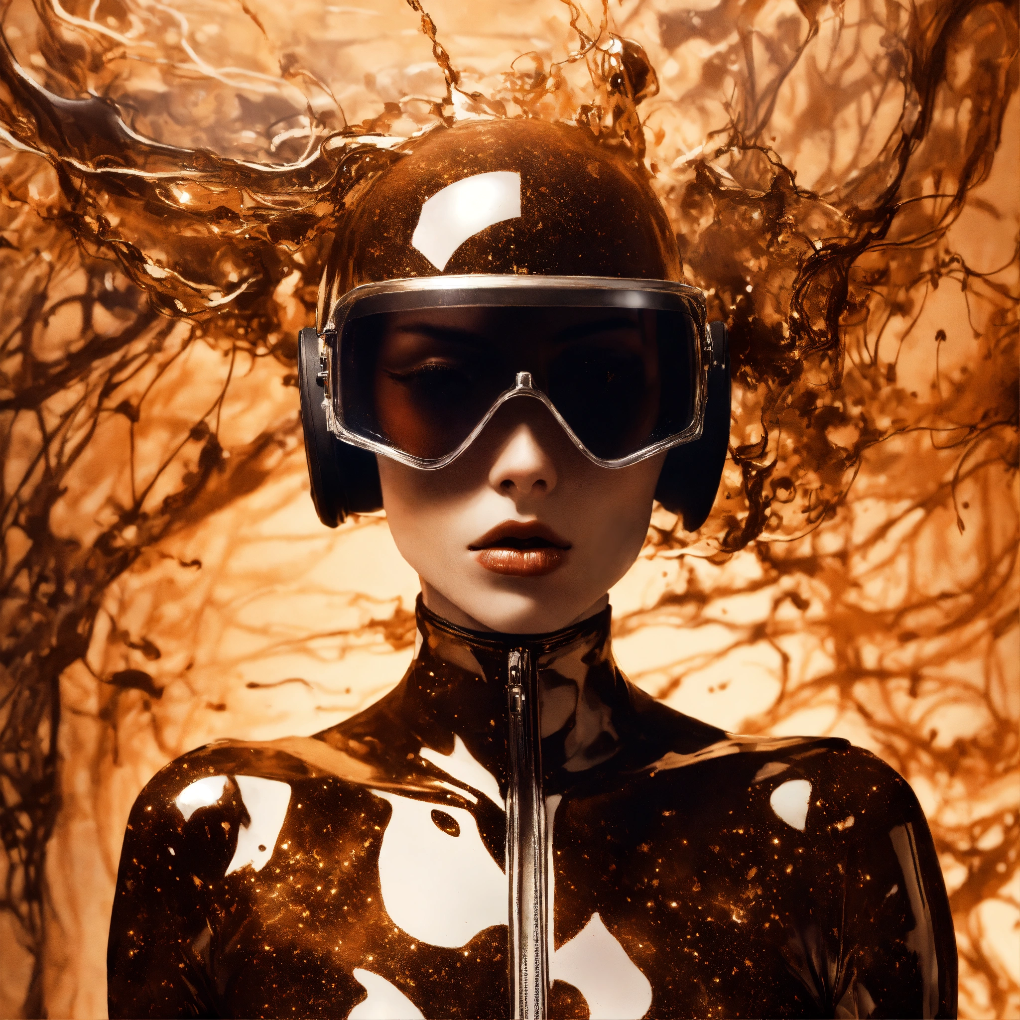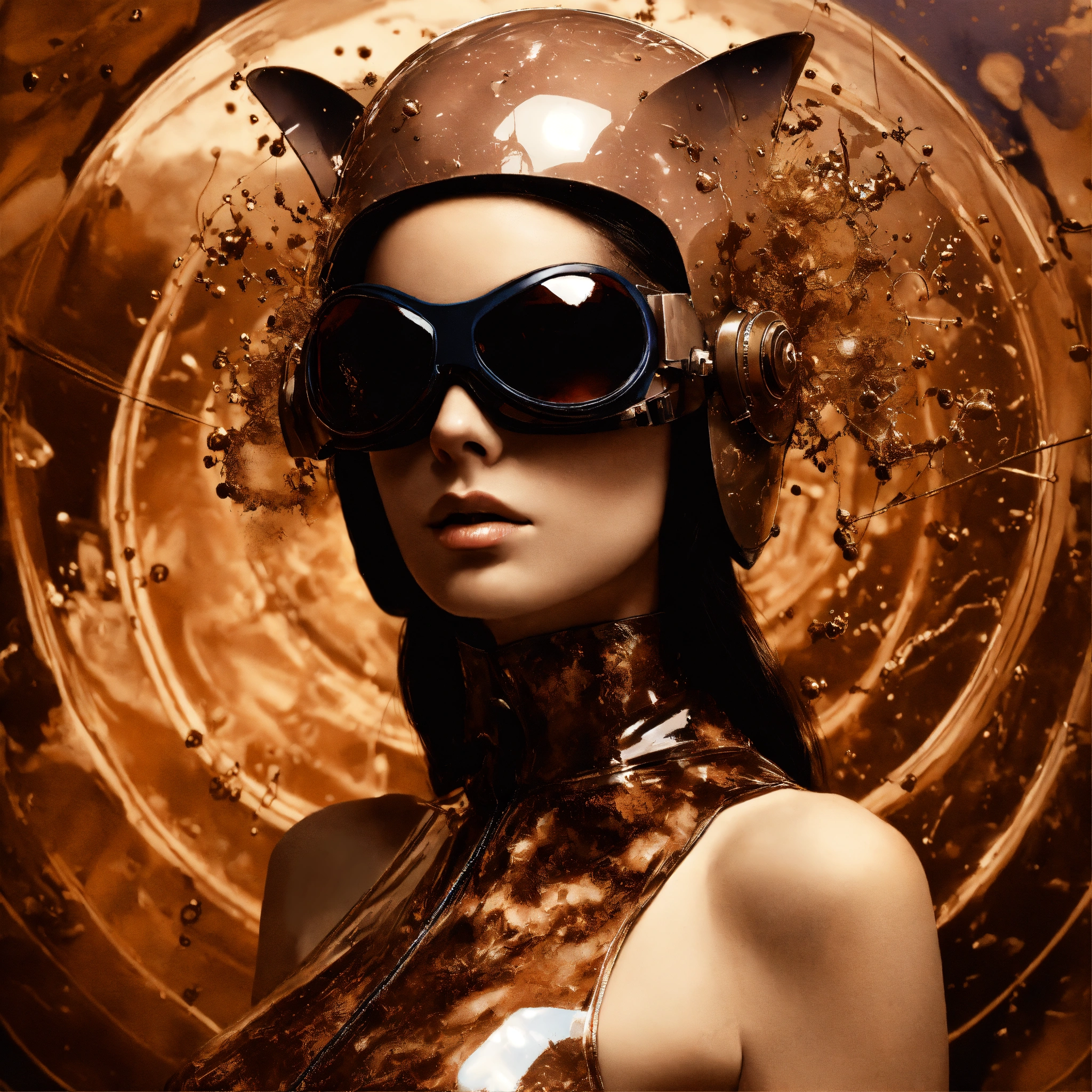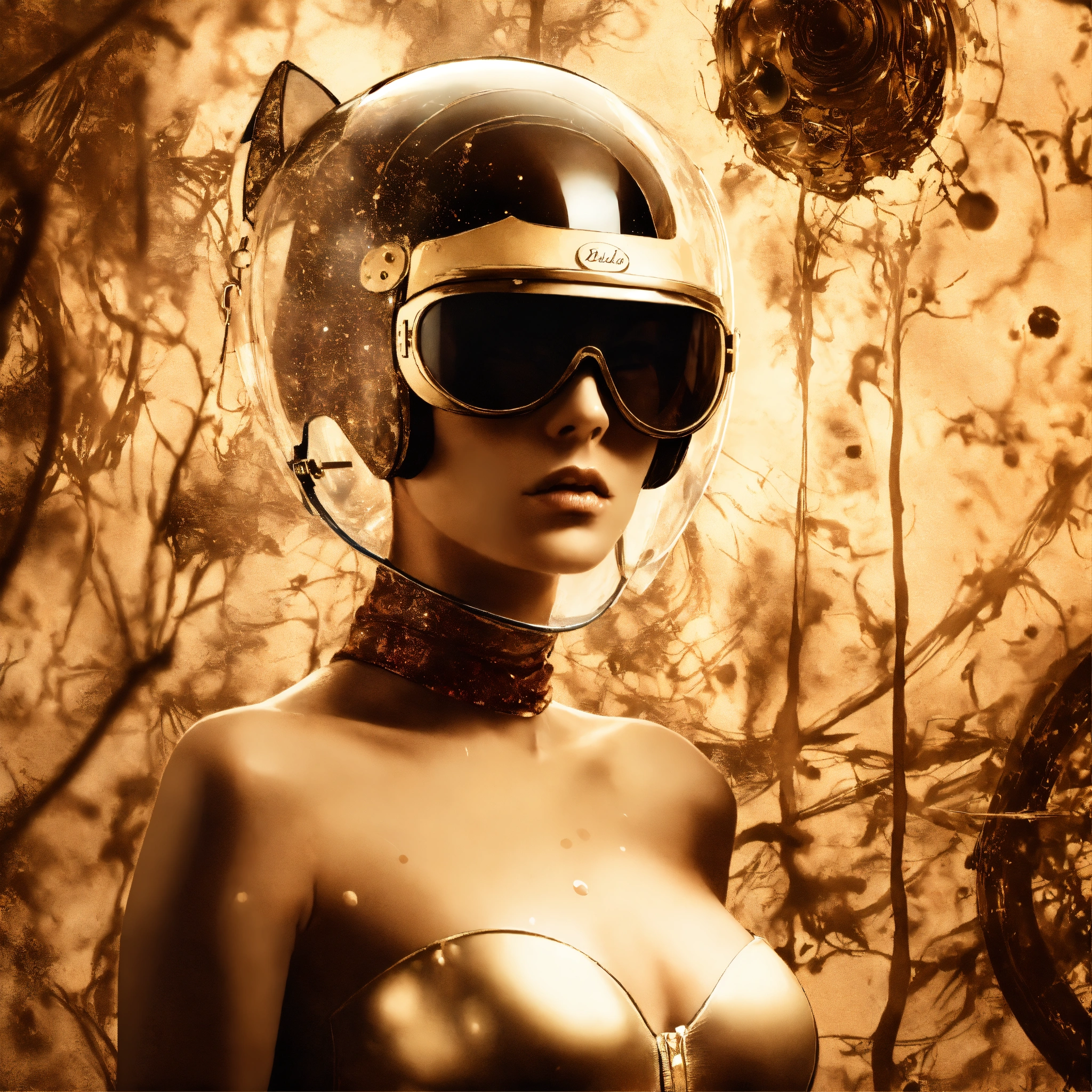 Deflagration of vintage sepia photography, a hi tech sci-fi fashion model woman, with her cat woman plexiglass helmet and sunglasses in a plexiglass bodysuit, emerges from spiral vintage sepia ink splatters, 80 degree view, art by sergio lopez, natalie shau, james jean and salvador dali