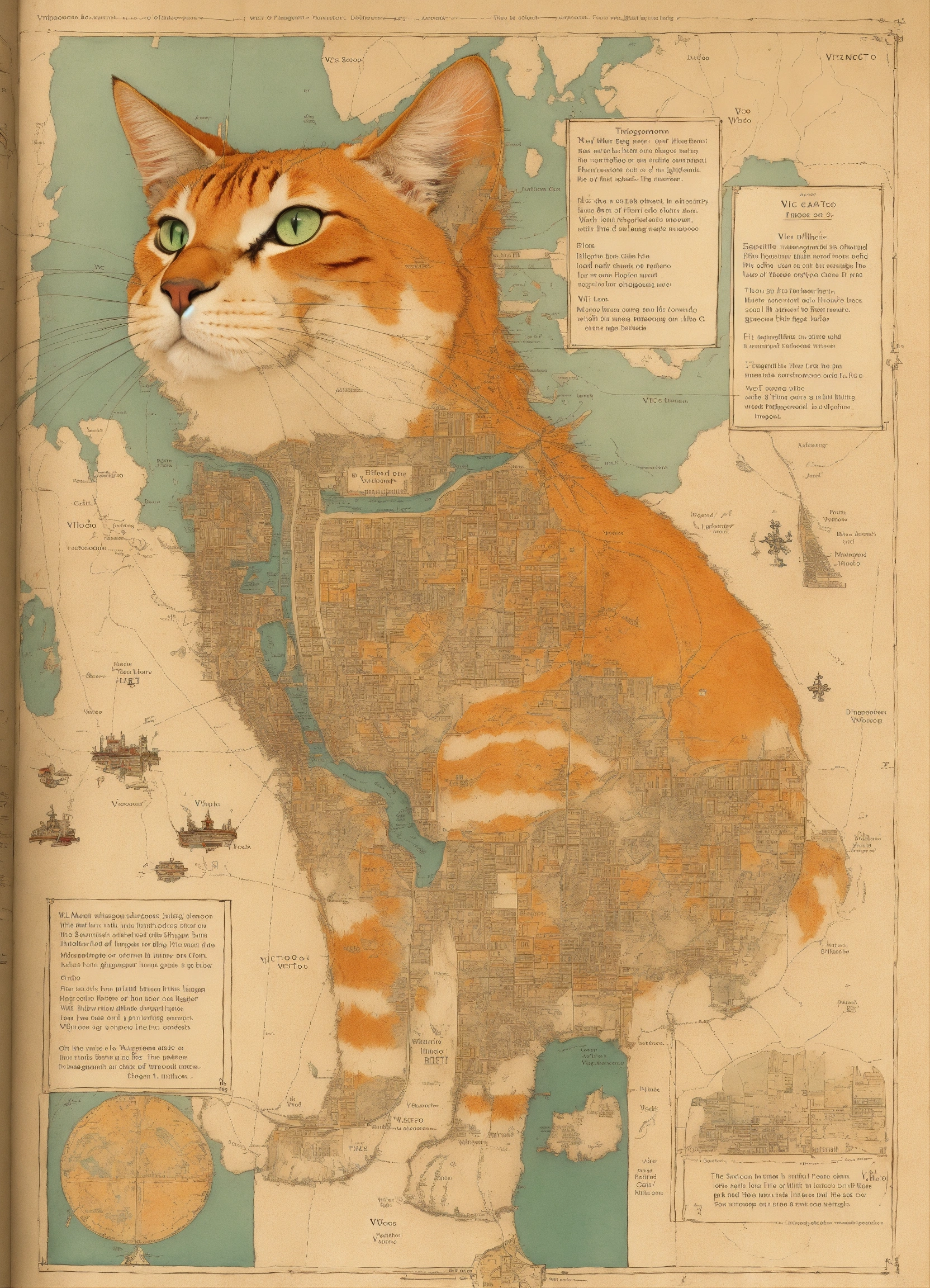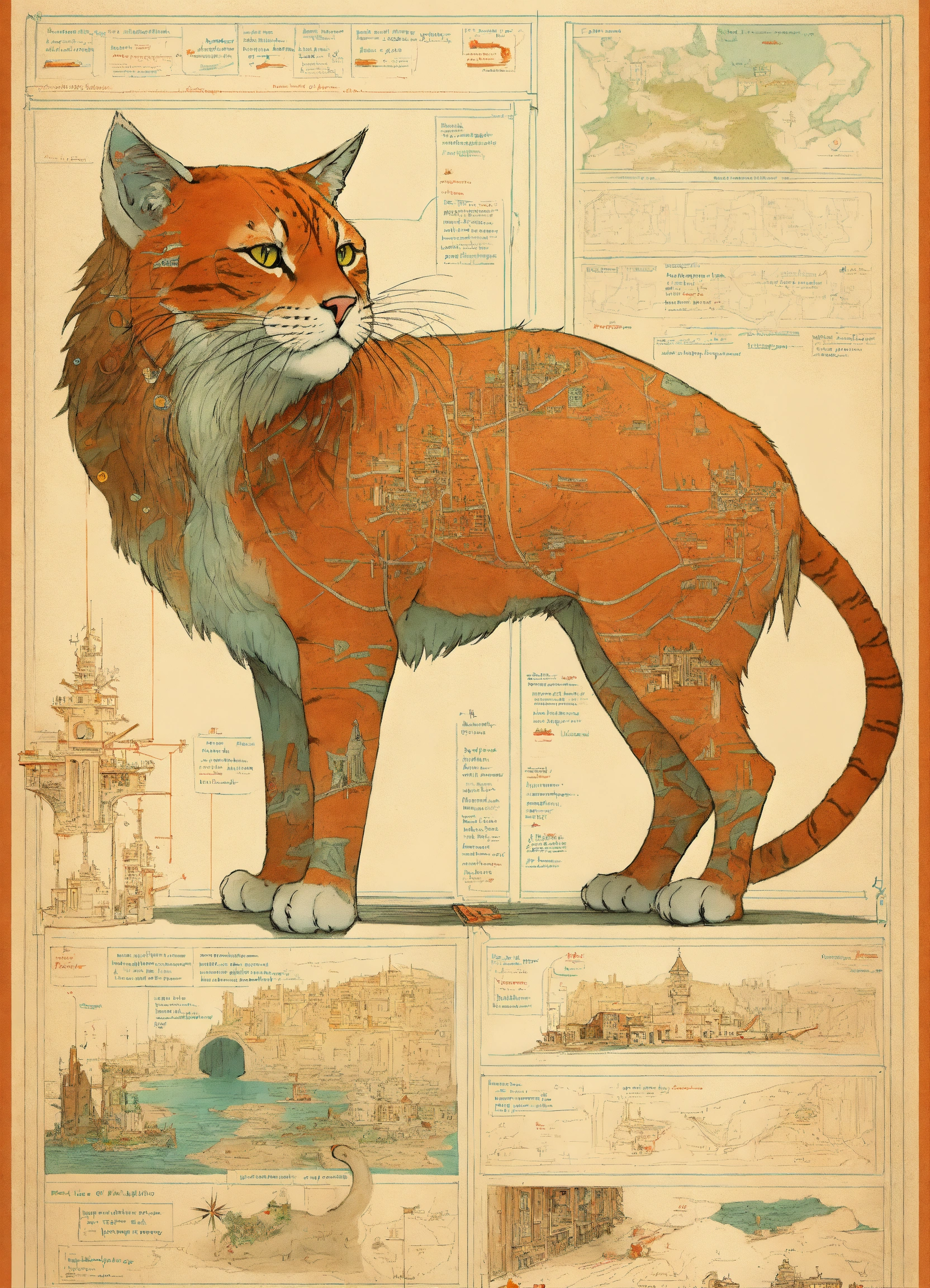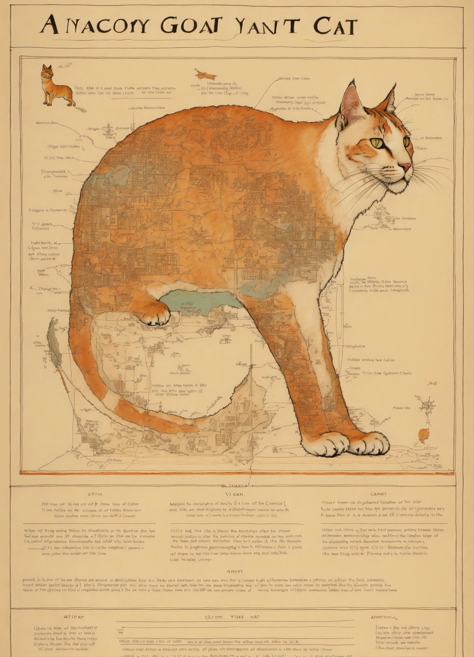 Anatomy of the giant cat, diagrams, map, marginalia, sketchbook, old script, inhabited initials, pastel infographic by wes anderson and victo ngai