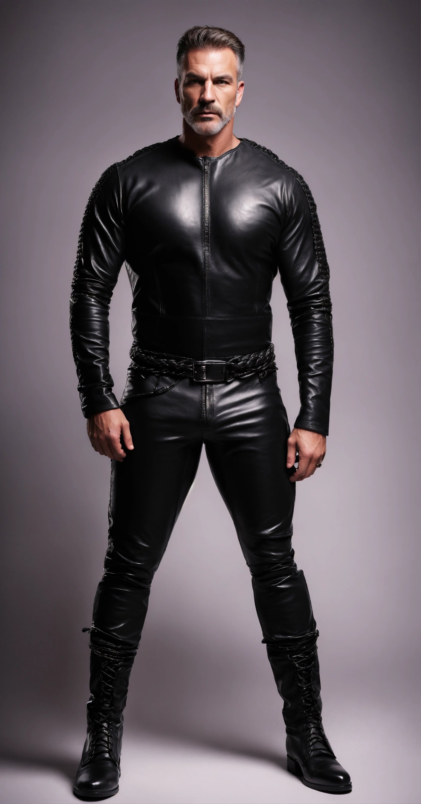A tough looking man in ultratight leather trousers and ultratight leather t-shirt, simple white background, high boots, standing, muscular body, a rope in his hands