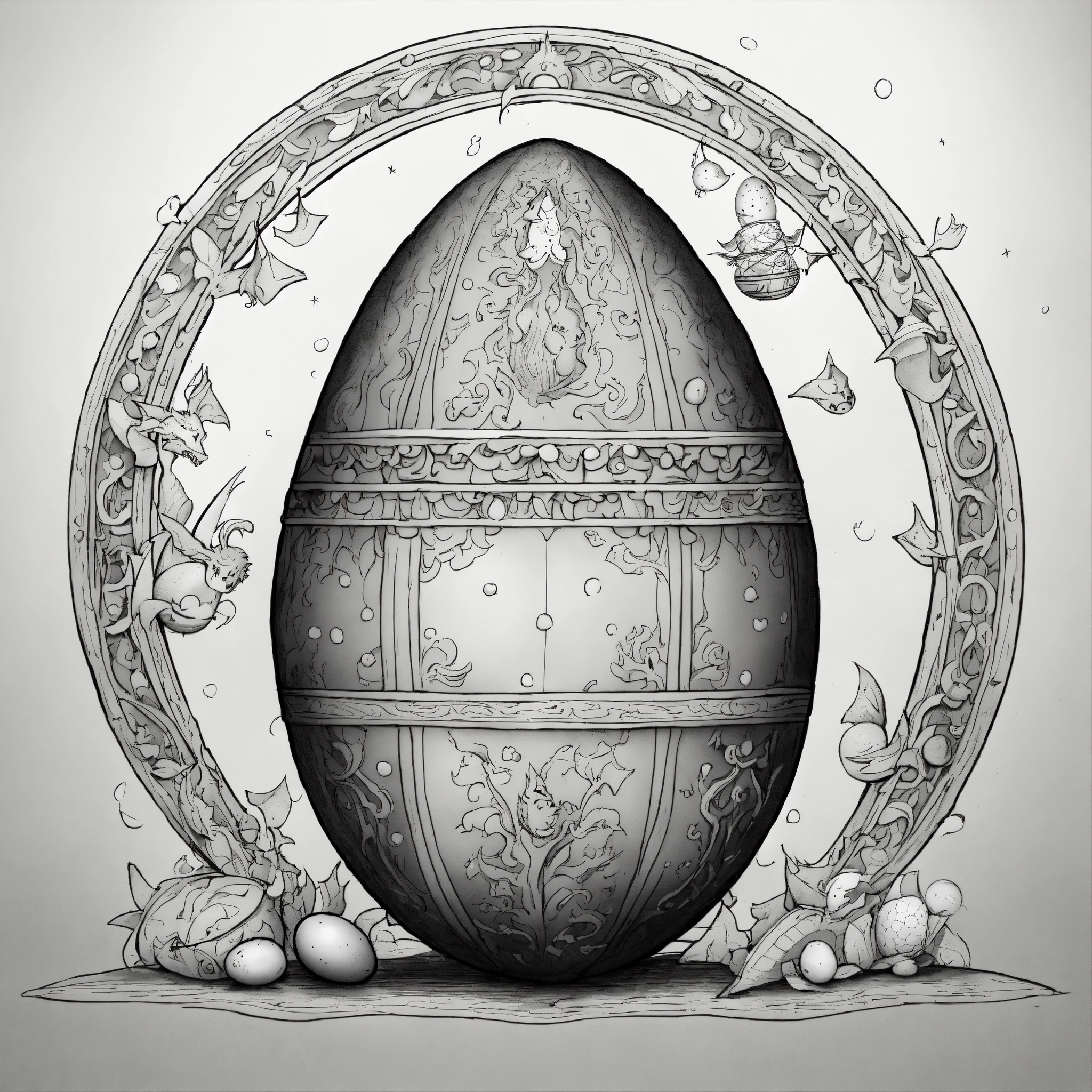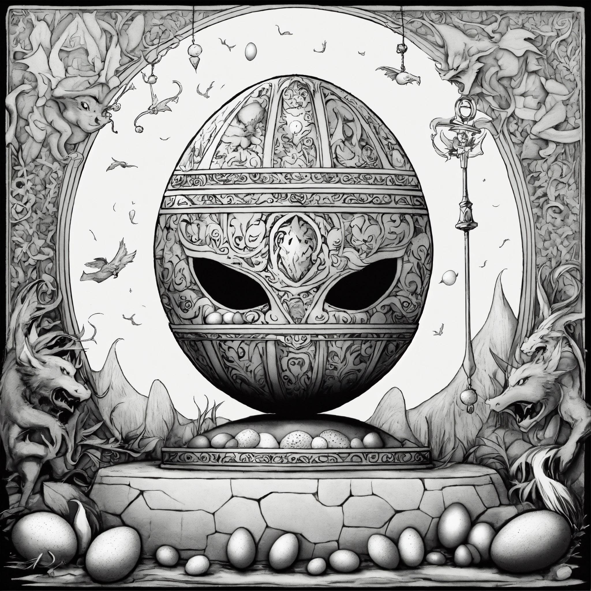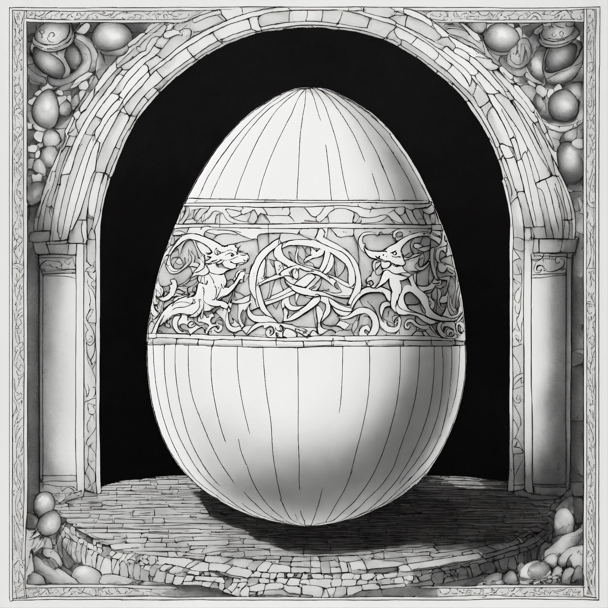 Draw onedragon egg with a funny lutin fantastic medieval, the drawing is in black and white with a plain background