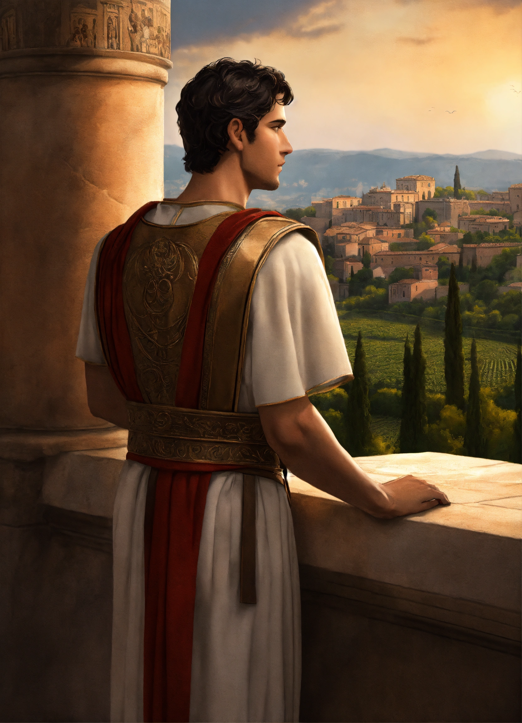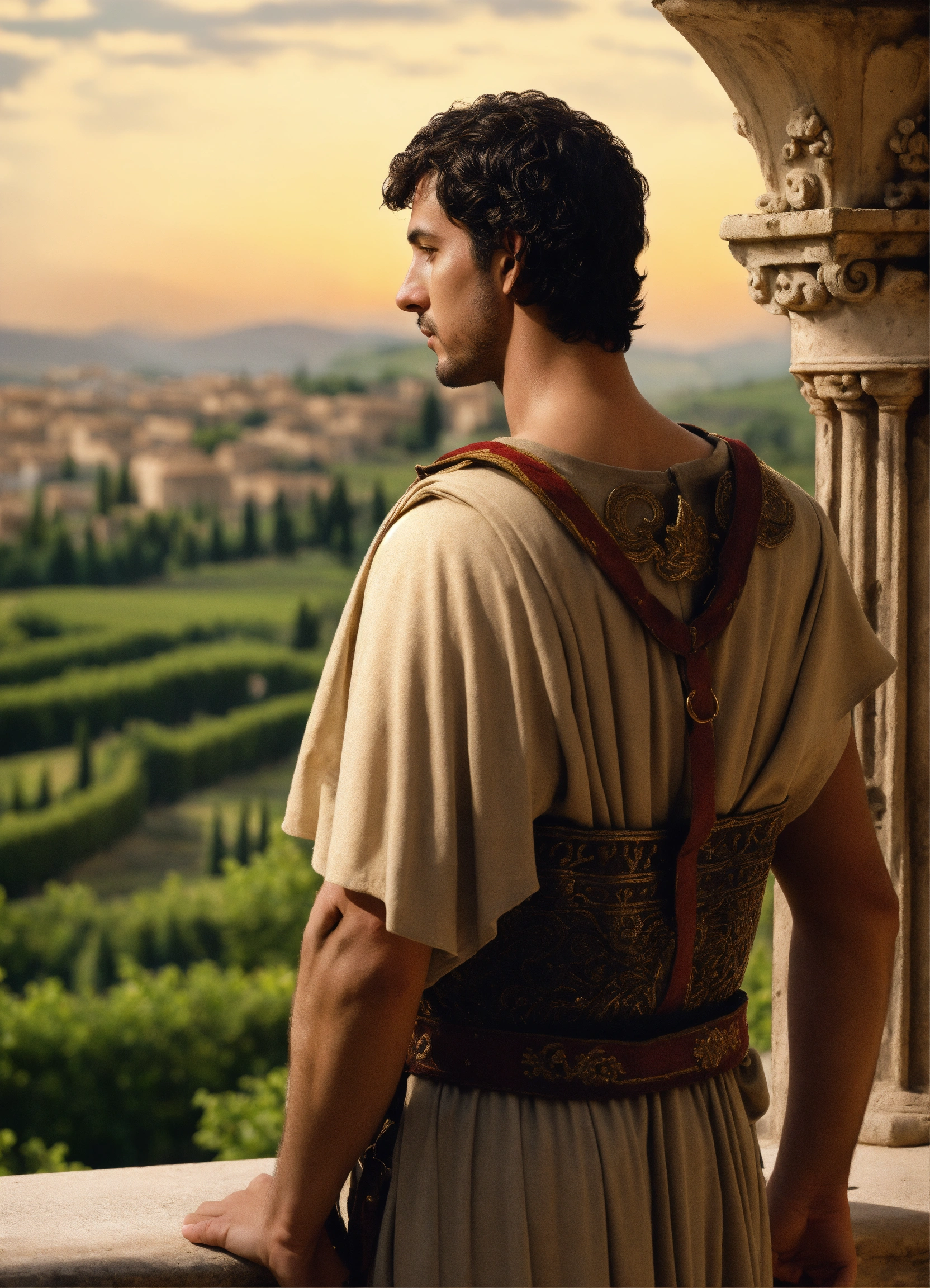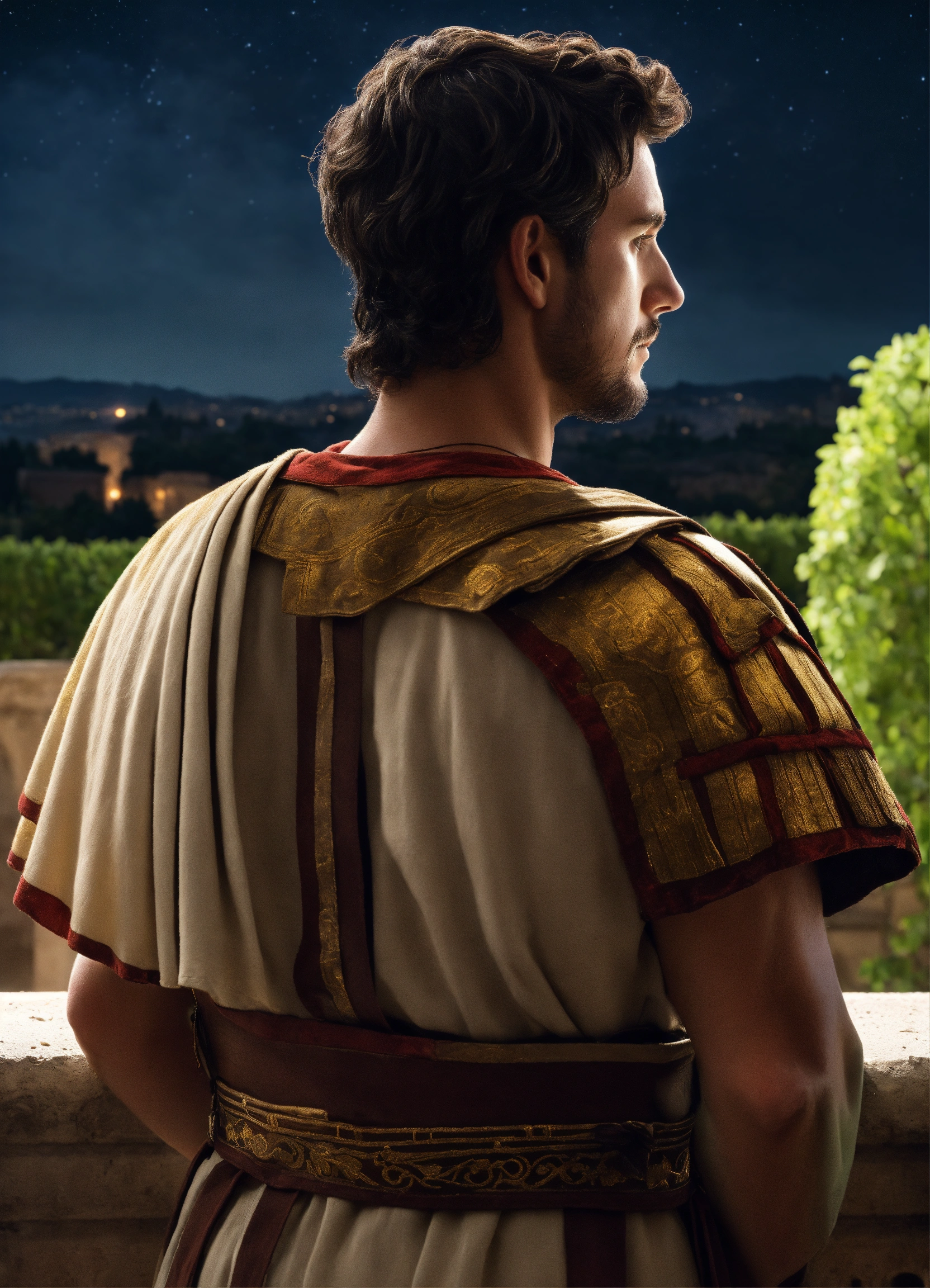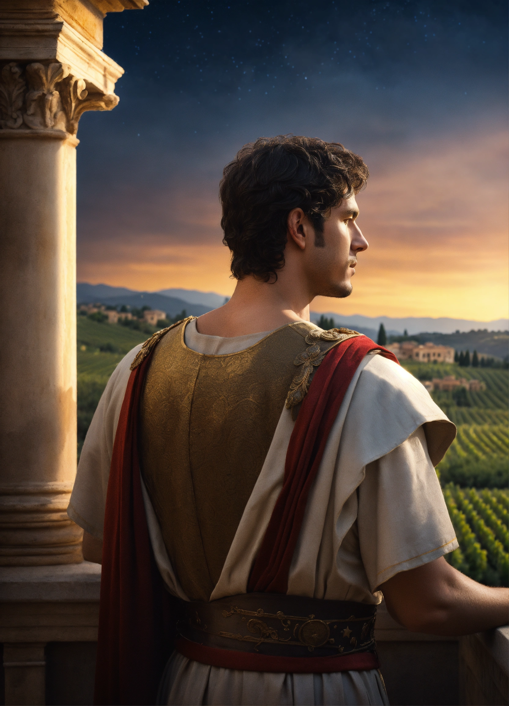 Close-up back view of a young, tall, noble, thin, slender, handsome, short hair, dark-haired roman tribune wearing simple historical roman clothes, light-colored light tunic, solemn, 50 years old, historically accurate, ancient rome, he is looking to the landscape of vineyards from the balcony of his rich and colored roman villa, detailed decor, photo realistic, hyper detailed, it is night with a dark sky and stars
