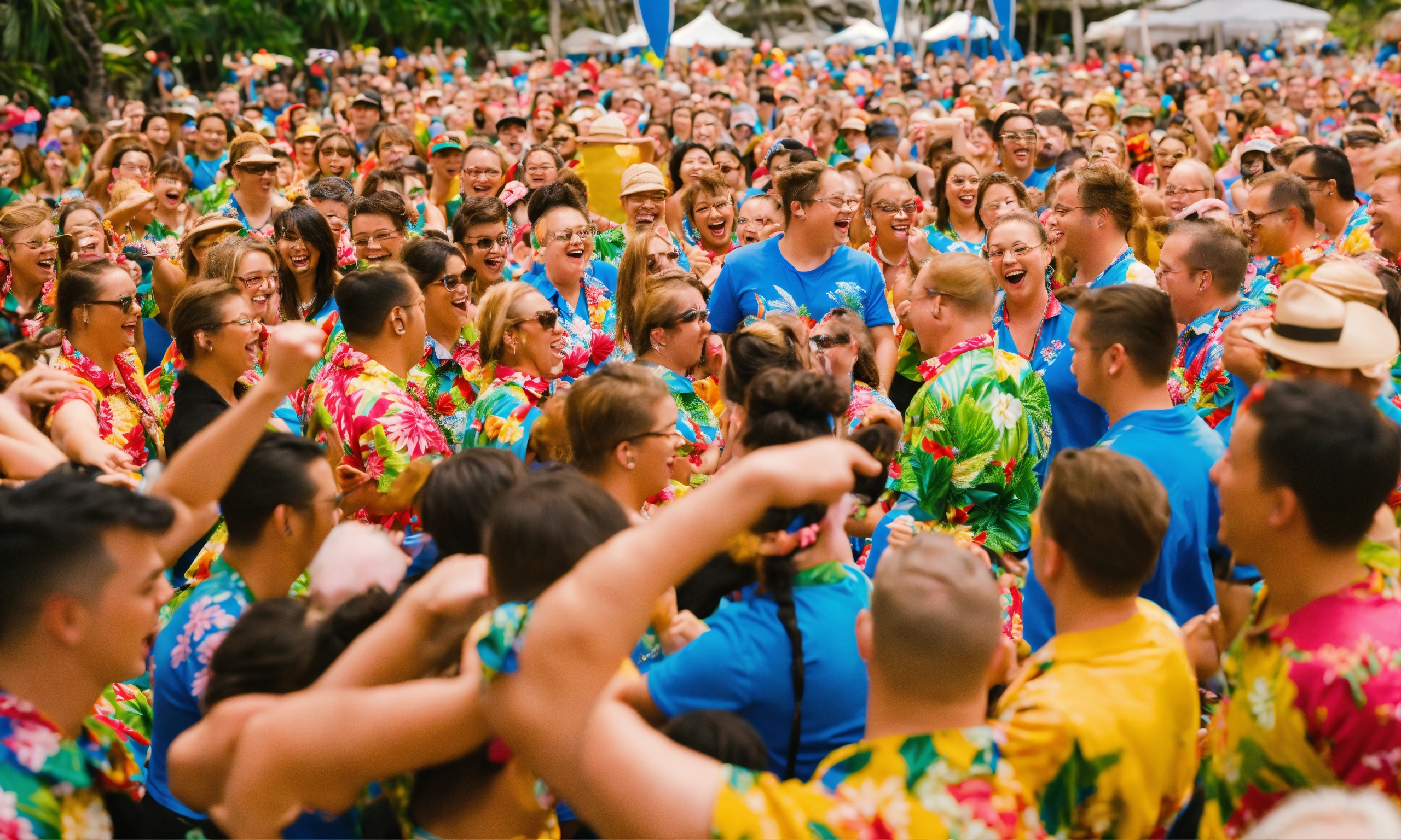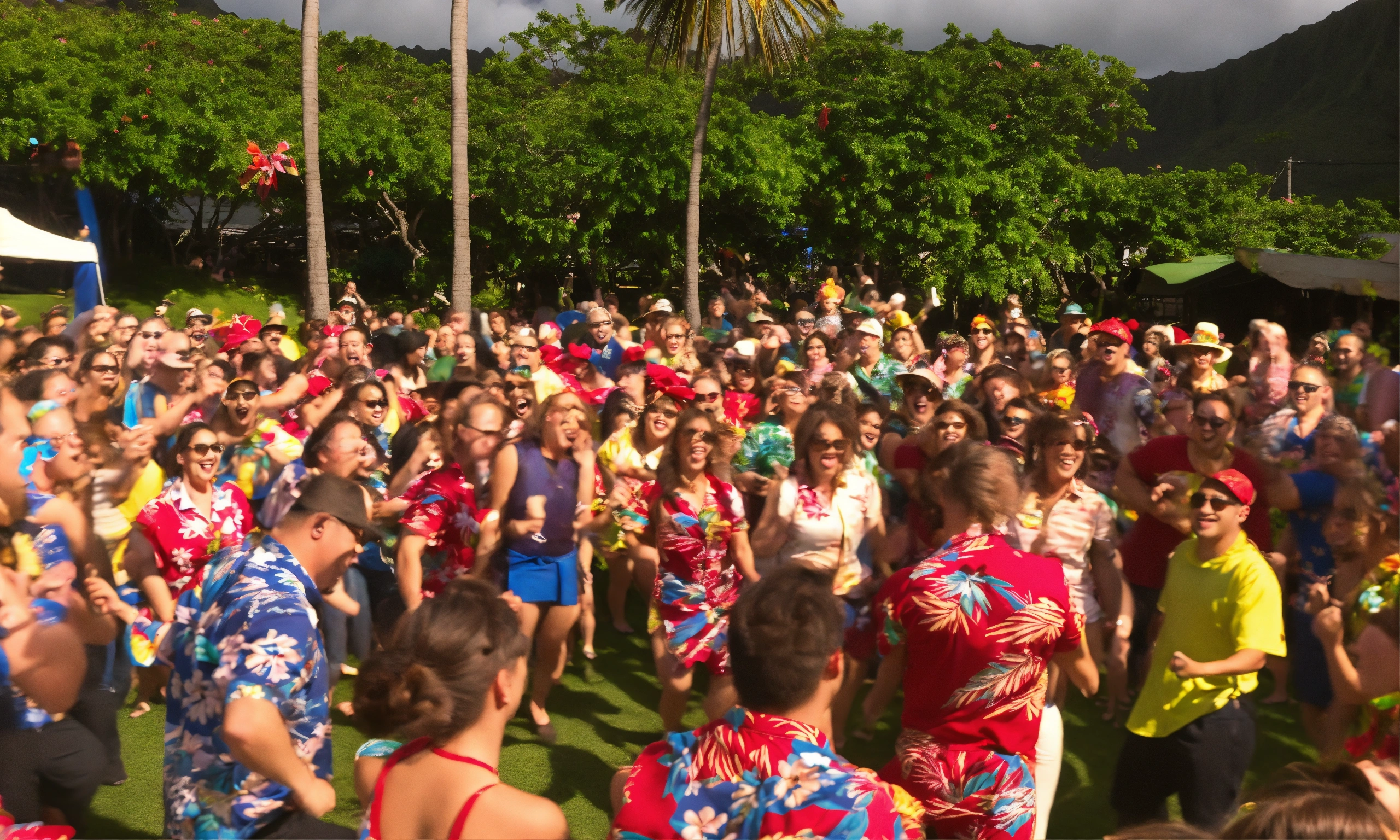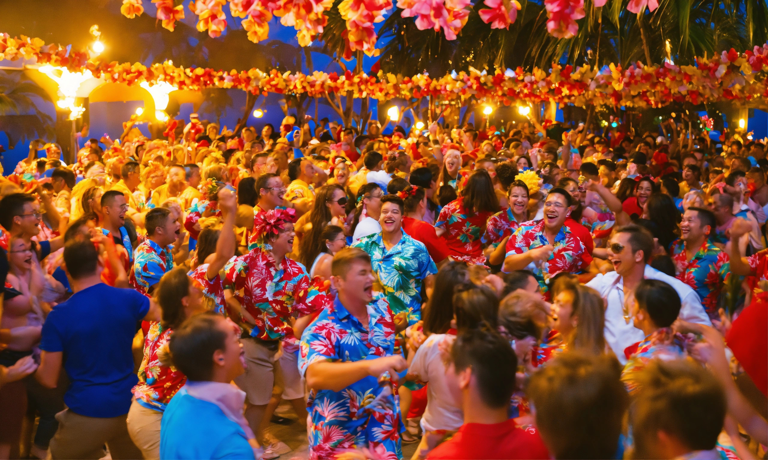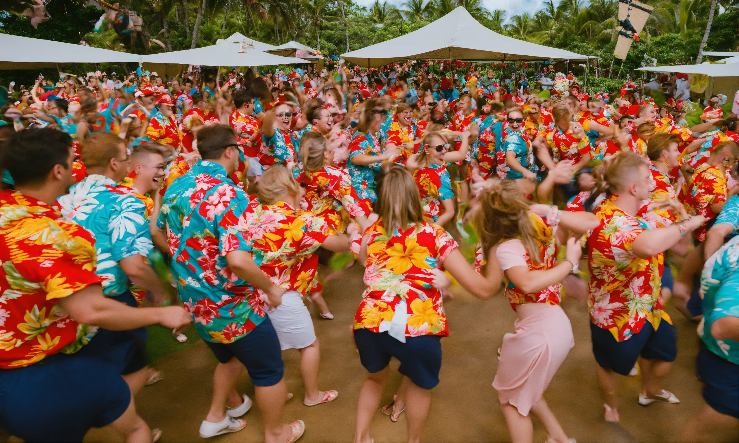 Big crowd of people wearing hawaii shirts and dancing like crazy