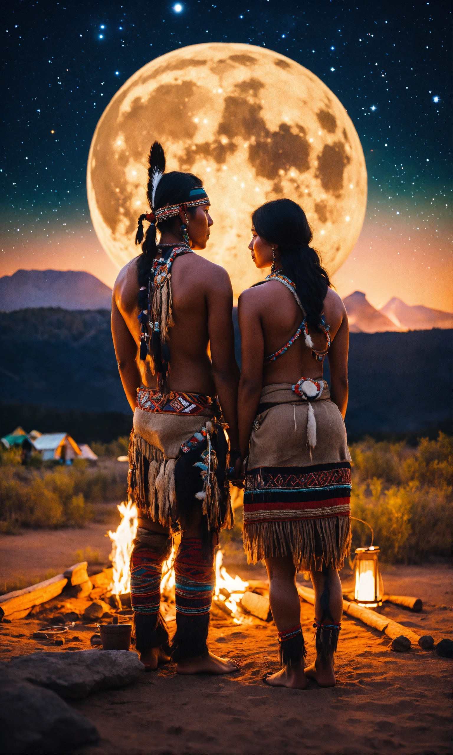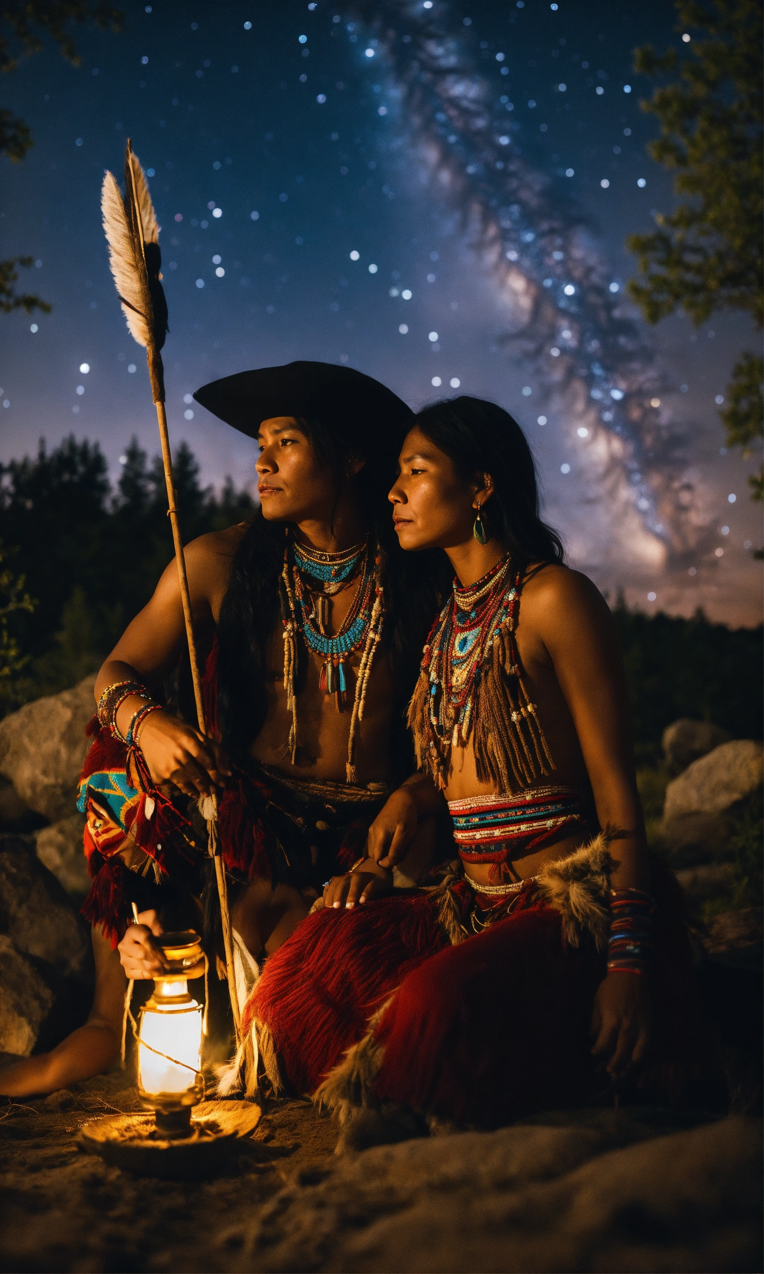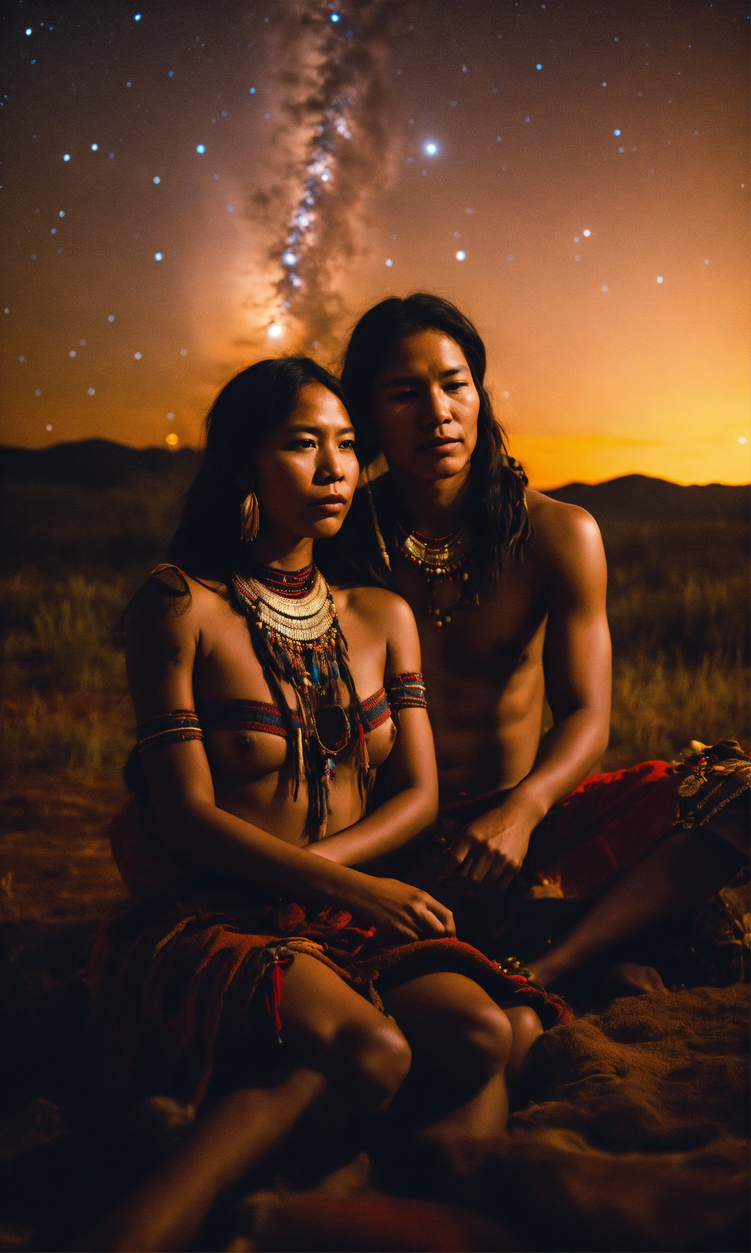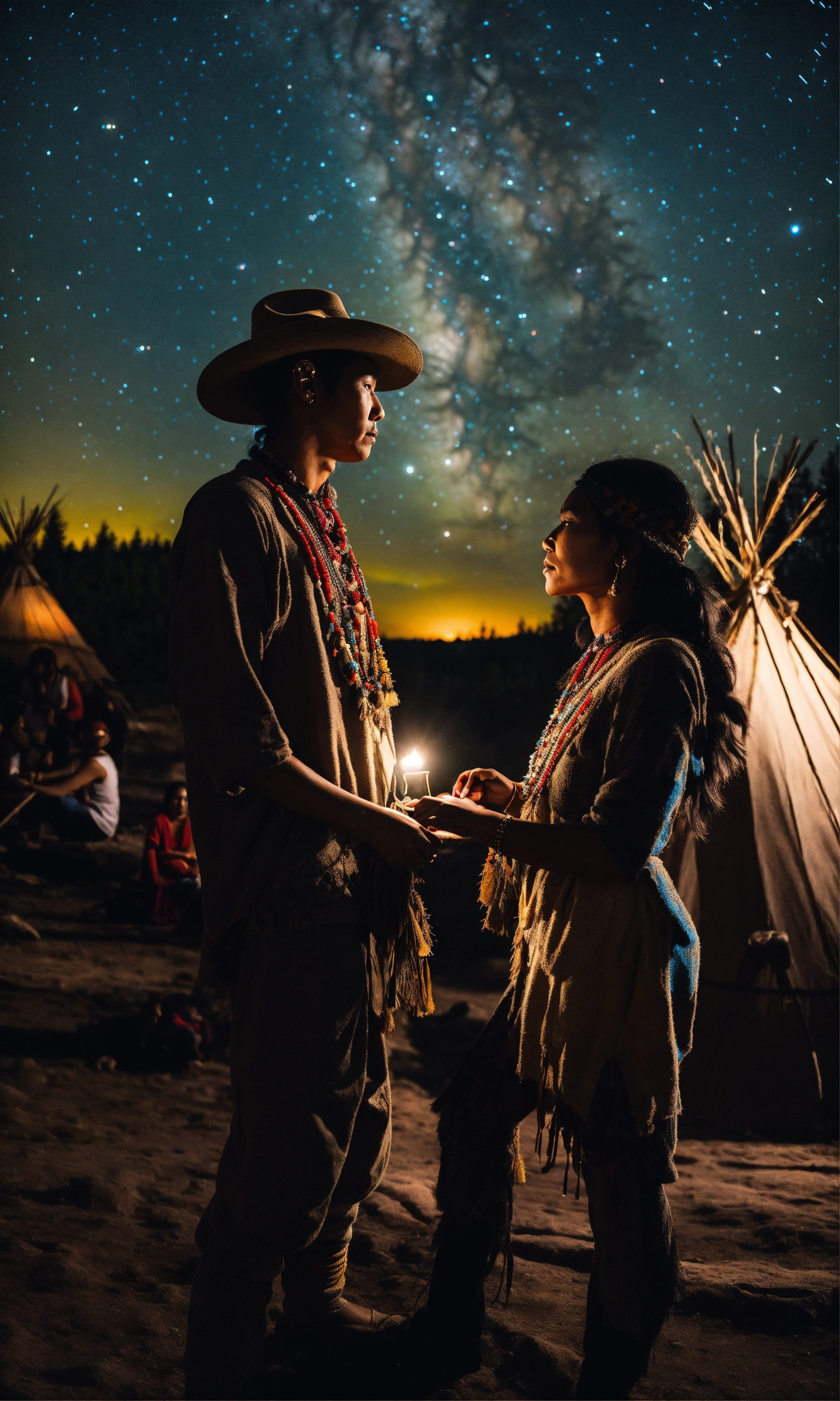 Cinematic image of indigenous lovers tribe members of north america under the stars