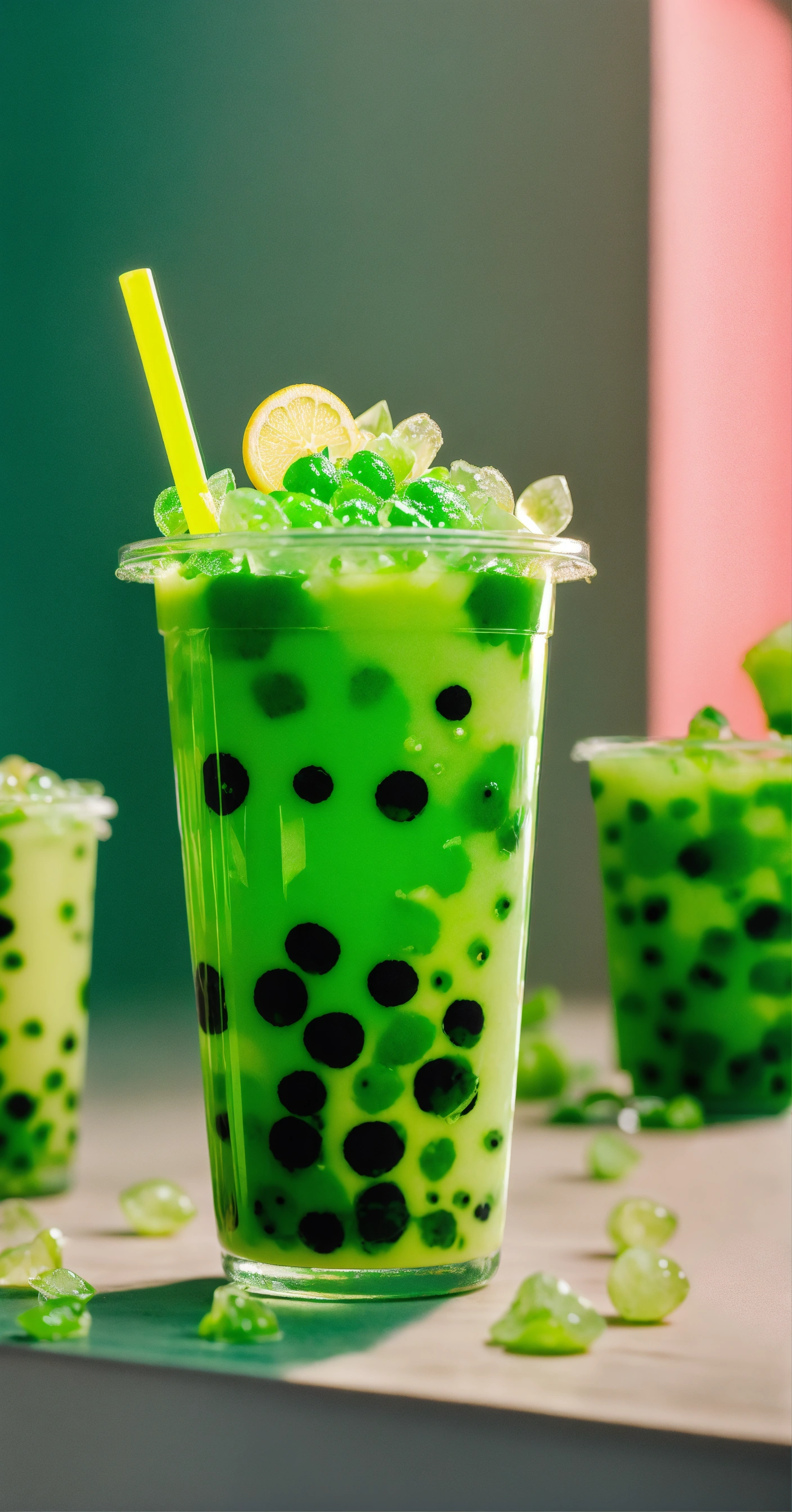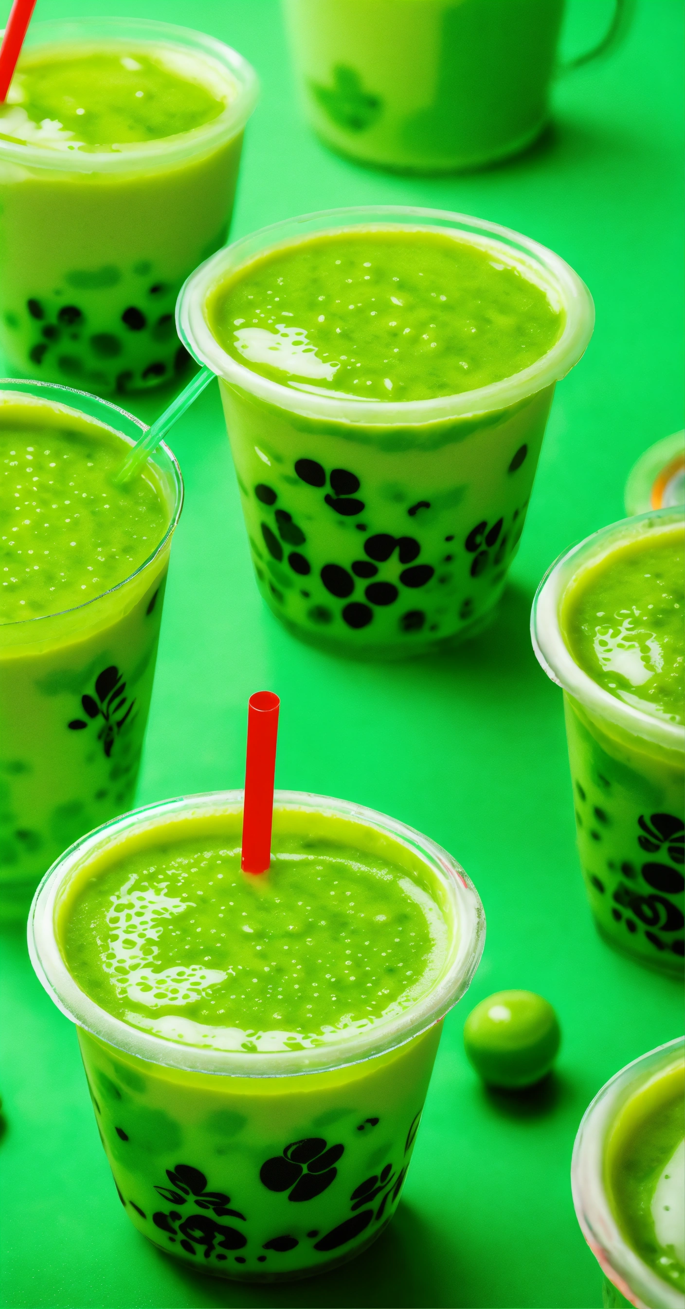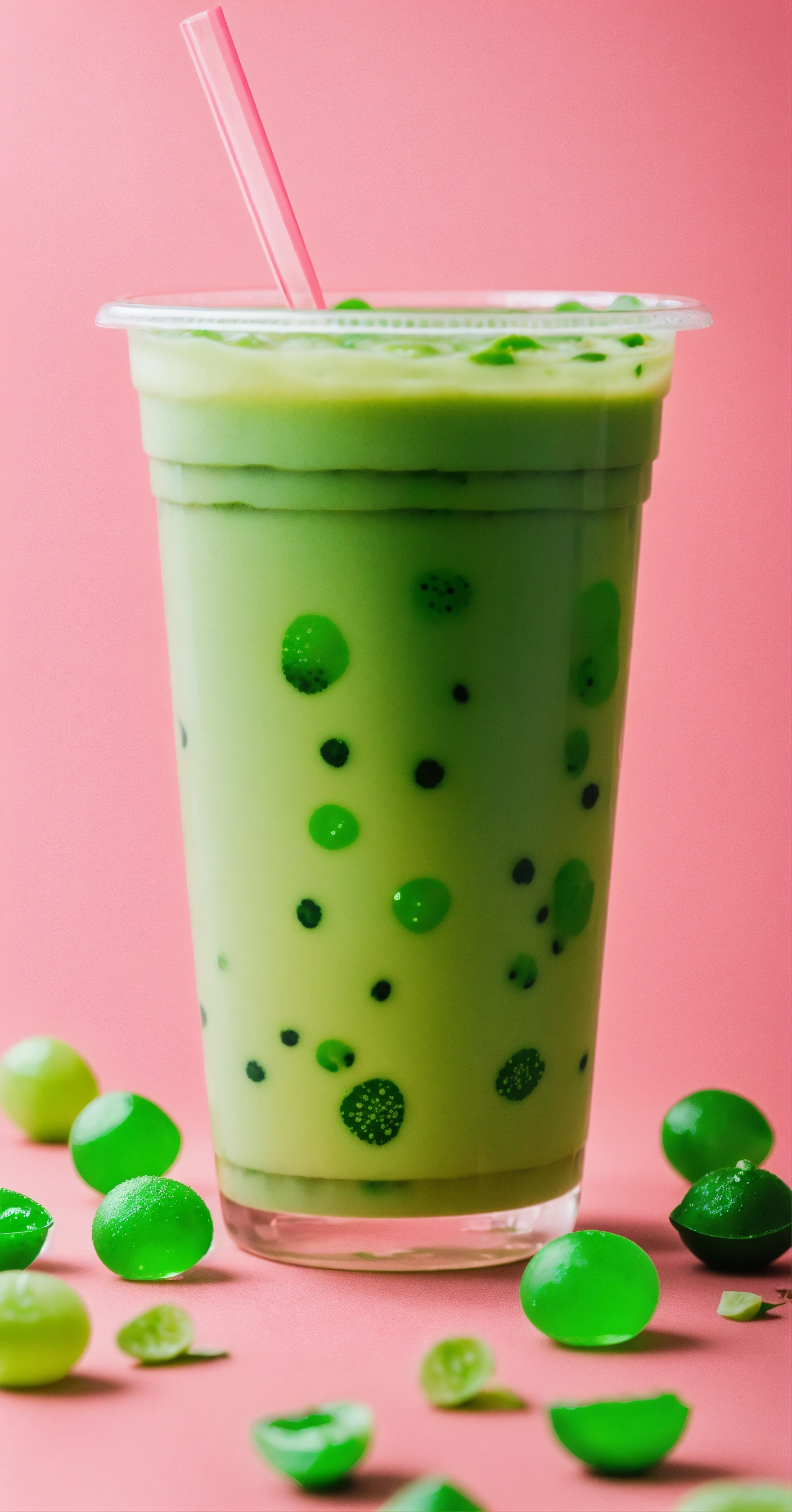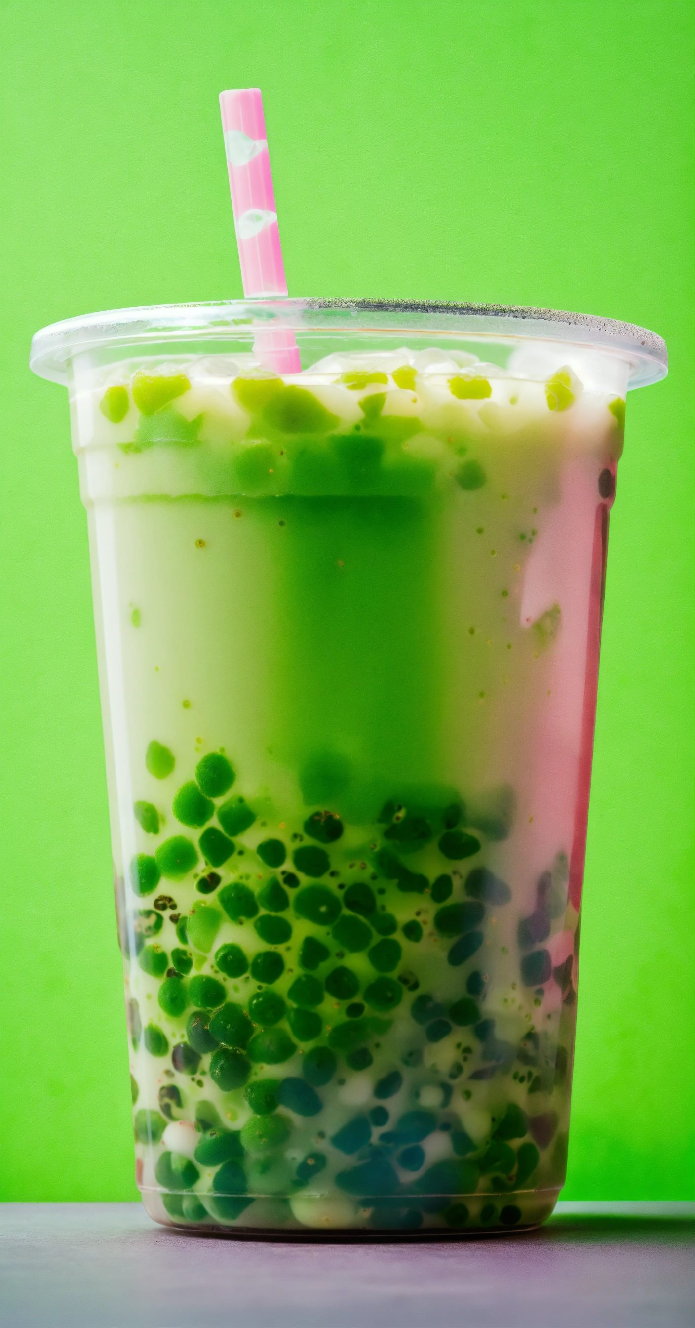 Floating green boba tea, a lot of bobas, stickers on cup, clear cup, studio photography, neutral tone background, pops of neon green