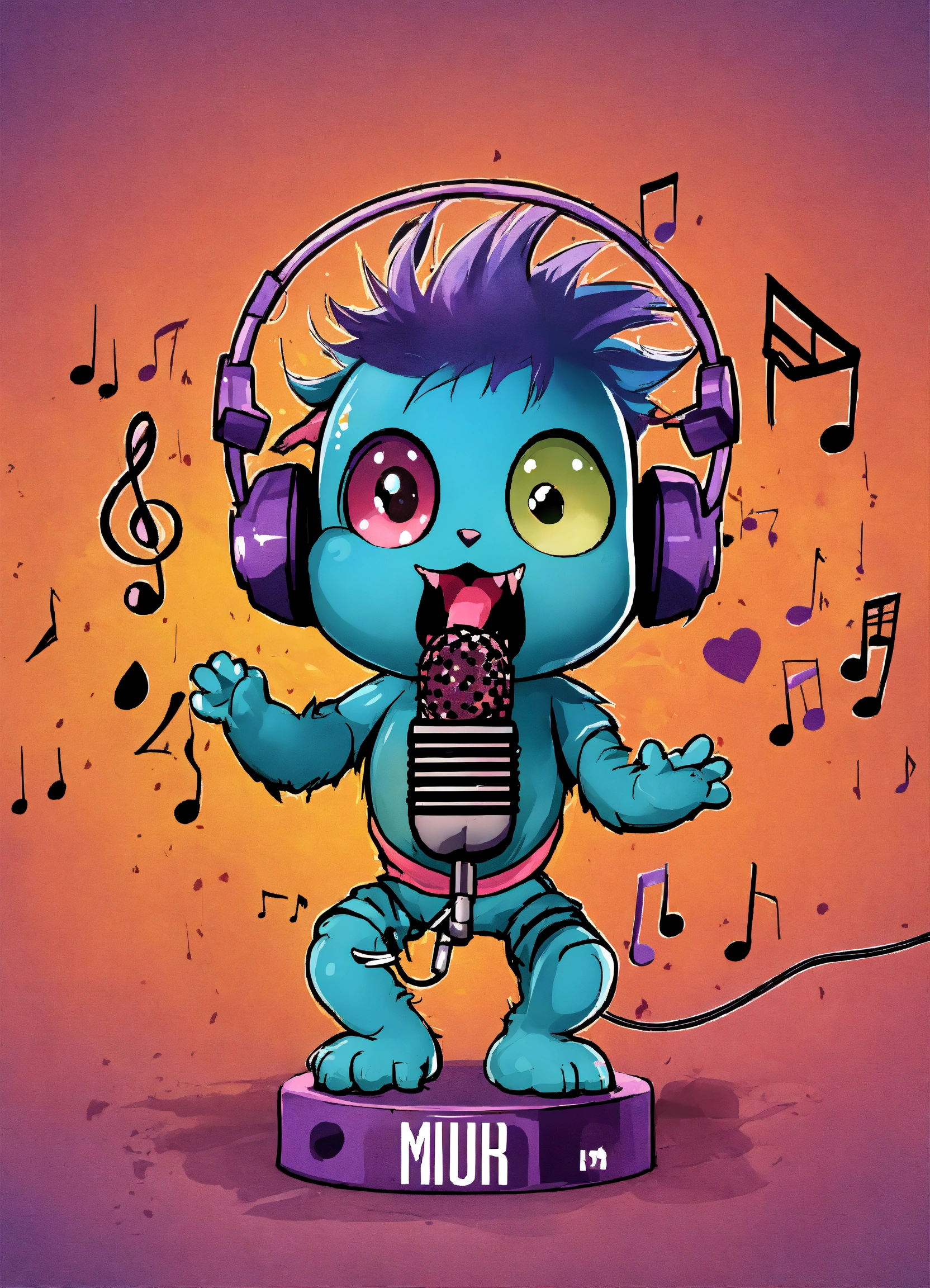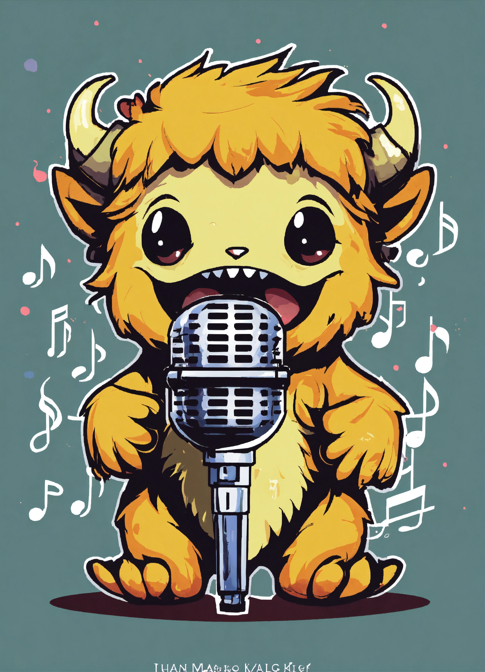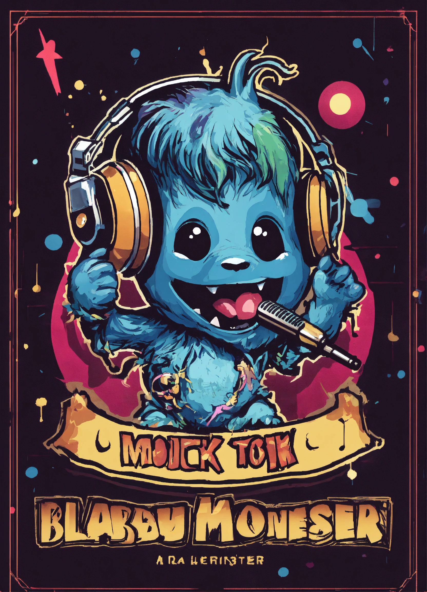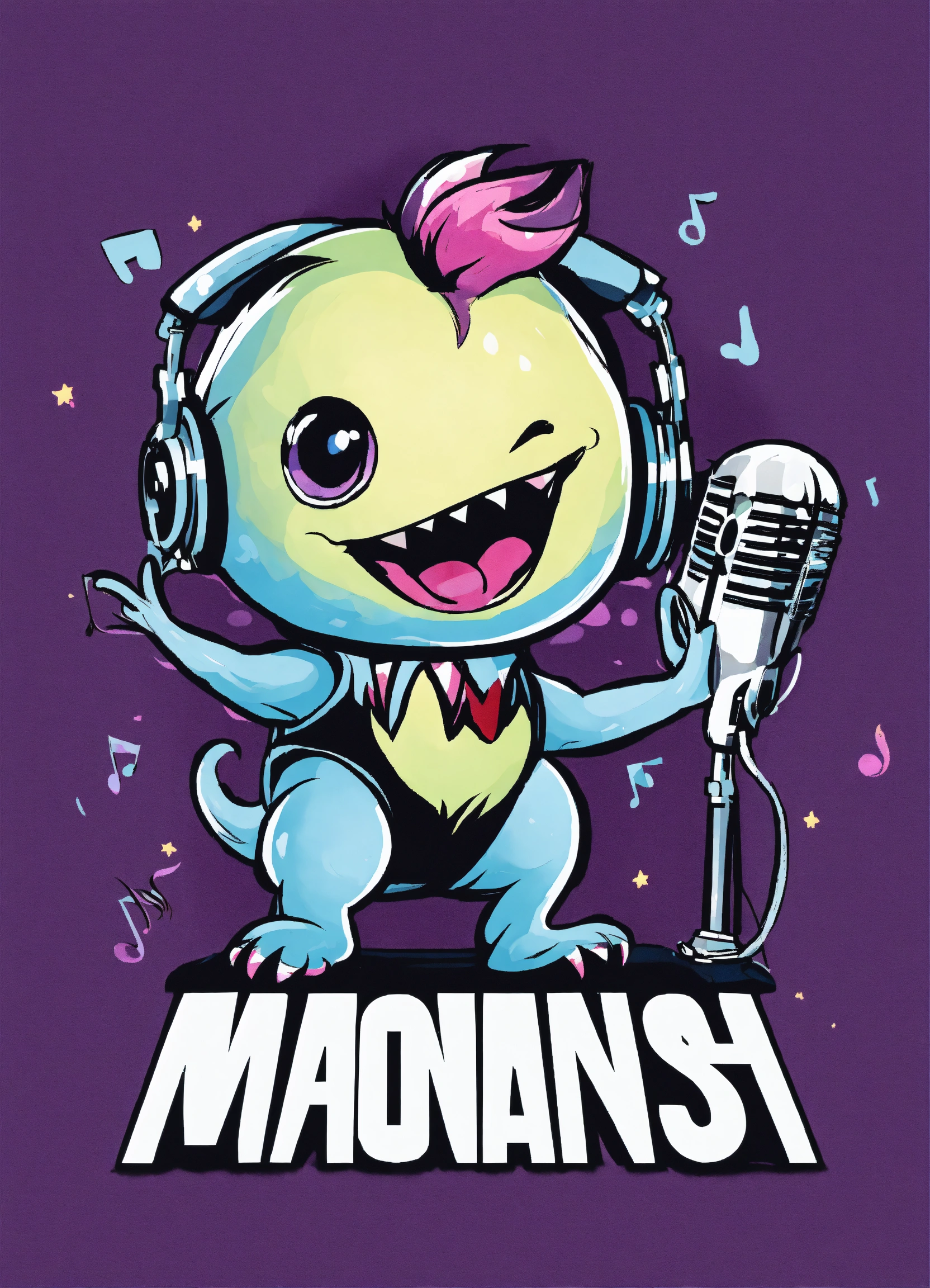 Logo of a a baby monster holding a microphone with music notes emanating from it, using a modern and edgy font