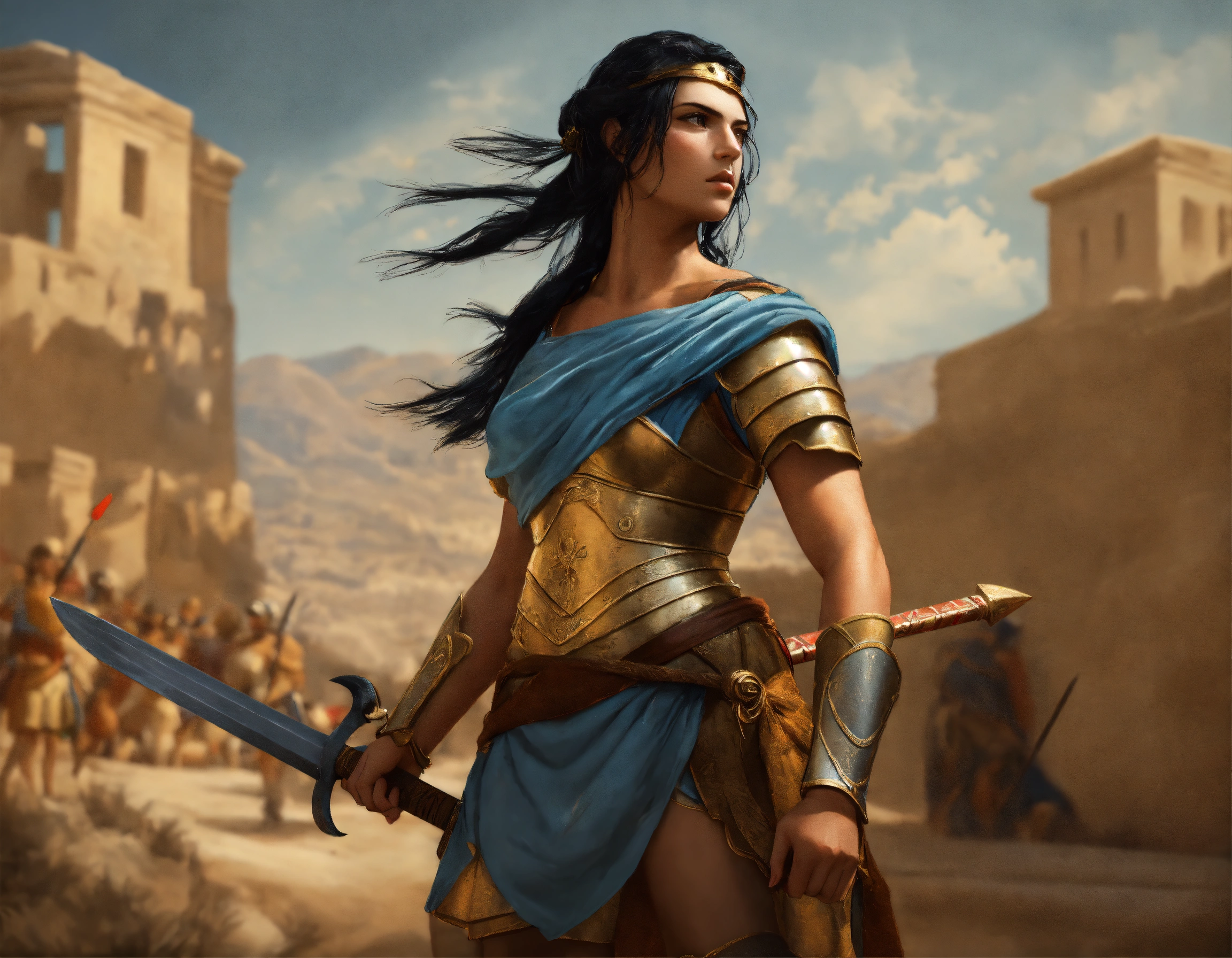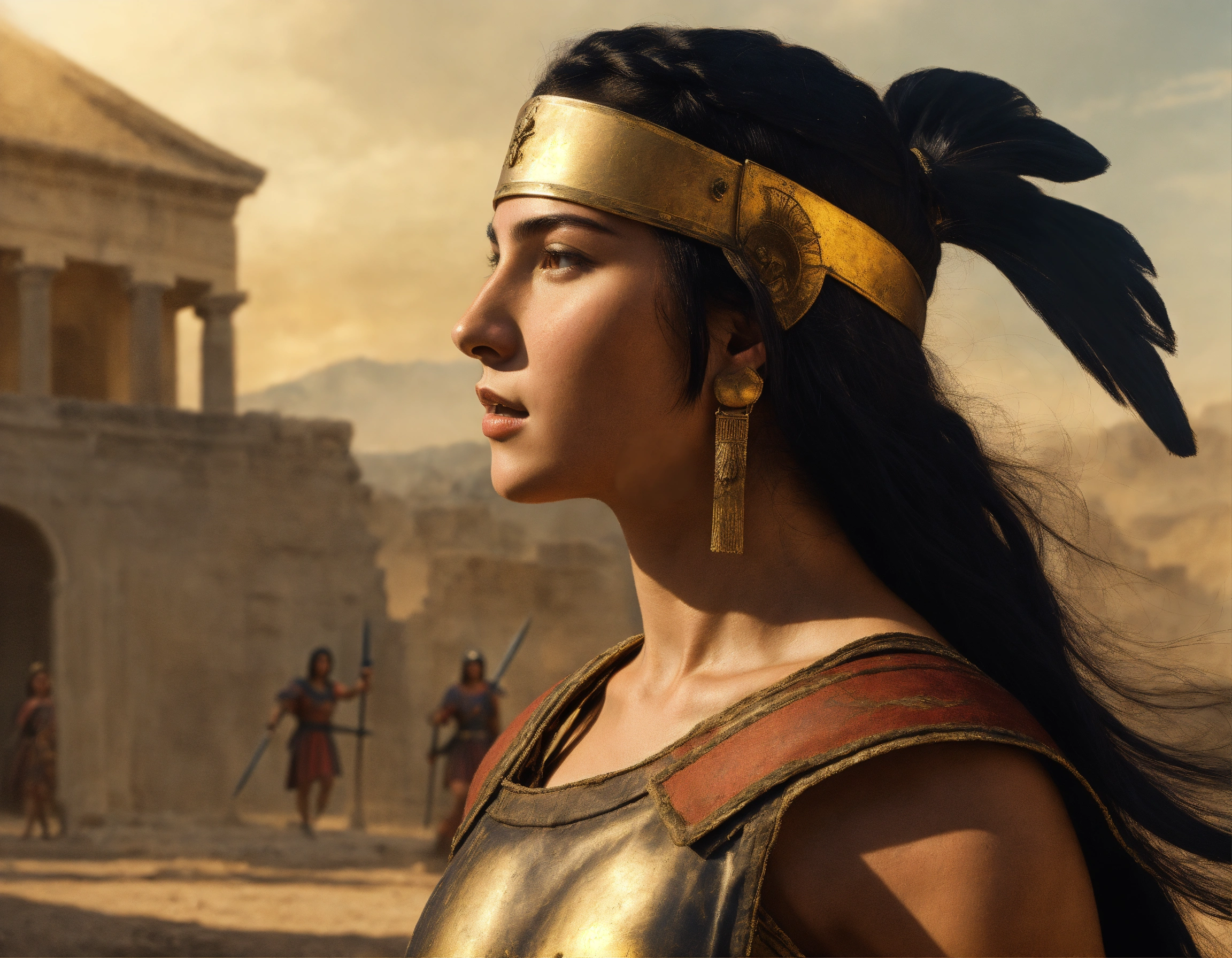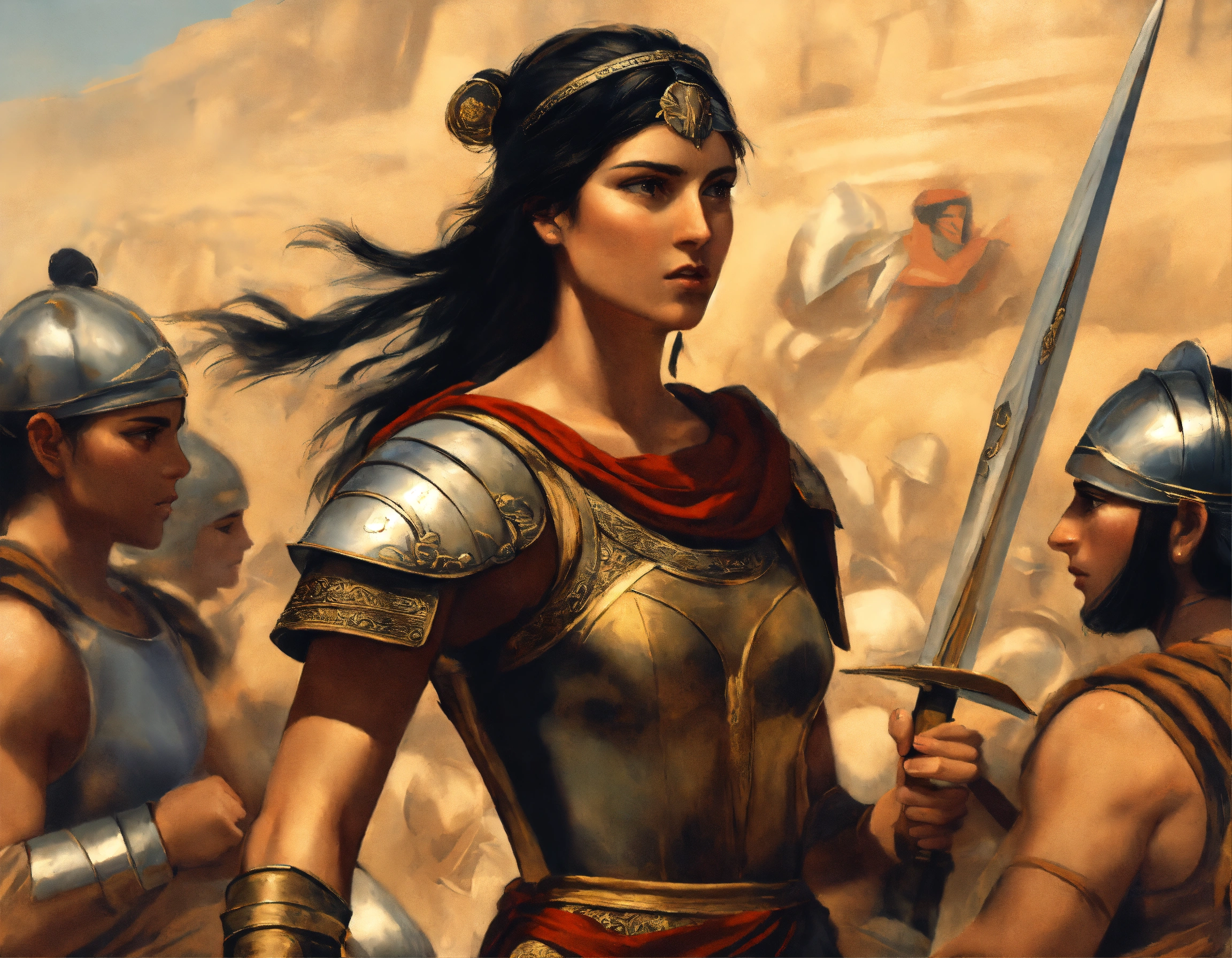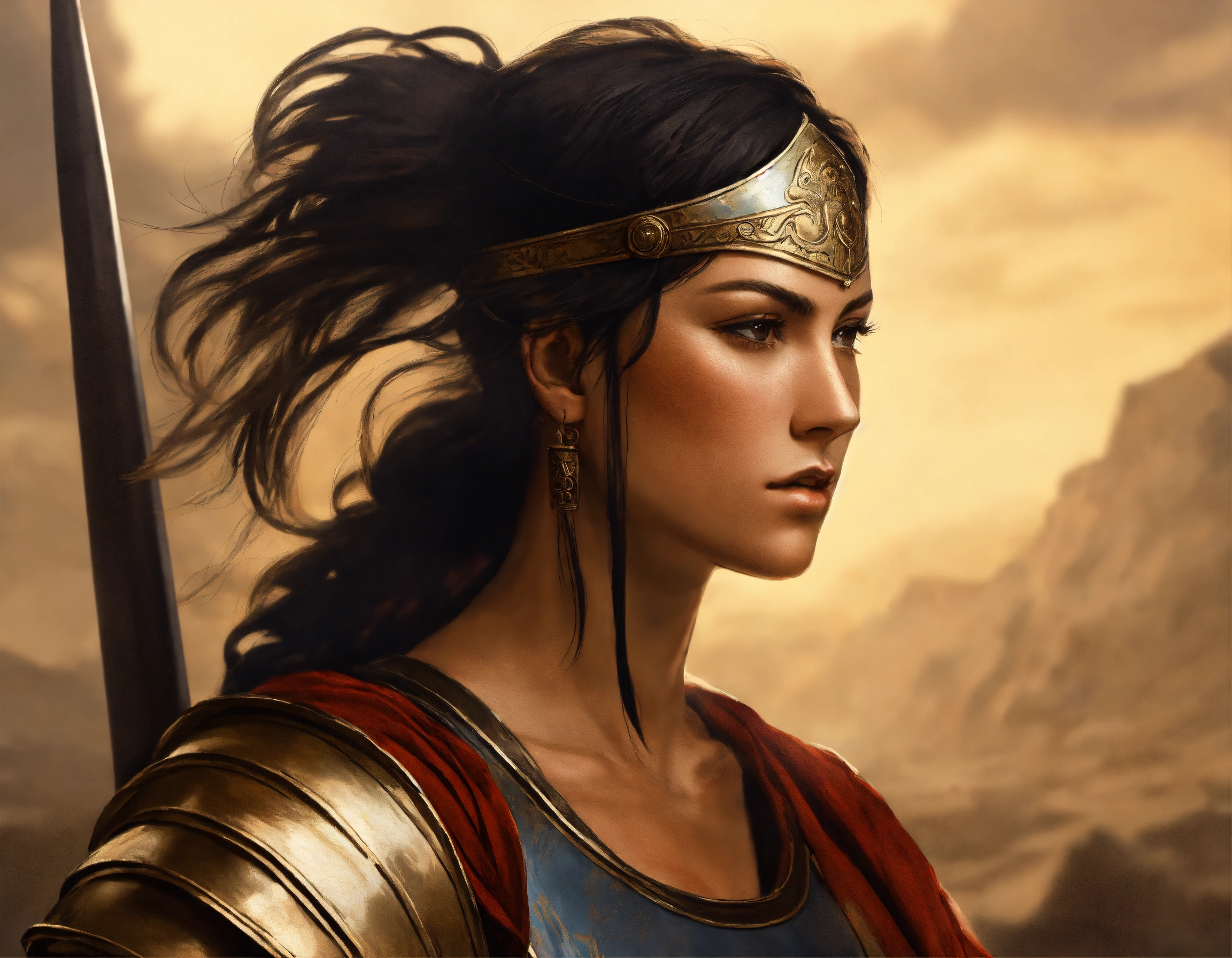 Ancient greek warrior woman in battle with tan skin and black straight hair and her head turned to the left, depicted in the style of a renaissance painting