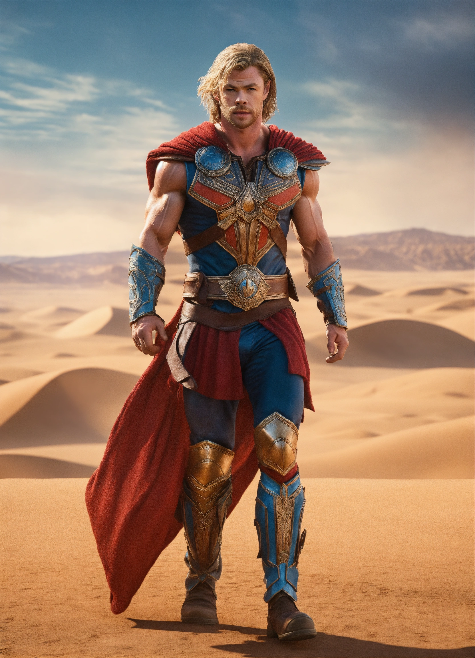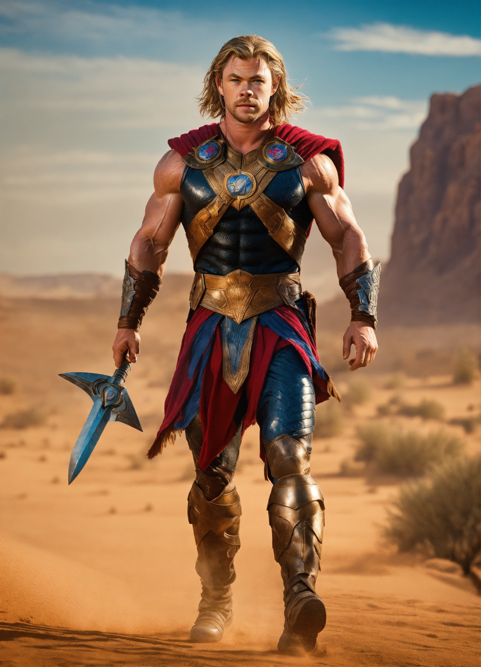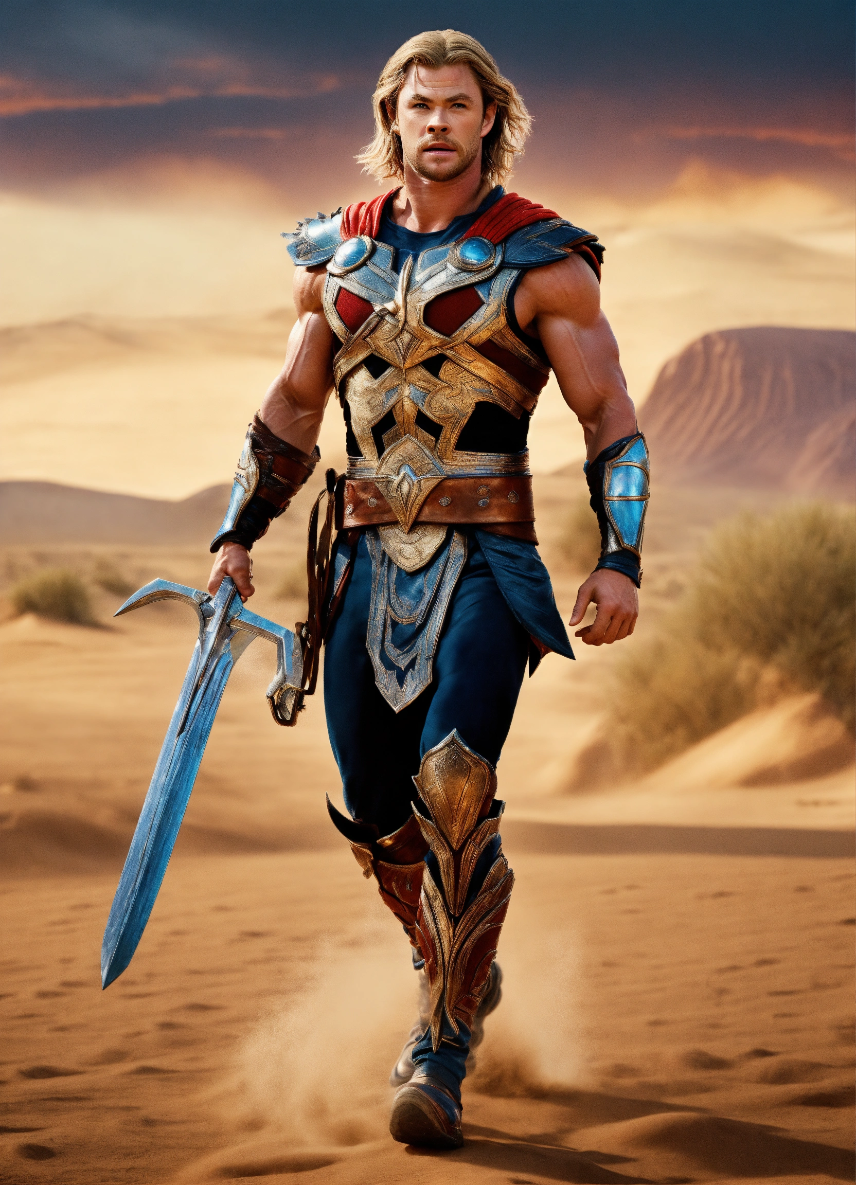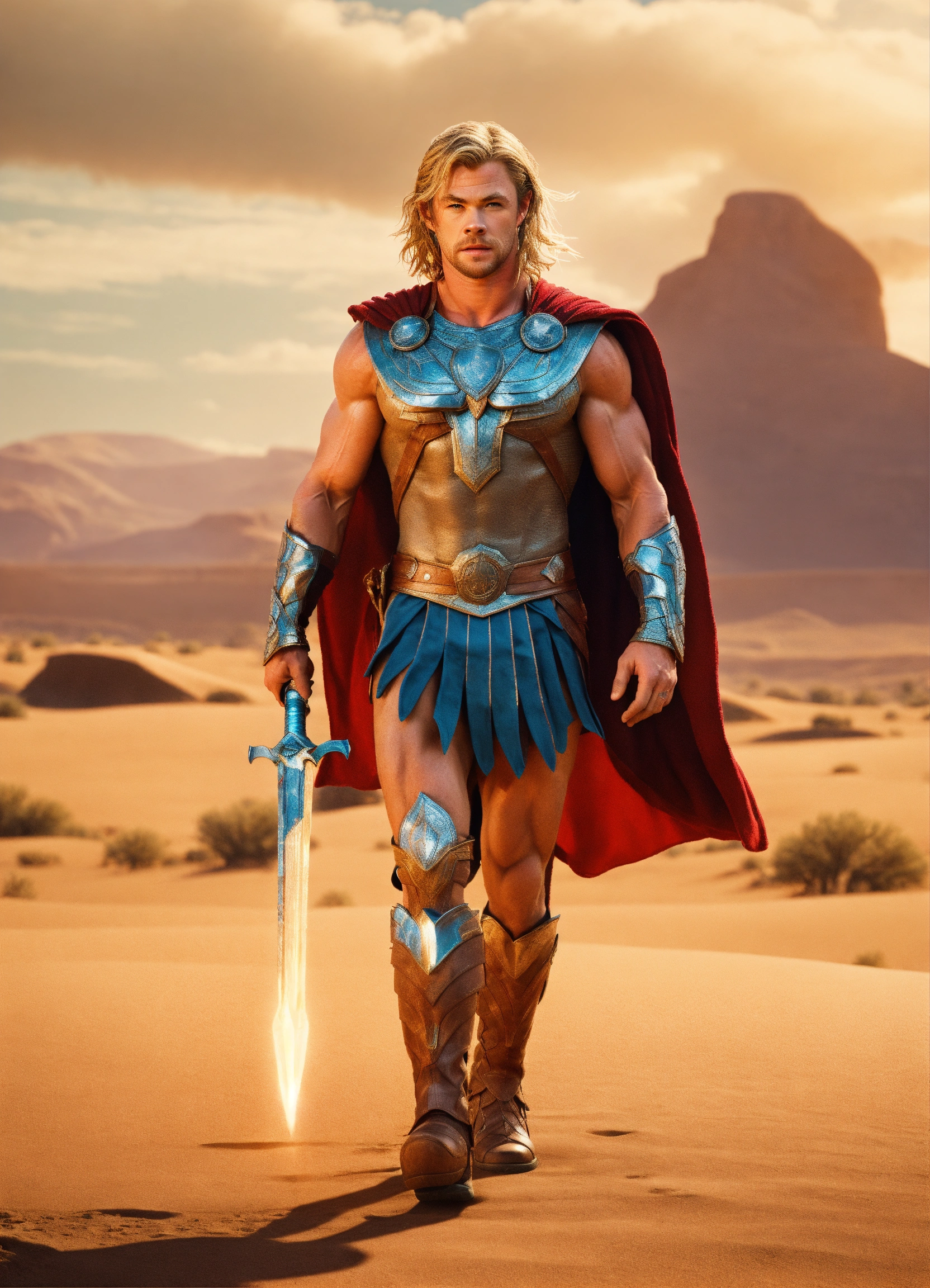 Chris hemsworth with bobbed blonde hair, dressed like he-man of masters of the universe, full body, walking in a desert, 8k resolution, photorealistic, hard light photo, hyper detailed, intricately detailed