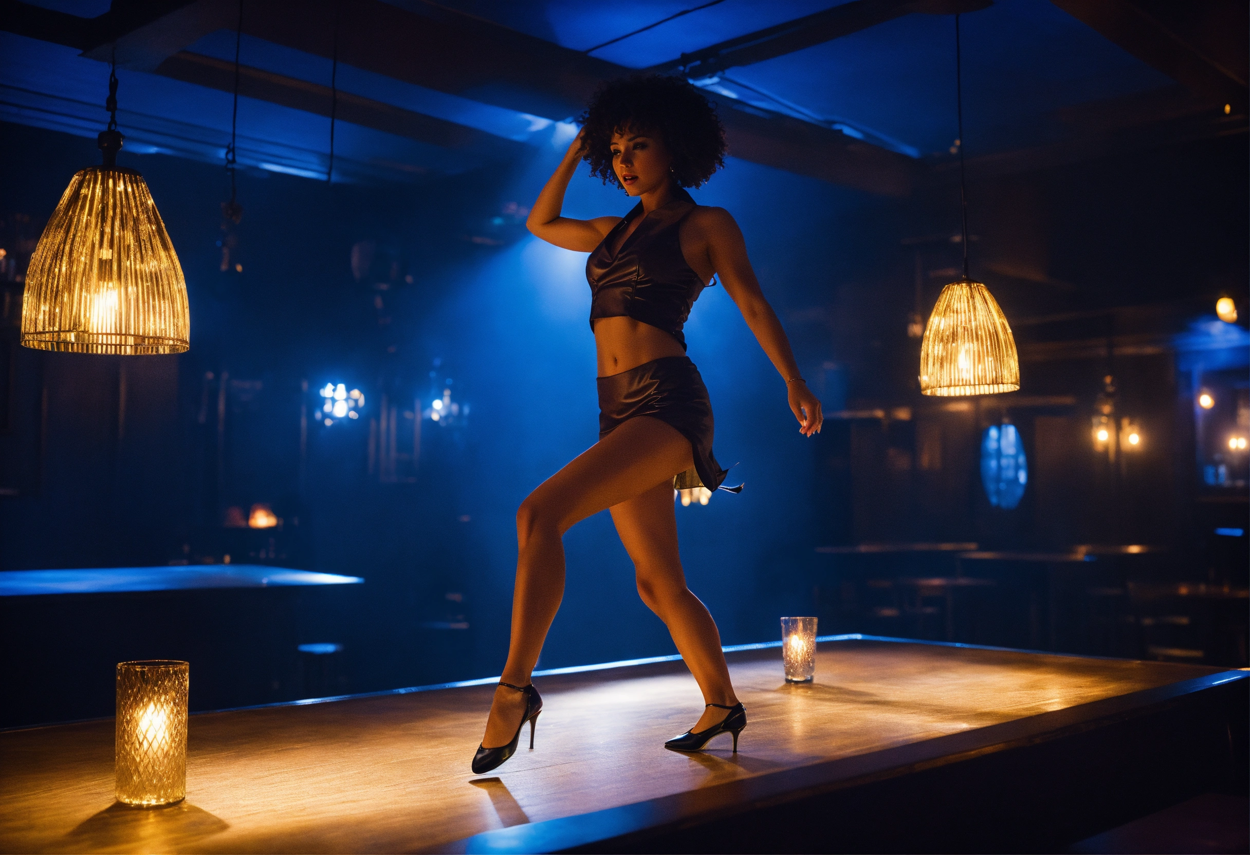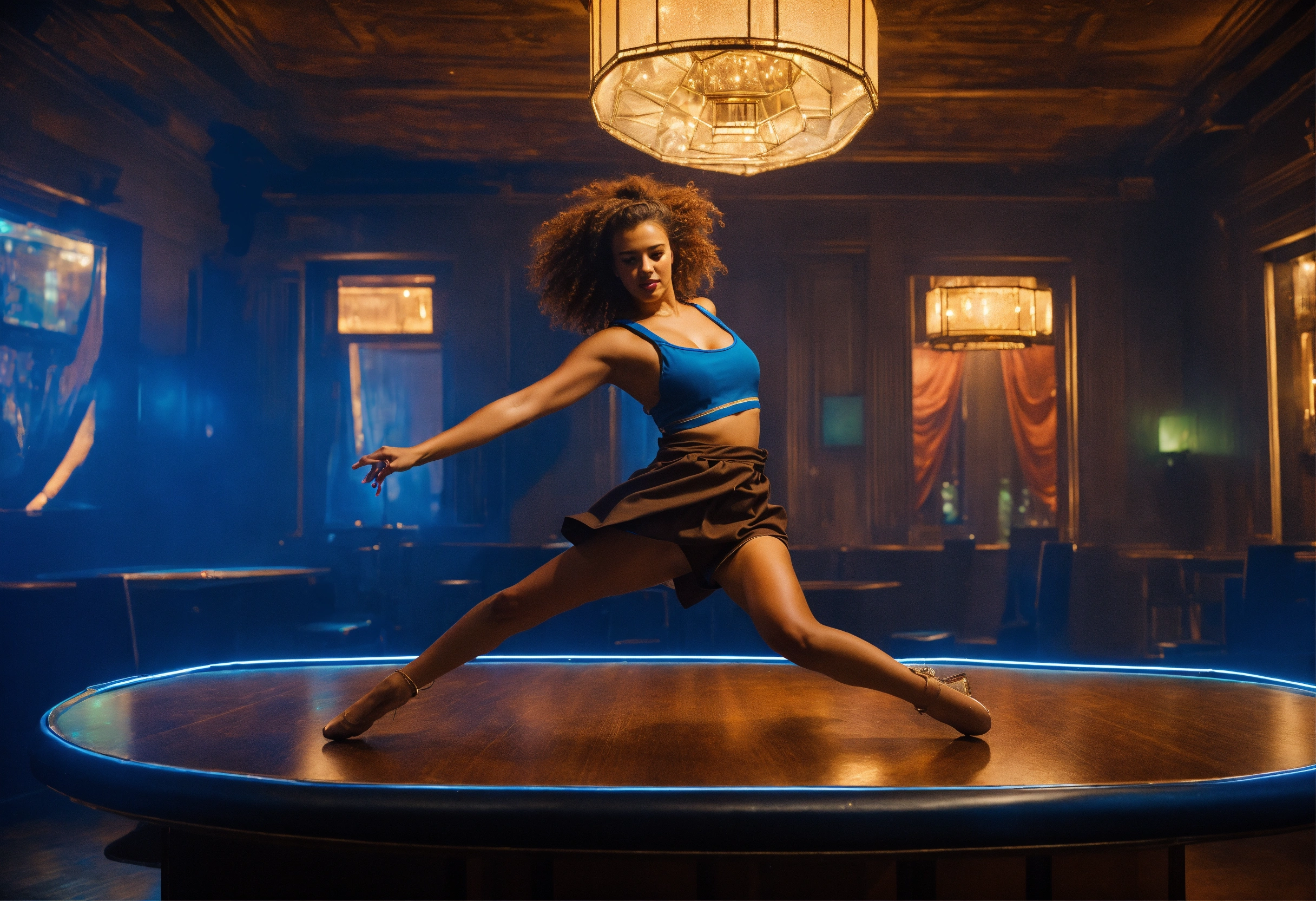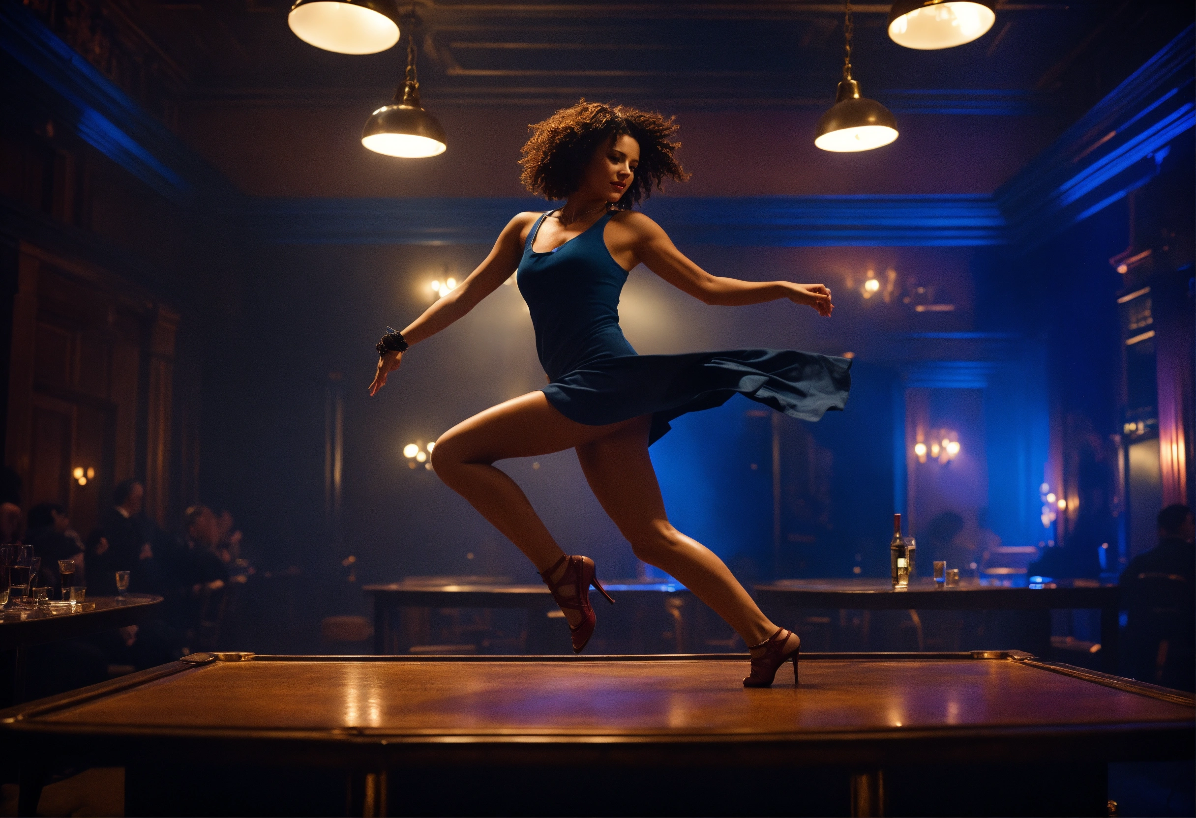 Glasgow club interior, female character, dancing on table, dark, brown and blue, artificial lighting by patrick demarcheller