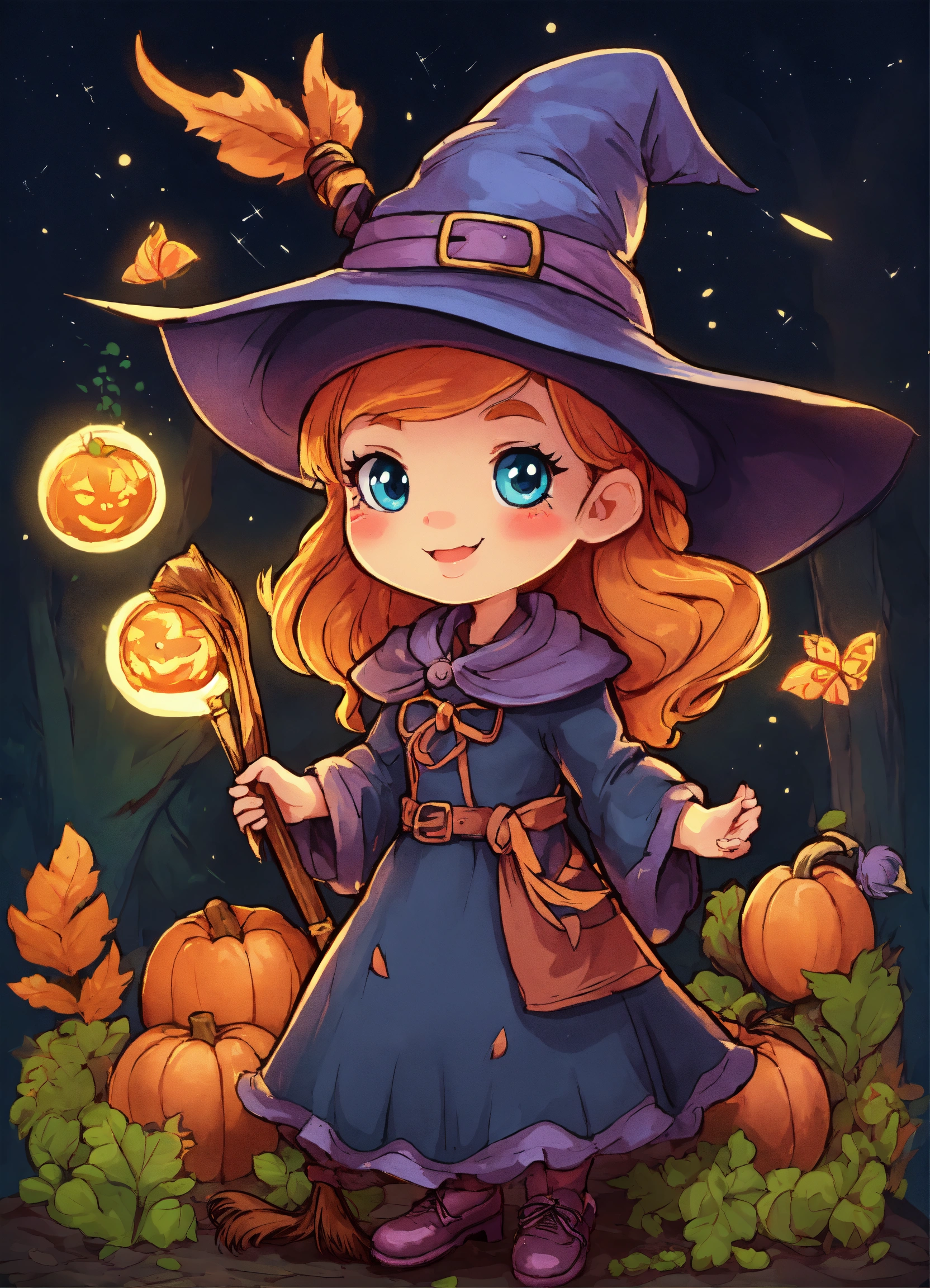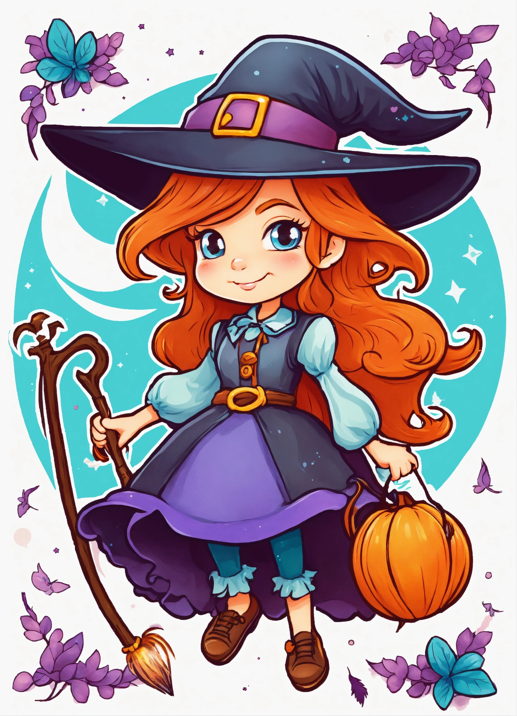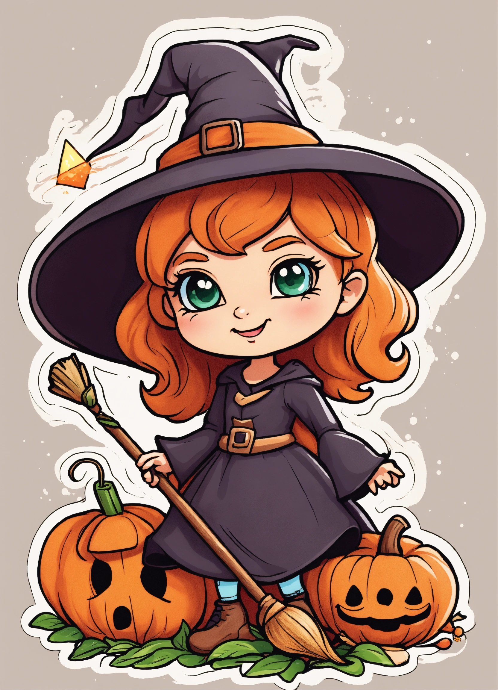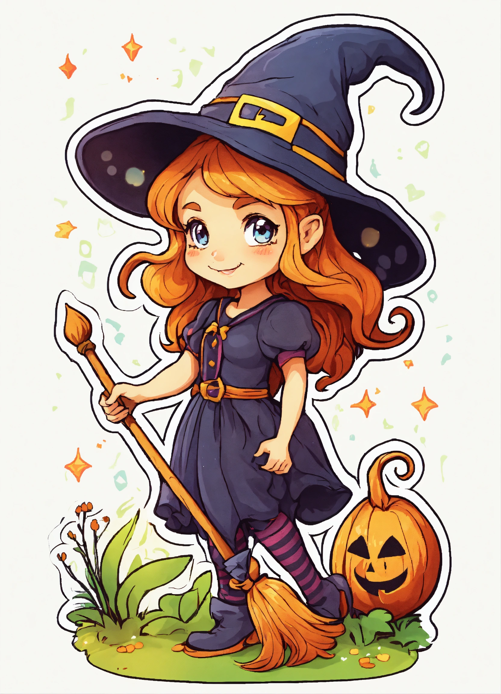 Generate a cute witch illustration, 4k resolution, cartoon-sticker style with clear lines on a pure white background suitable for a children's coloring book.