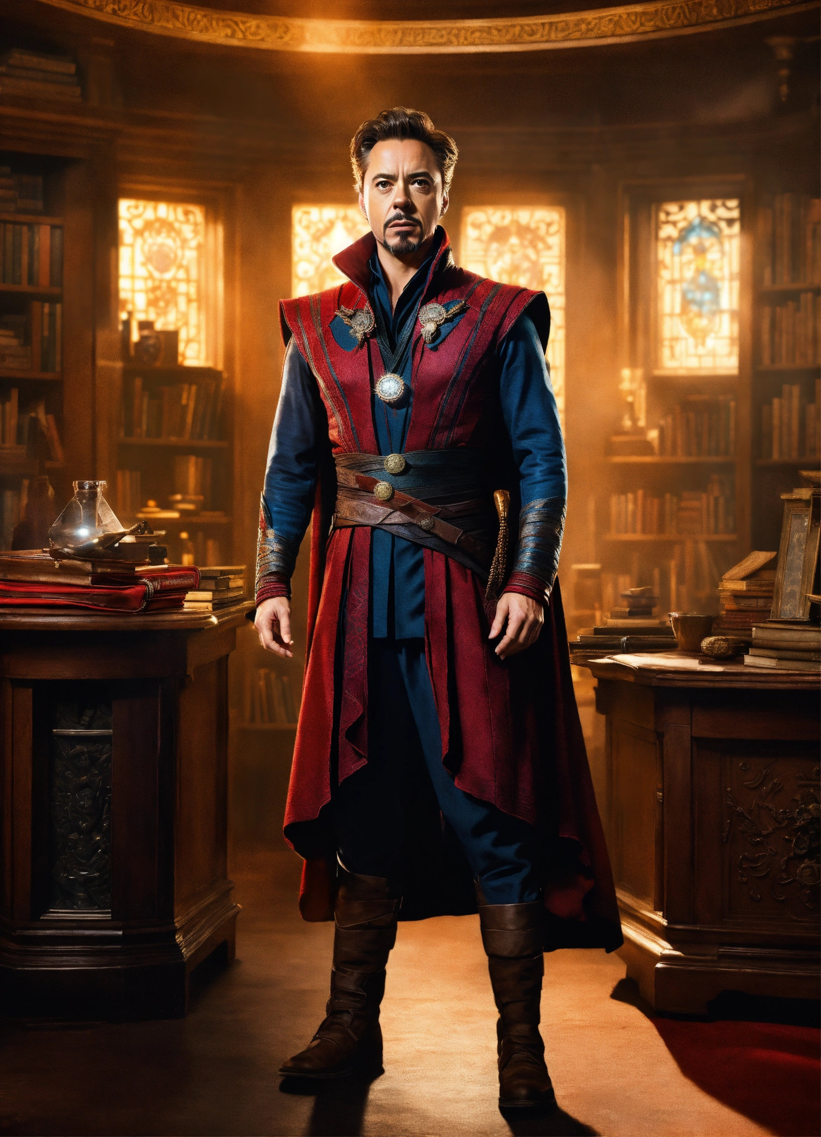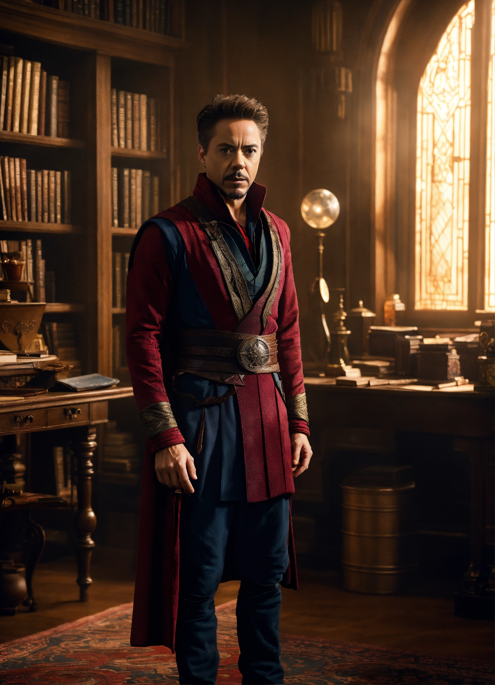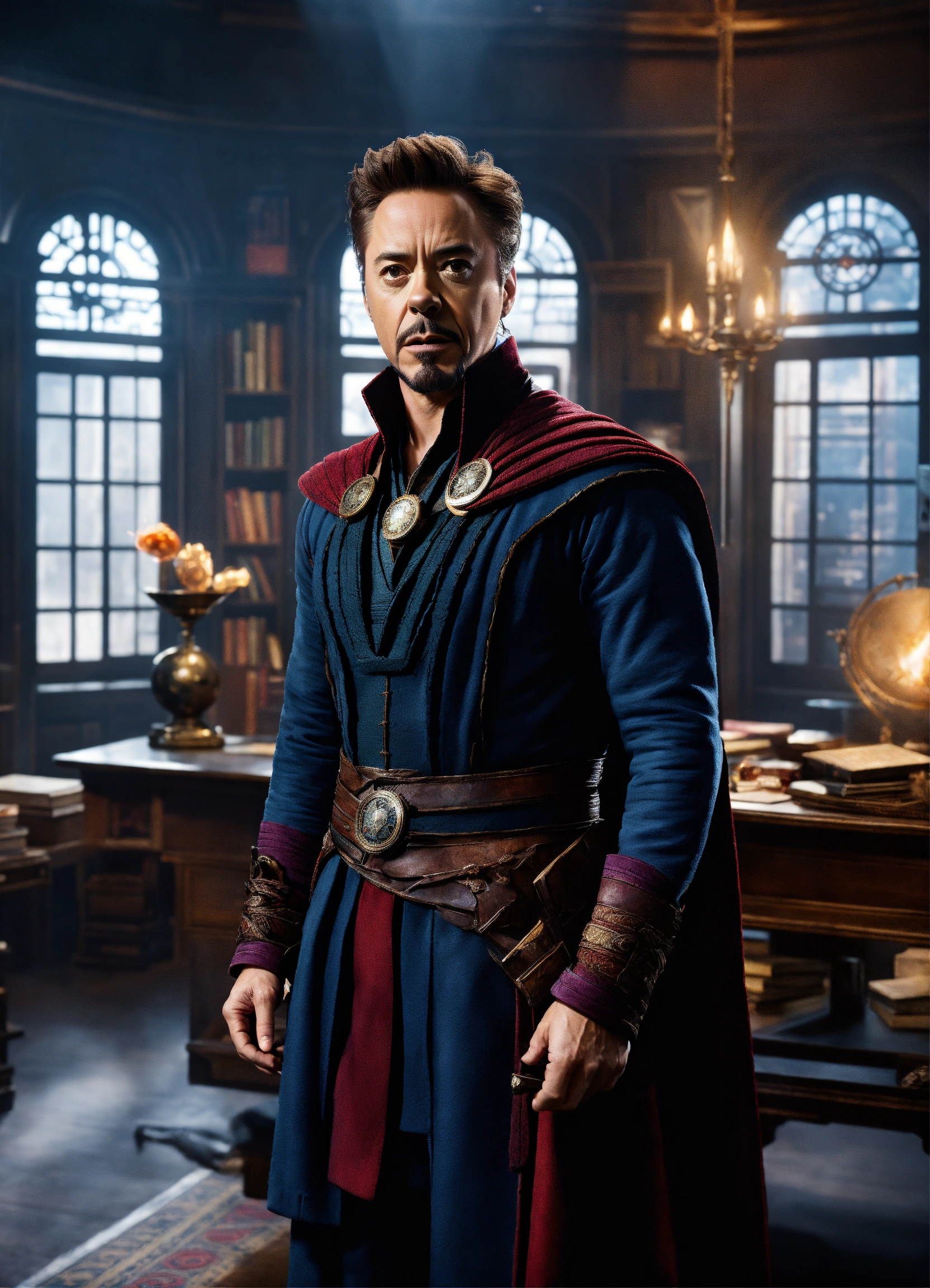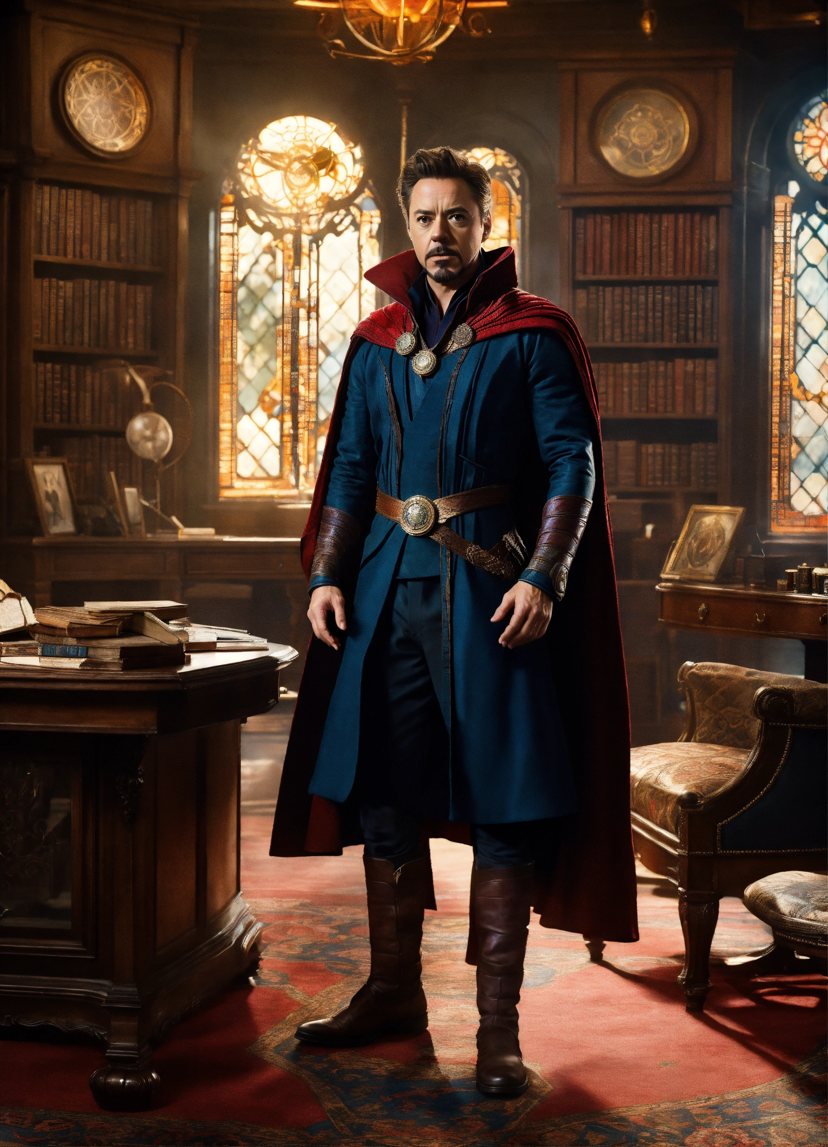 Robert downey jr, short hair, goatee, dressed like doctor strange of marvel studios, standing in a magician's study, 8k resolution, photorealism, higly detailed, epic shot