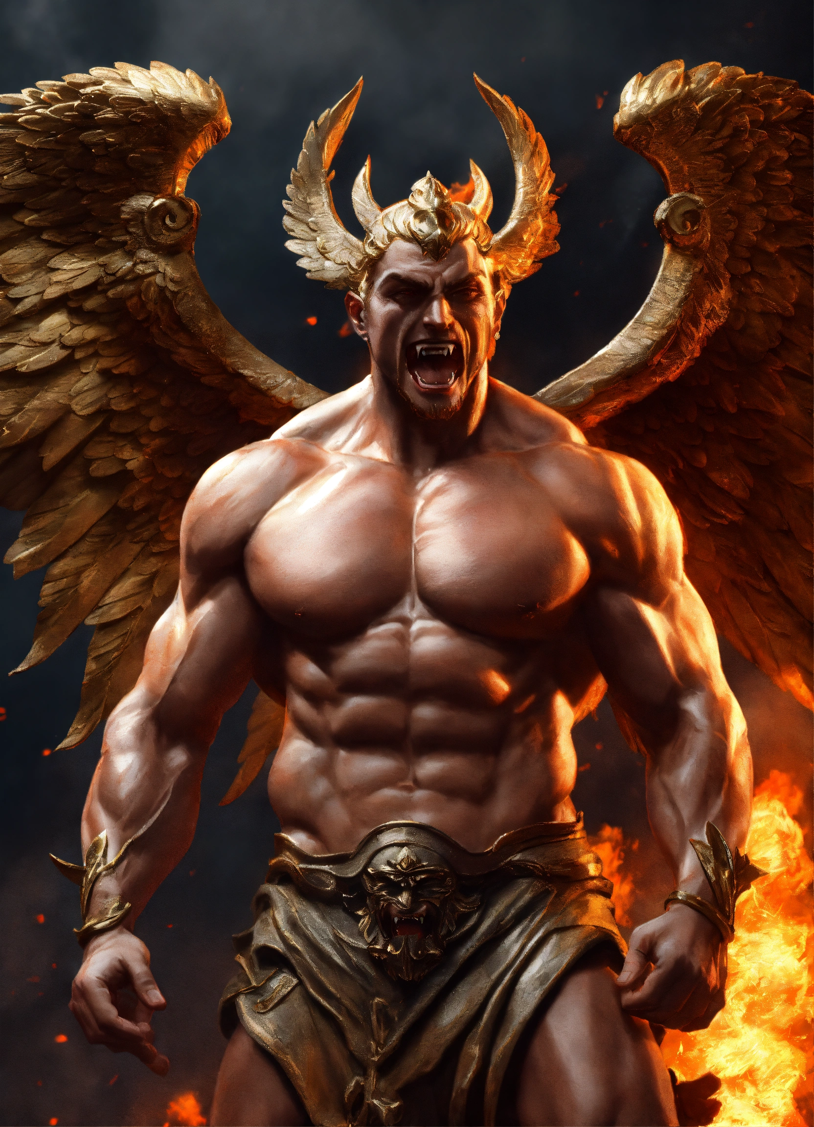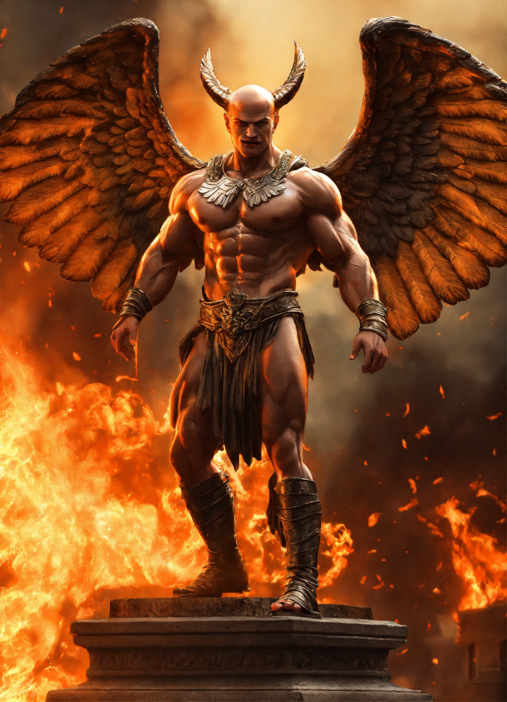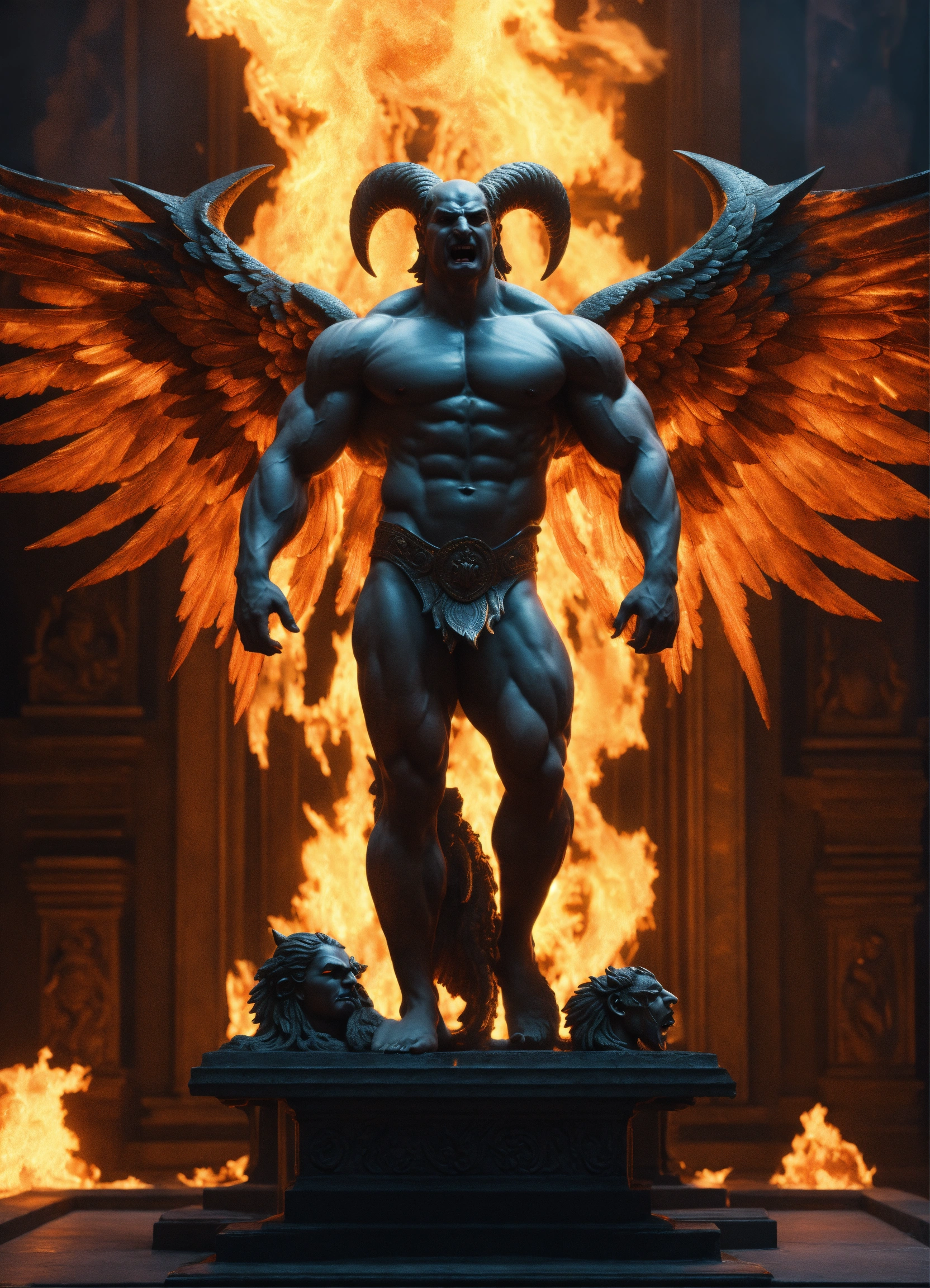 Yevgeny prigozhin as greek statue of demon with fangs and wings and very muscular body in profile, photorealistic, fire all around, ray tracing