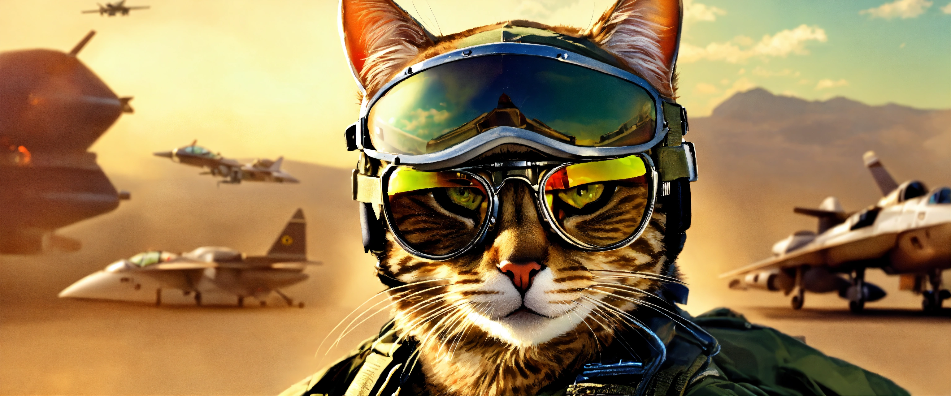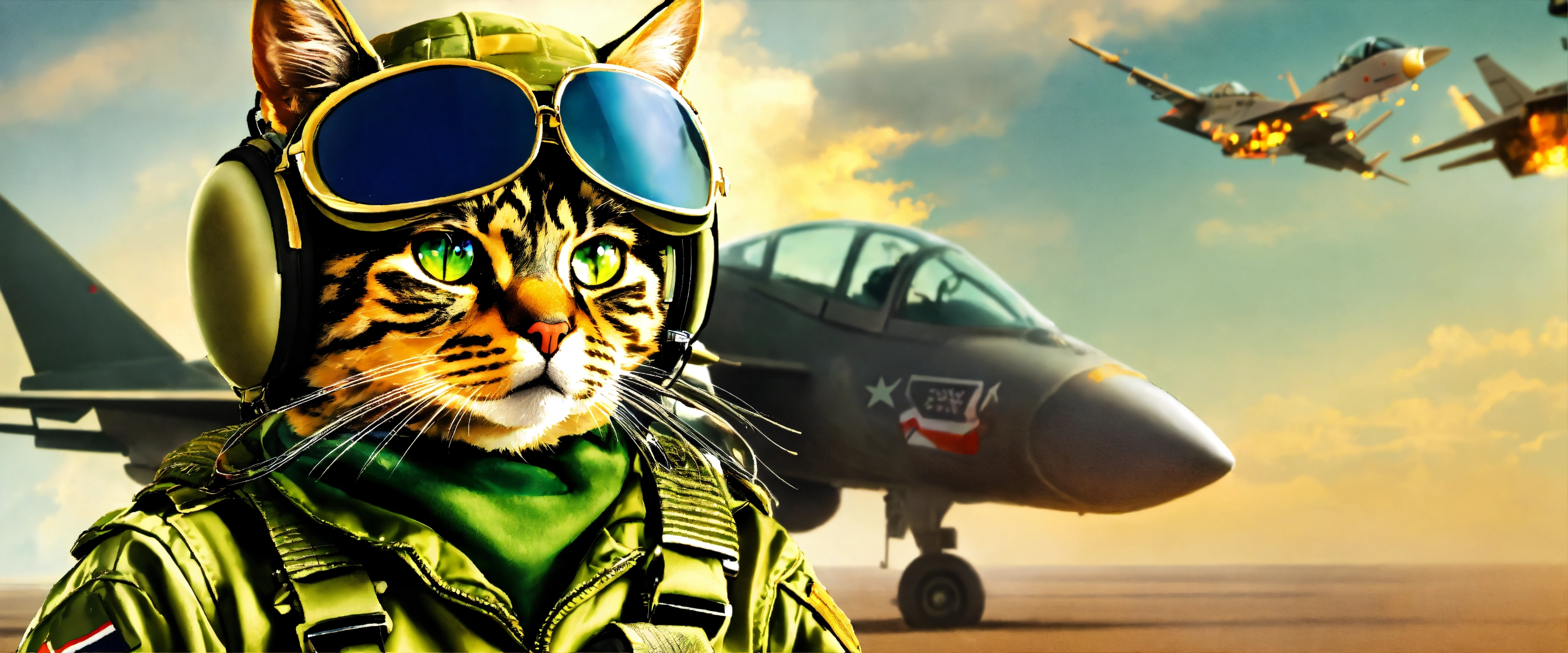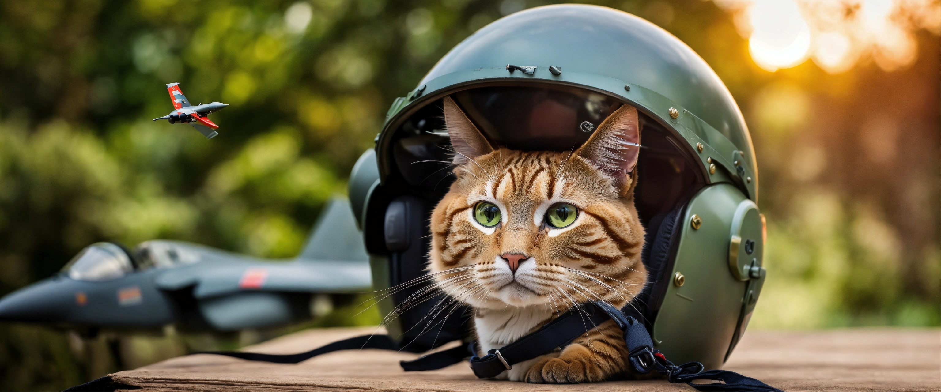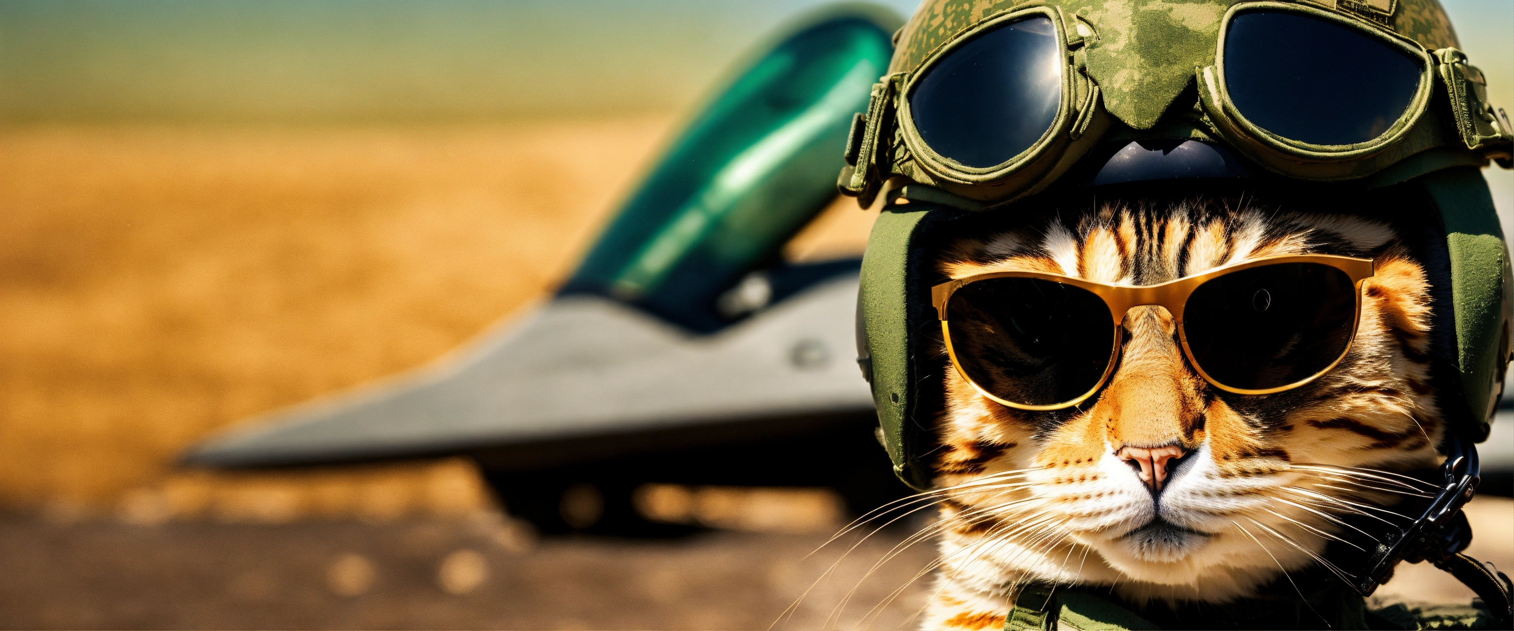 A cute cat wearing sun glass and military airforce helmet and a fighter jet