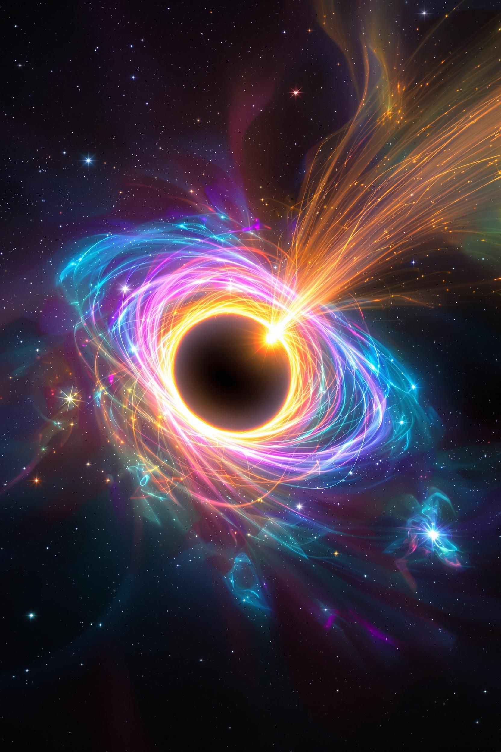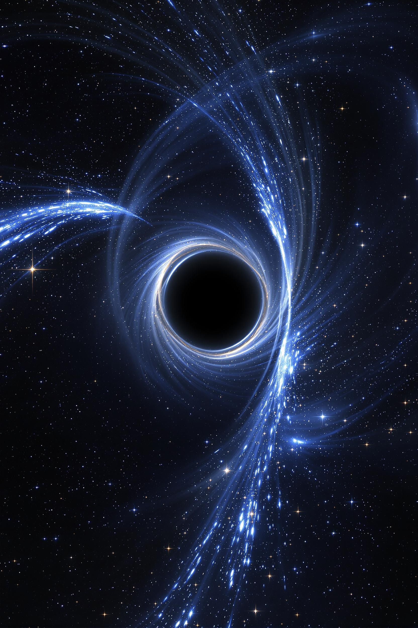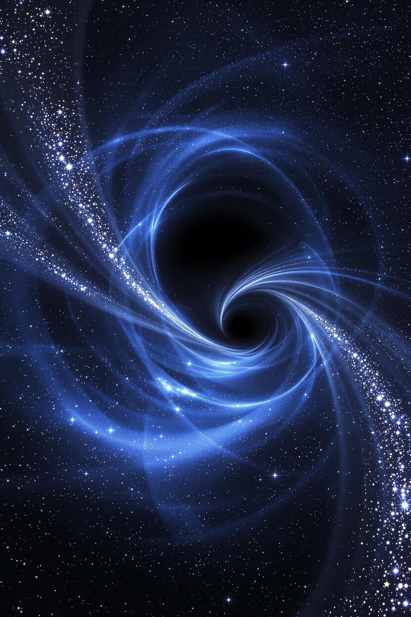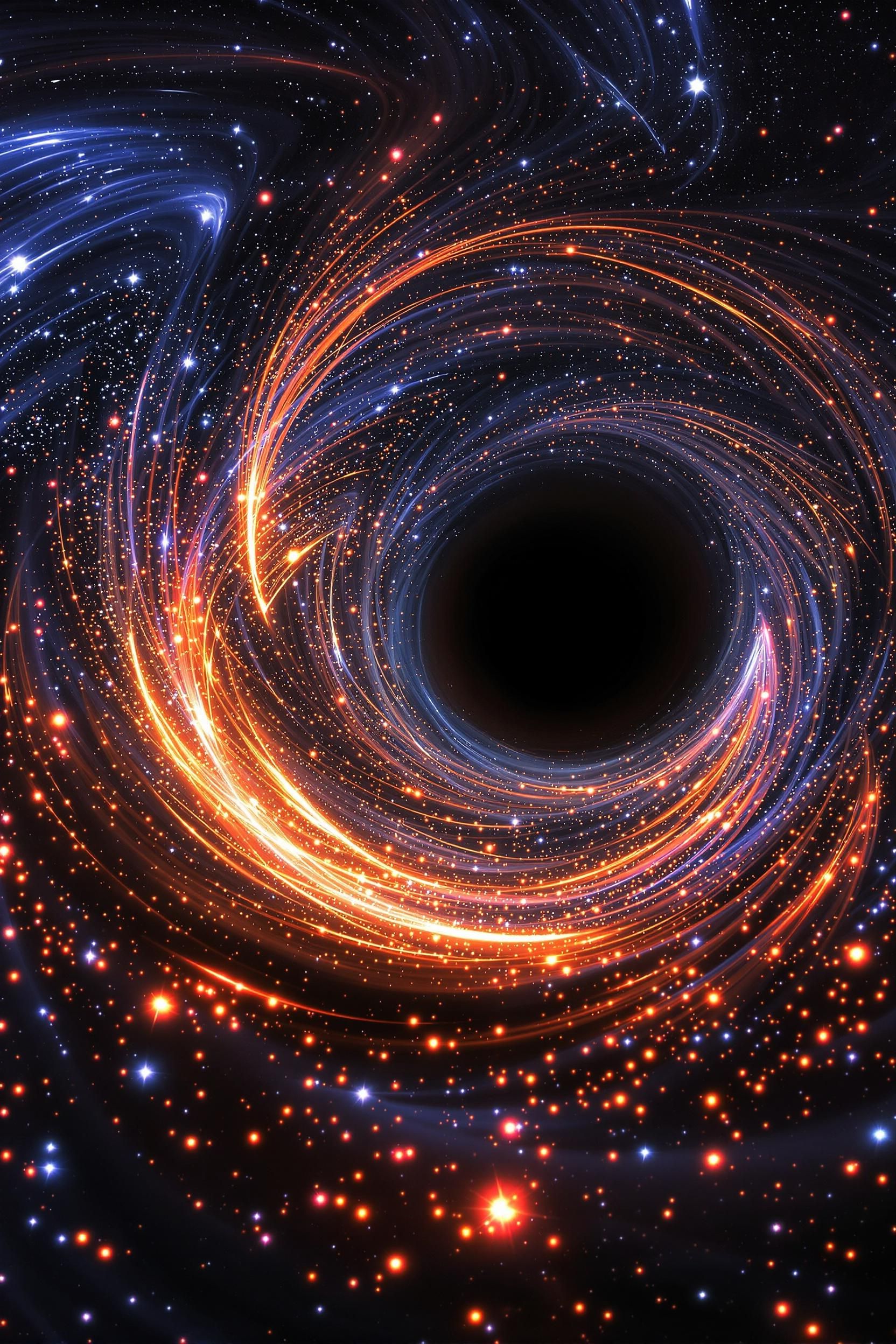 A black hole in space surrounded by bright stars being sucked in and stretched to infinity