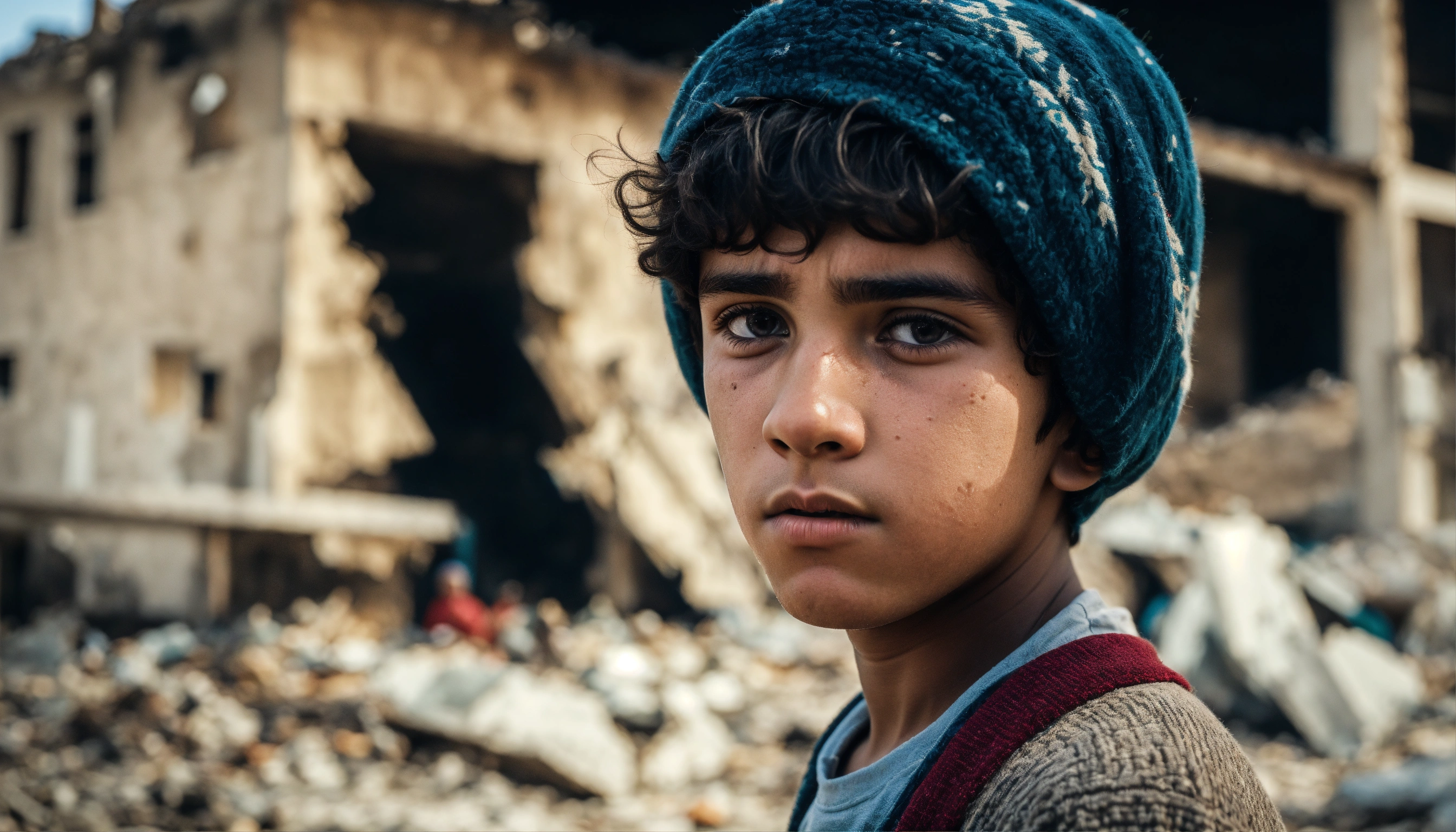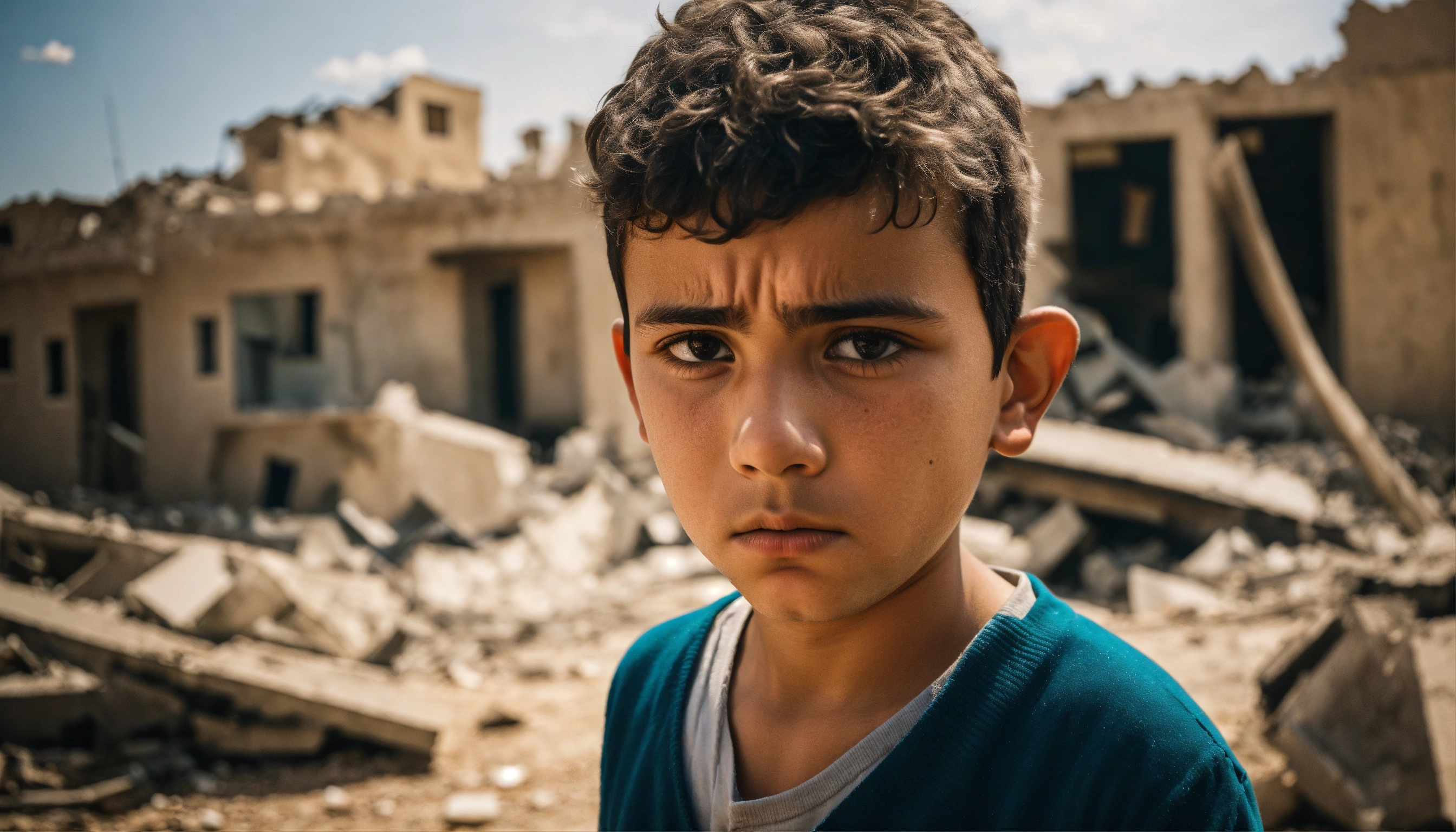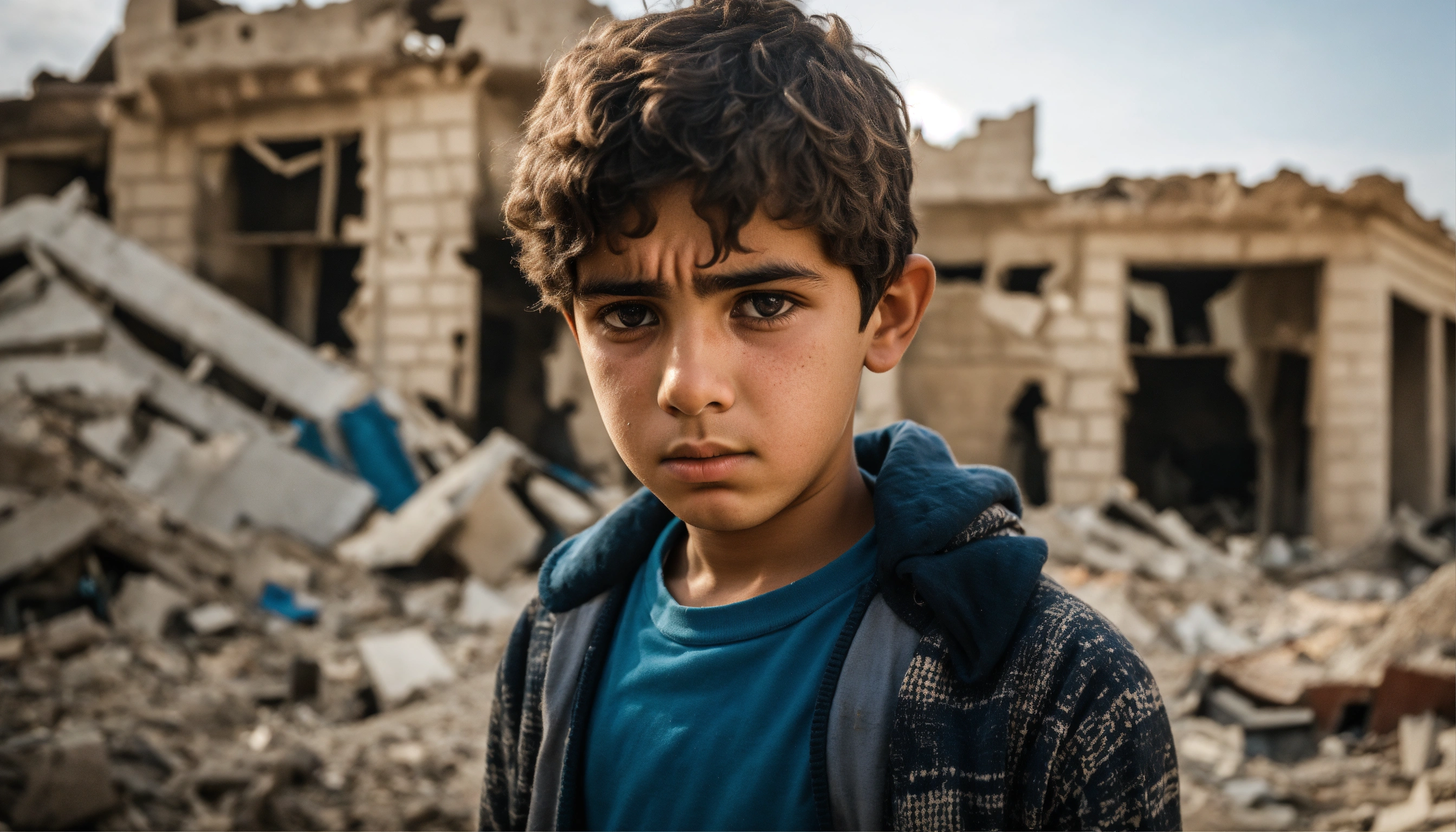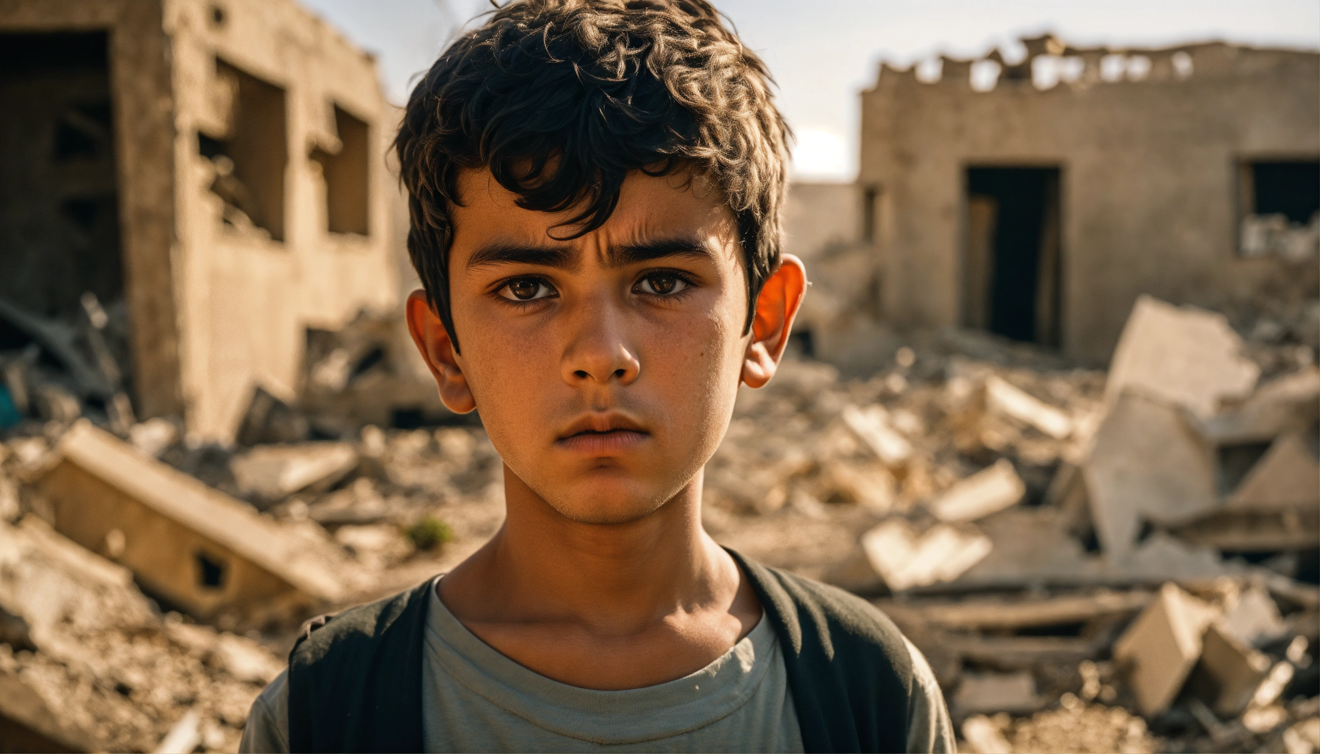 Close portrait of sad palestine boy in front of a destroyed house, selective focus on the boy, high quality photo