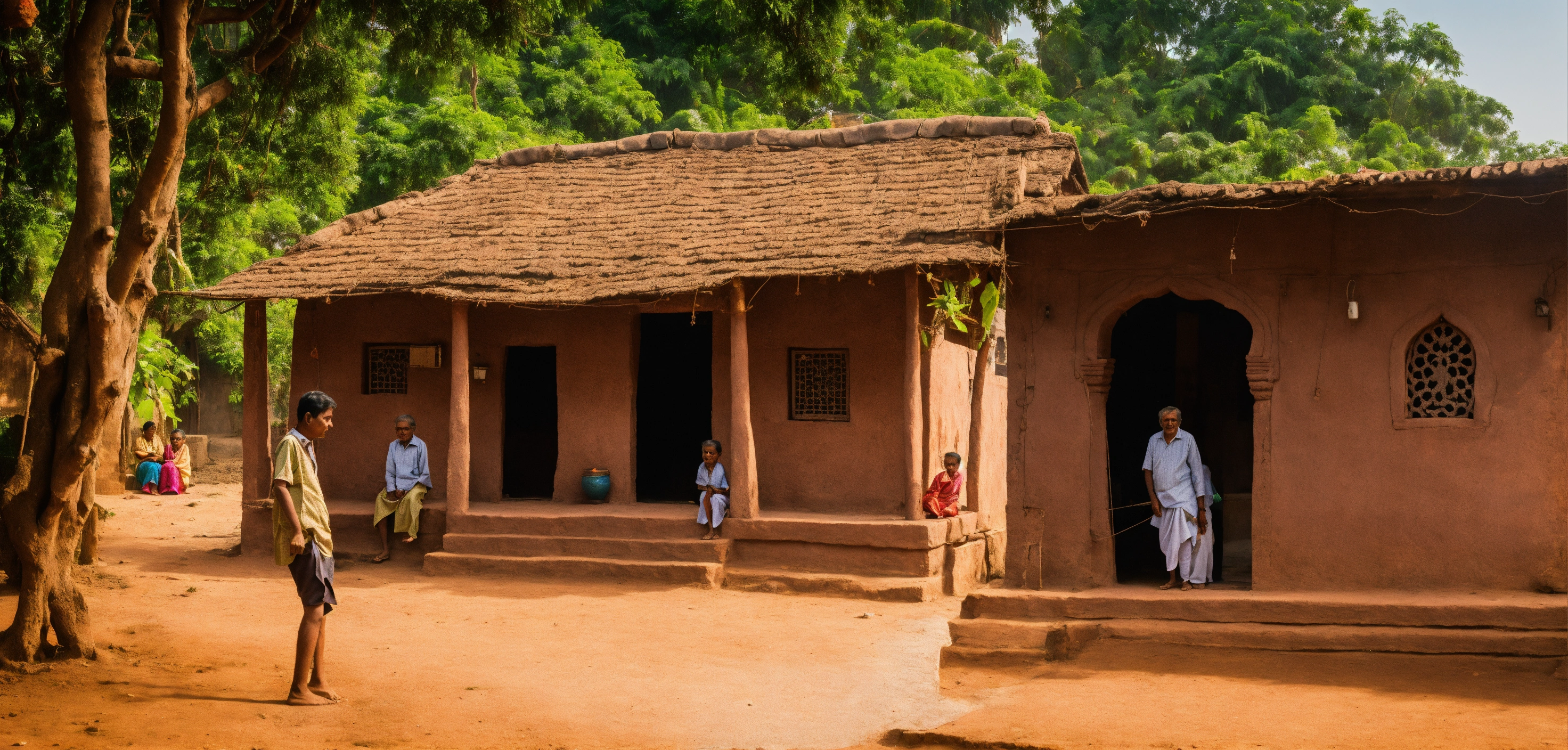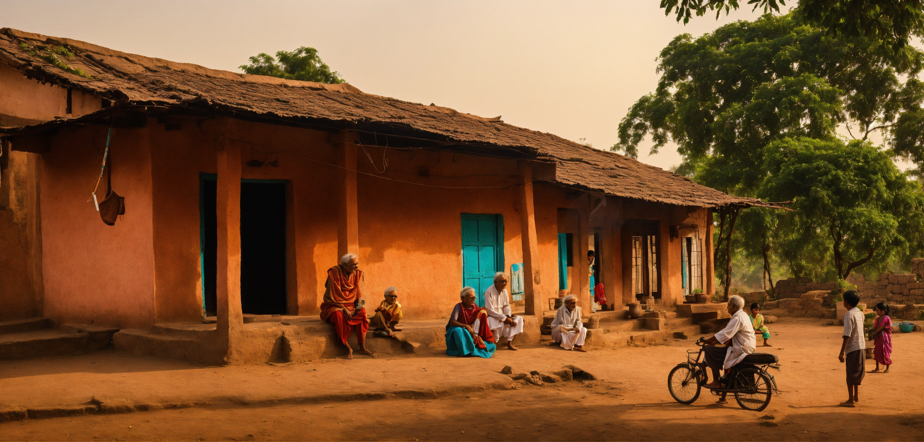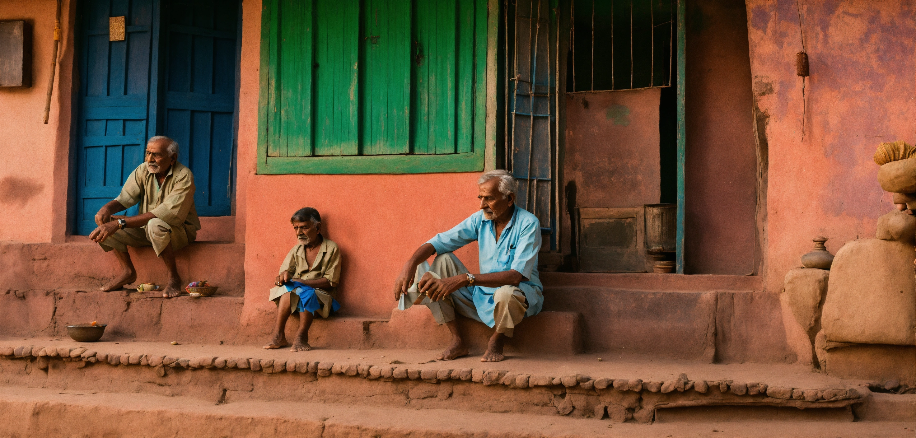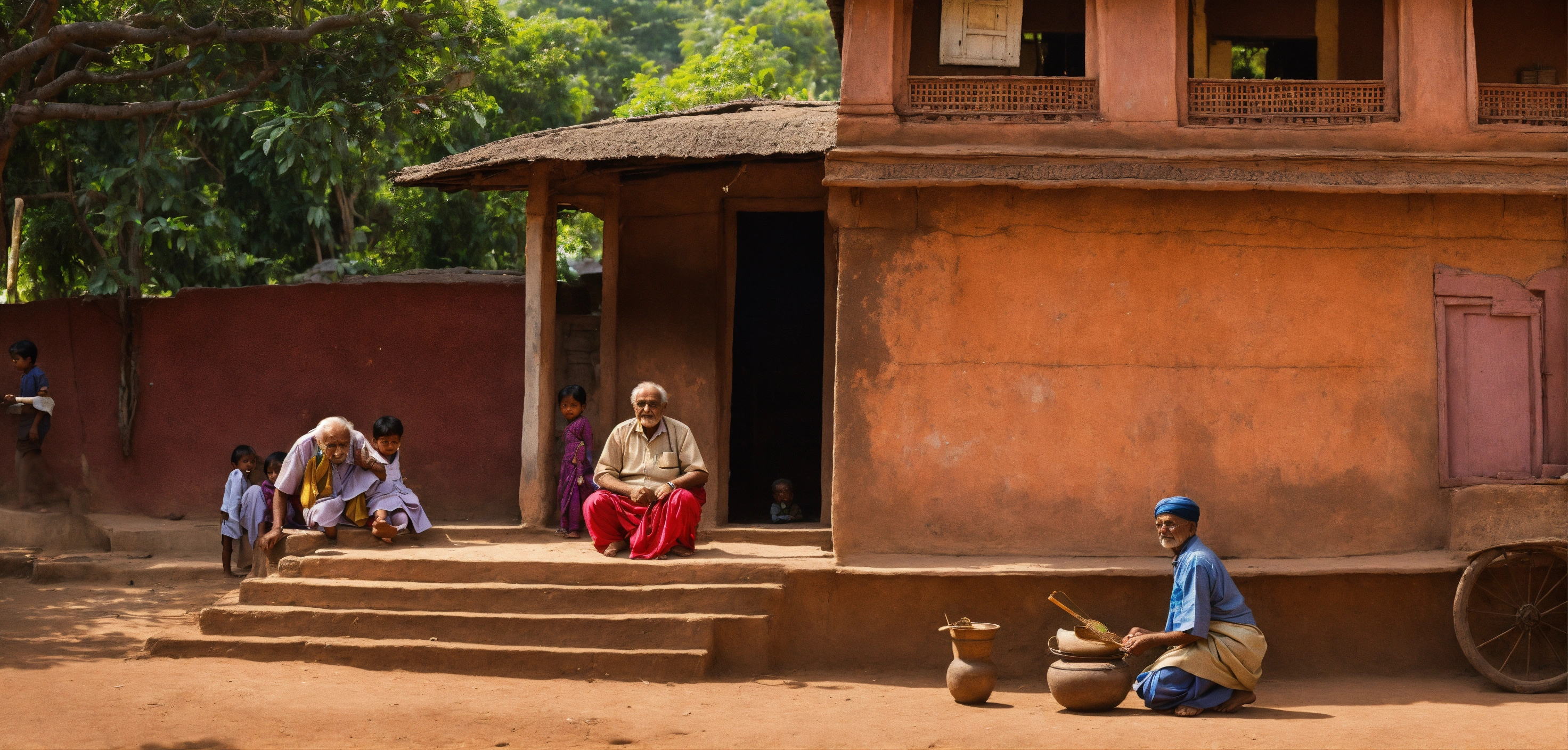 Kids playing on the left side image and an elderly blind man sitting in front of a traditional indian house in maharashtra