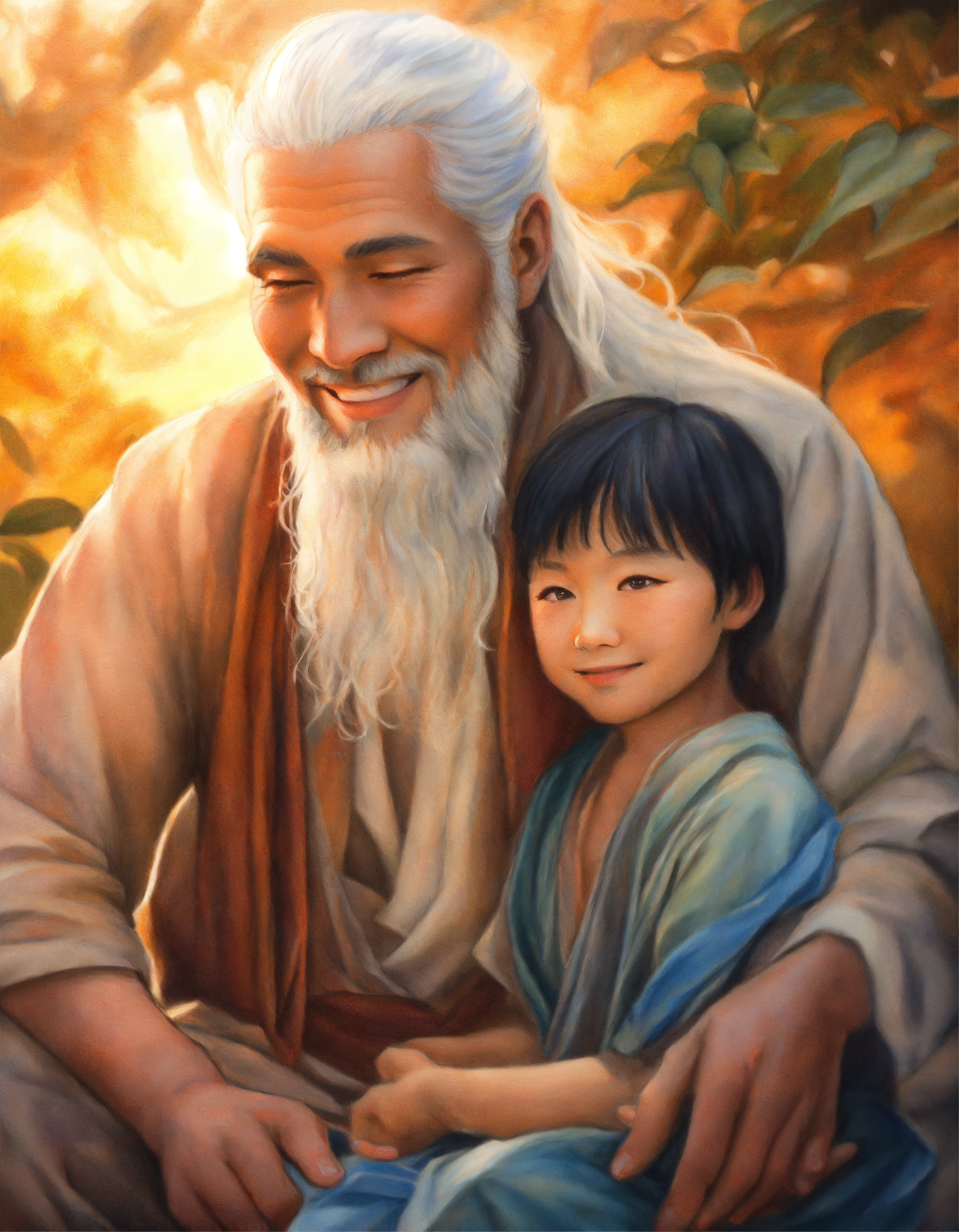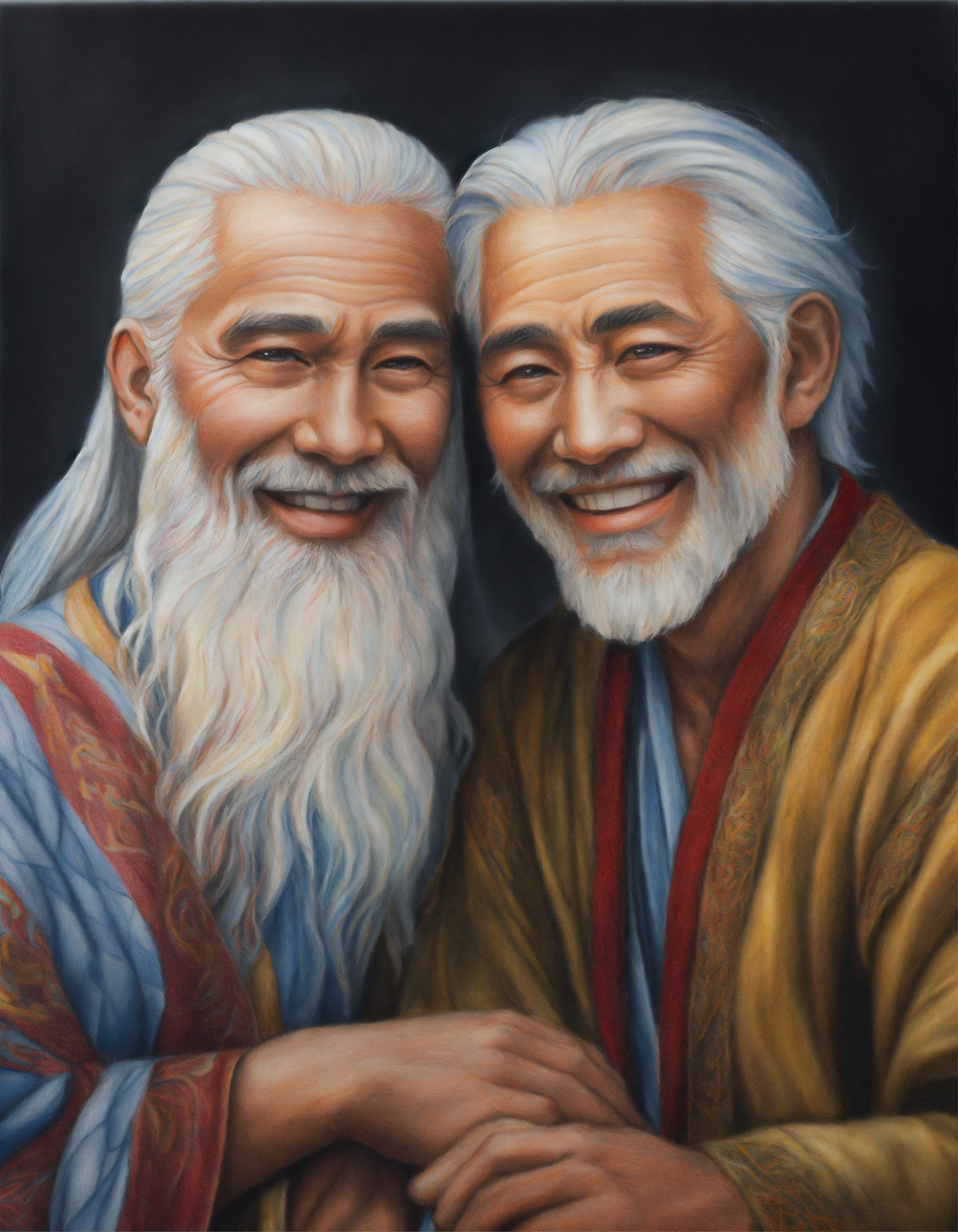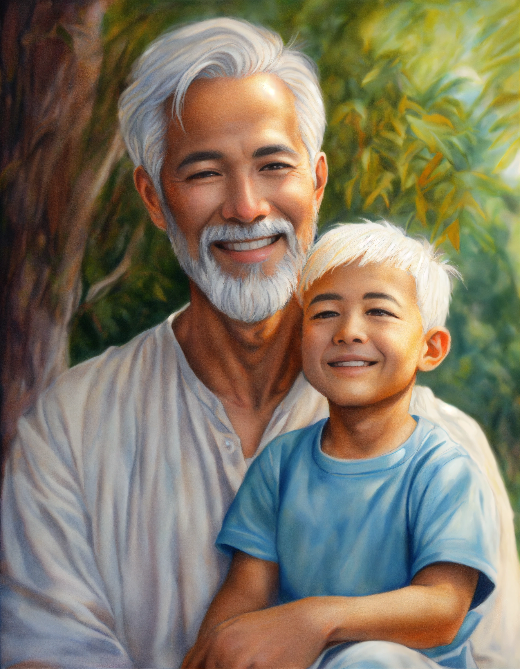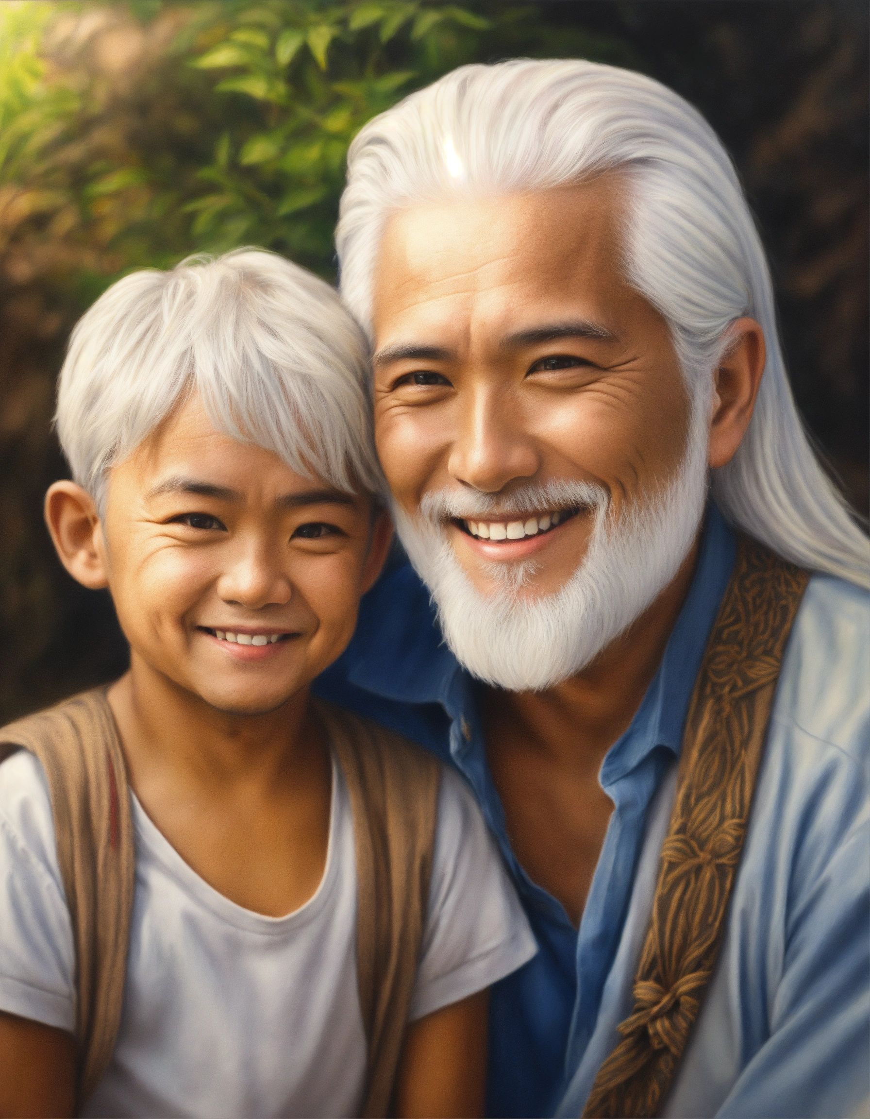 Realistic colored pencil drawing of two spiritual mentors a caucasian man with white hair, and a small asian child soul, next with a beautiful smile. 4k. fantastic art.