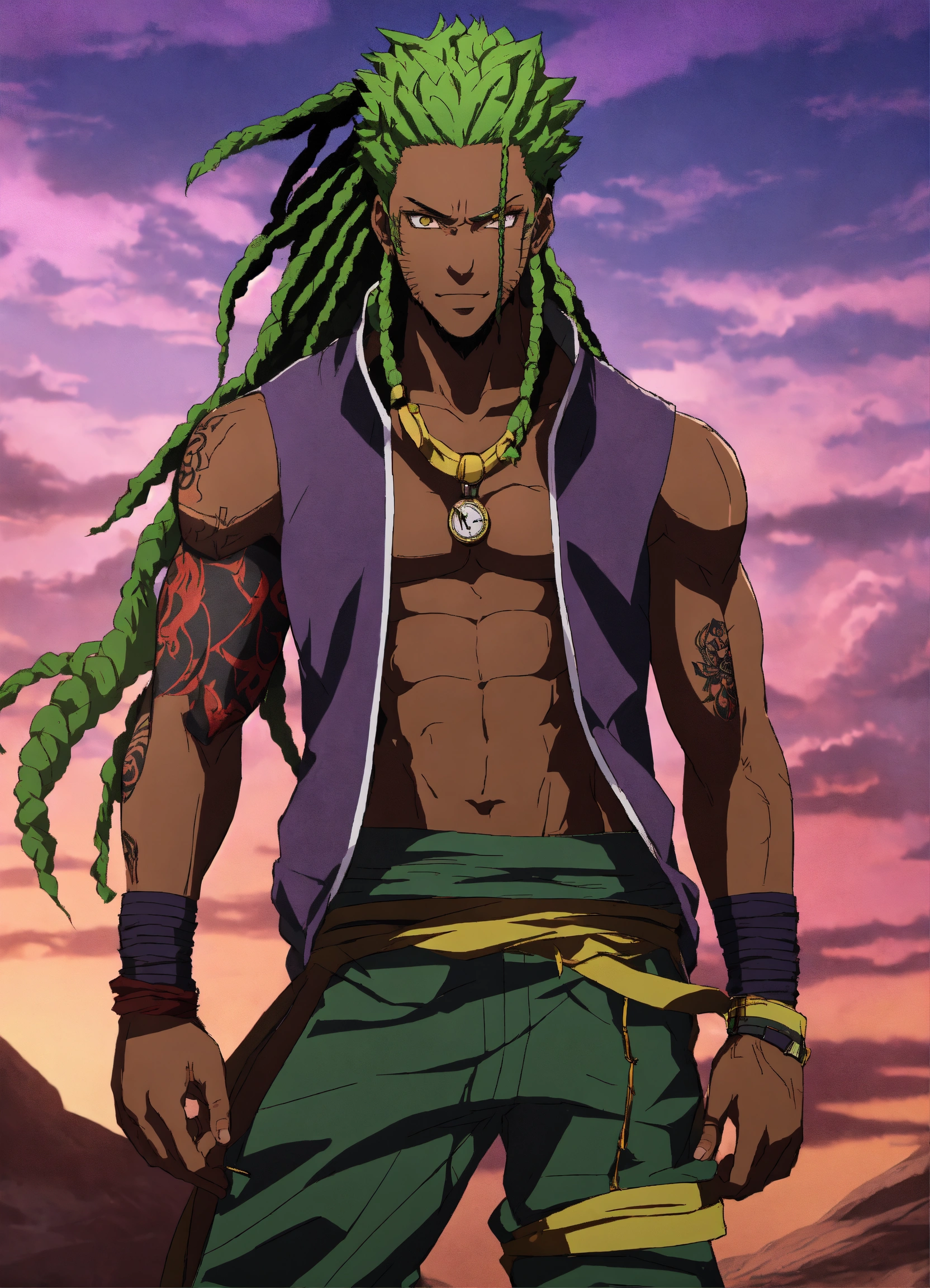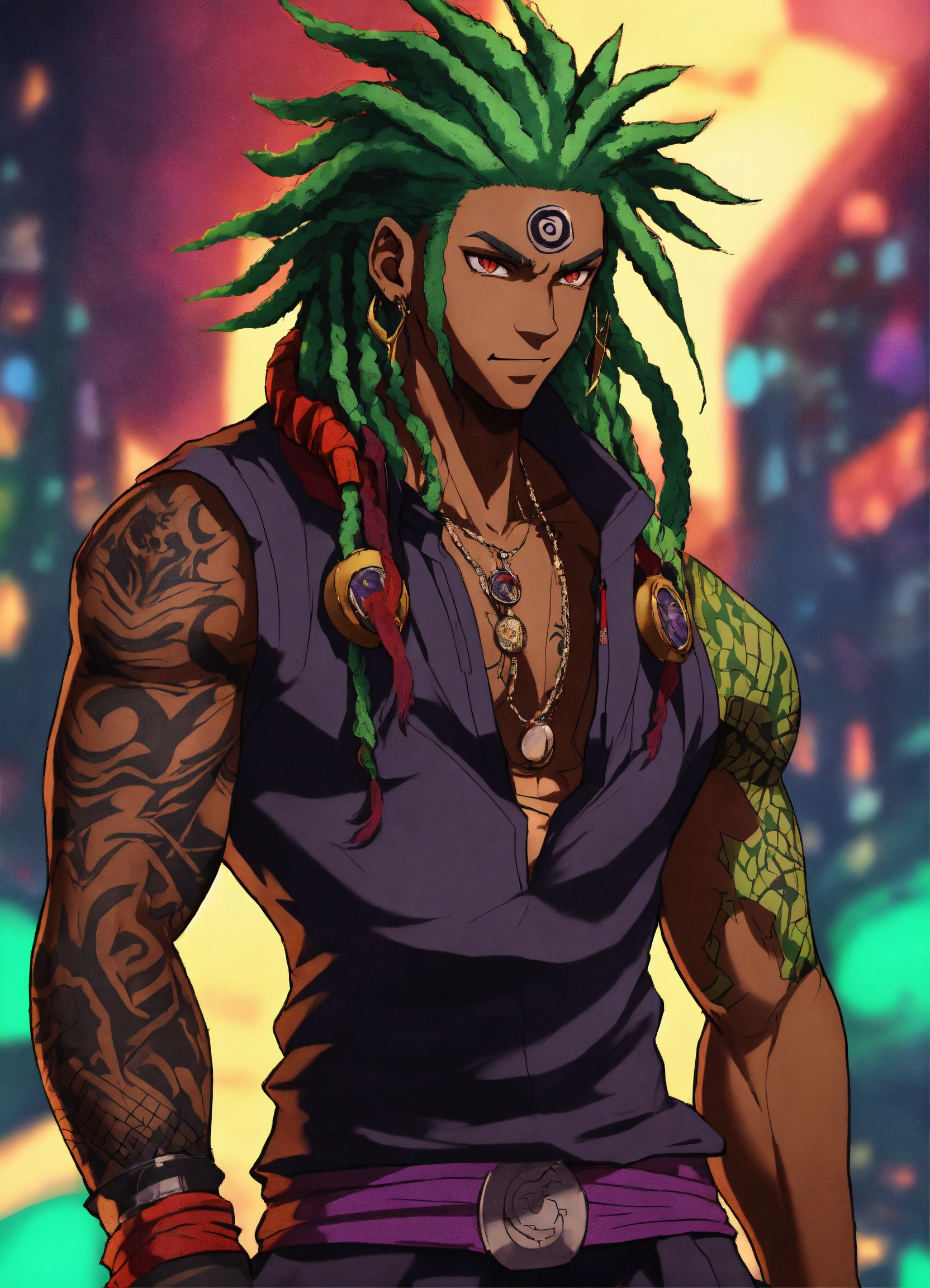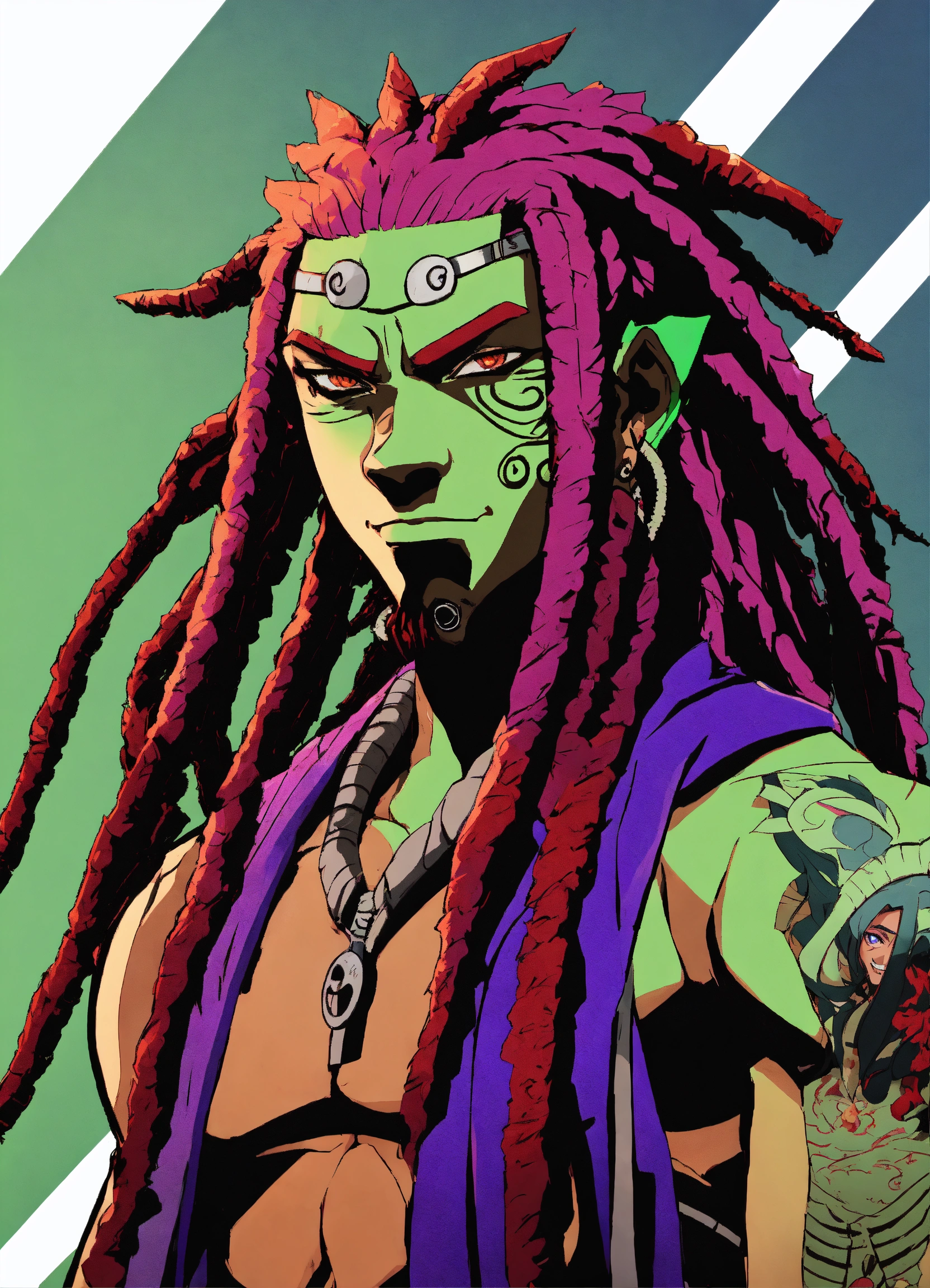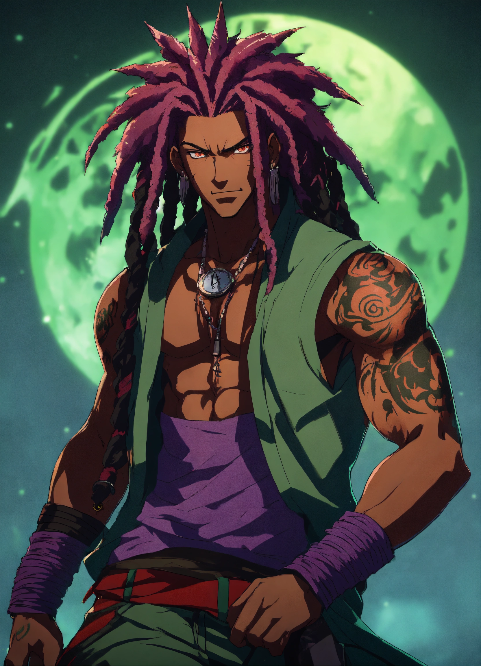 African naruto anime character, muscular physique, long green hair, which is styled in a wild dreads and untamed manner, red dragon eyes, he wears a black and purple clock, anime style, male, has a smirk on his face, has tattoos, full body view.