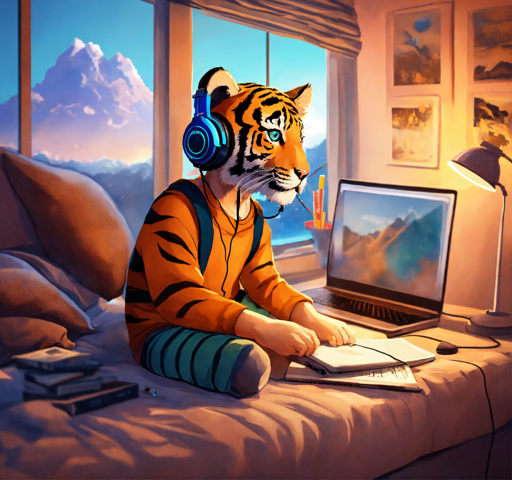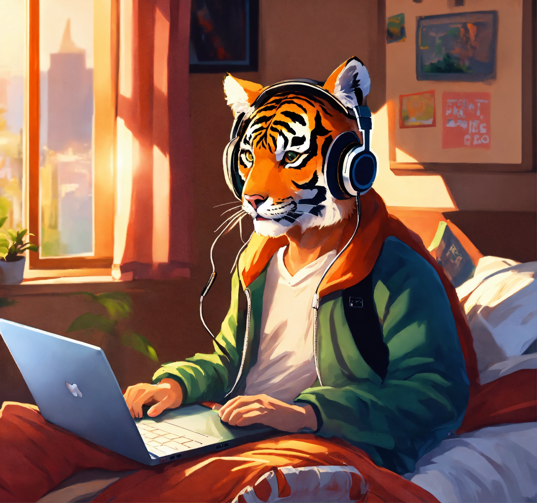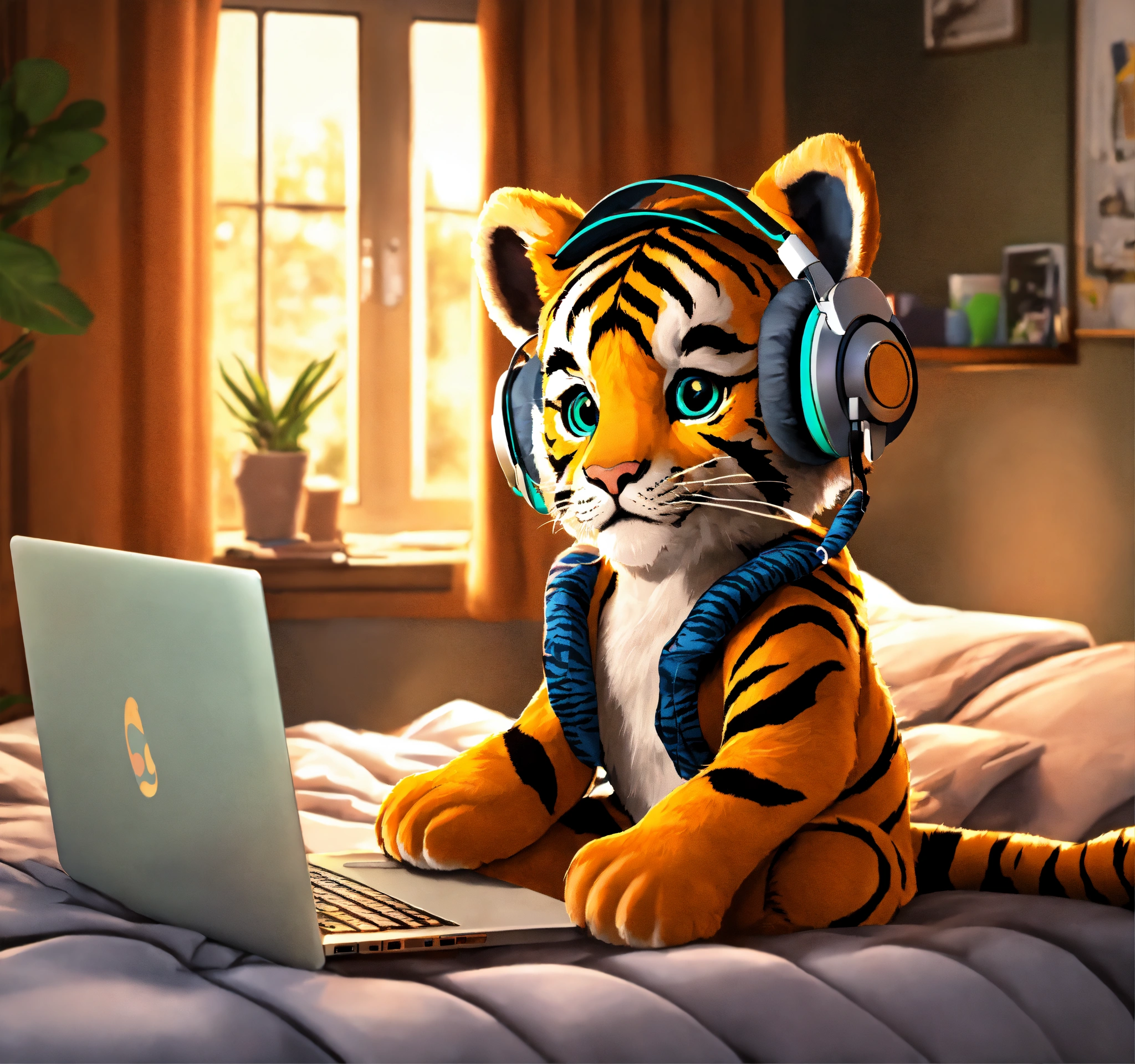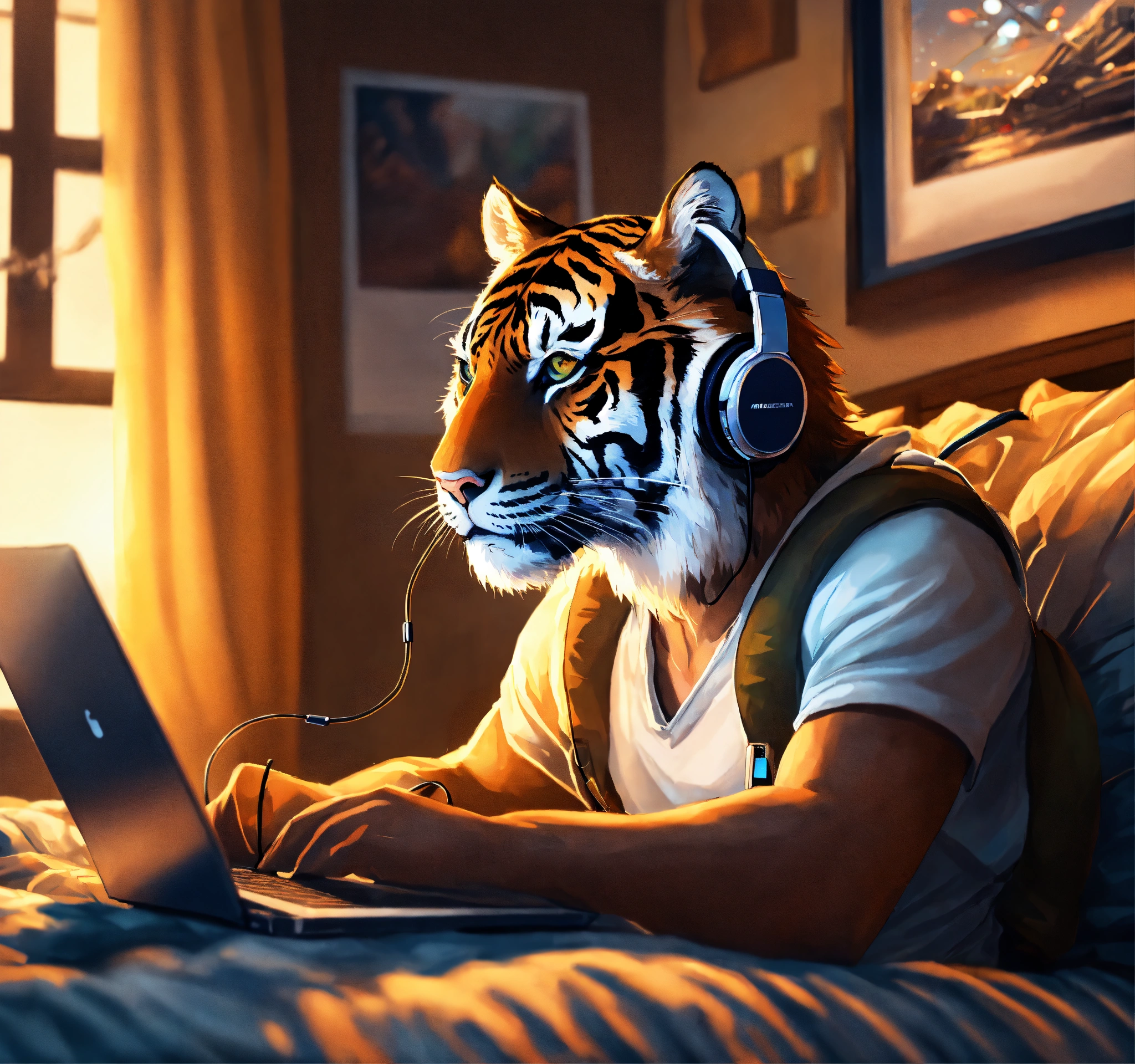Young tiger sitting on the bed in his room, listening to chillout music and doing homework in front of his laptop. he has a headphone on his head. the view is from high level of the room.