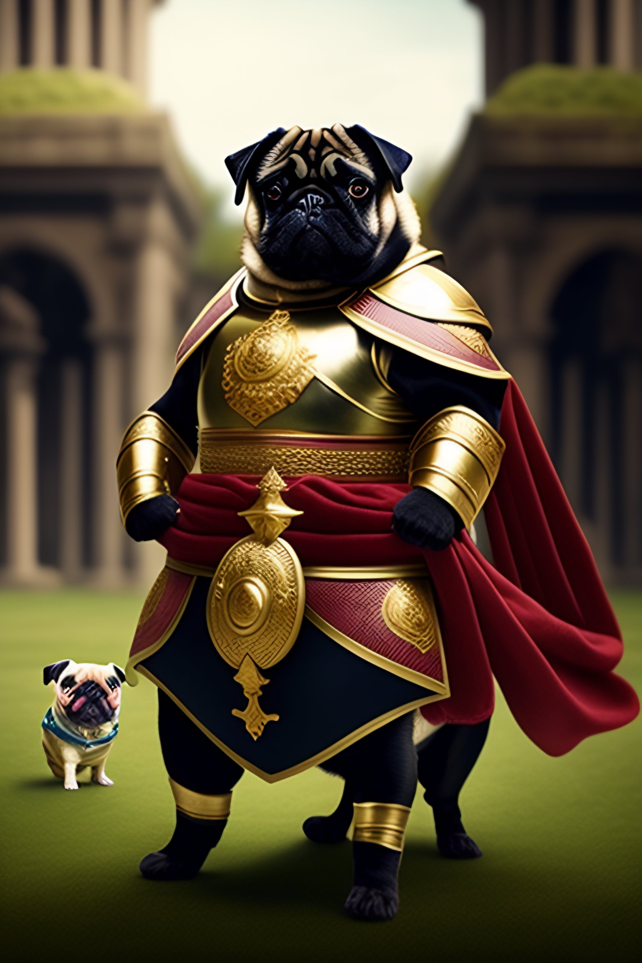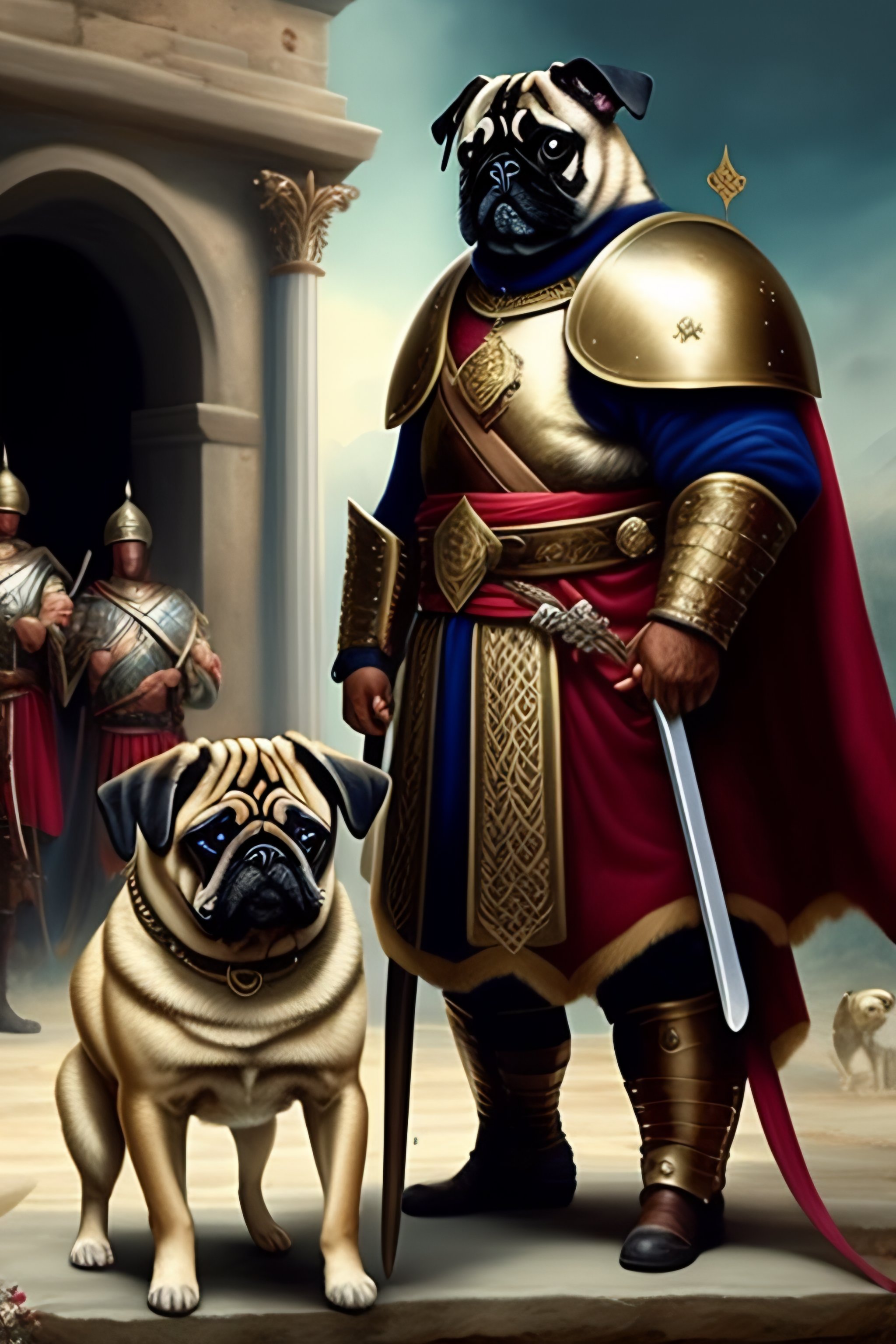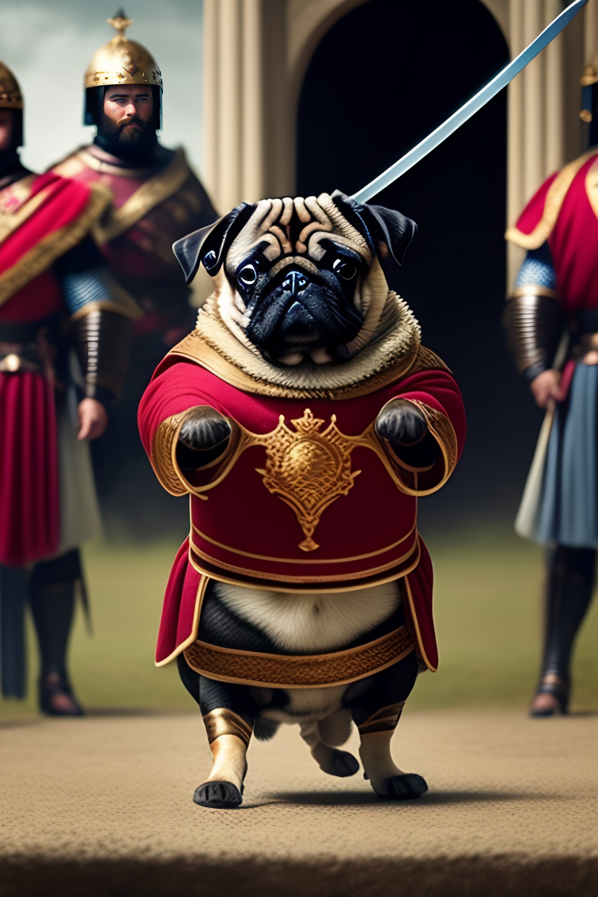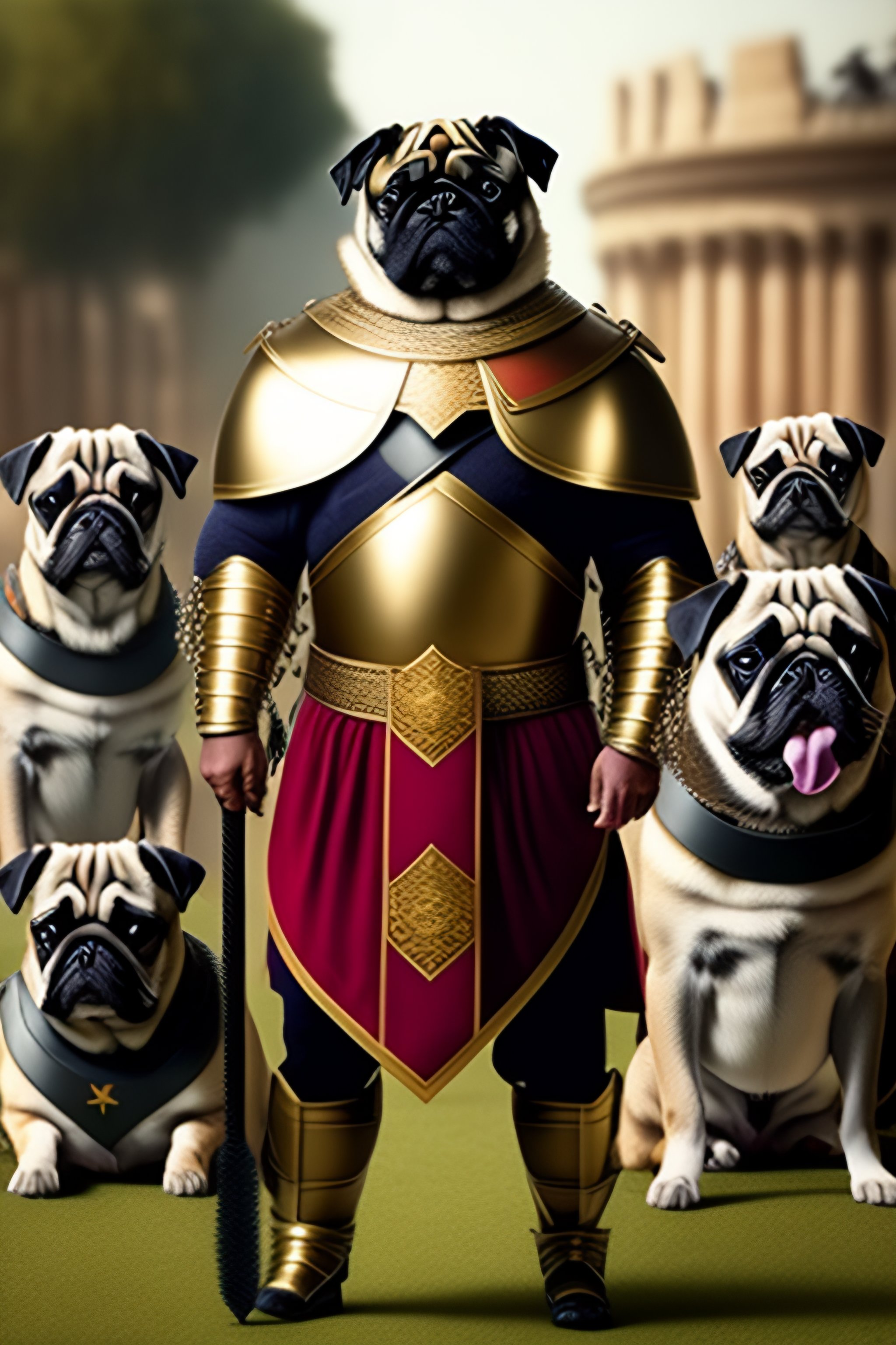 Pug in roman legion armor raising his sword in front of an army of pugs