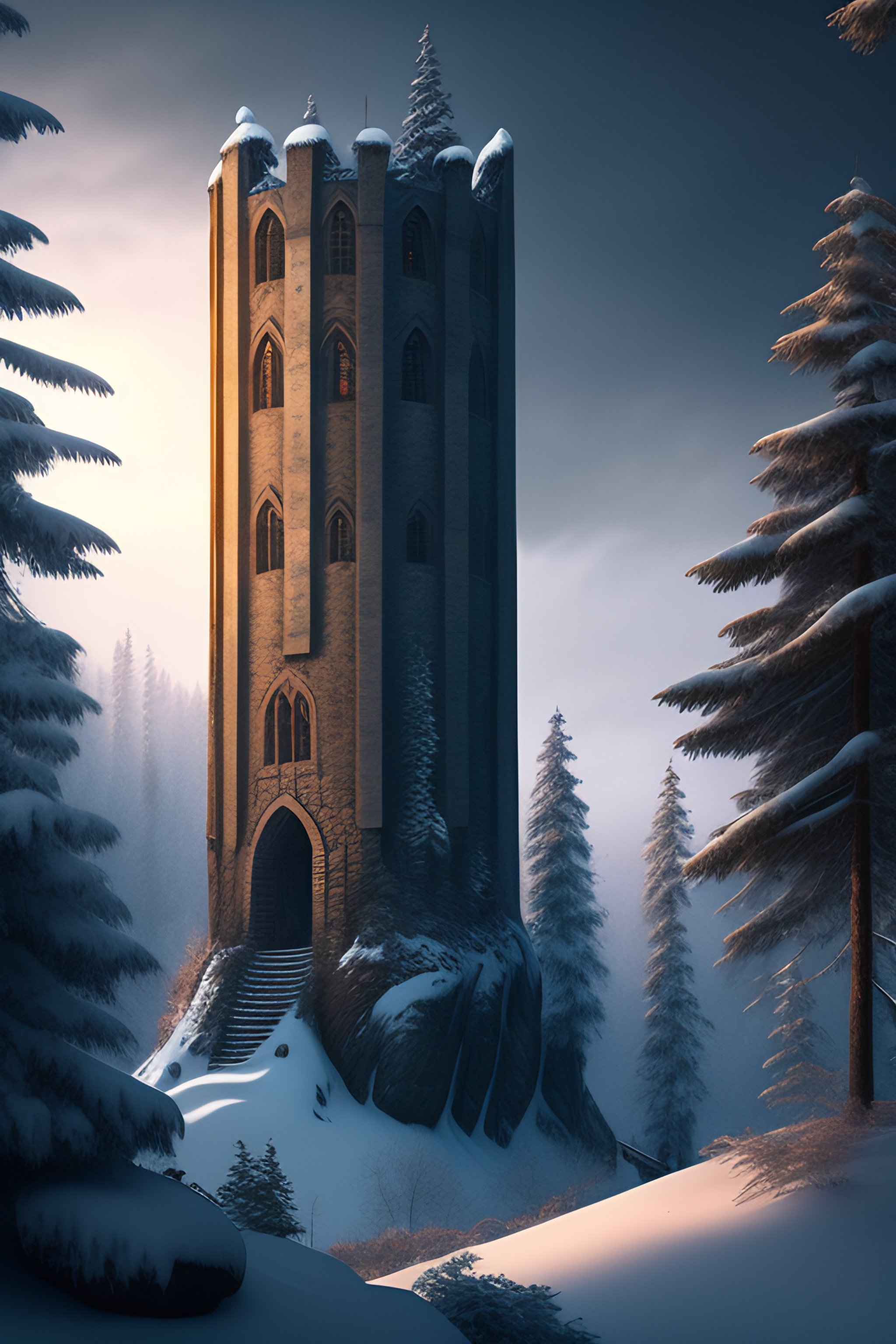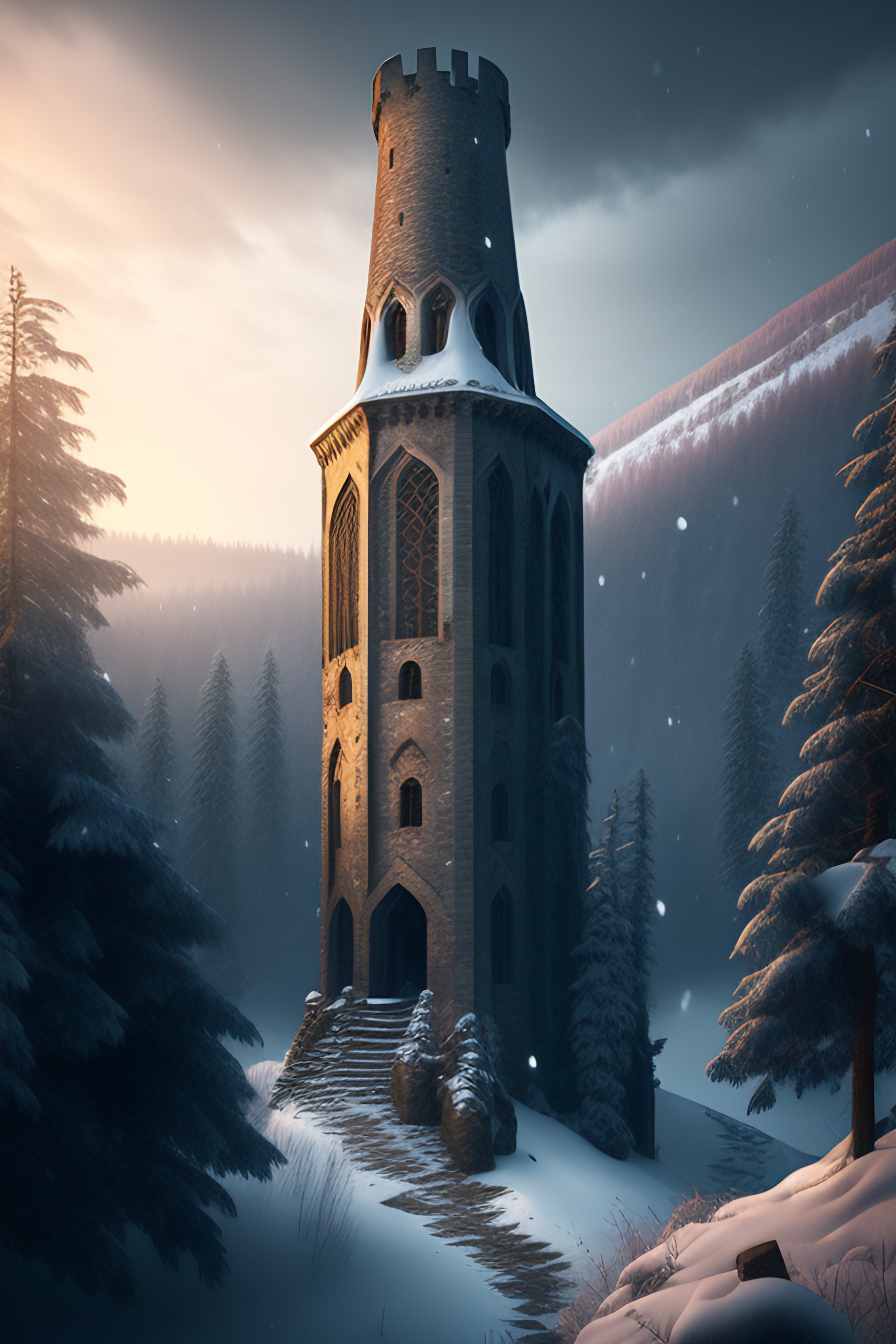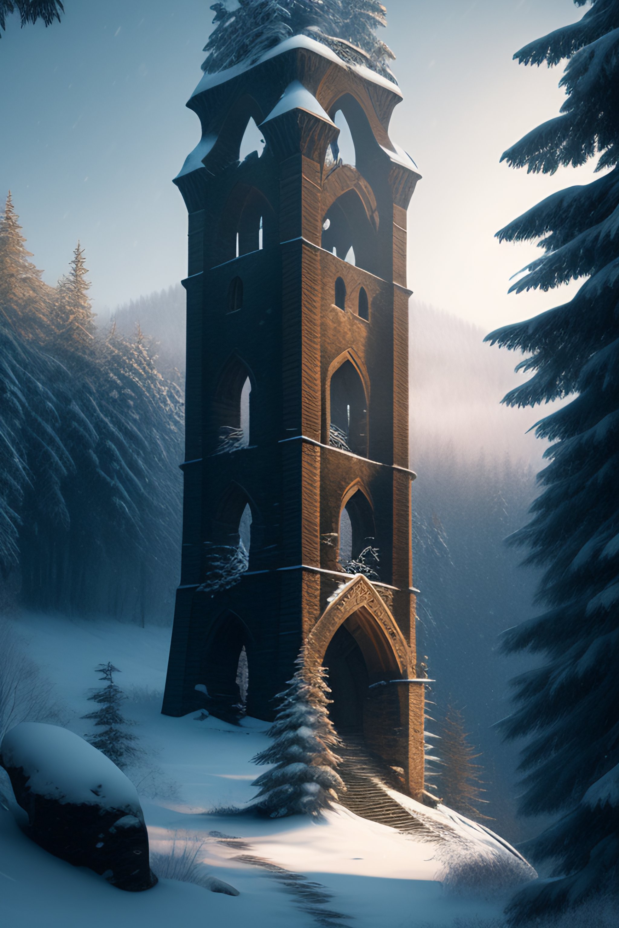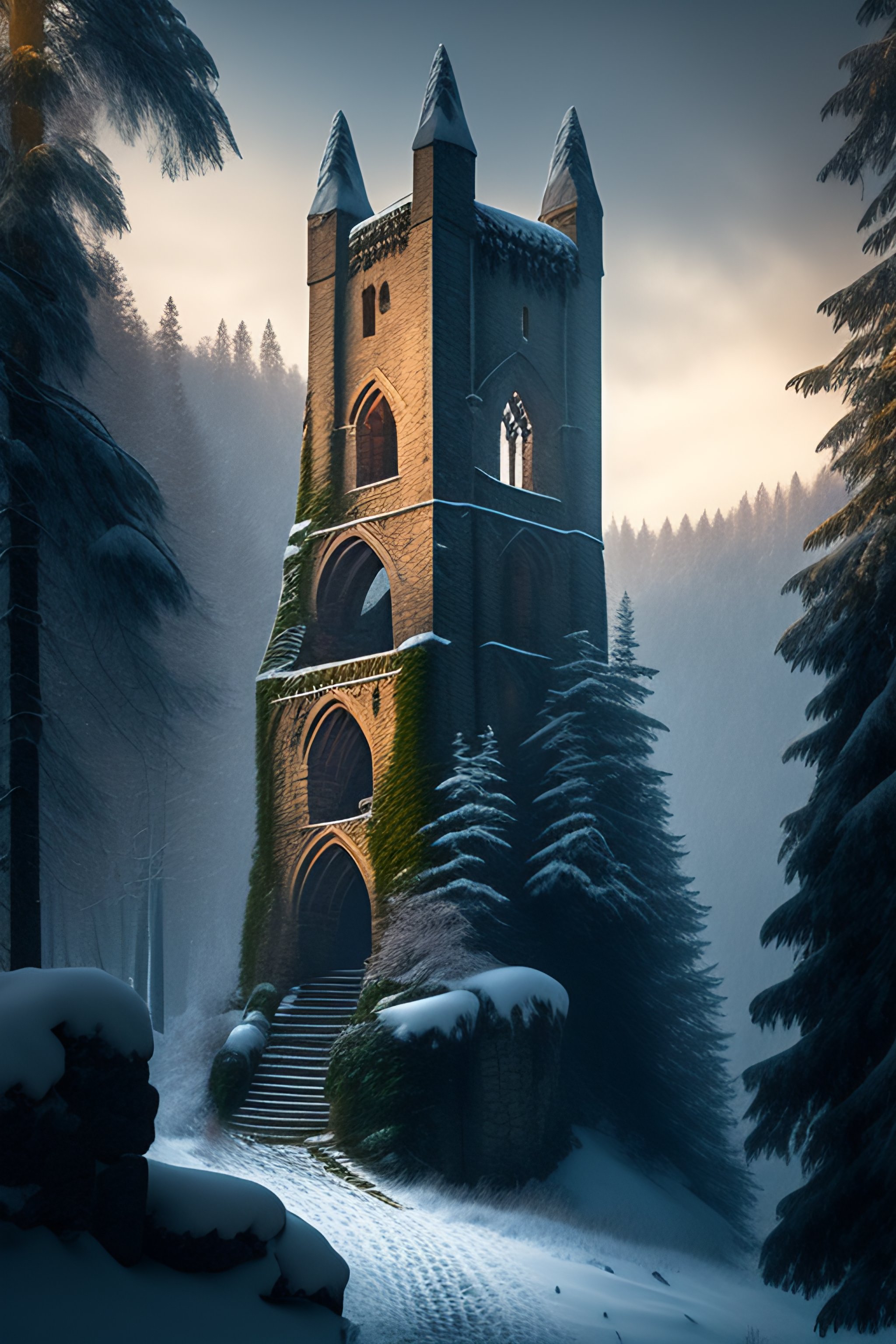 A medieval ruined tower on a steep hill. medieval, snowy forest background symbaroum, hyper detailed, cinematic lighting, 8k, high contrast, intricate details