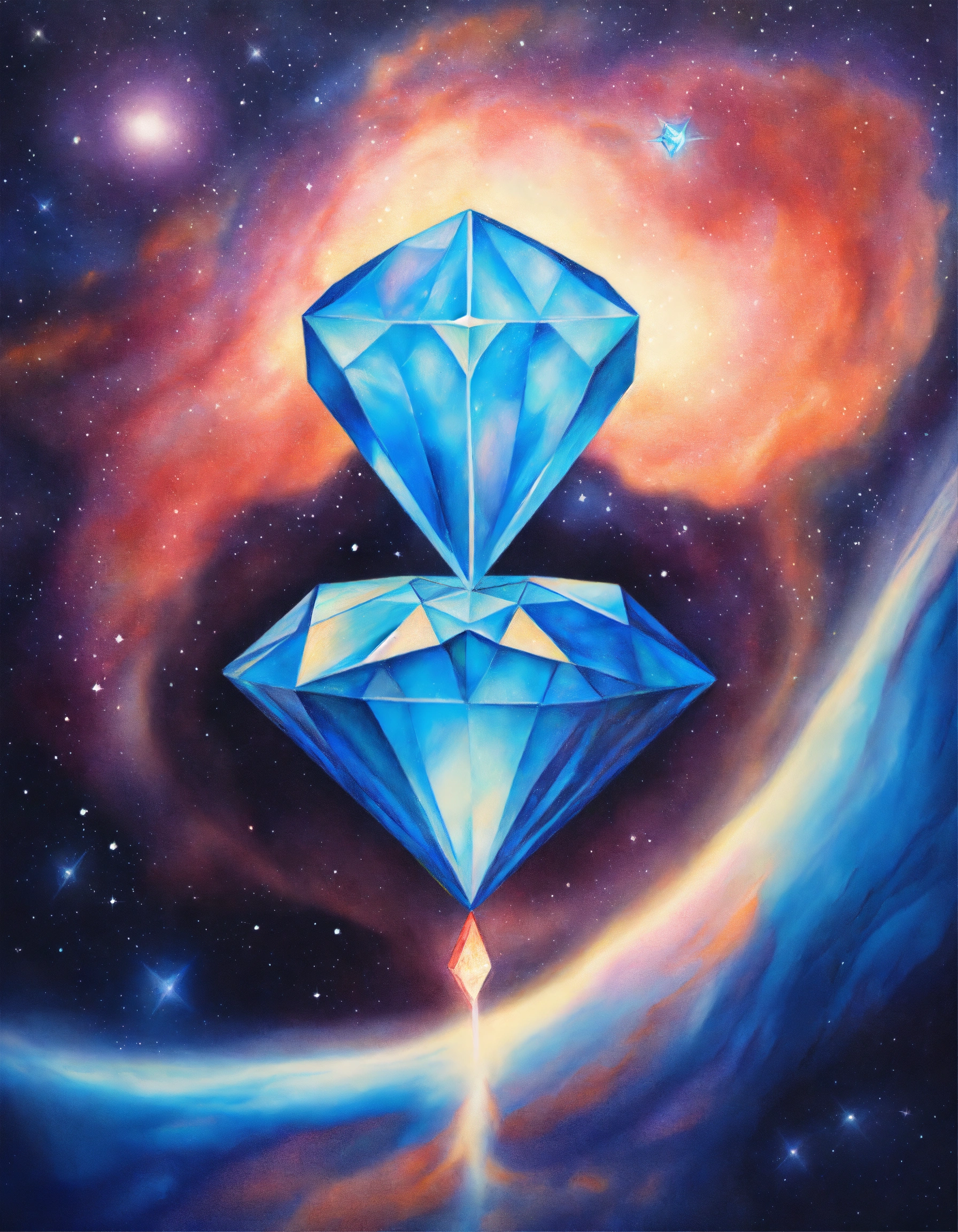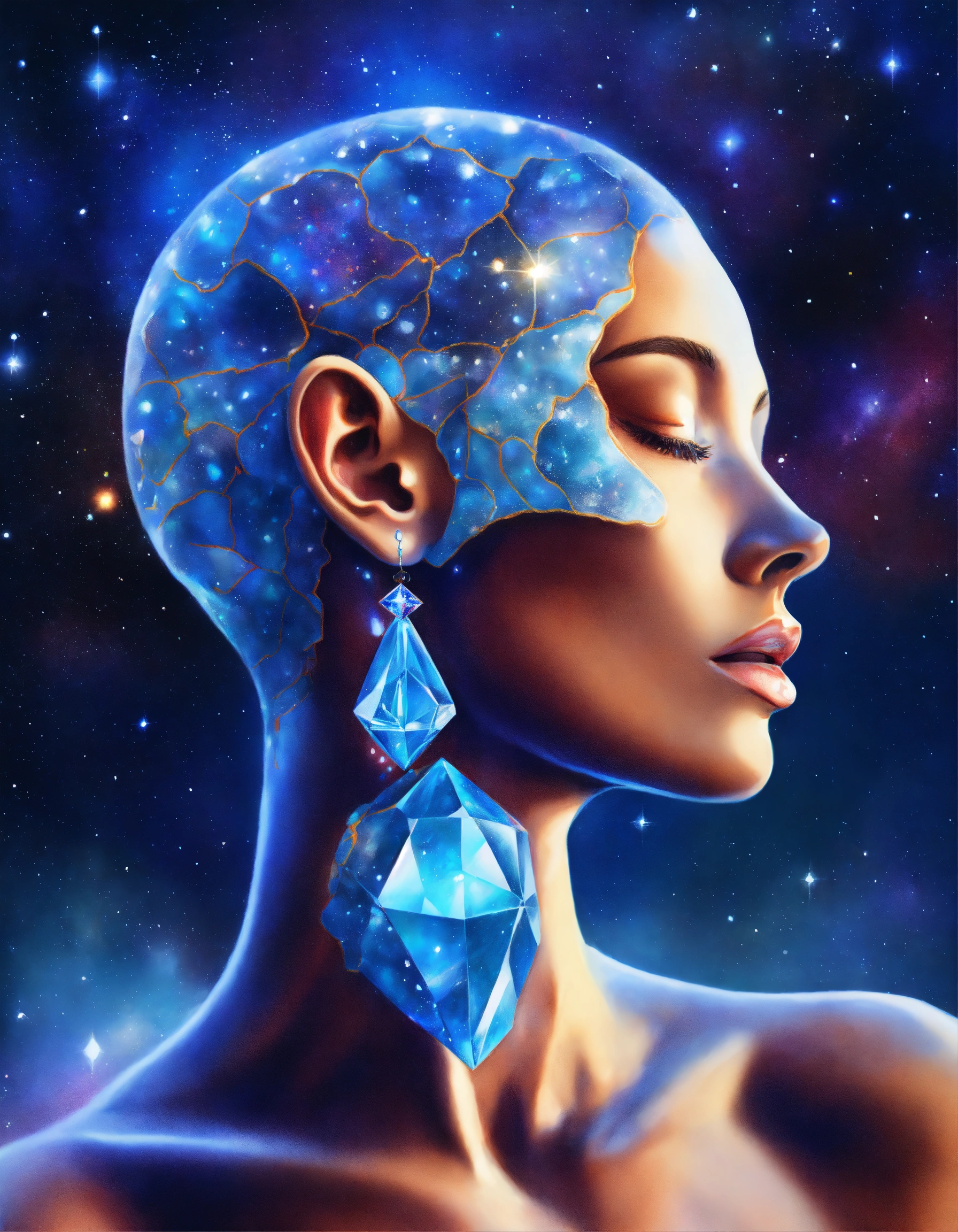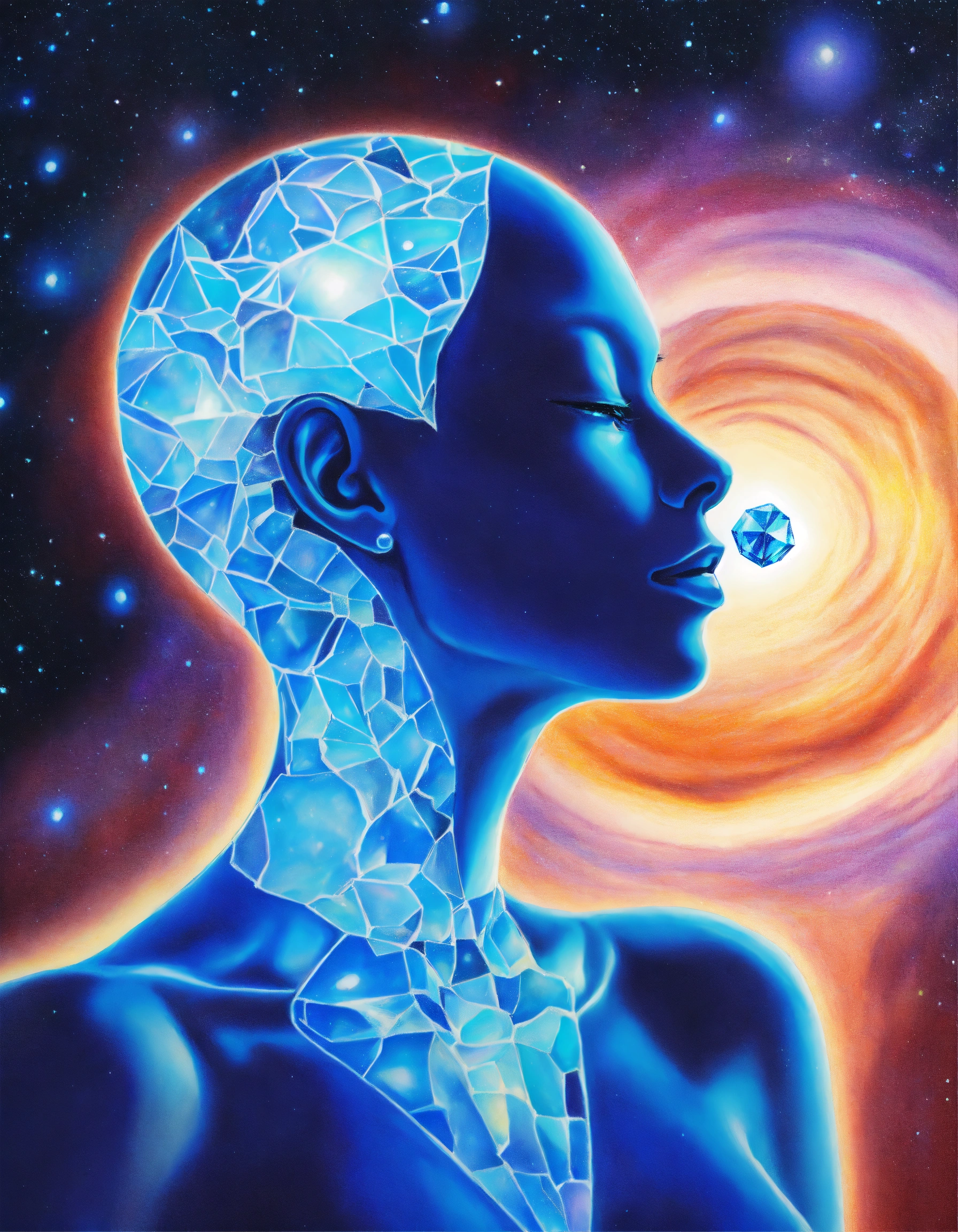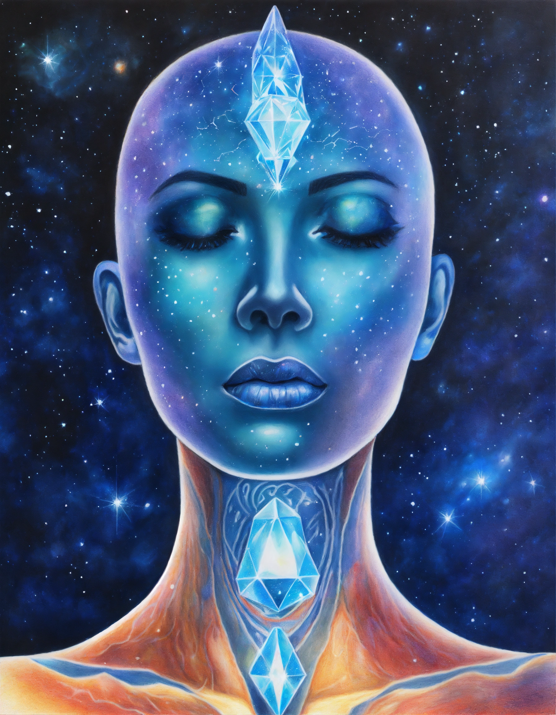 Realistic colored pencil drawing of contour silhouette of a human body with a blue crystal in the throat. a beautiful bright blue crystal attached to the throat chakra, in the throat.. galaxy background.