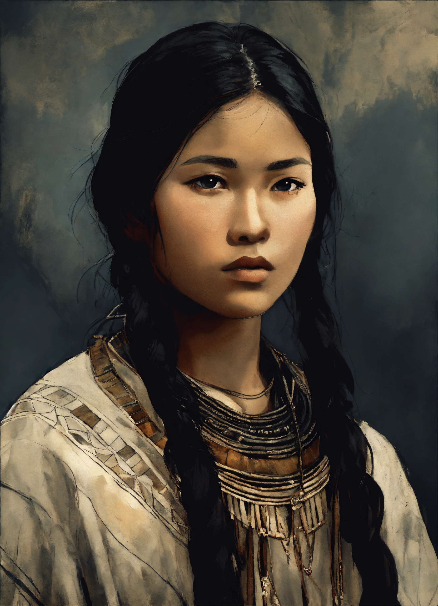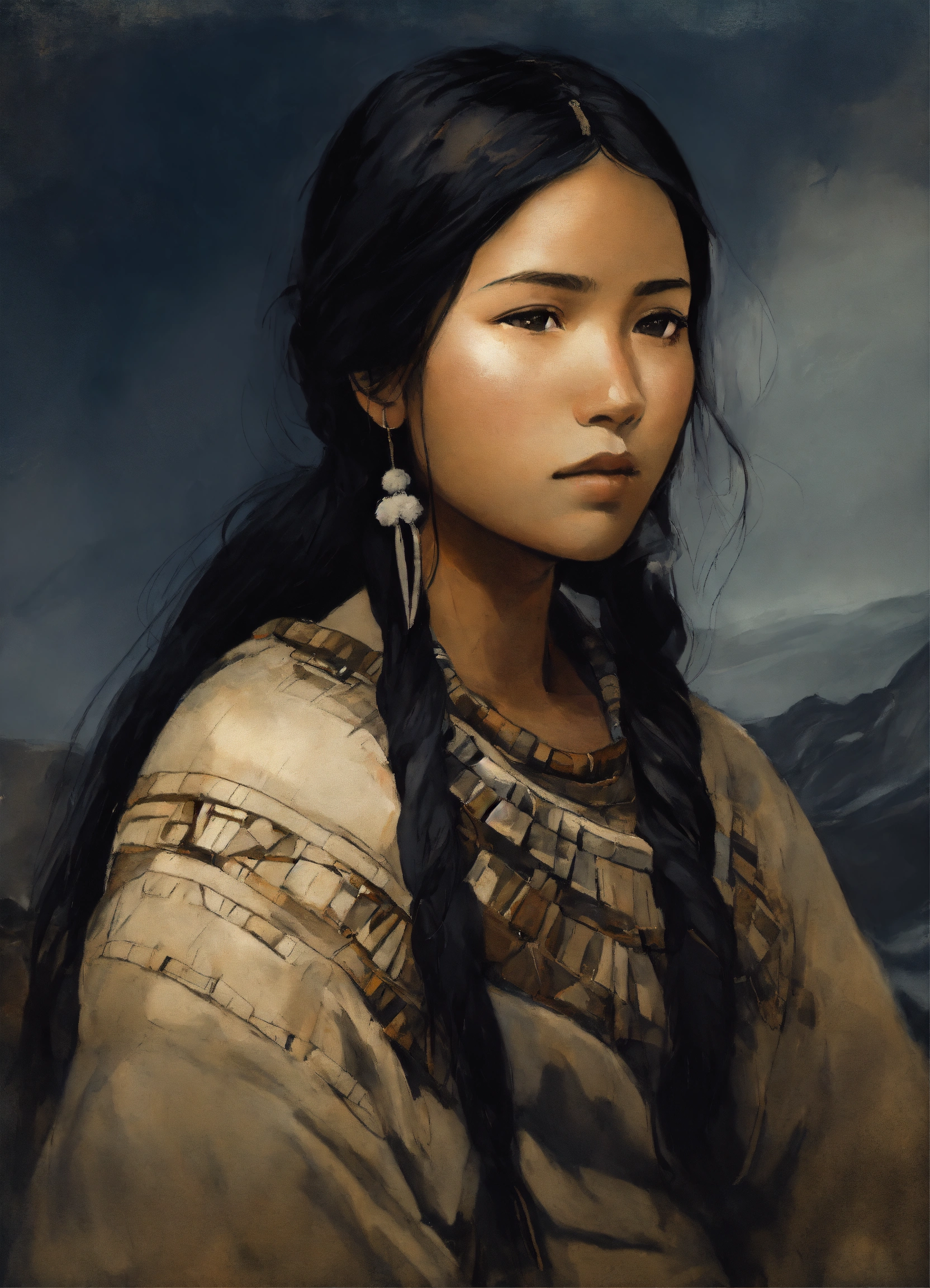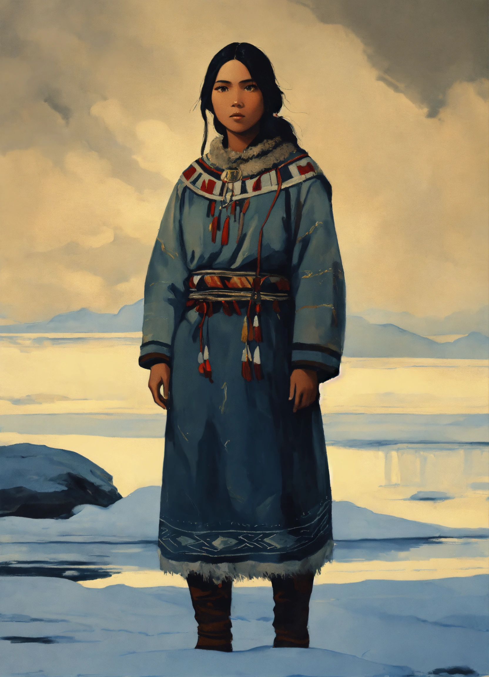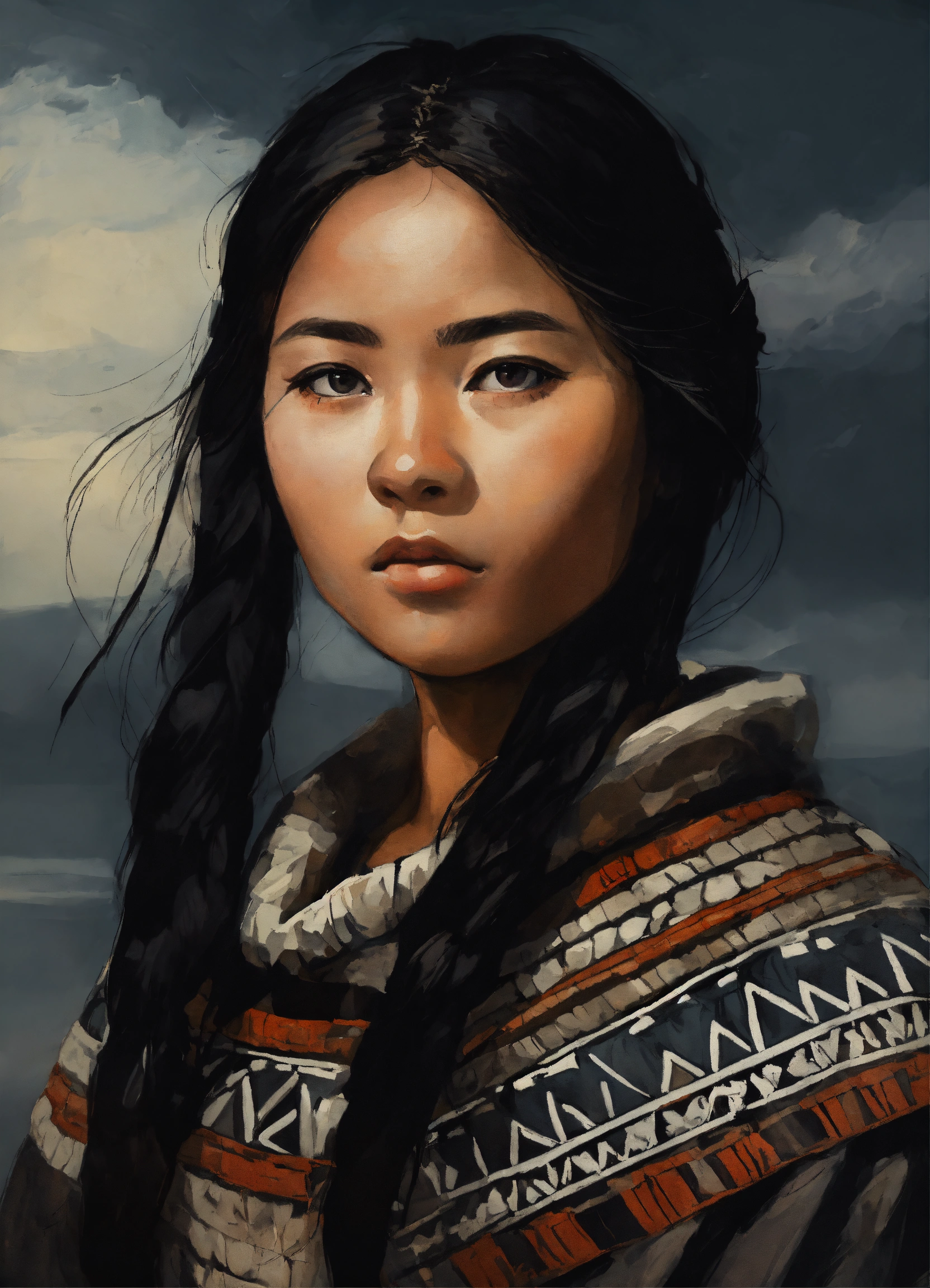 Painting of a young inuit woman, black hair, 18 years old, siberian cothing, neolithic clothing, gloomy and depressing ambient, beautiful illustration, outlined silhouettes, intricate details, dark hues