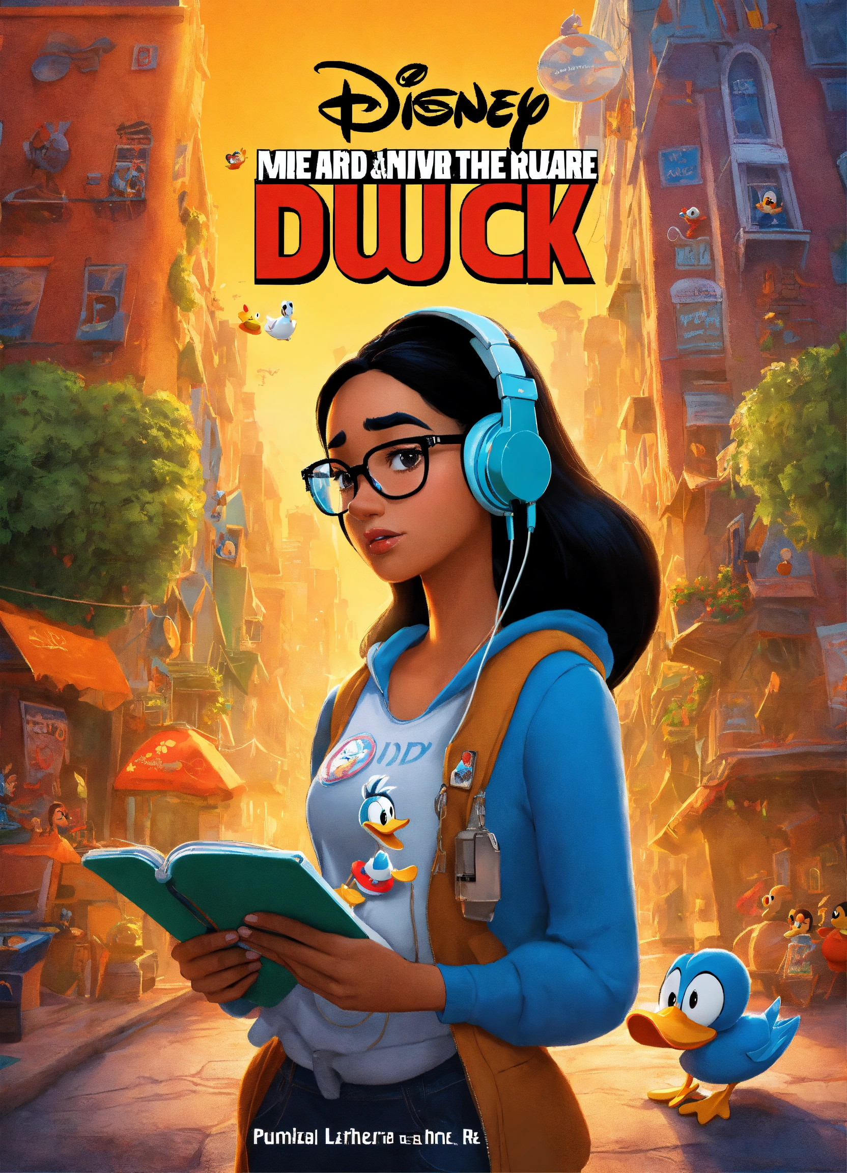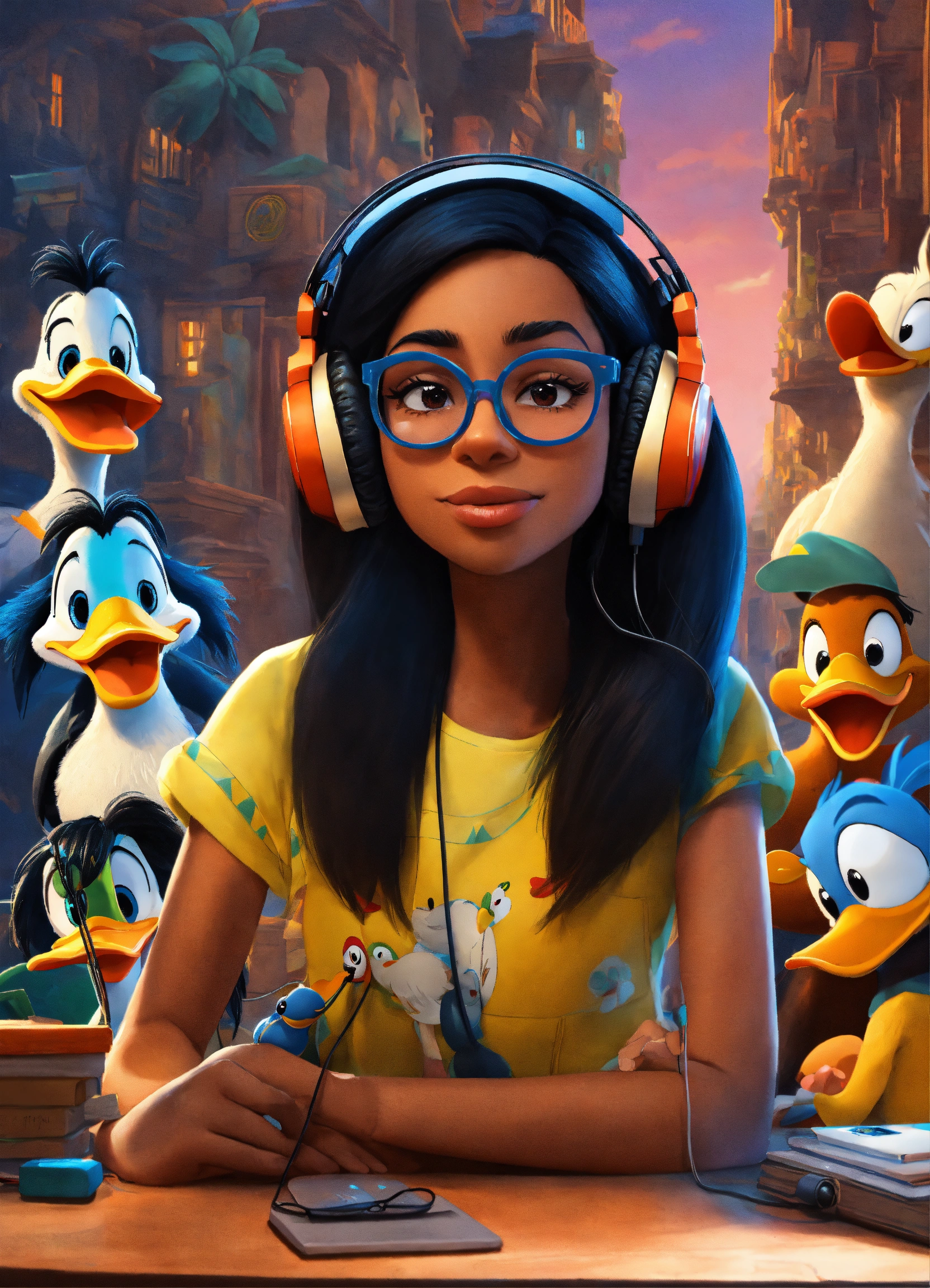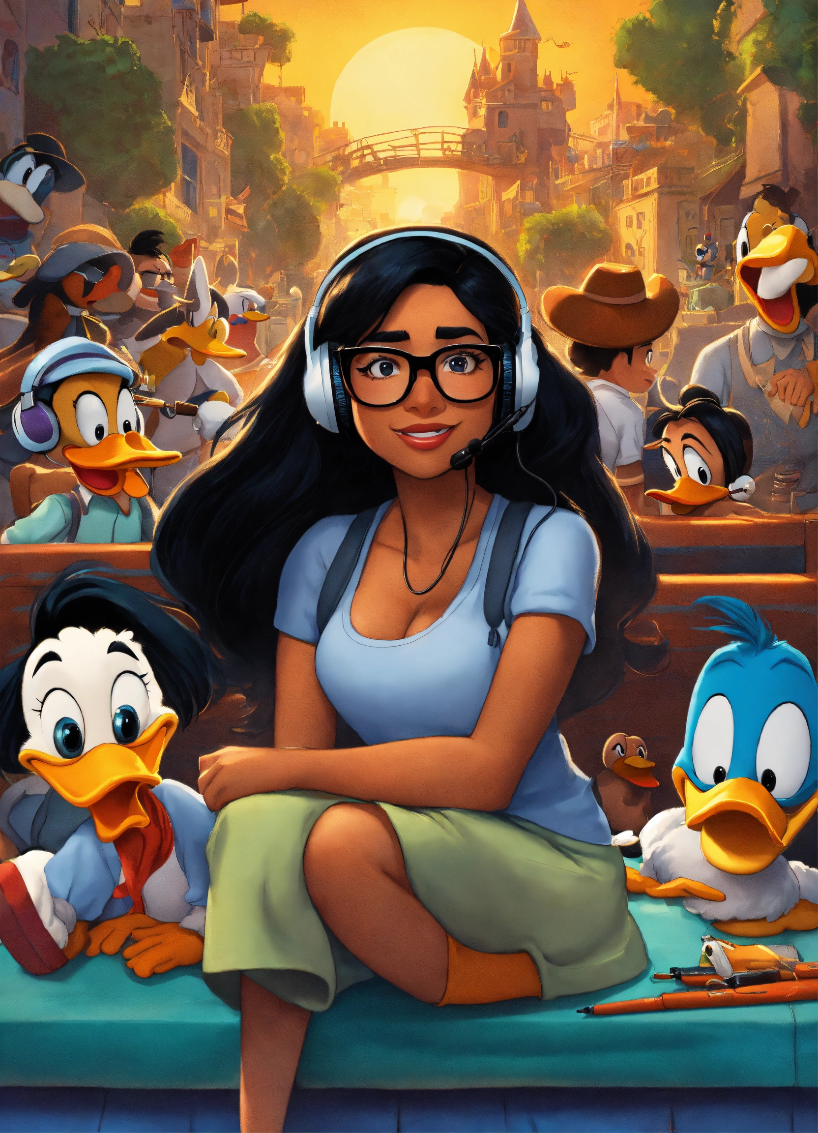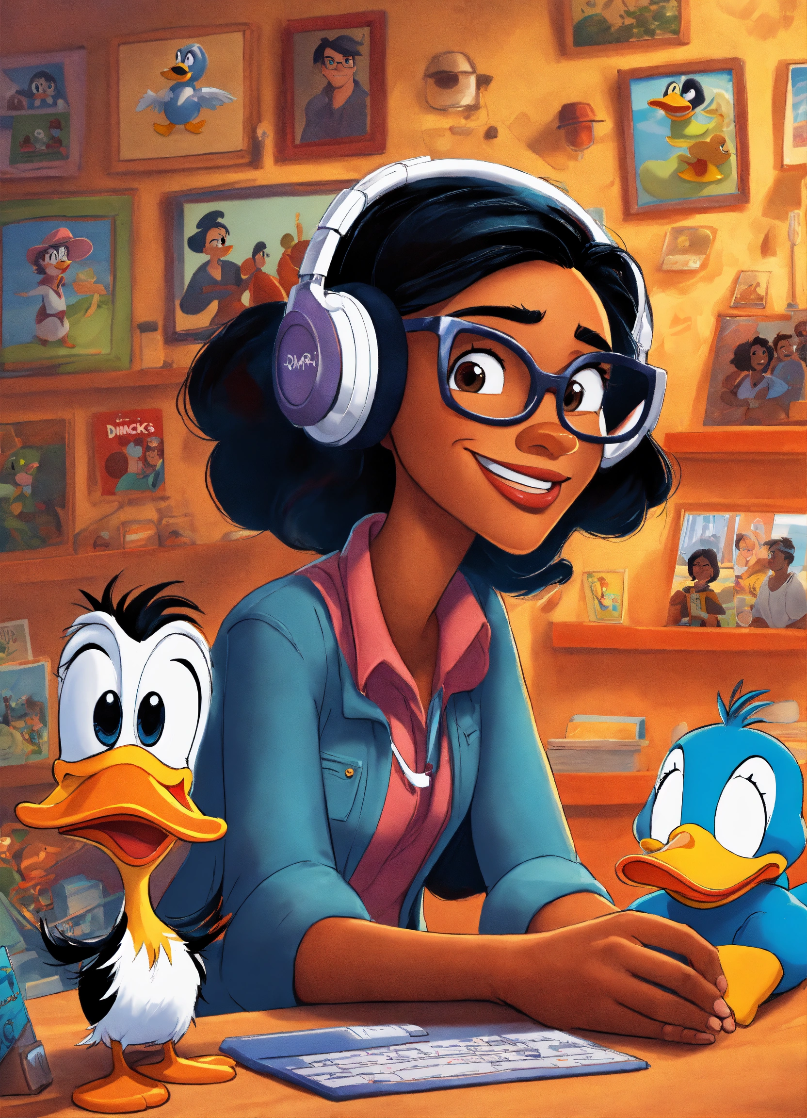 Cover of a disney and pixar movie, with a woman from the dominican republic, with a latin appearance, long straight black hair, with glasses, on a video call with headphones and microphone, thin build and average 35 years old, she looks stressed from so much work, behind her the characters from duck adventures, donald duck, his nephews and uncle rico mac duck