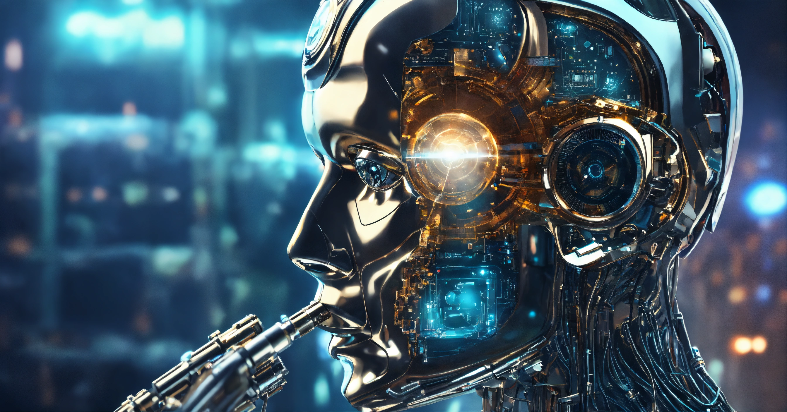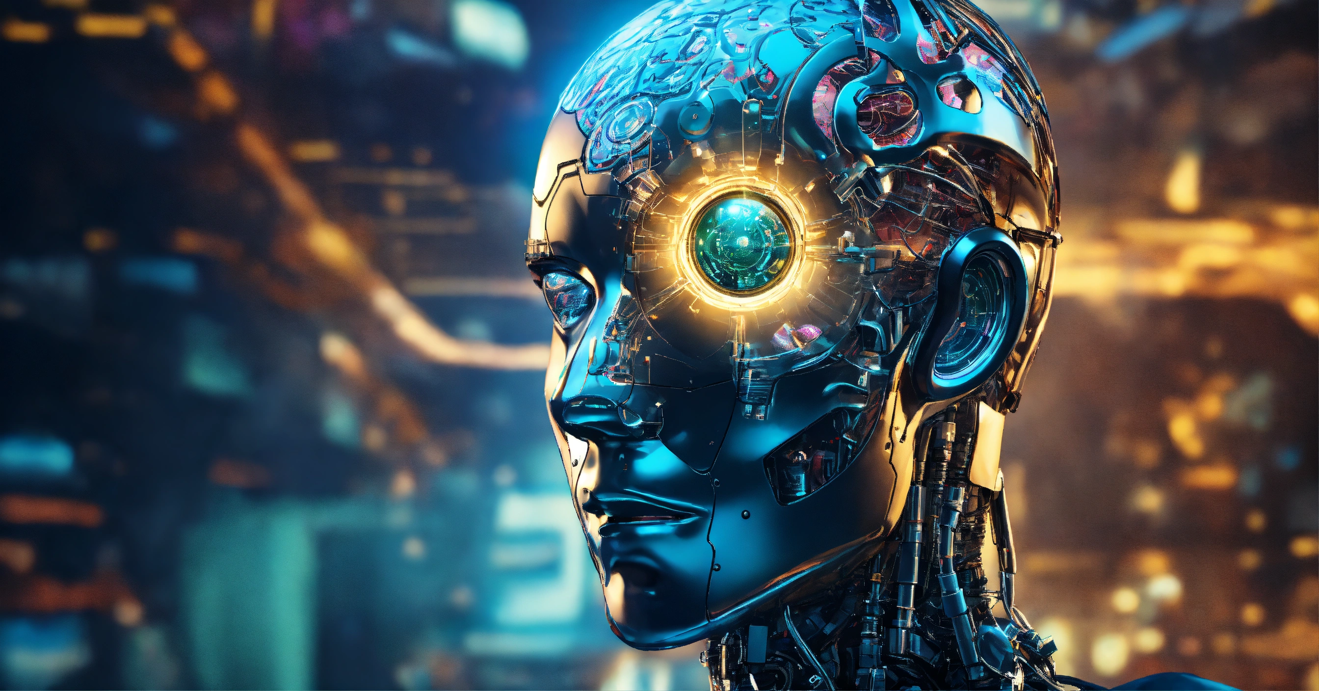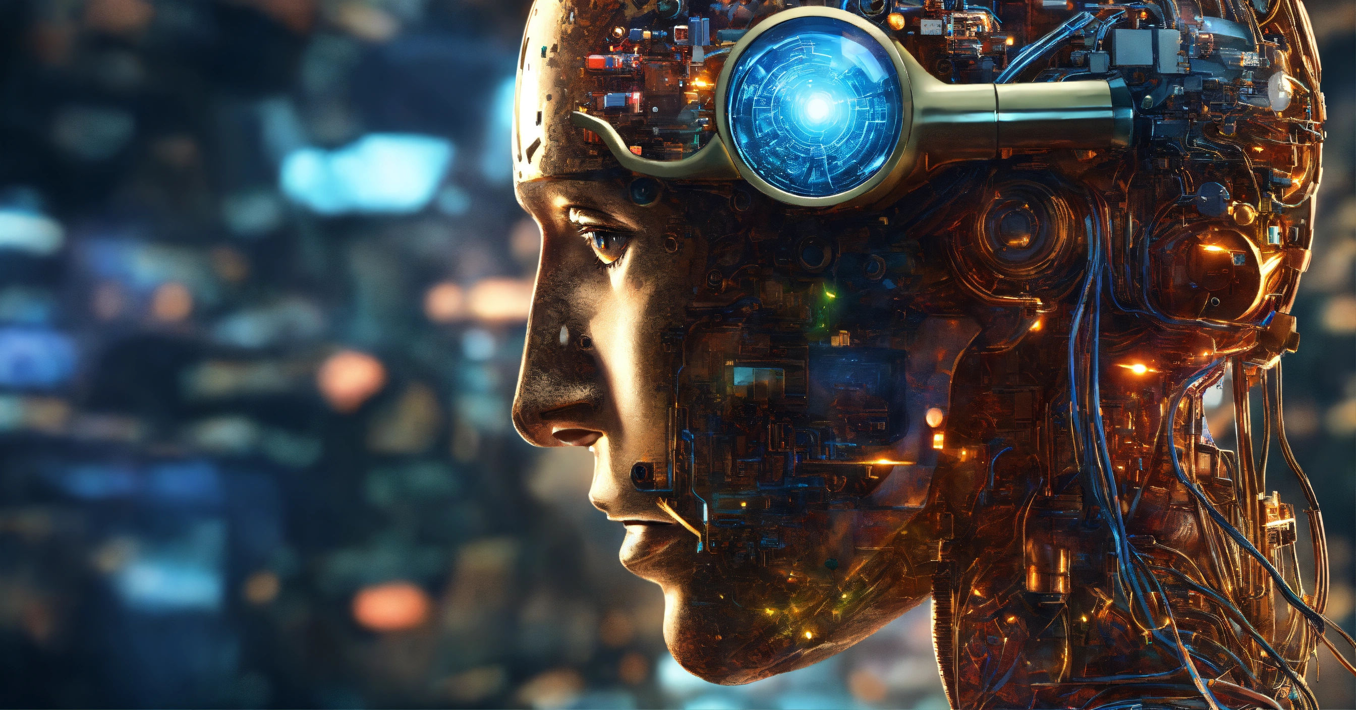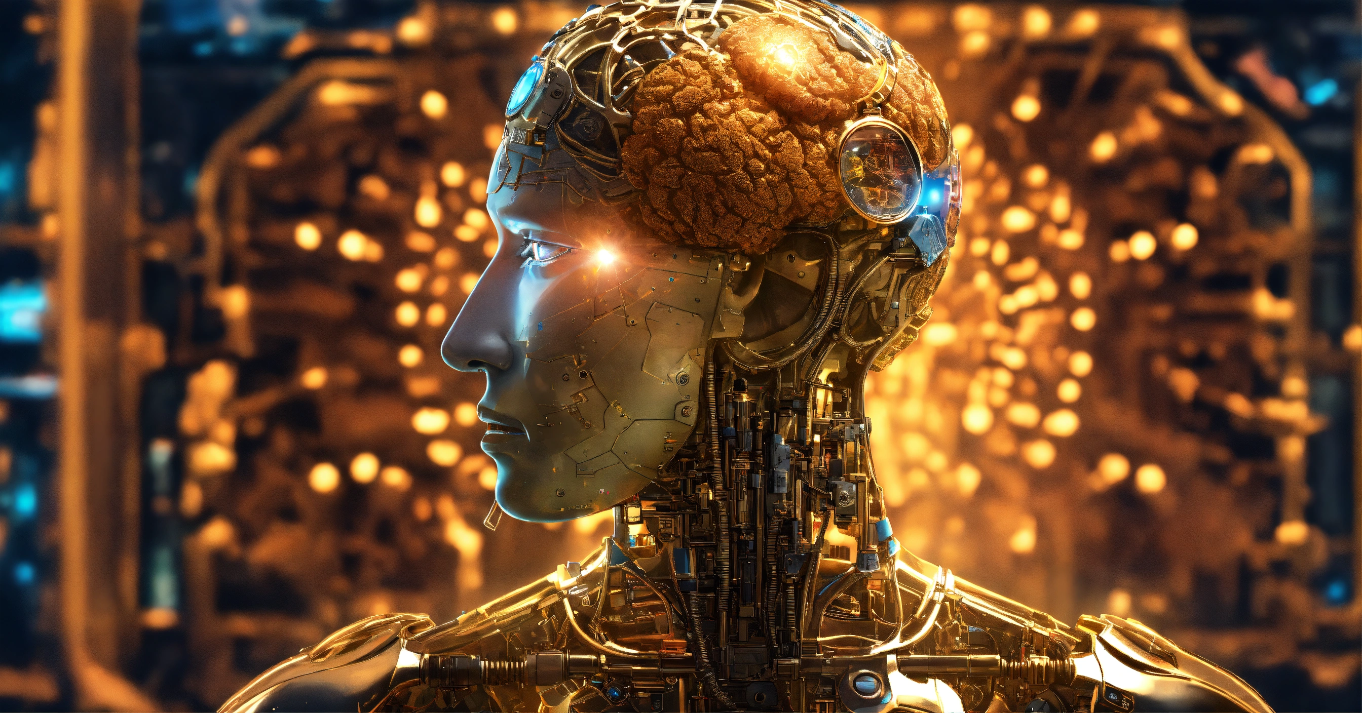 Ai god holding a magnifying glass above a human brain, super advanced technology, futuristic, hyper digital background, extremely detailed and realistic