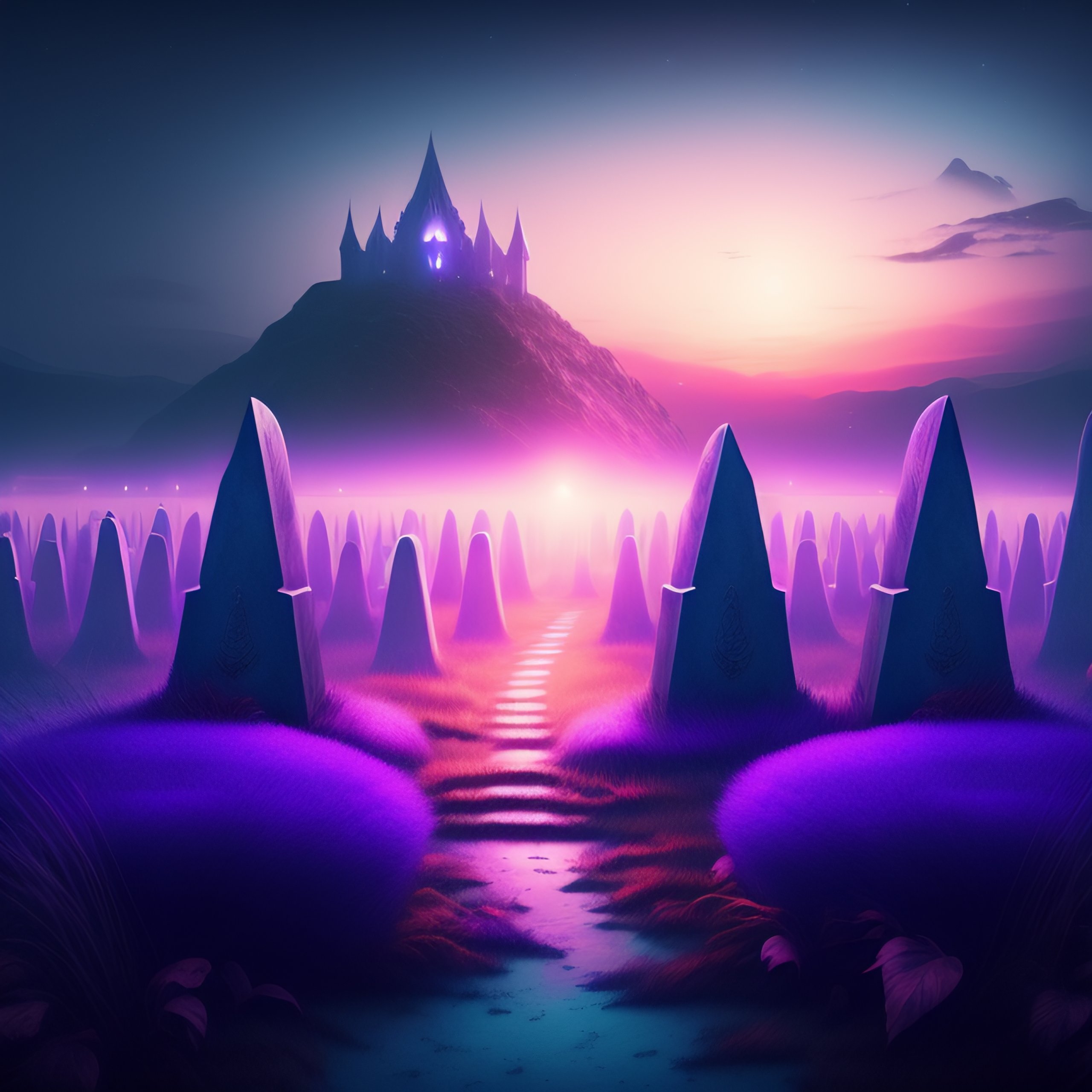 Mystical background, fantasy art, gloomy lighting, night, purple tones, lack of environment, empty field, tombstones