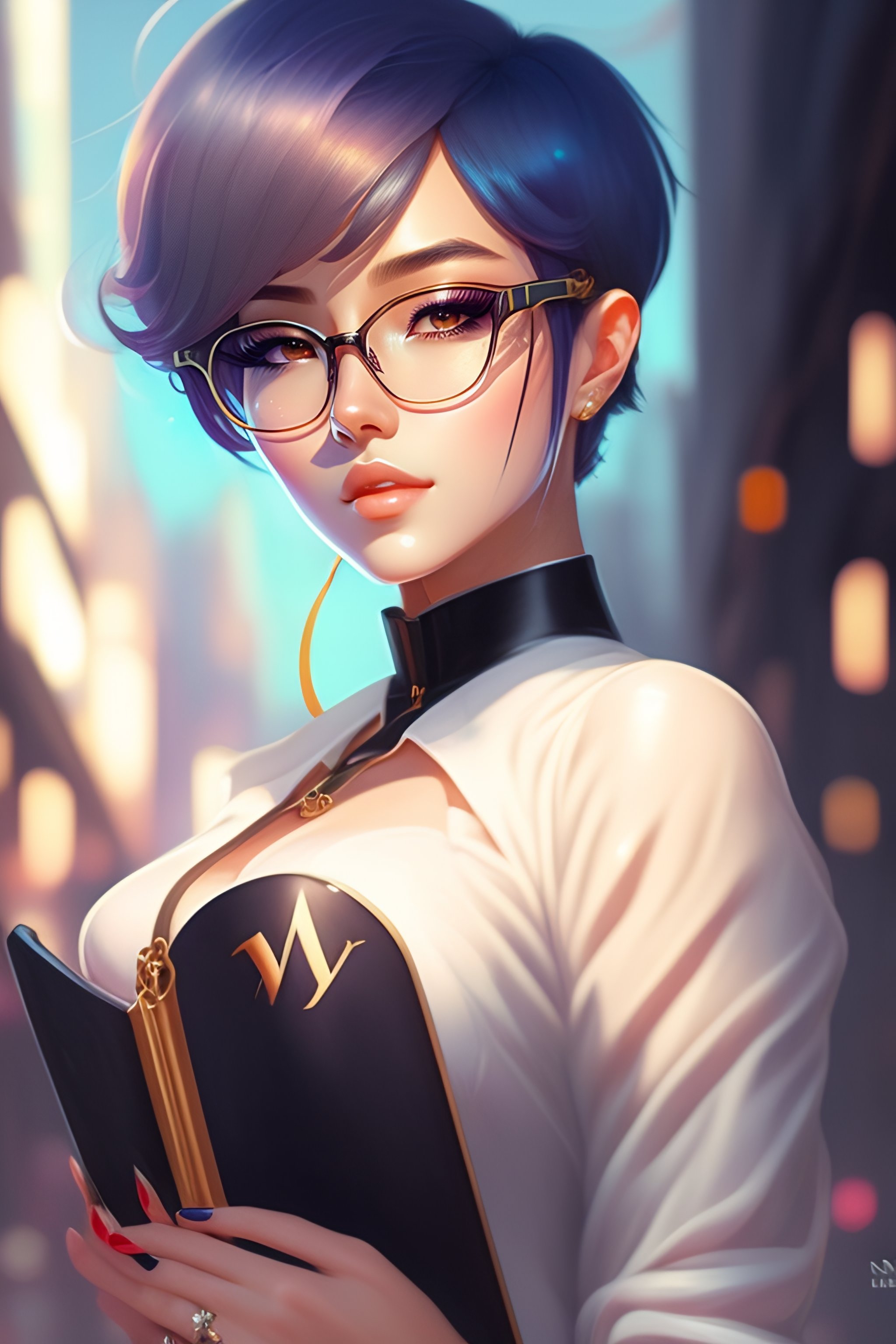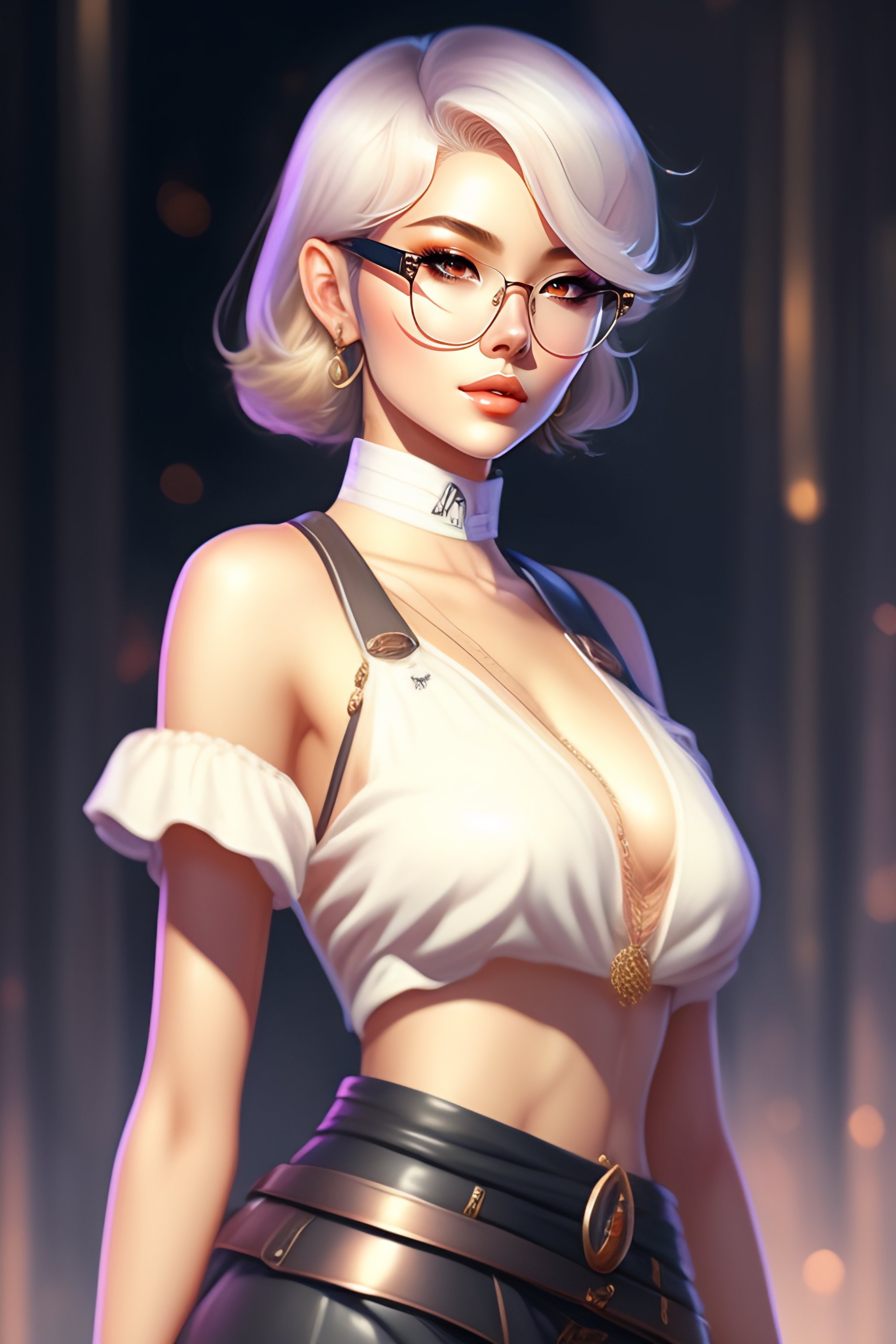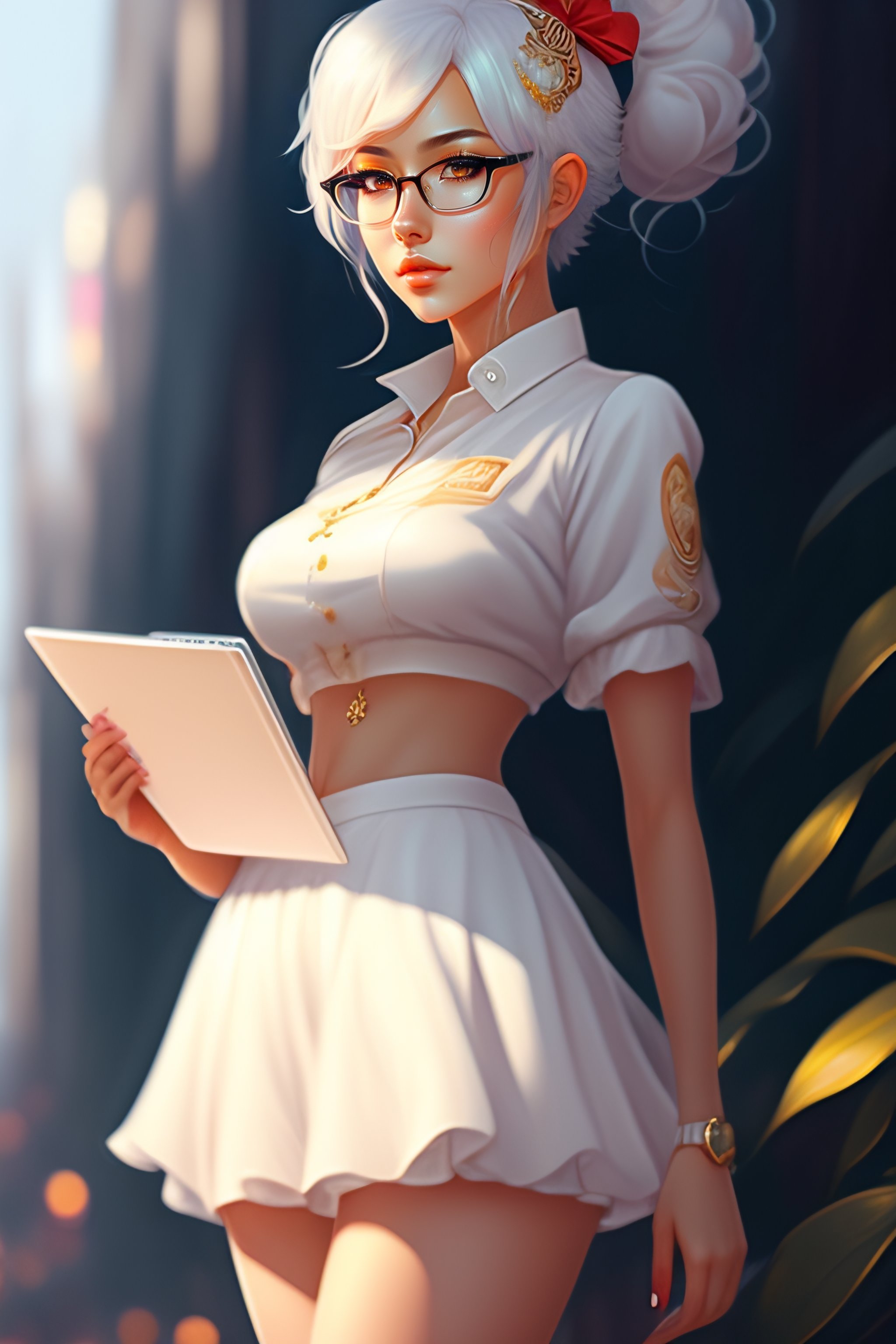 Beautiful hot anime girl with short white hair, hot body, full body, wearing mini skirt and glasses, holding a clipboard, skin the sample, character portrait, 1 9 6 0 s, long hair, intricate, elegant, highly detailed, digital painting, artstation, concept art, smooth, sharp focus, illustration, art by wlop, charlie bowater and alexandra fomina
