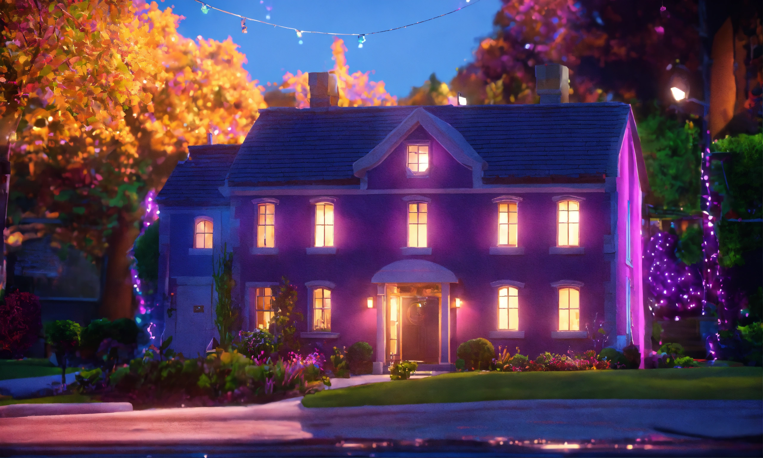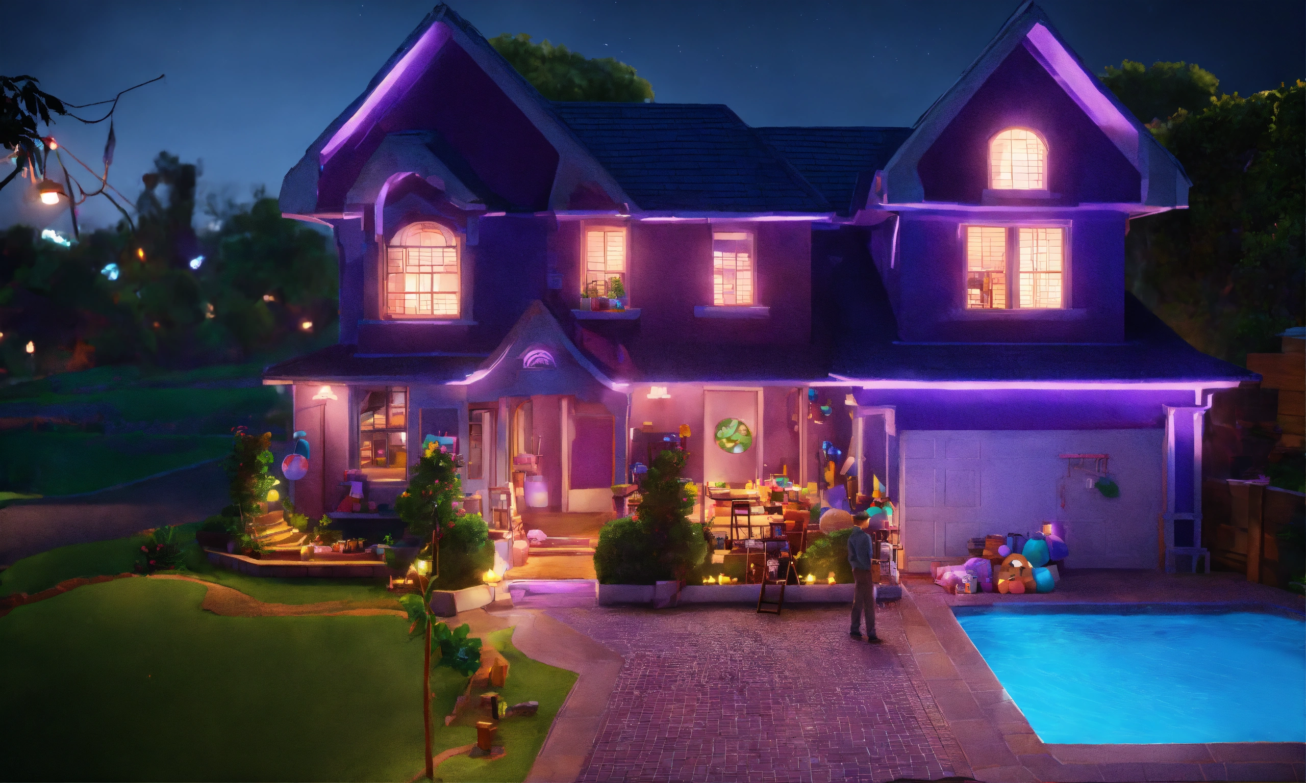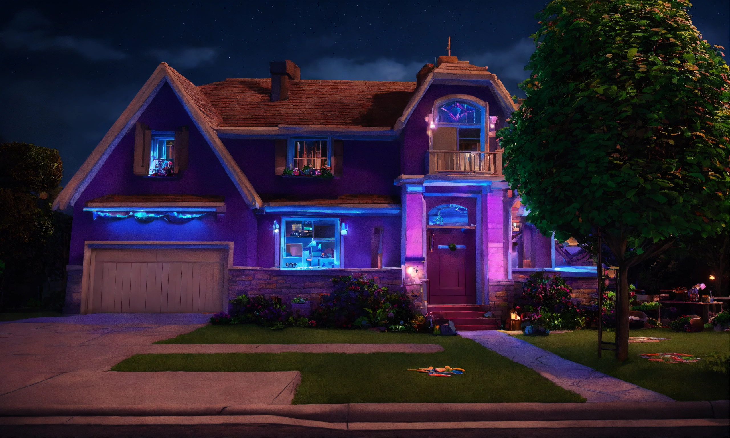 Cgi! pixar style 80's home exterior, house party, no people, highly detailed, stop motion! purple and blue lighting! nighttime
