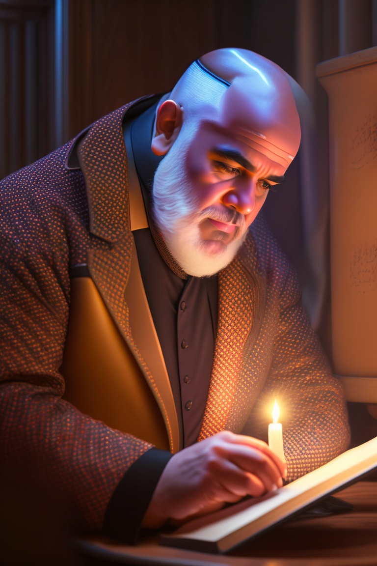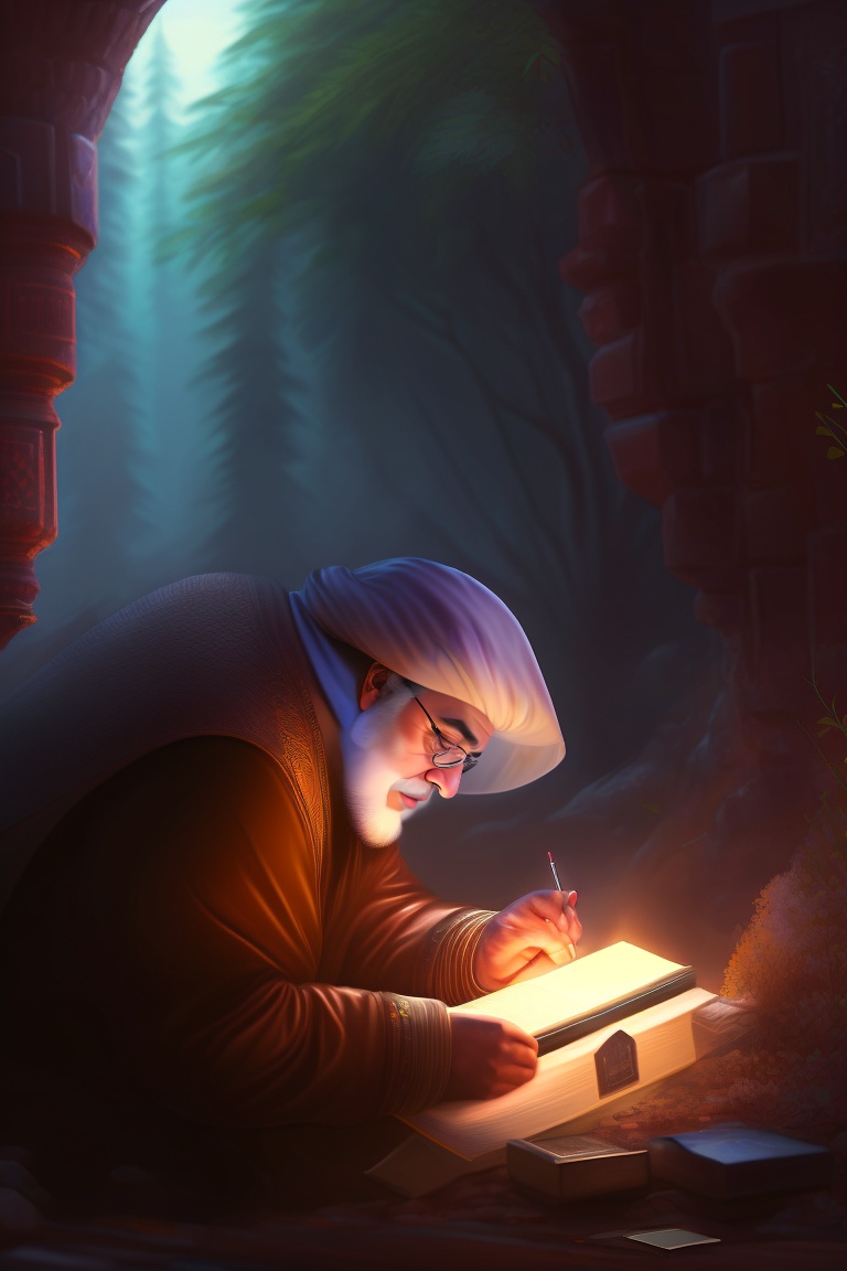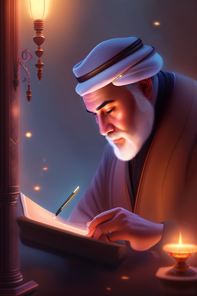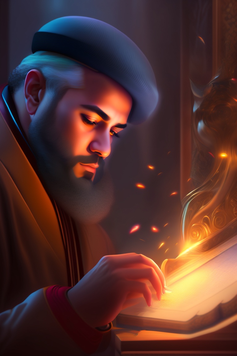 Hunayn ibn ishaq al-abadi carefully examining ancient greek manuscripts by candlelight, his eyes sparkling with excitement as he translates the profound words into arabic.