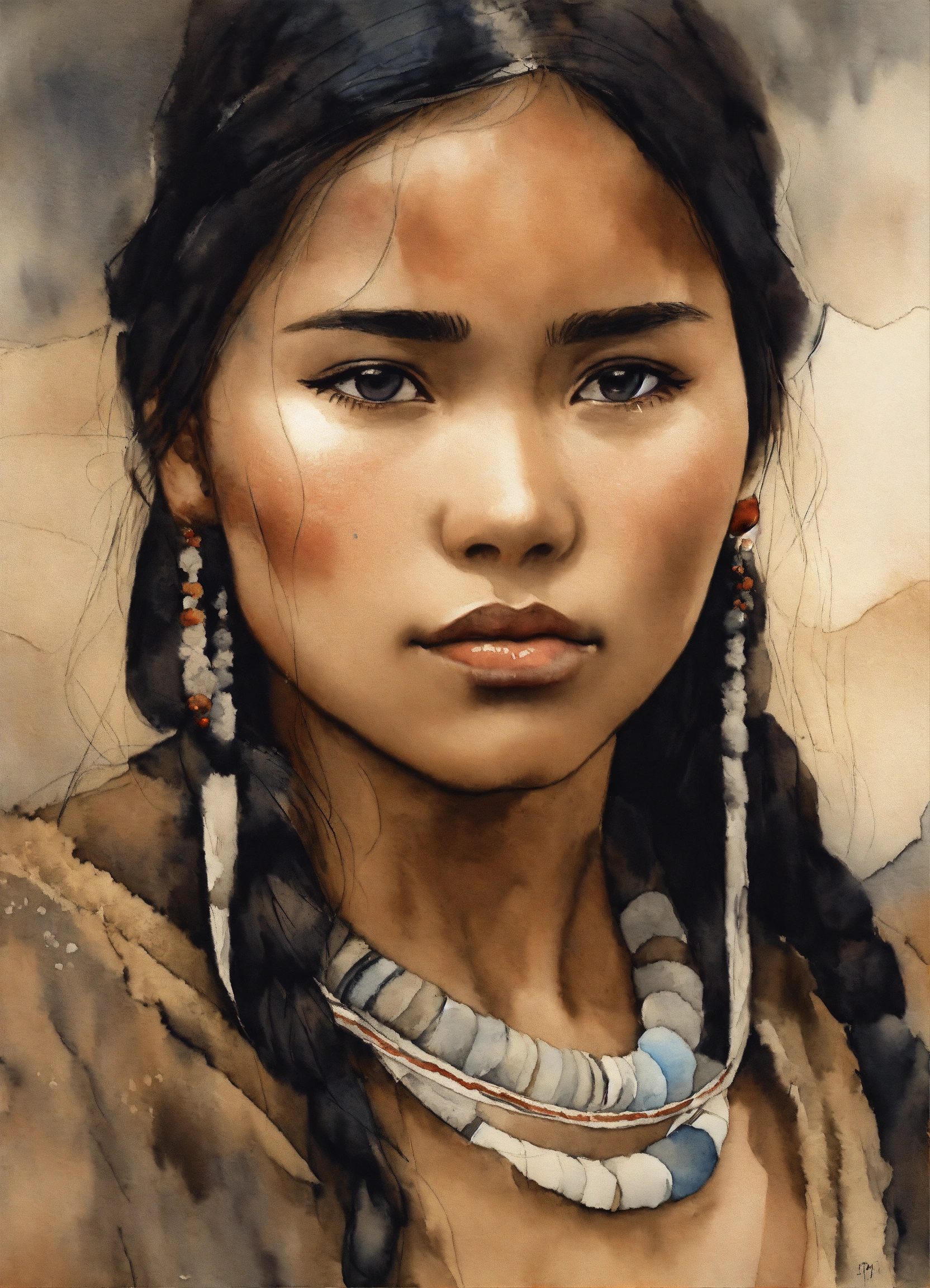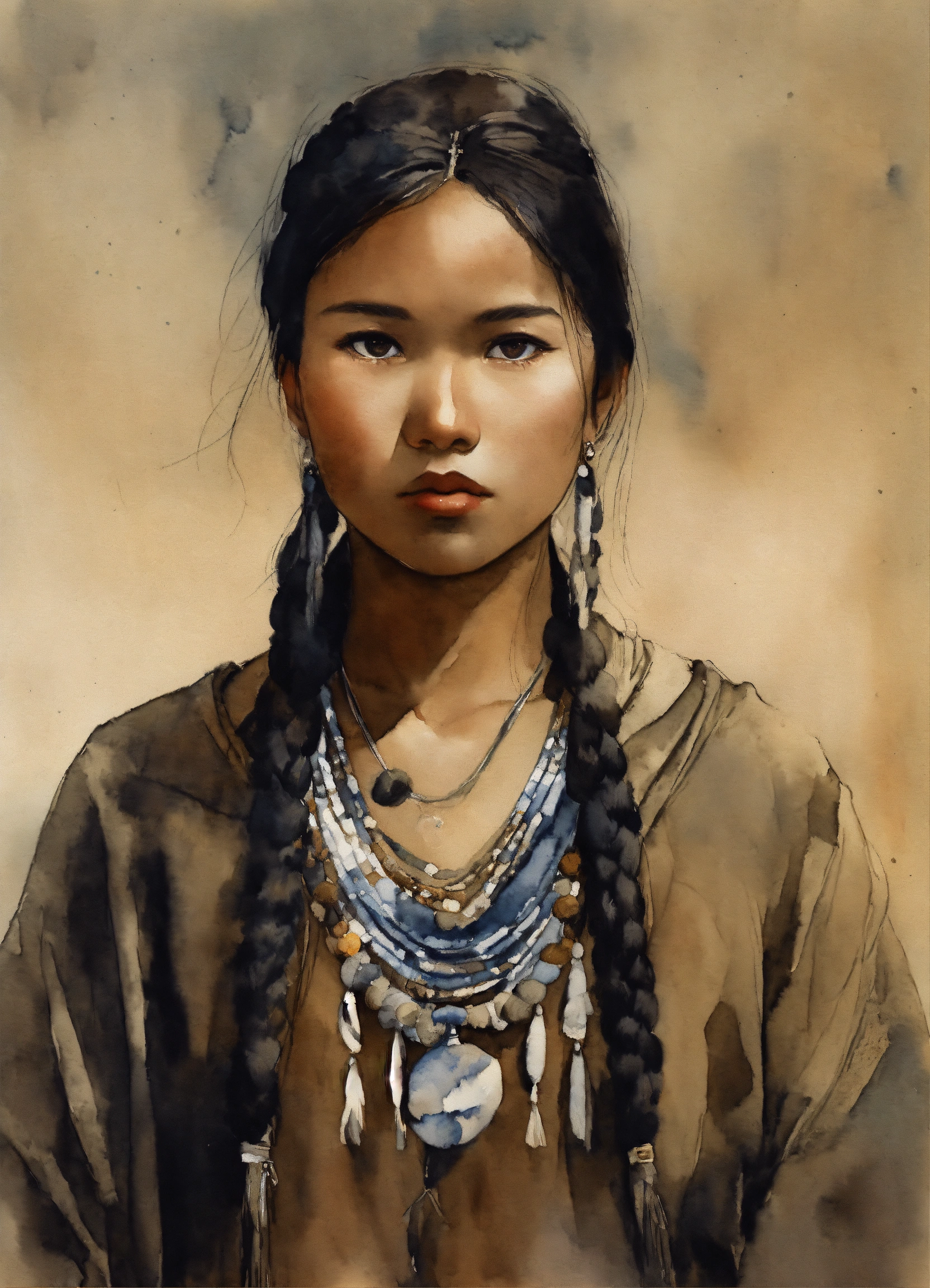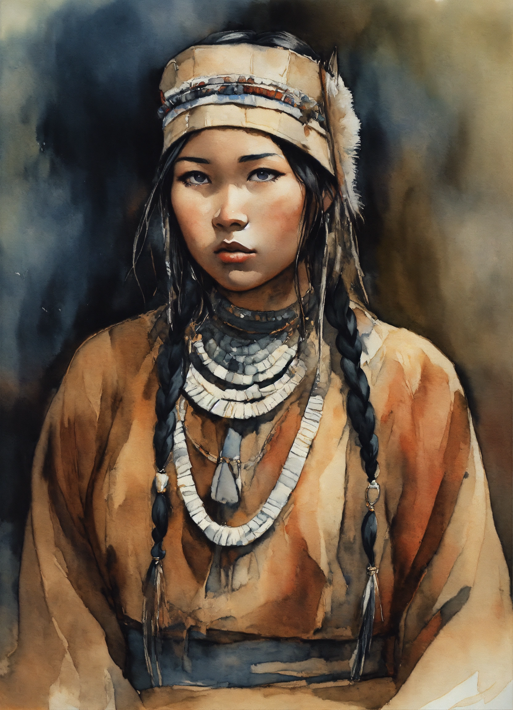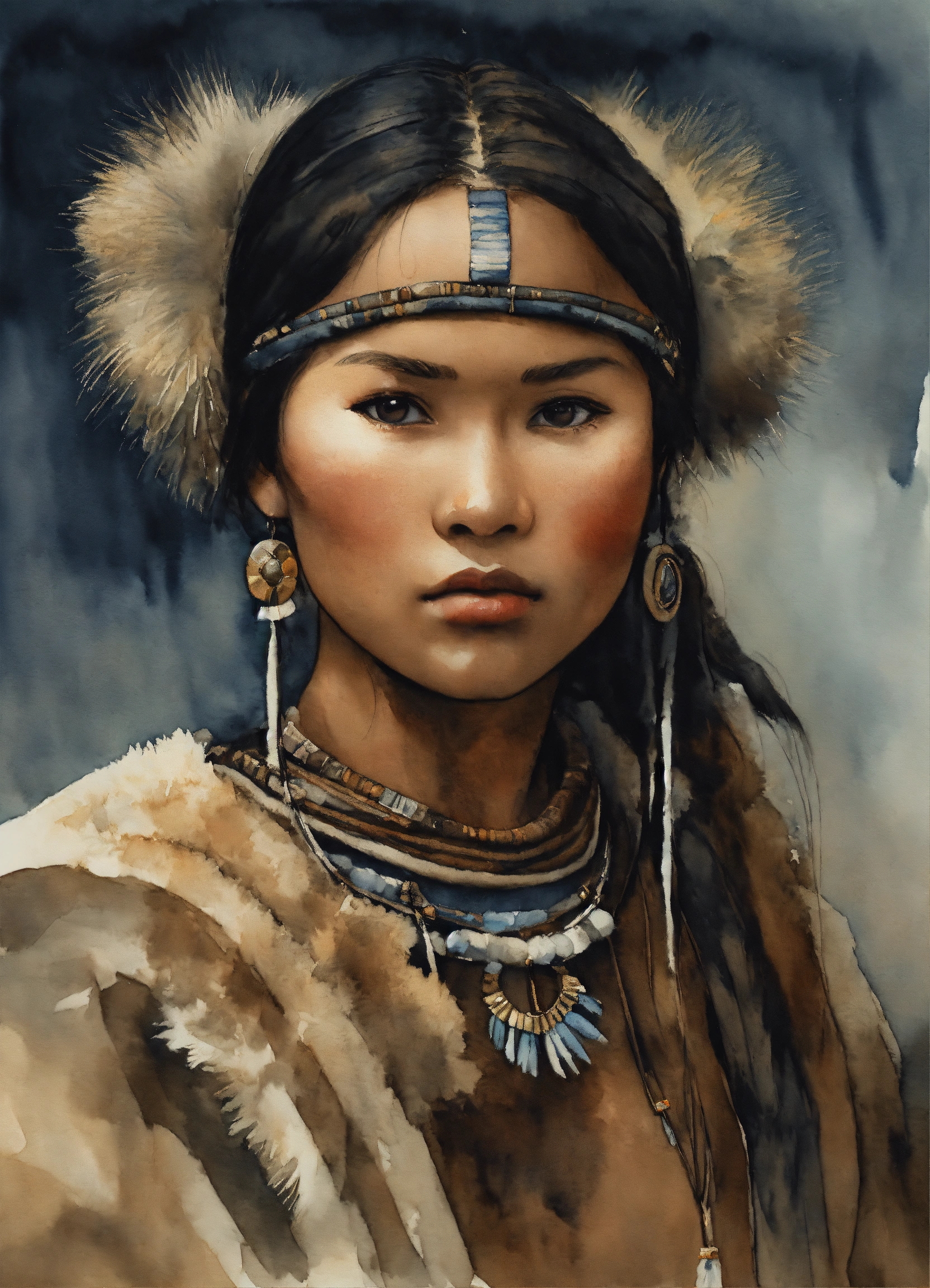 Illustration by tom björklund of a siberian "aboriginal" young woman wearing arctic paleolithic clothing. she has asian phenotype. watercolor painting by tom björklund, dark hues, gloomy and depressing, masterpiece.