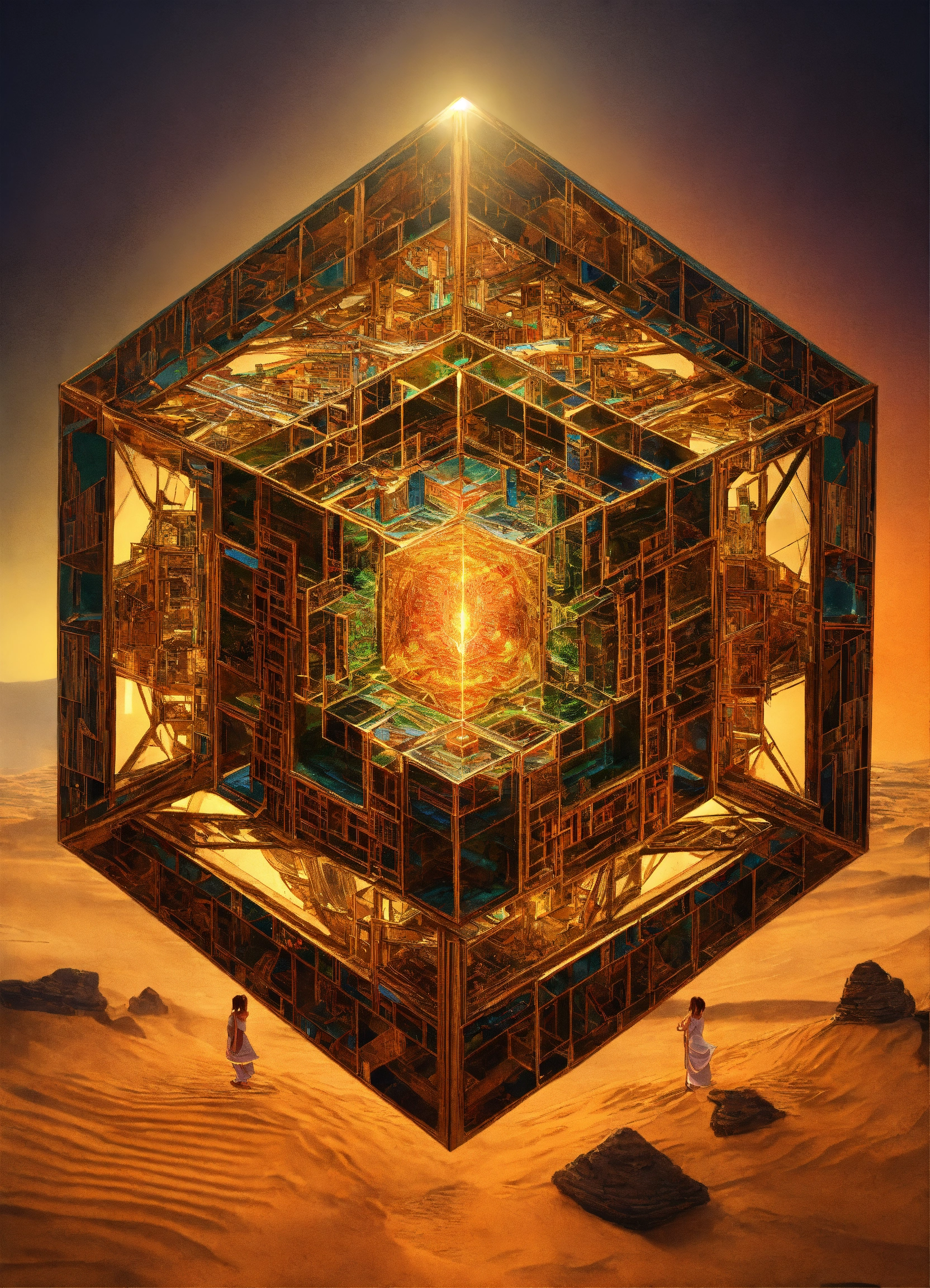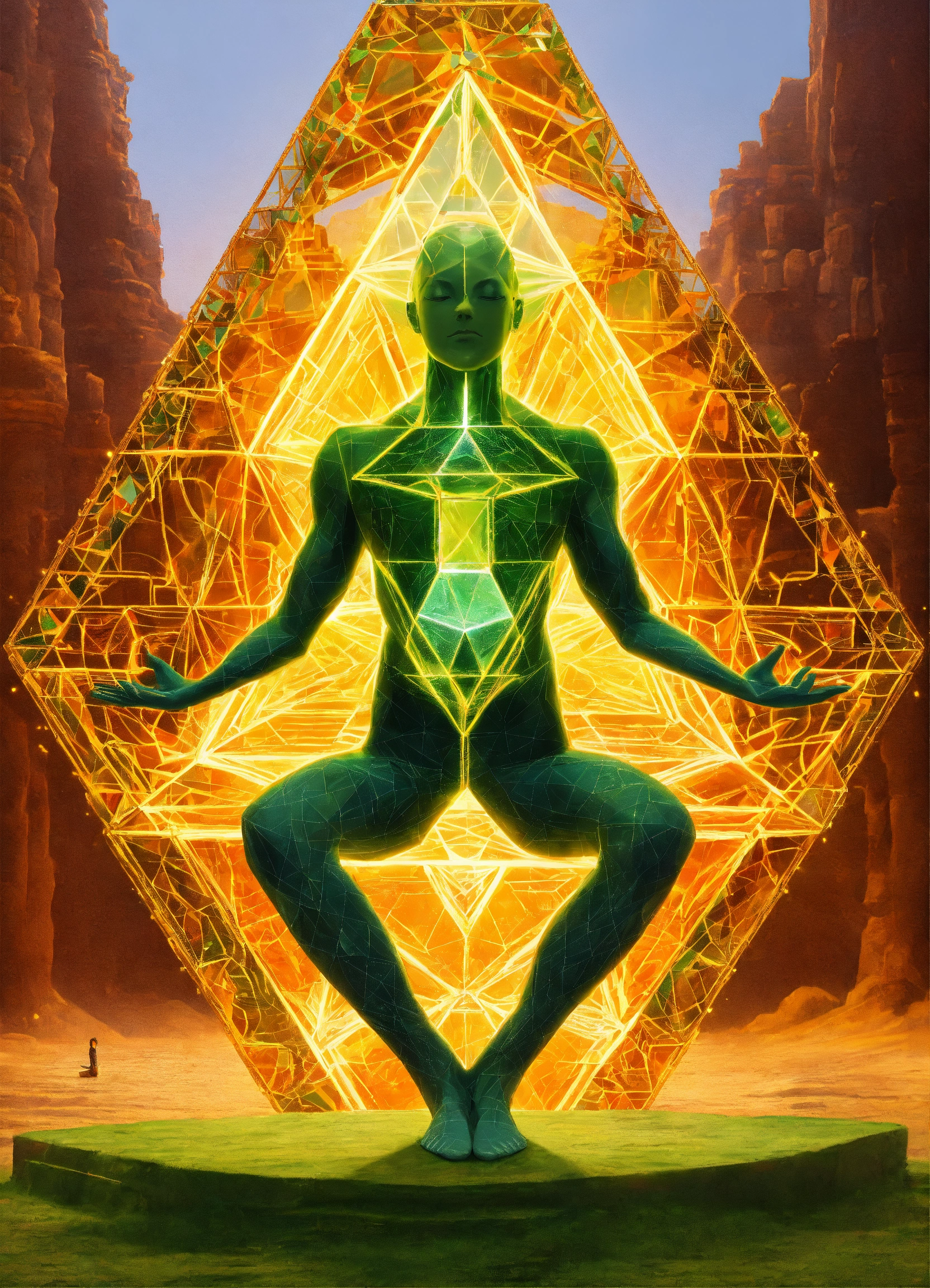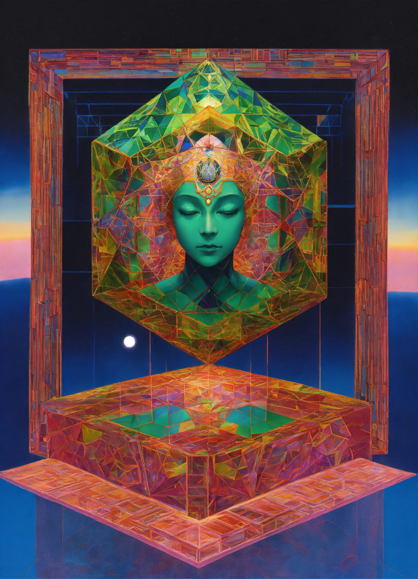 Meditation yoga master tesseract body fractal three point perspective hypercube mirror zen face brain mayan mantis