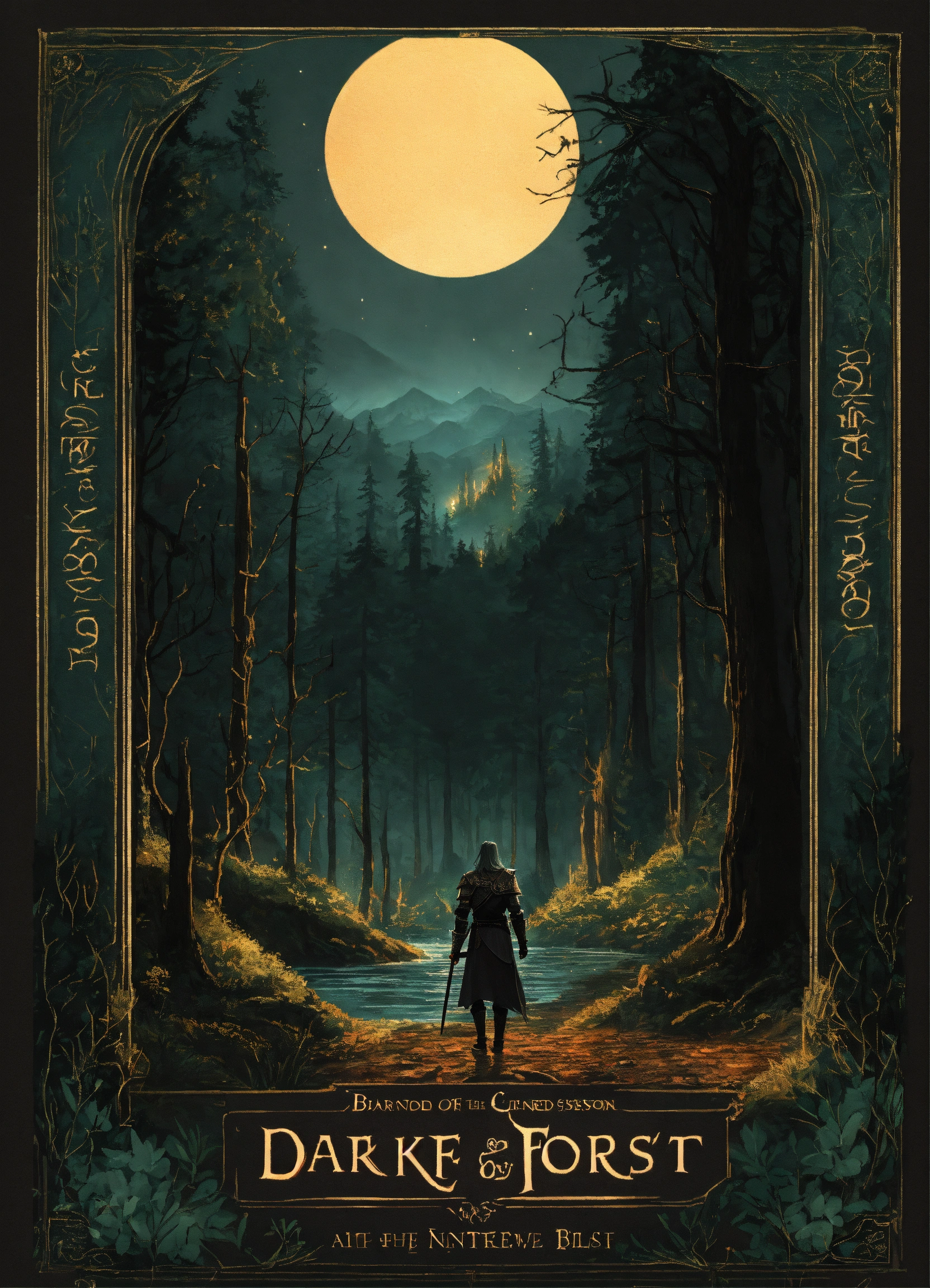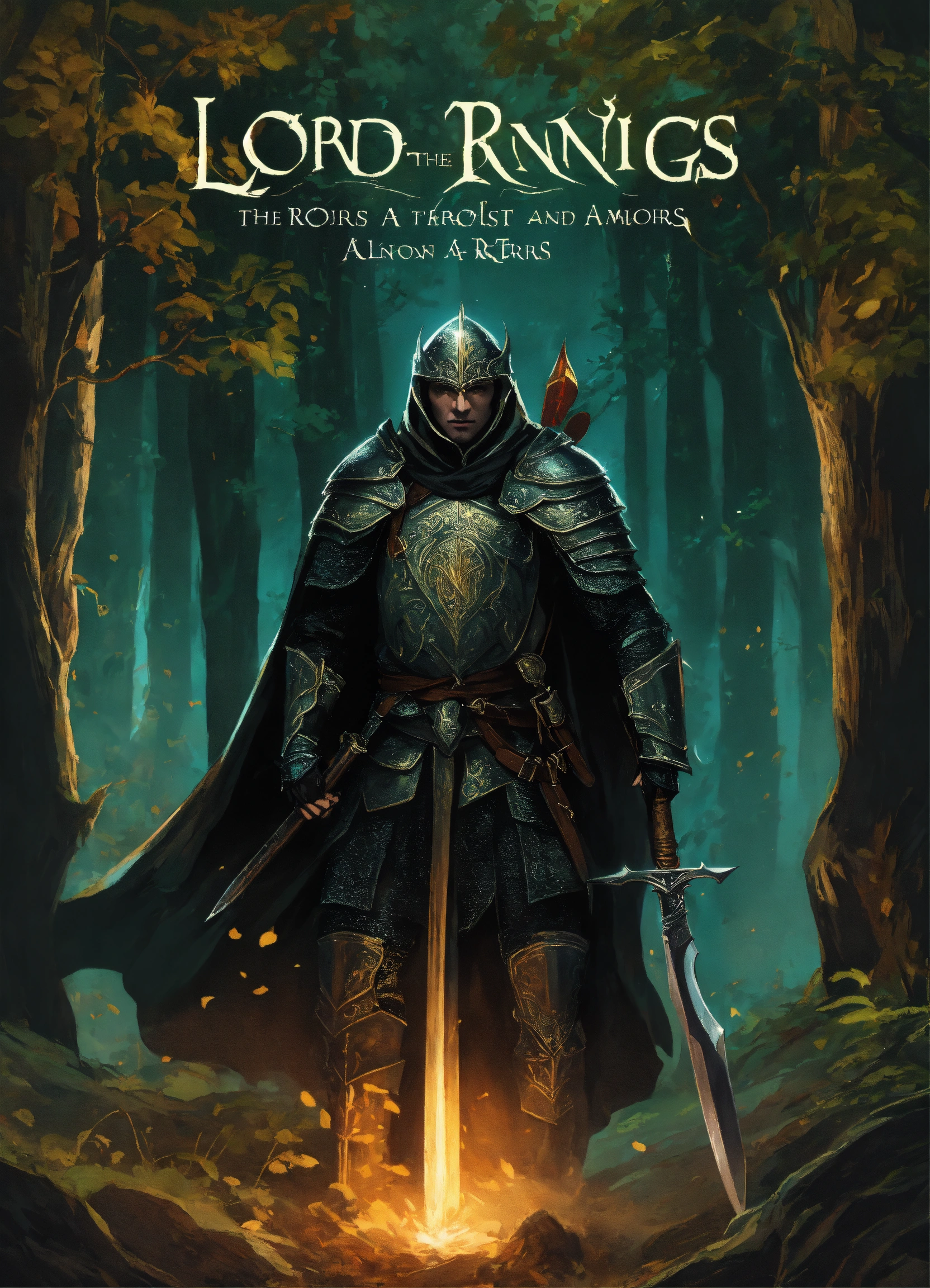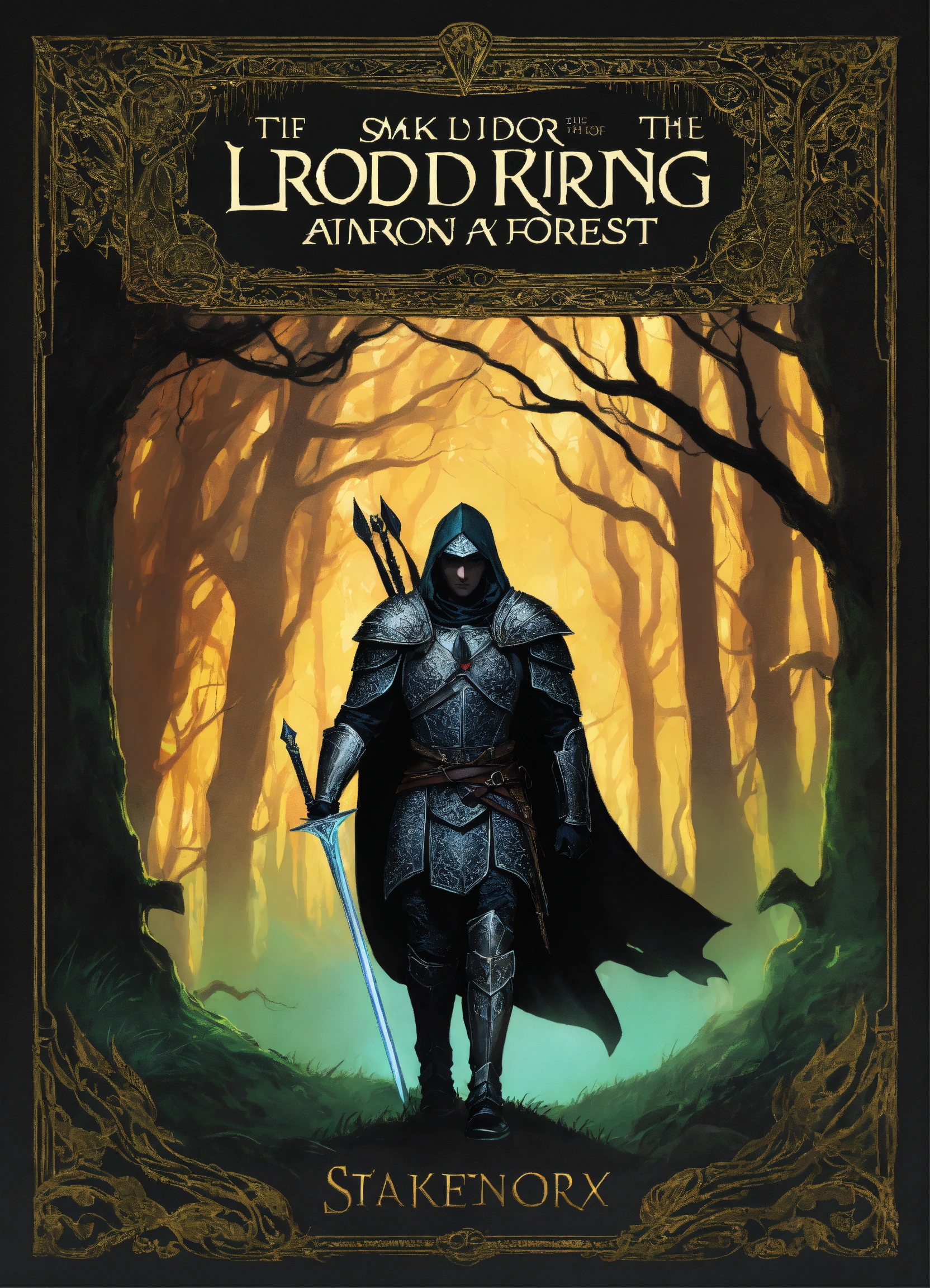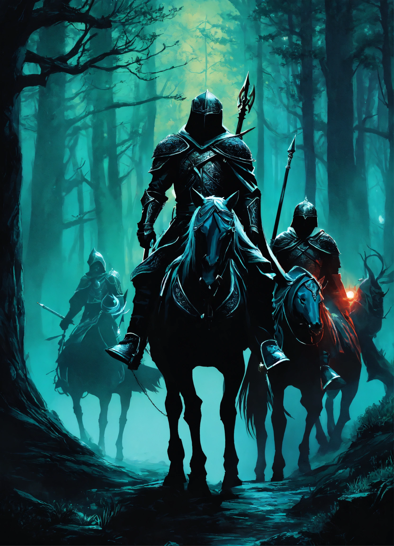 An illustrated book cover designed like lord of the rings and brandon sanderson books of a dark forest at nighttime and warriors wearing black armor