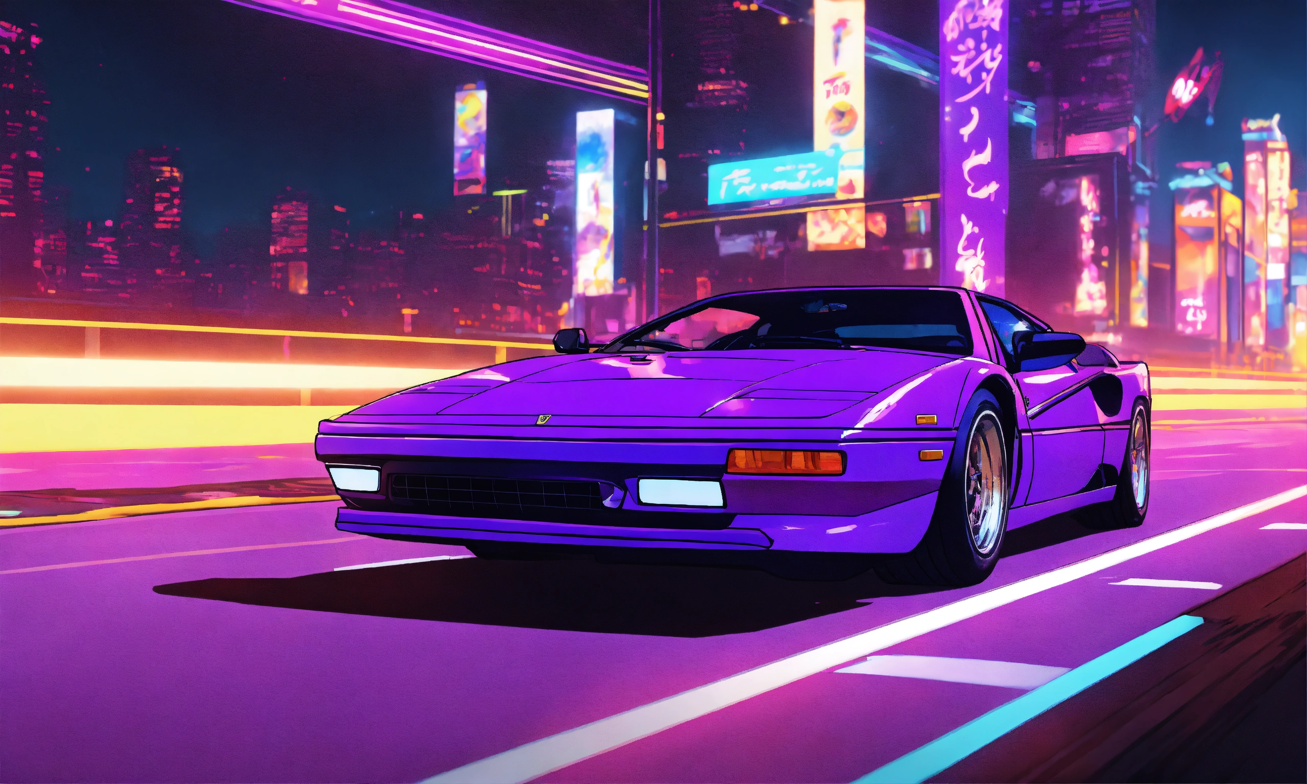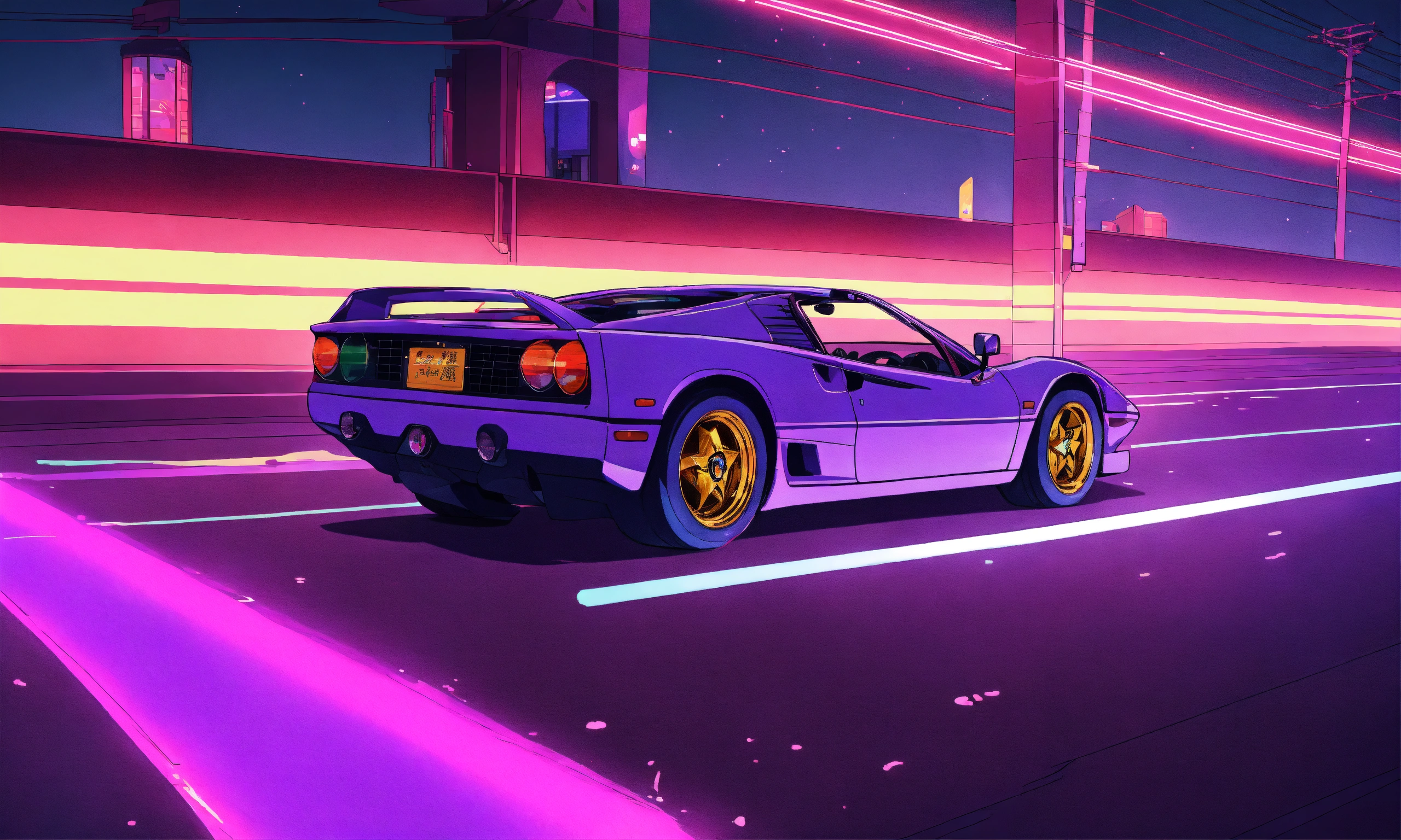 man behind the wheel of a purple ferrari driving down a neon lit highway