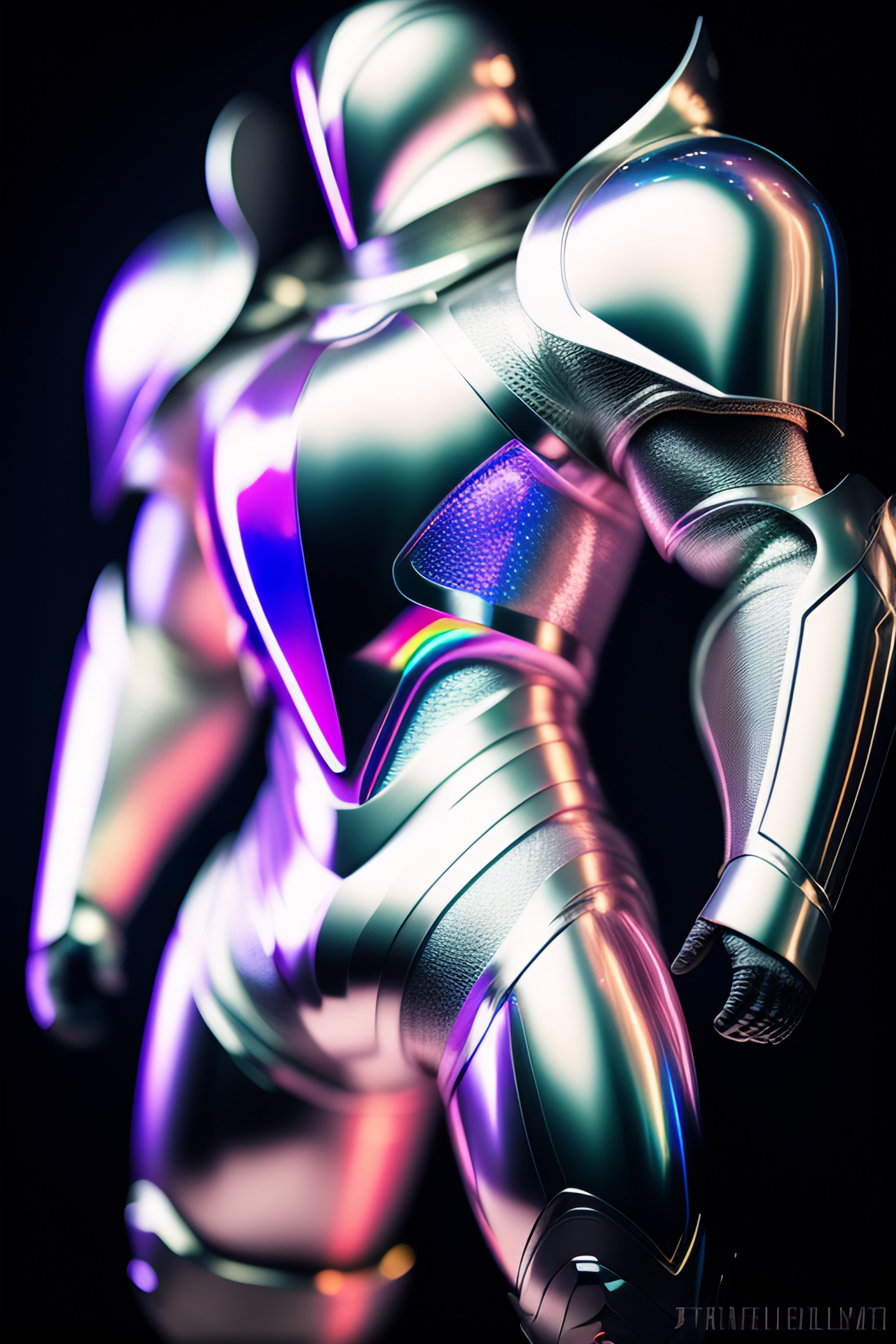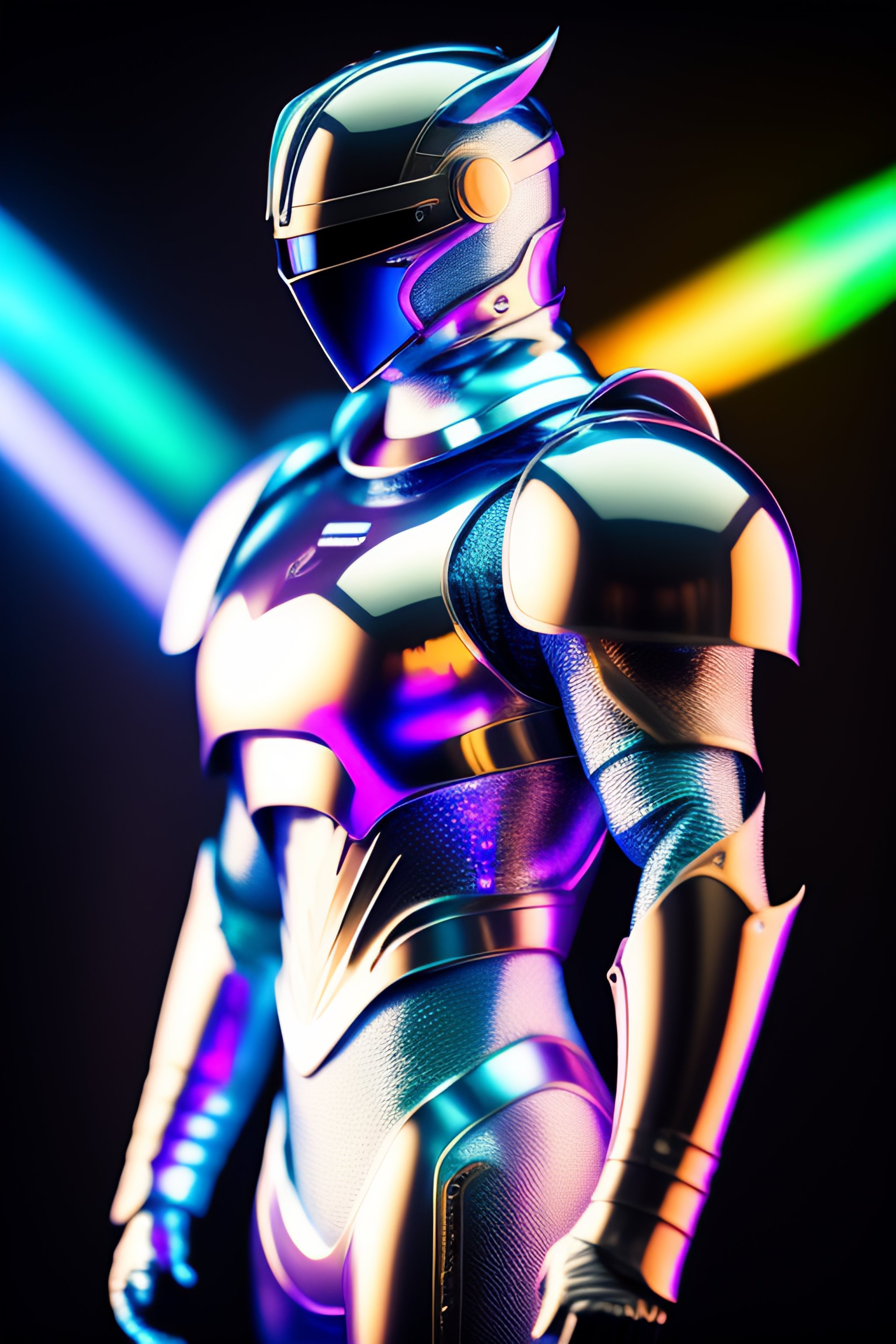 A photograph of a silver smooth armour made of white titanium and some crystal, rgb leds rainbow, power suit, gradient, elegant, for men, modern minimalism, low poly lines, punk core, dreamy, colorful, dystopia, godlike, mysterious, flexing pose, pose, fashion pose