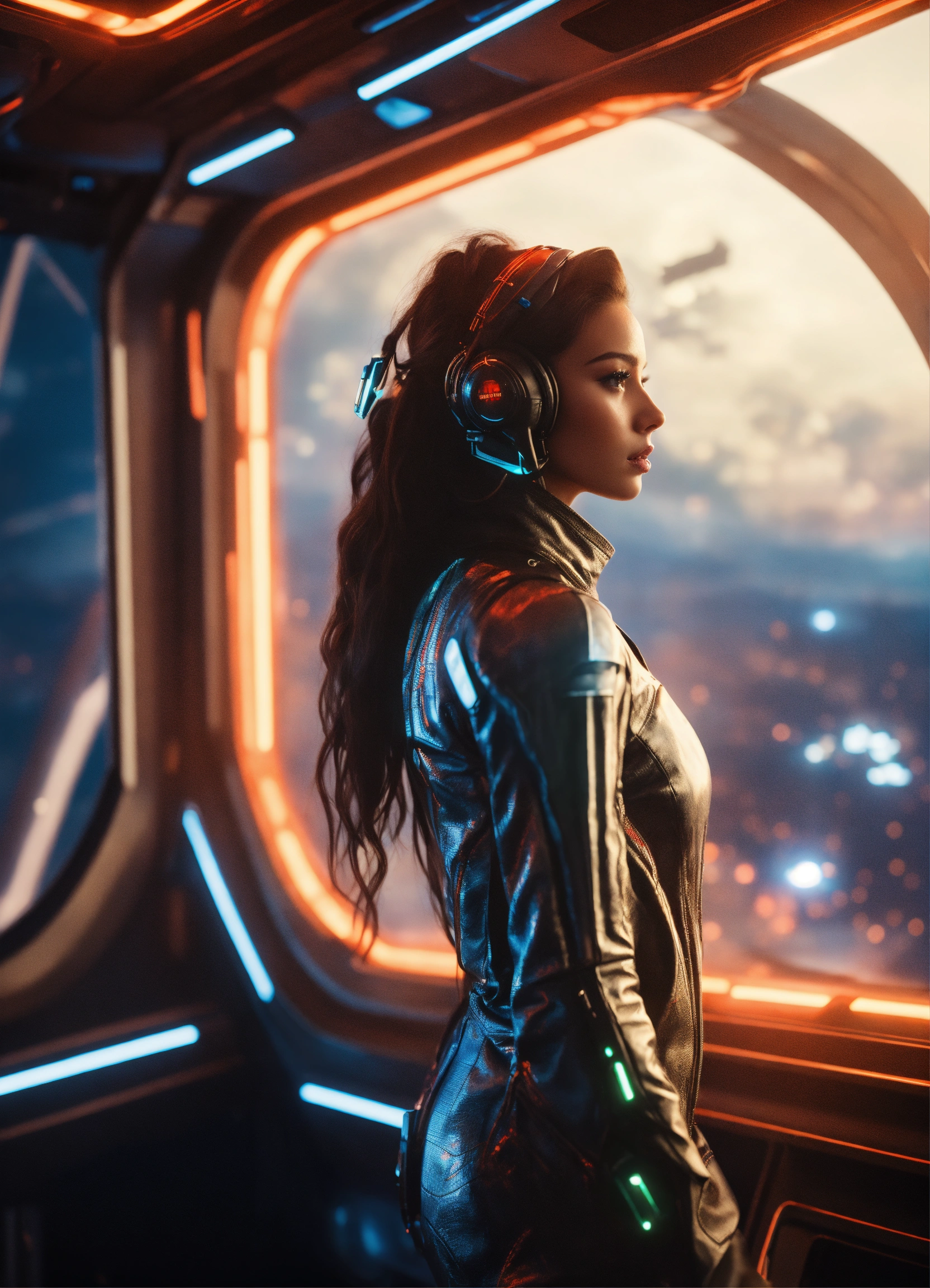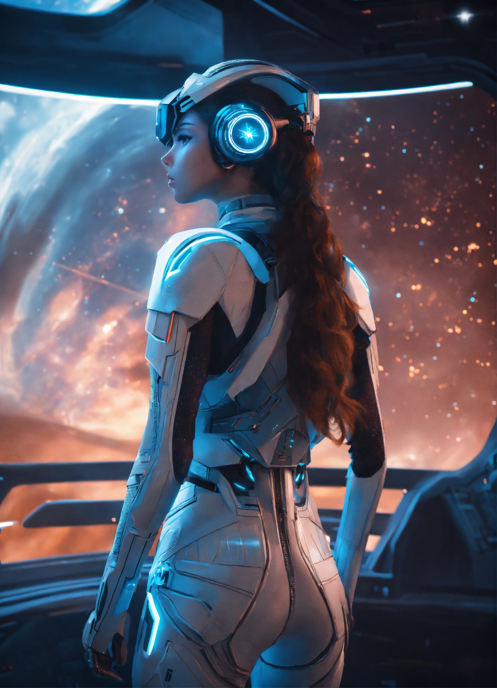 Full body of a beautiful long hair girl standing wearing detailed alien ear antennas with futuristic clothing, and looking out huge window at nebula on a star cruiser, futuristic, sci-fi, realistic, unreal engine, 8k