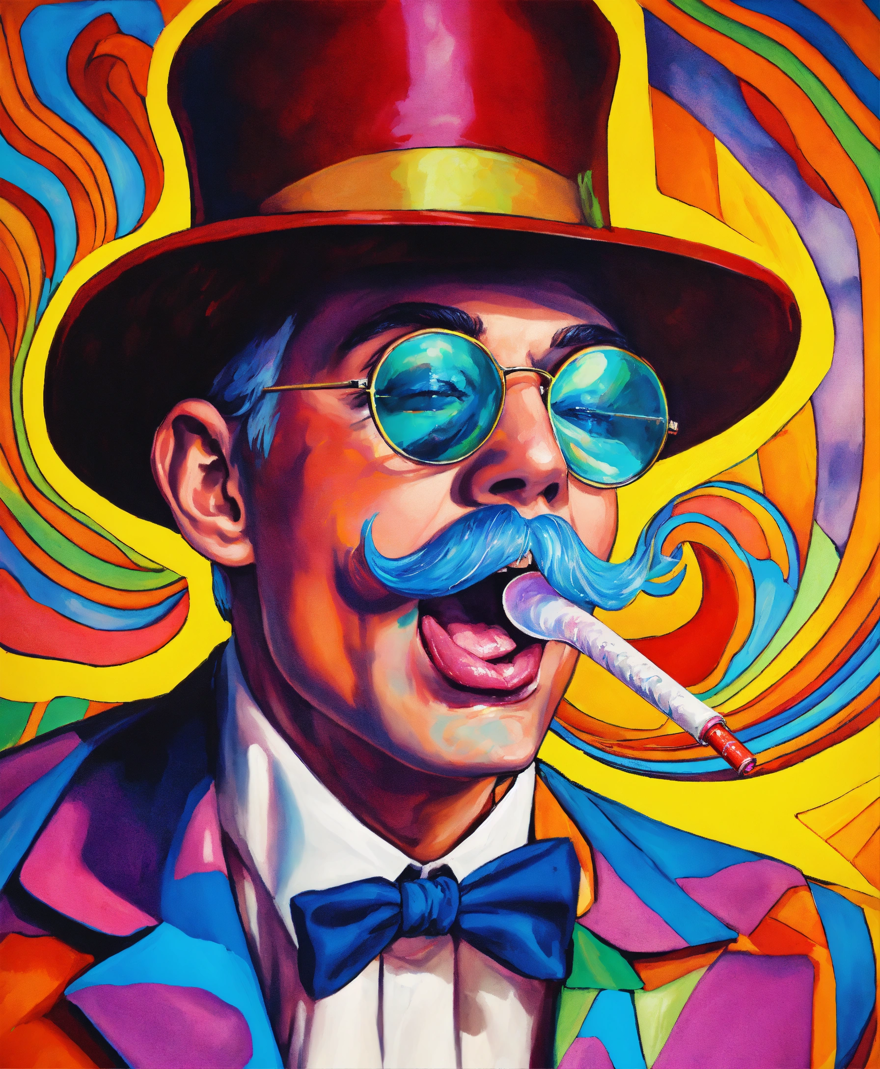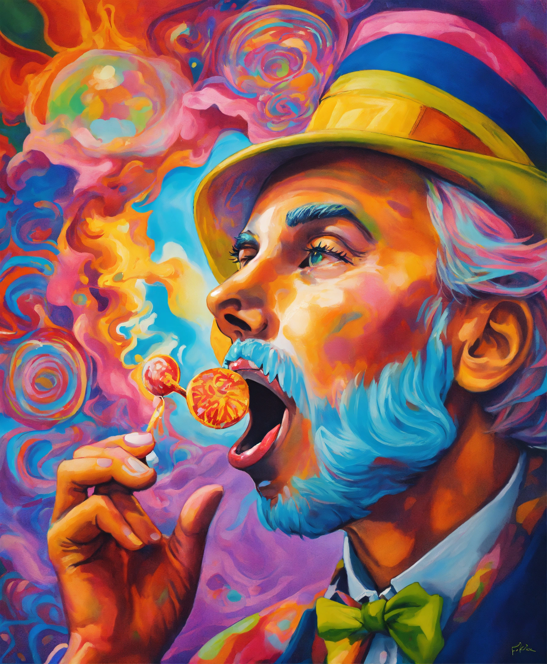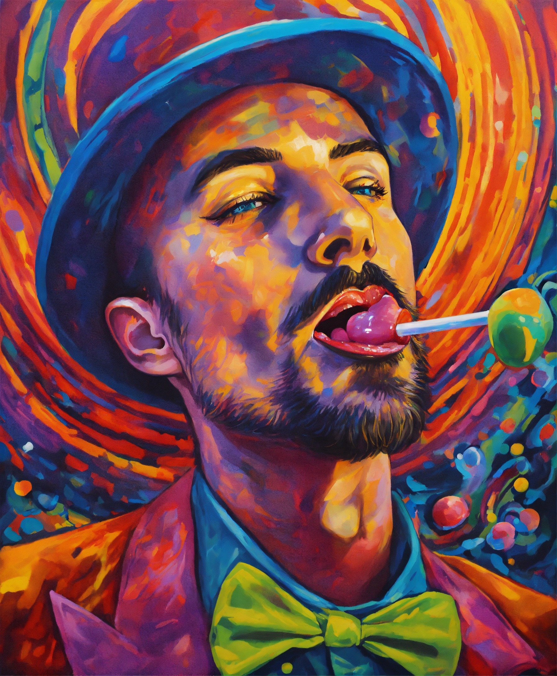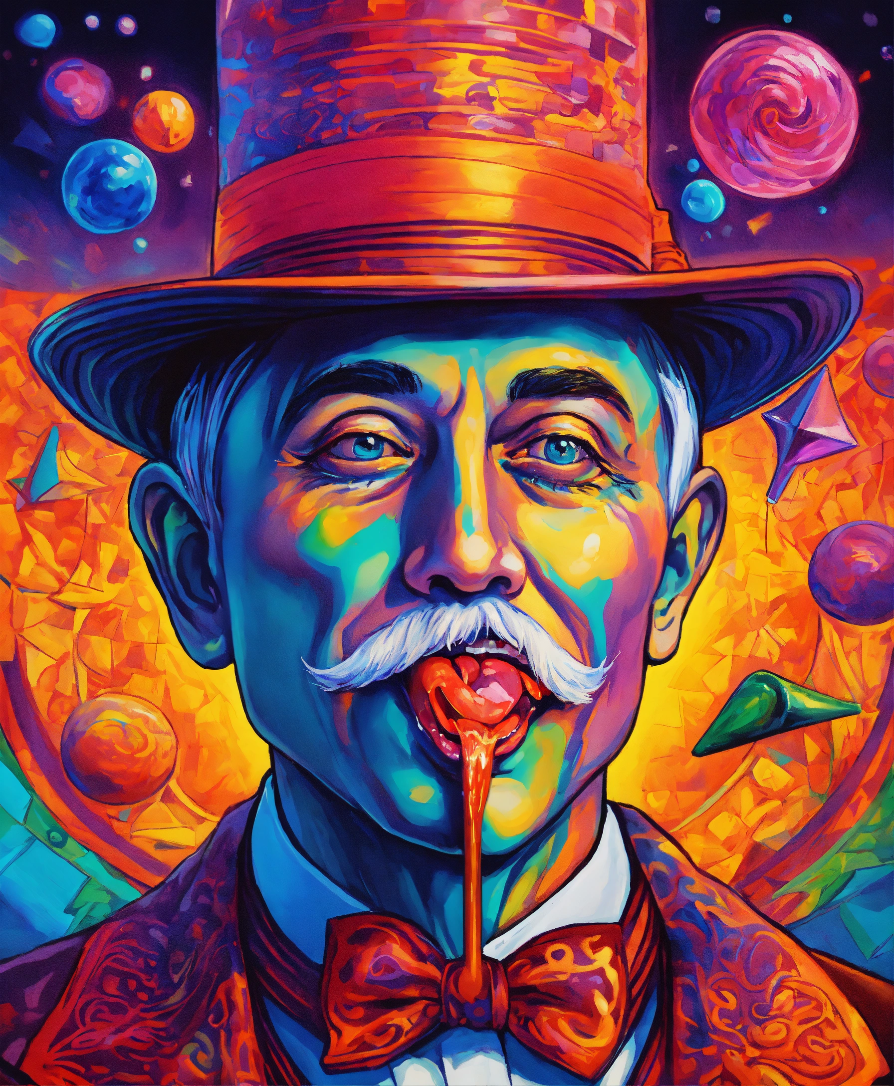 A colorful vibrant closeup portrait of a magician licking a tab of lsd acid on his tongue and dreaming psychedelic hallucinations, by piccasso