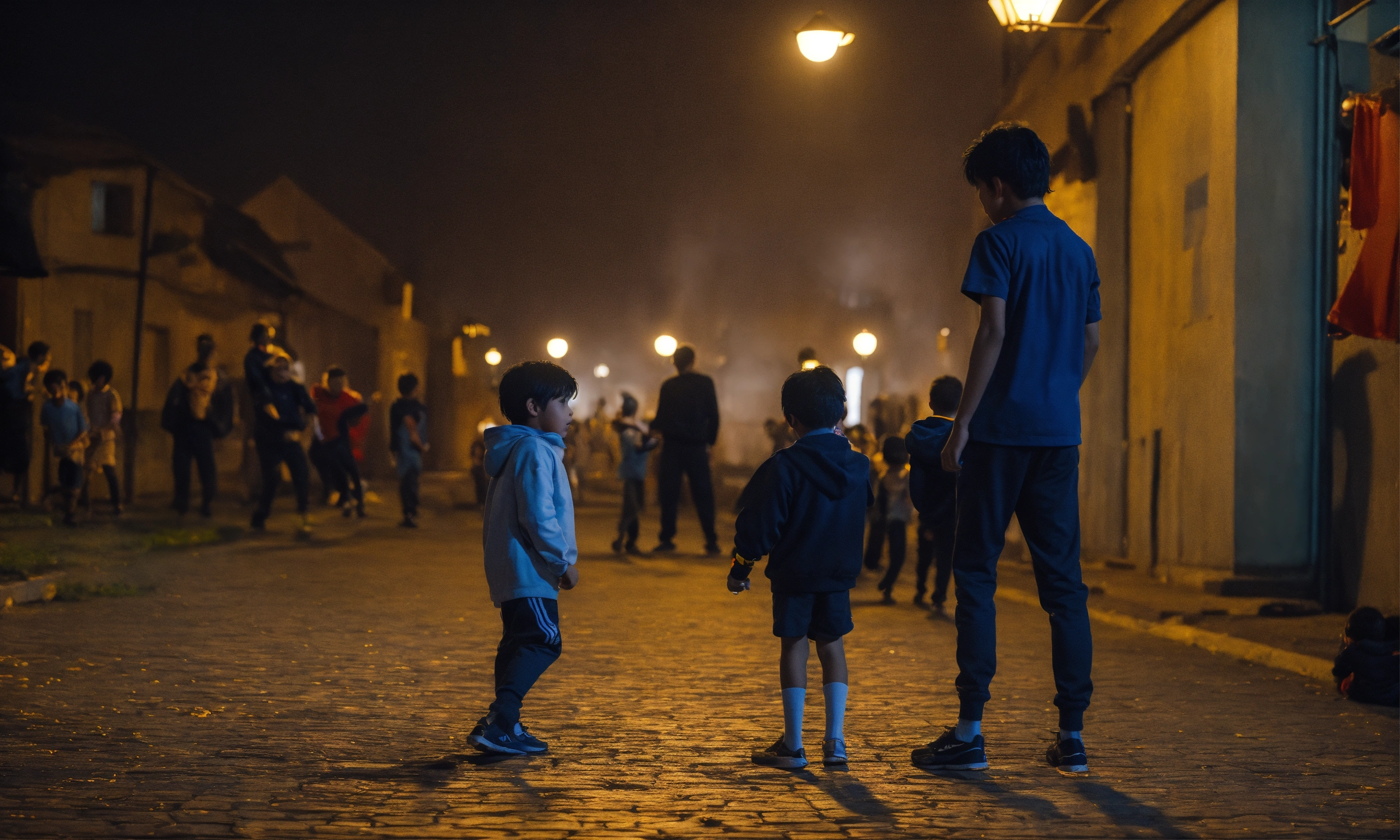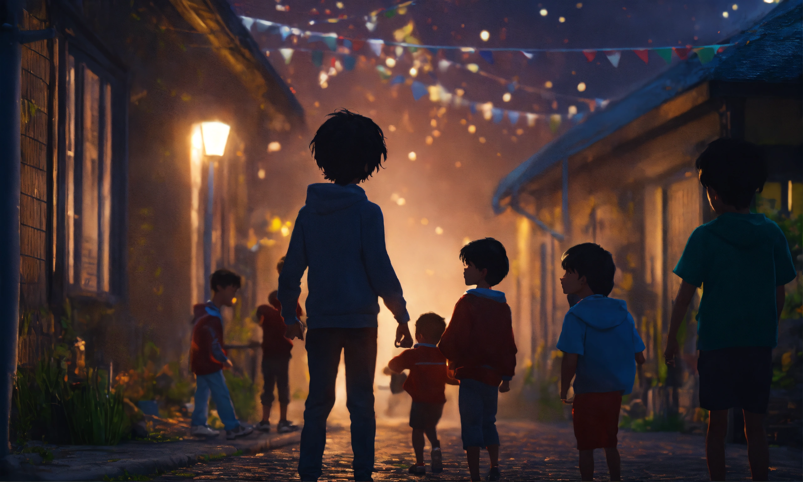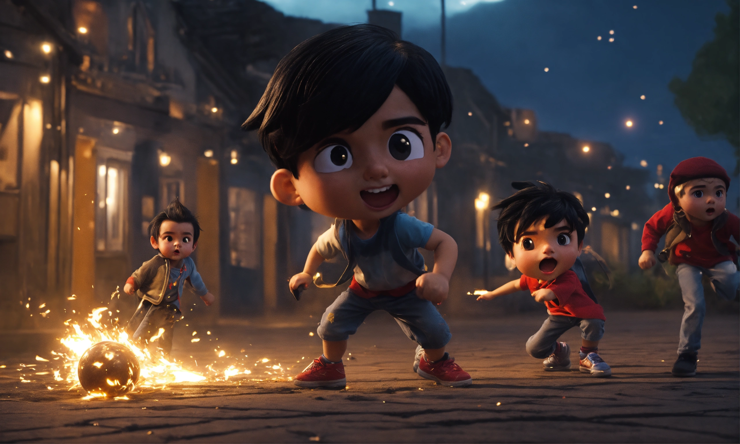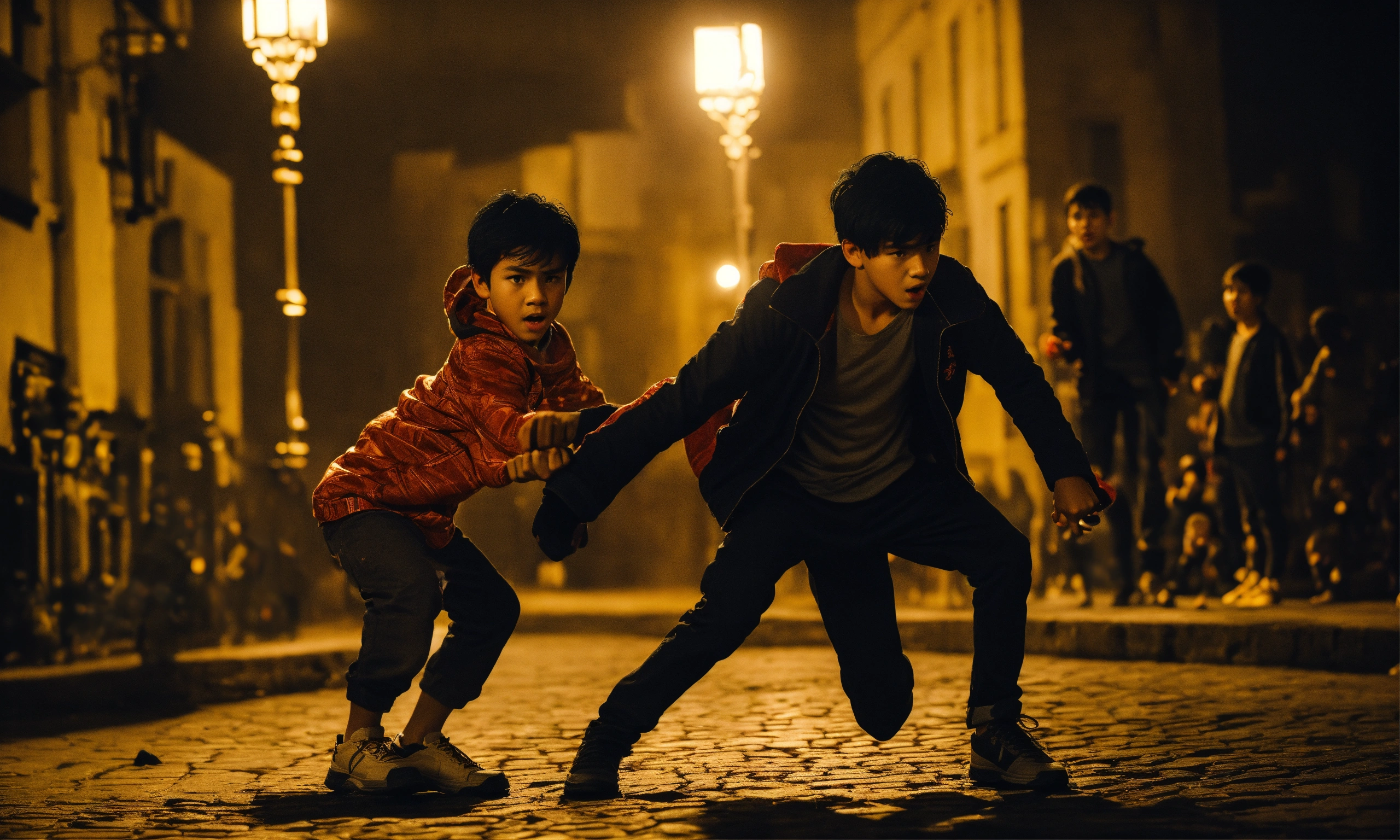 The europian boy with black hair fighting with kids