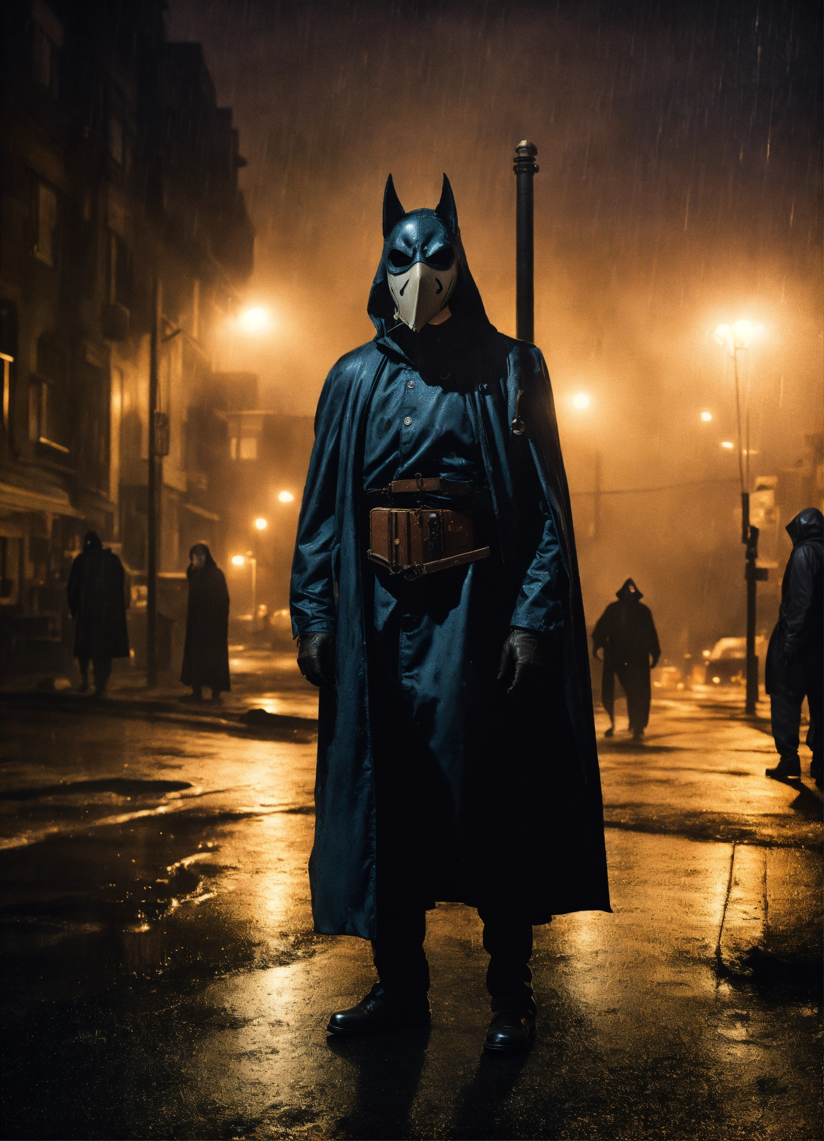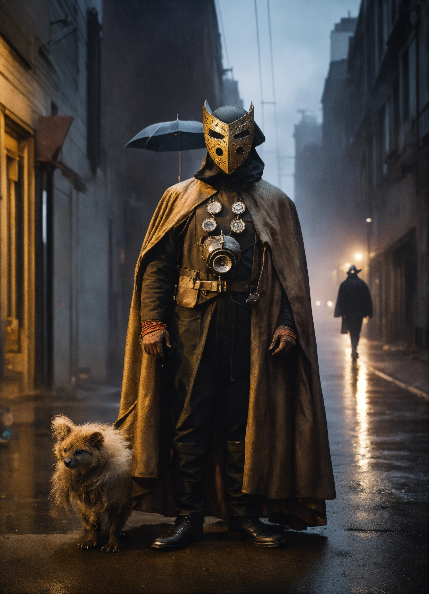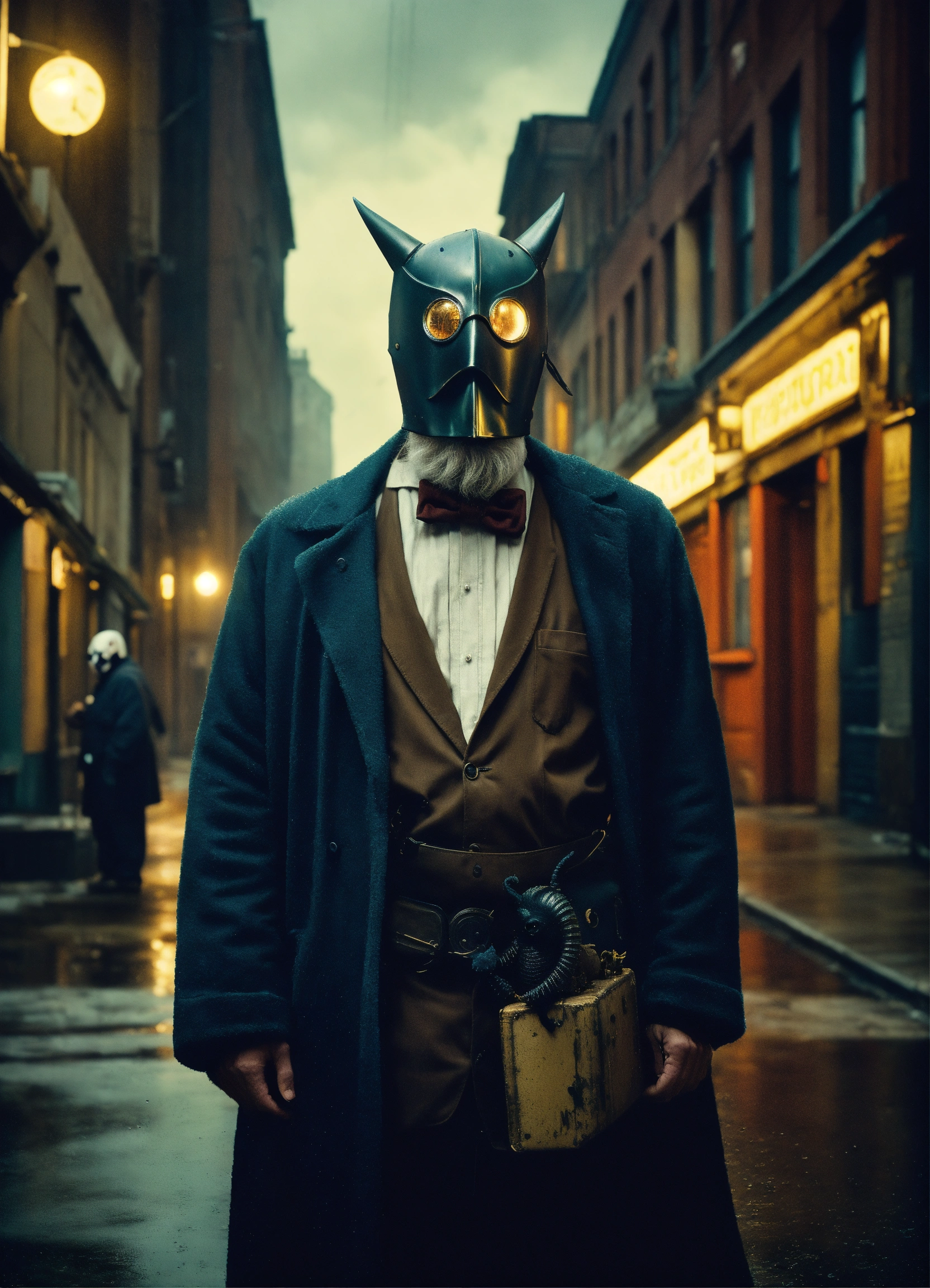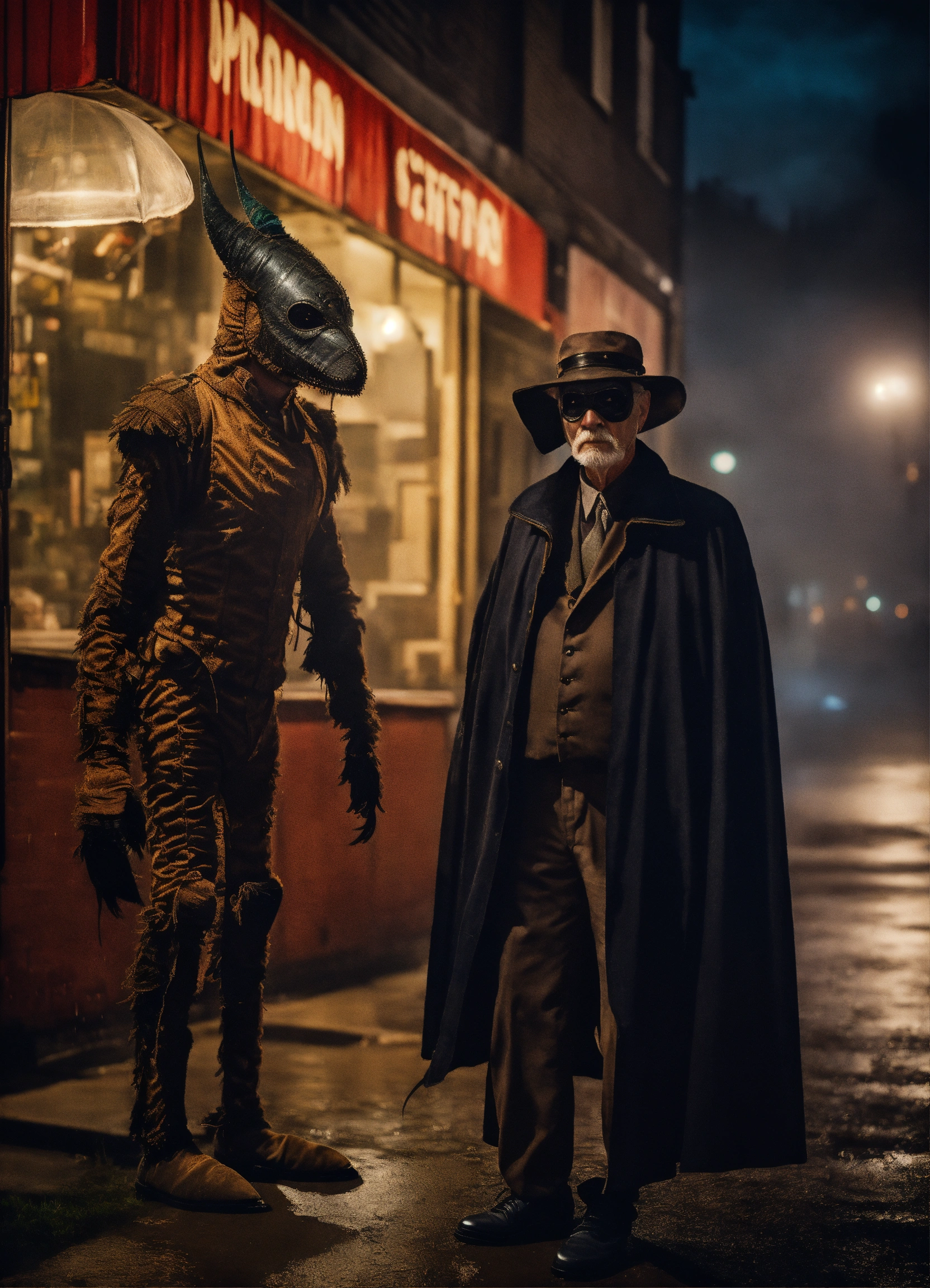 Old man wearing a masked superhero costume standing next to a strange creature, in the style of contemporary vintage photography, necronomicon illustrations, tabletop photography, 1890, hyperrealistic animal portraits, ghostly presence, street of postapocalyptic industrial street, night, rain